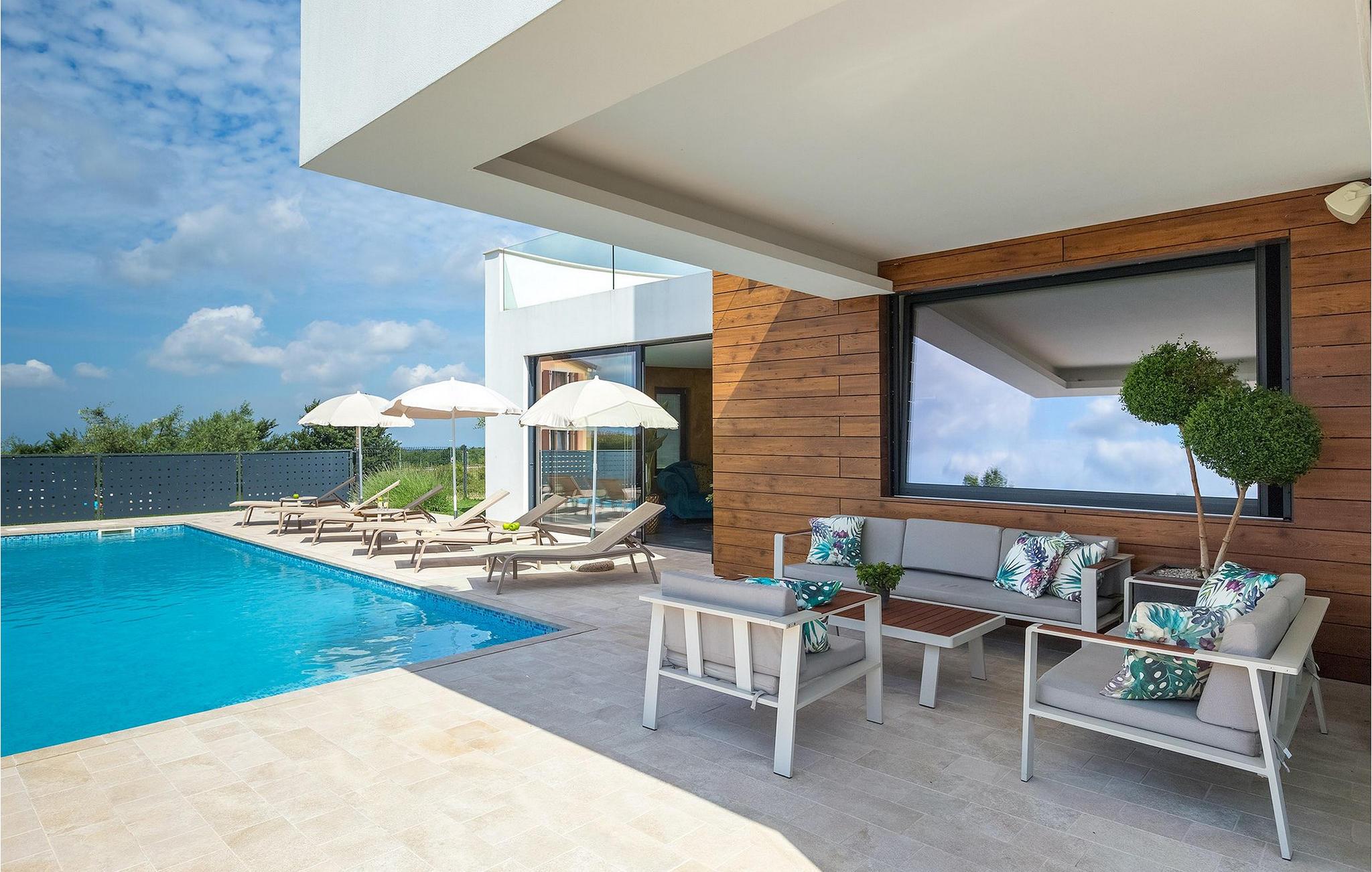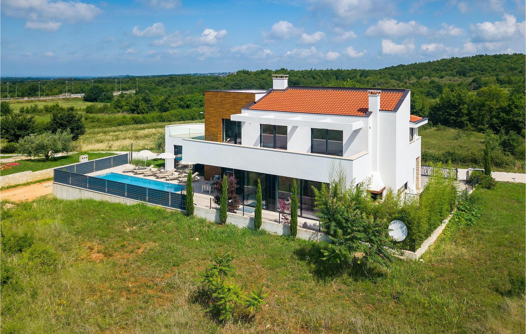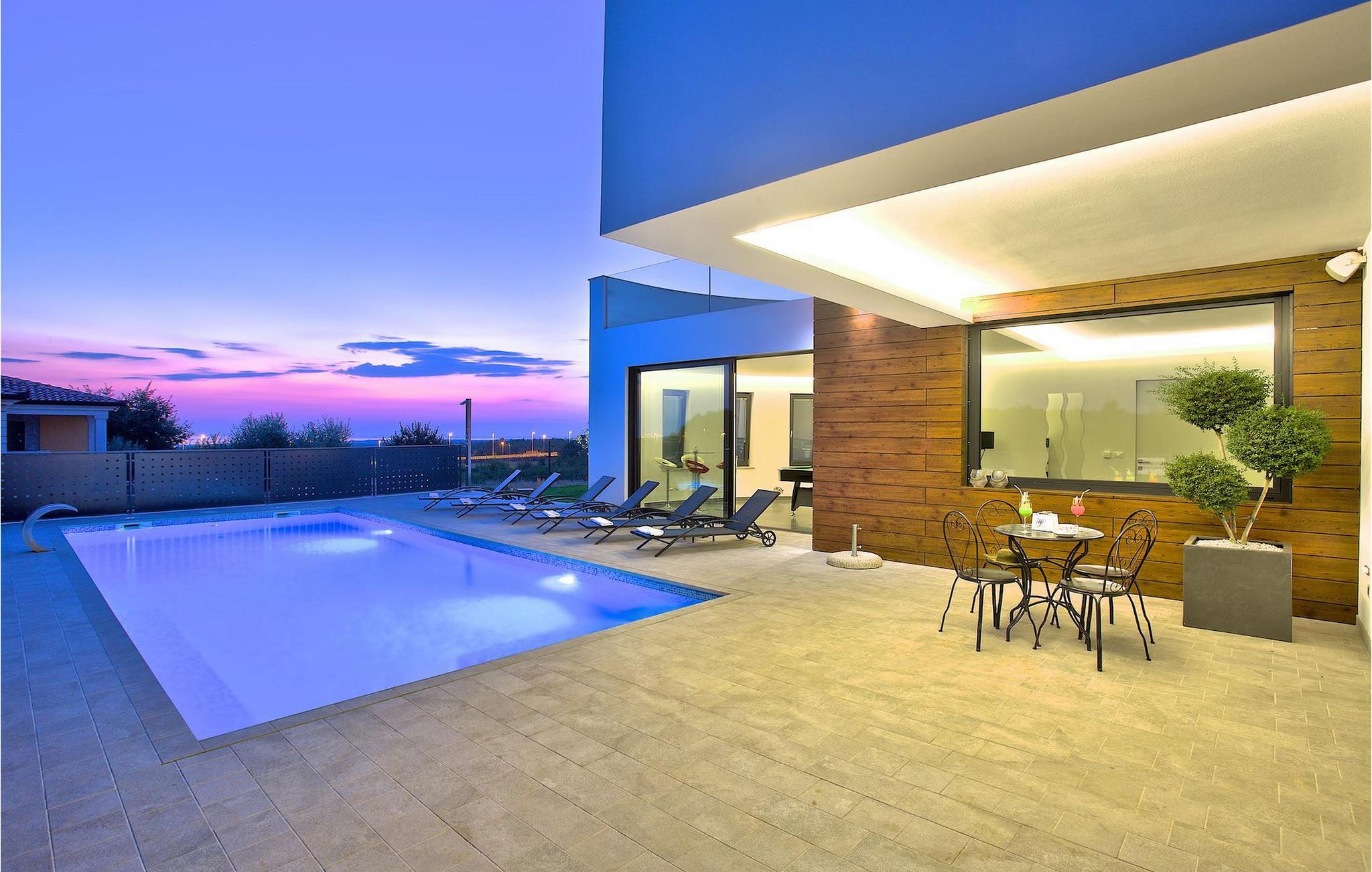 Et mesterværk af moderne arkitektur, Villa Aria er udstyret til at give en smuk ferie i en af de smukkeste kroatiske regioner, Istrien. Beliggende på en lille bakke, fra forsiden af villaen strækker sig en herlig udsigt til havet og det dejlige landskab. Både udefra såvel som når det kommer til indretning, leger denne luksuriøse villa med former og farver, hvilket resulterer i en minimalistisk, men alligevel farverig og frem for alt indbydende og varm blanding. Rummelig og åben planløsning ledsages af store vinduespartier og franske døre, der lukker en masse naturligt lys ind hele dagen. Villaen har 5 soveværelser, som alle er indrettet i deres egen stil, fra charmerende romantisk til urban eller elegant, og kan rumme op til 10+2 gæster. Ønsker du at tilbringe din ferie med at slikke sol, så finder du foran villaen en stor og meget indbydende pool. Denne unikke villa er velegnet både for familier såvel som for større grupper, der kan have det sjovt med at spille billard eller dart.