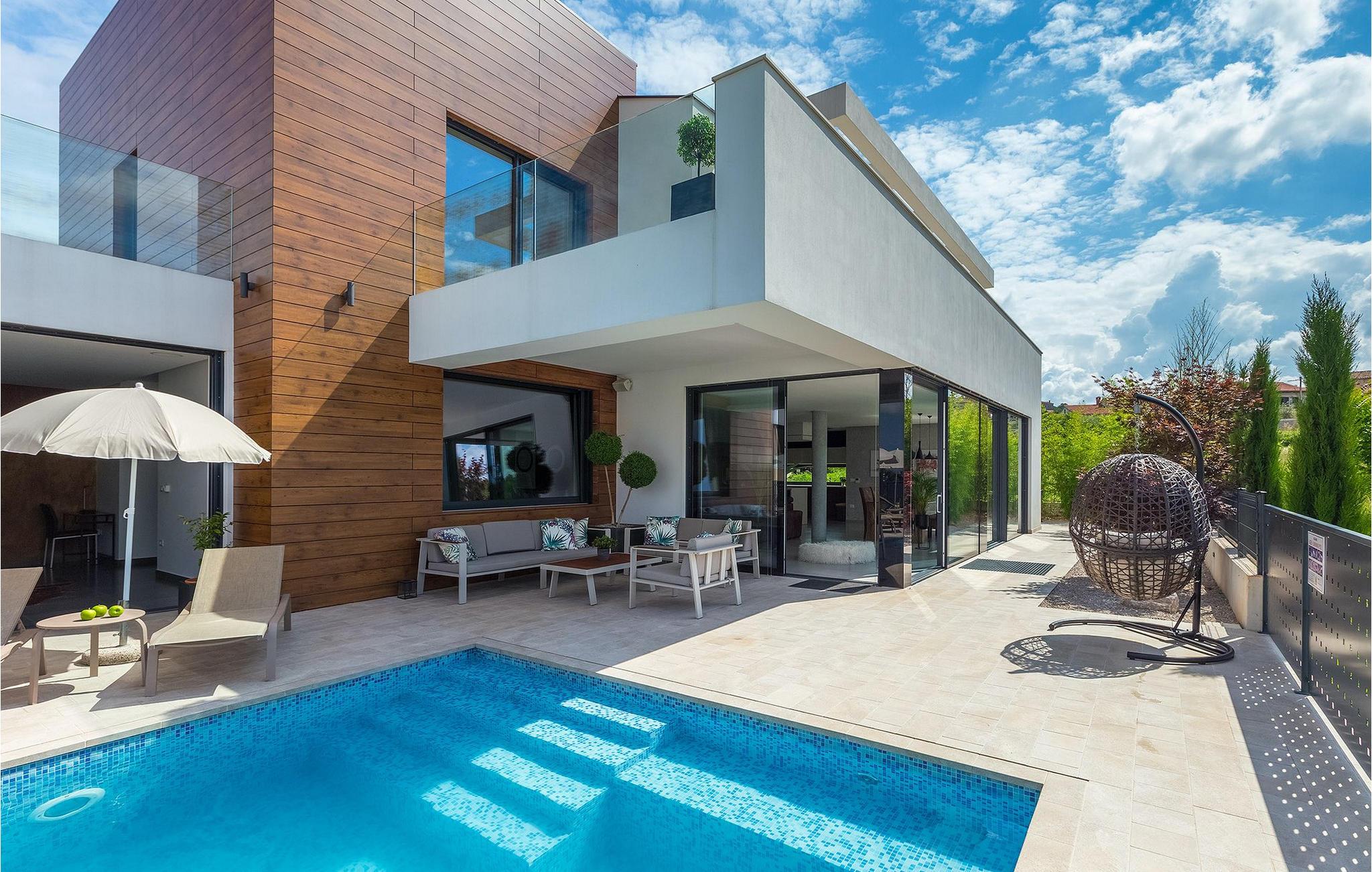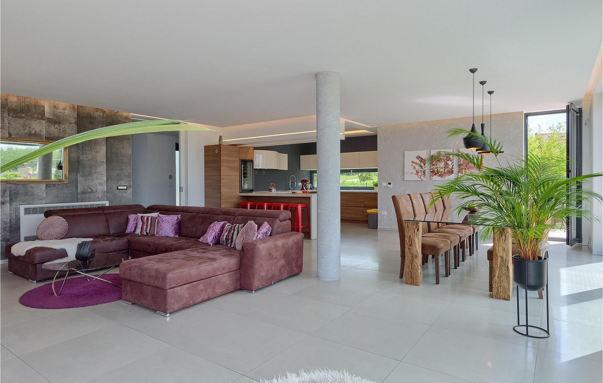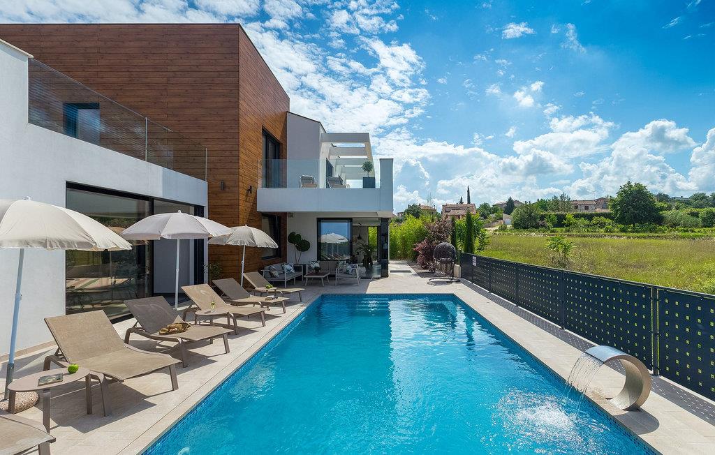 Et mesterværk af moderne arkitektur, Villa Aria er udstyret til at give en smuk ferie i en af de smukkeste kroatiske regioner, Istrien. Beliggende på en lille bakke, fra forsiden af villaen strækker sig en herlig udsigt til havet og det dejlige landskab. Både udefra såvel som når det kommer til indretning, leger denne luksuriøse villa med former og farver, hvilket resulterer i en minimalistisk, men alligevel farverig og frem for alt indbydende og varm blanding. Rummelig og åben planløsning ledsages af store vinduespartier og franske døre, der lukker en masse naturligt lys ind hele dagen. Villaen har 5 soveværelser, som alle er indrettet i deres egen stil, fra charmerende romantisk til urban eller elegant, og kan rumme op til 10+2 gæster. Ønsker du at tilbringe din ferie med at slikke sol, så finder du foran villaen en stor og meget indbydende pool. Denne unikke villa er velegnet både for familier såvel som for større grupper, der kan have det sjovt med at spille billard eller dart.