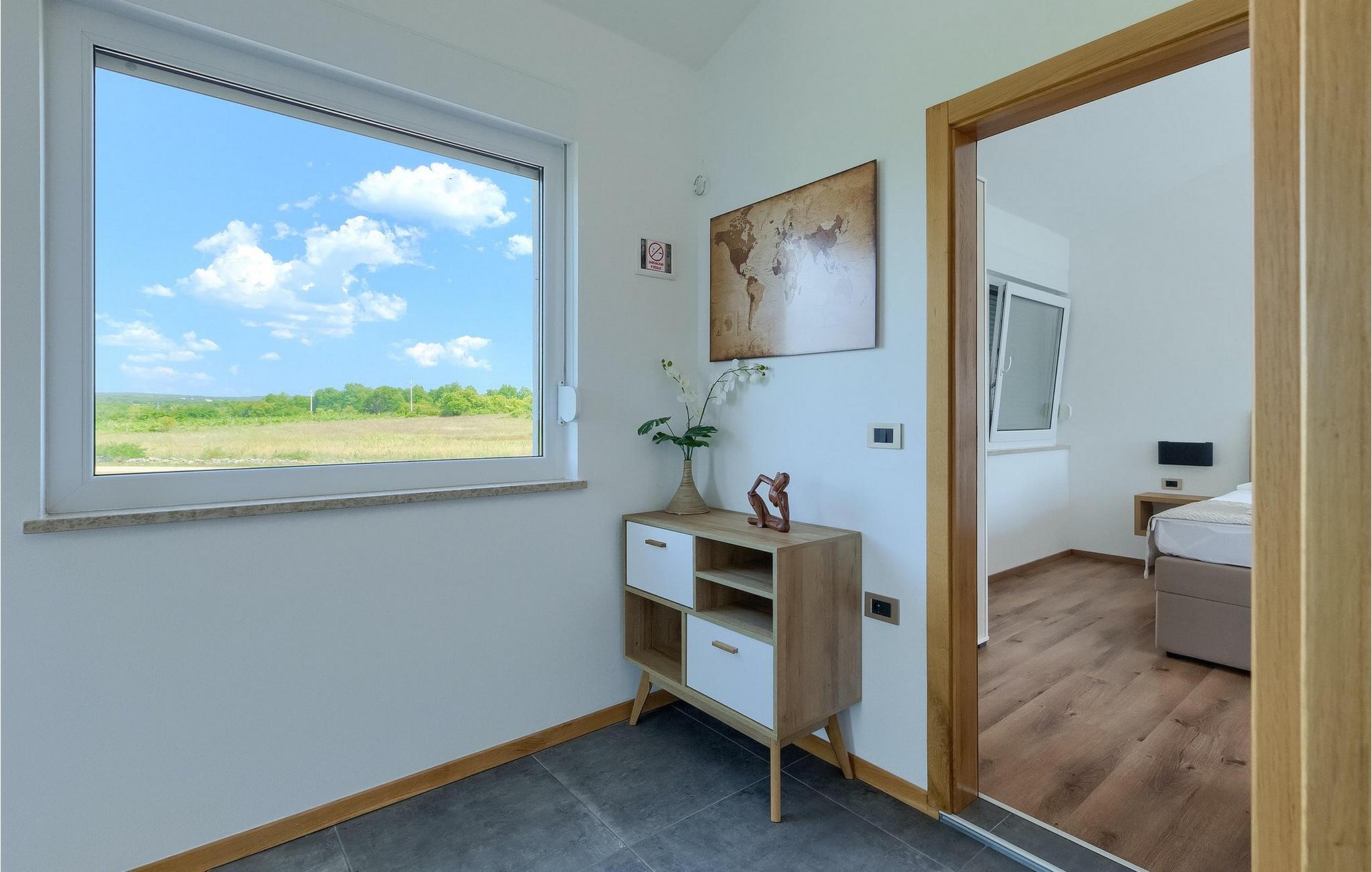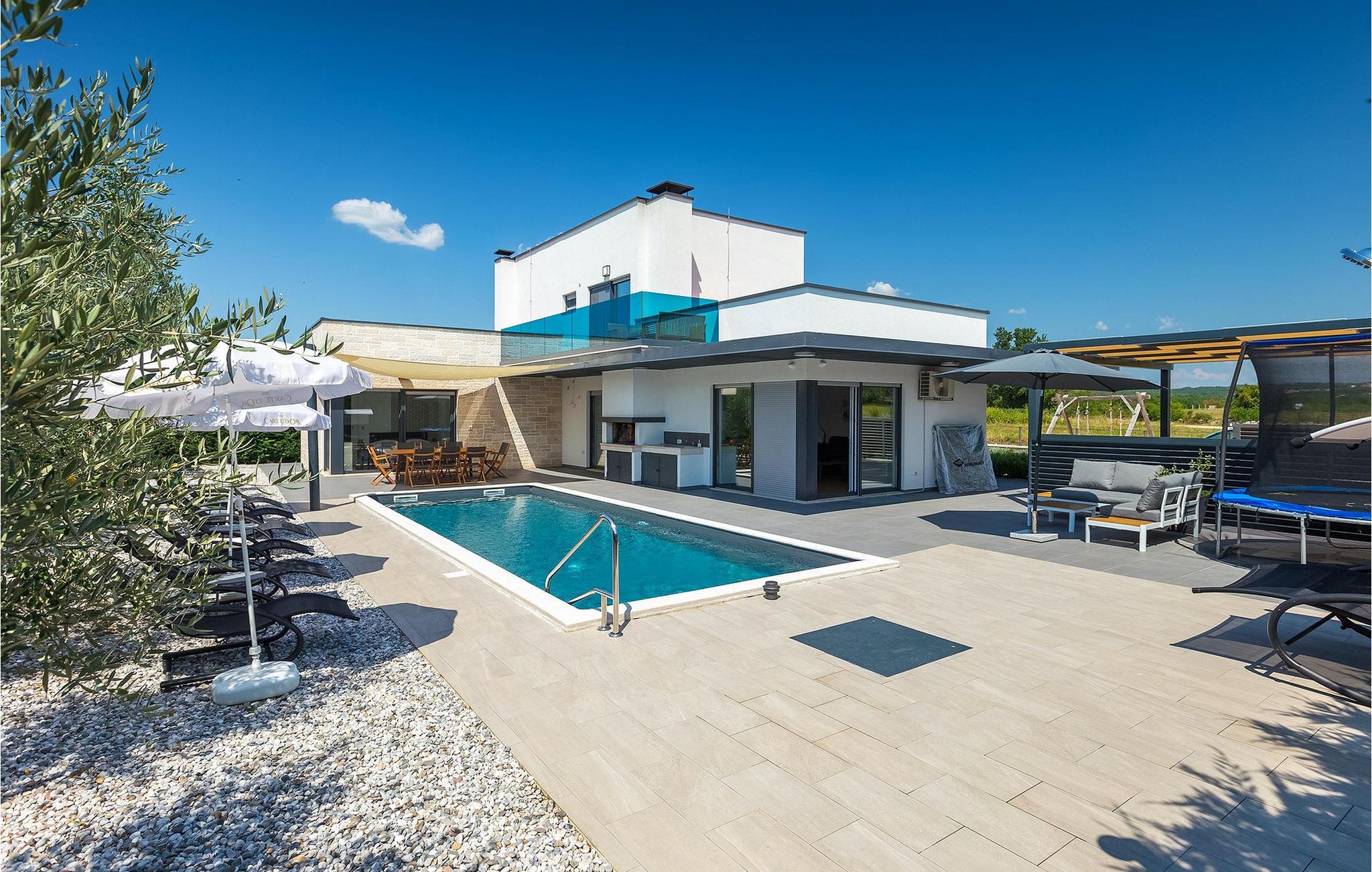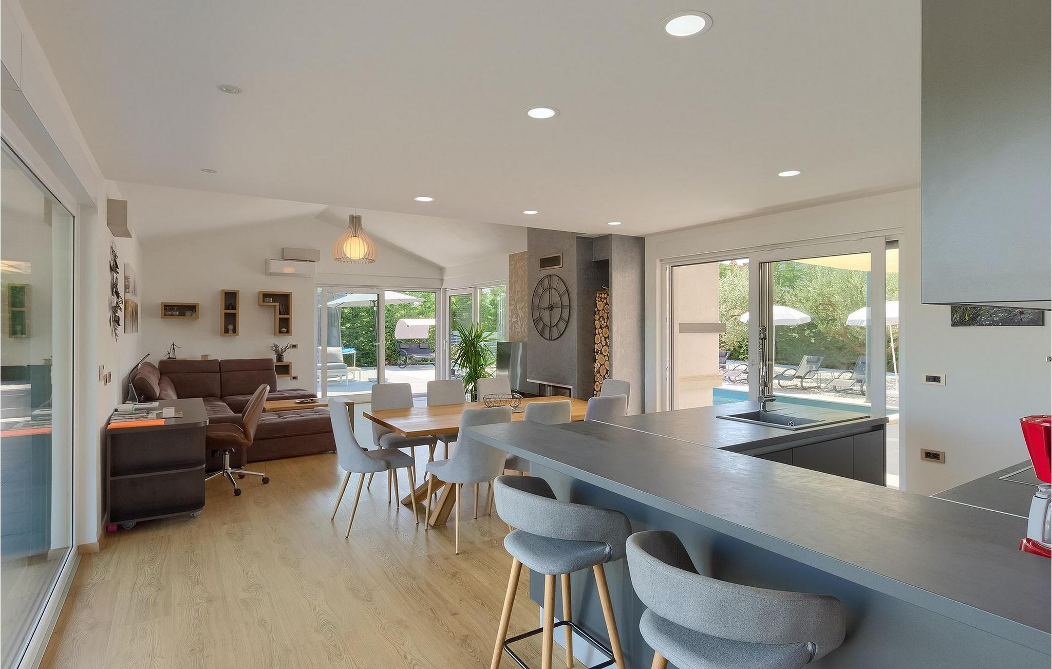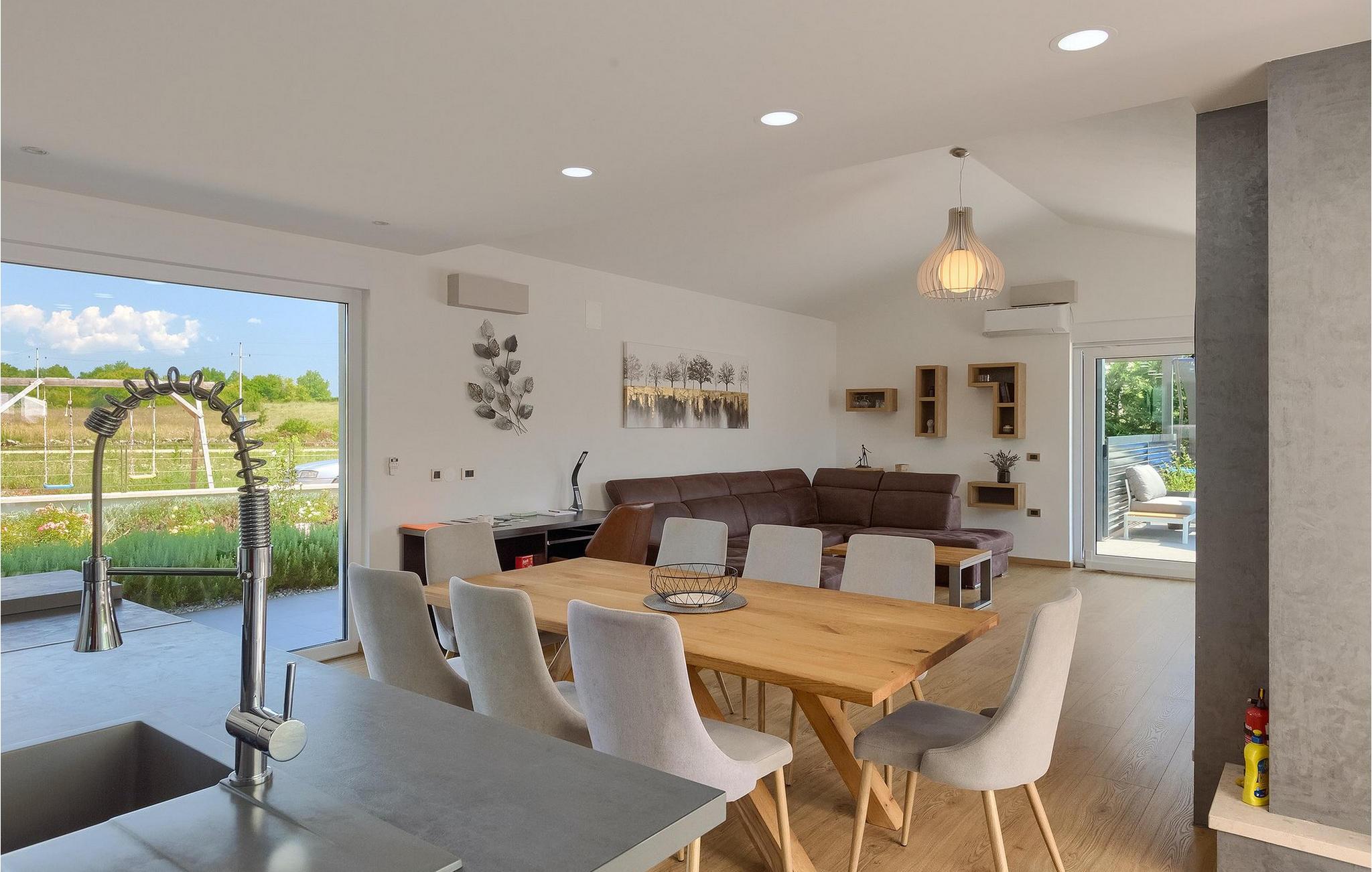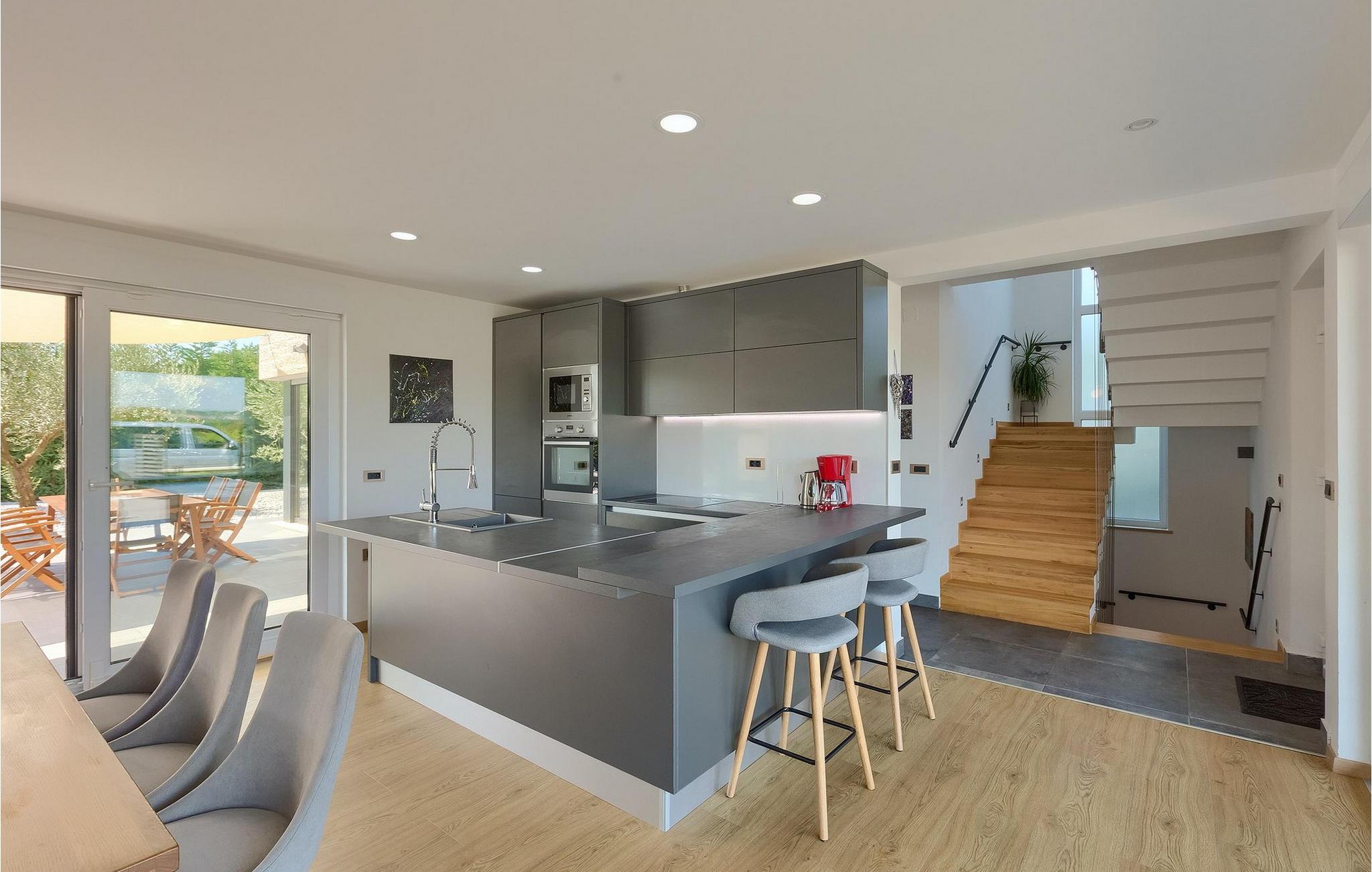 På terrassen kan I nyde lækre grillretter. Udsigten til terrassen, hvor en moderne grill og et rummeligt bord står til rådighed, afslører, hvad der venter dig inde i villaen. Hvis I træder fra terrassen ind i en rummelig stue, ser I det moderne interiør. Flotte møbler i behagelige farver og rene linjer sørger for en hjemlig atmosfære, mens glasvægge med udsigt til omgivelserne giver jer fantastisk udsigt til Istrien. Fra stuen træder man ind i spisestuen og det elegante køkken i dybe farver. Blot et par skridt videre fører en trætrappe op til øverste etage, hvor der er fire soveværelser og tre badeværelser med et moderne look.
