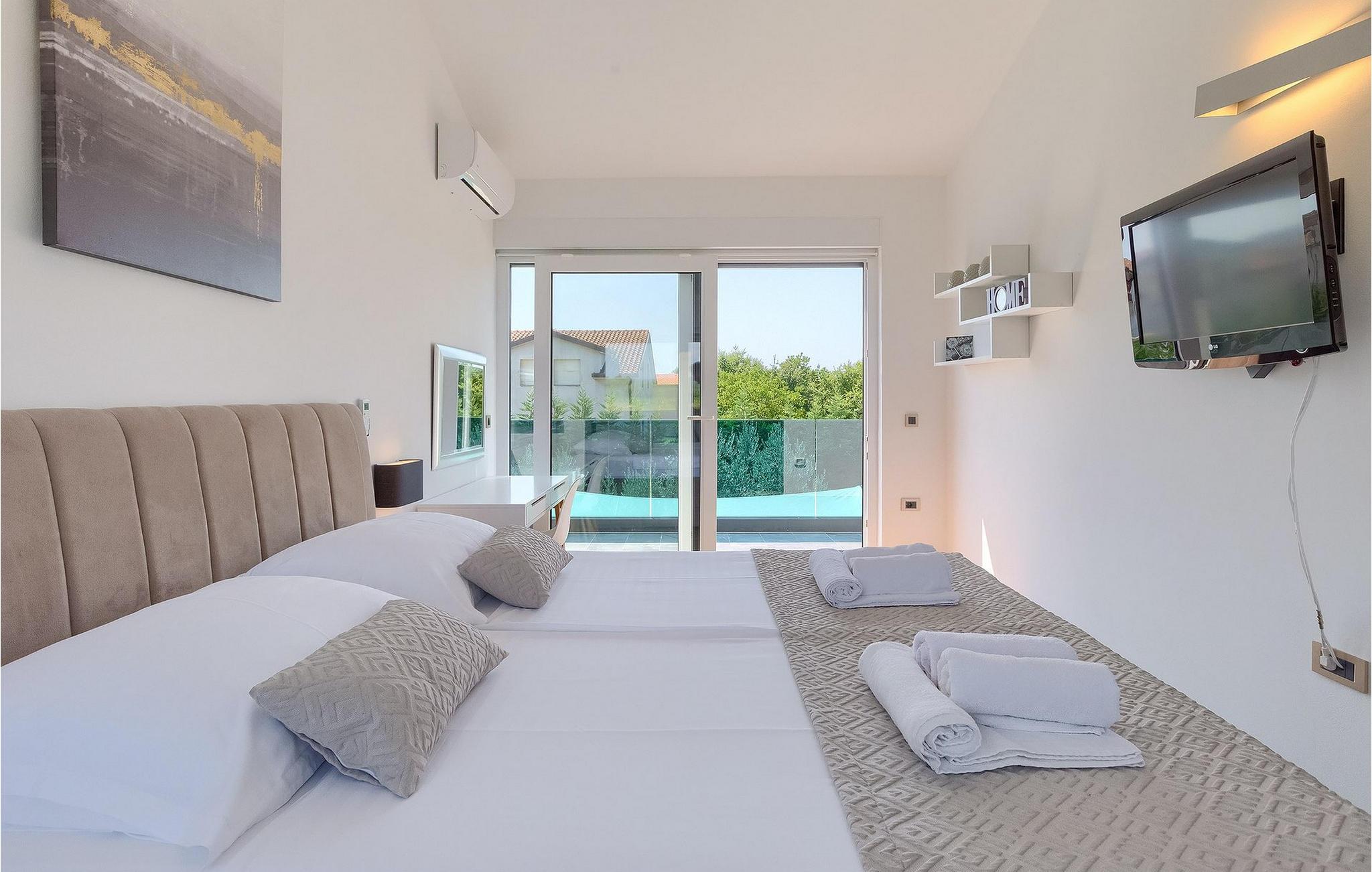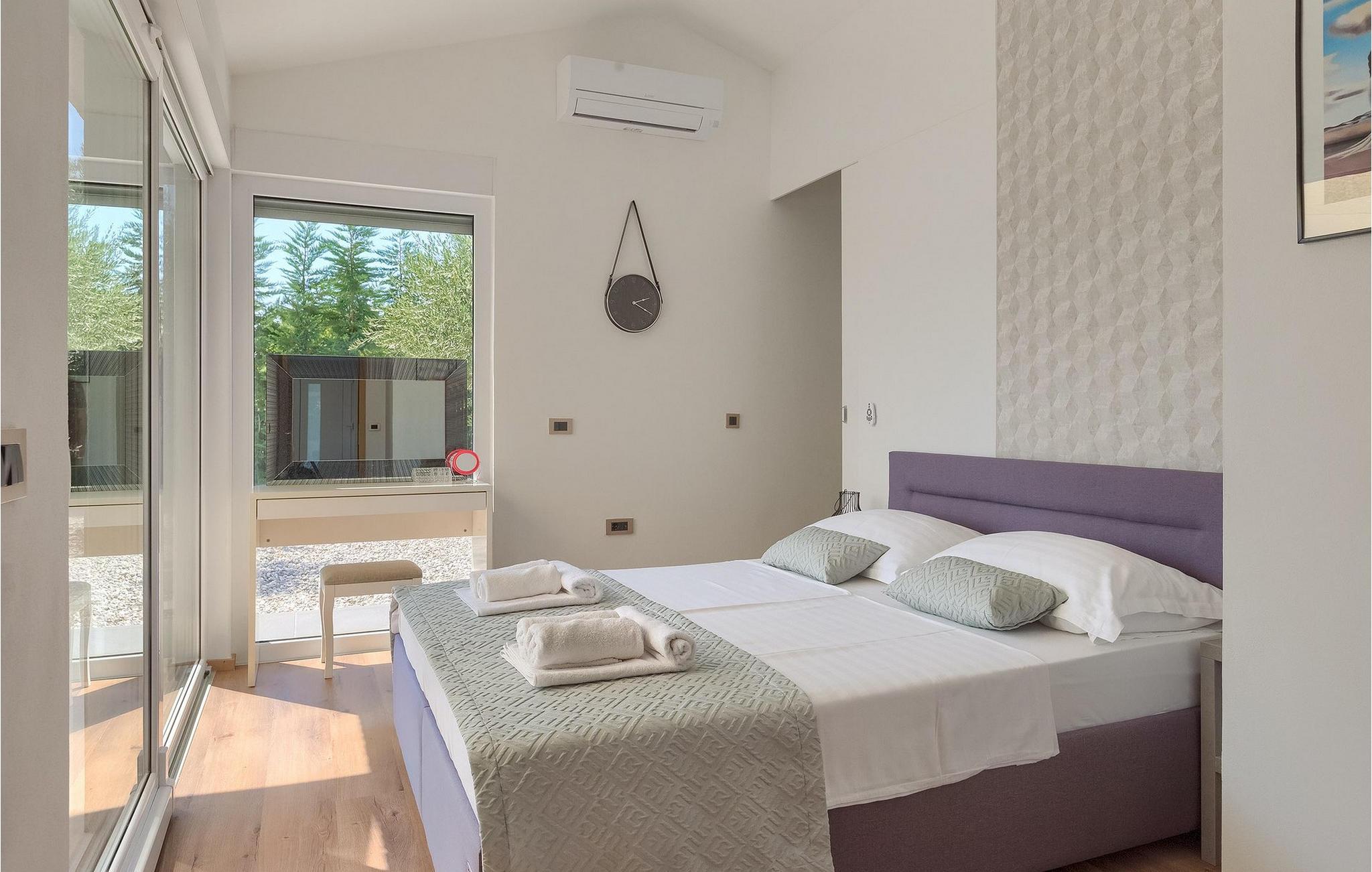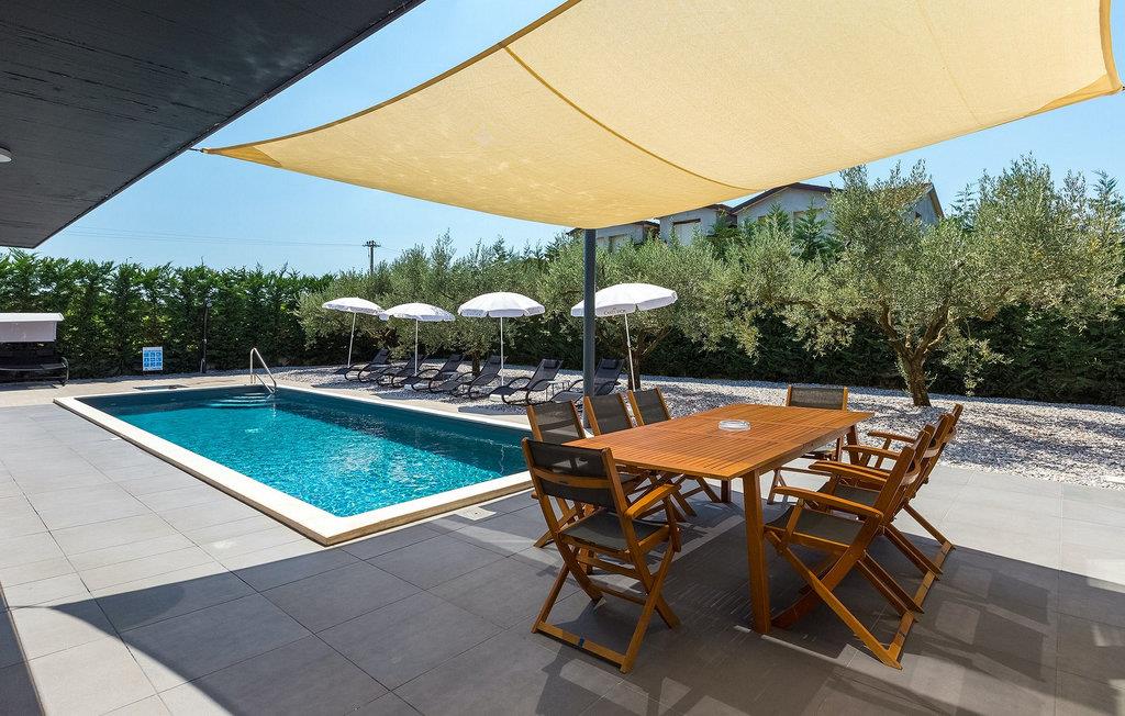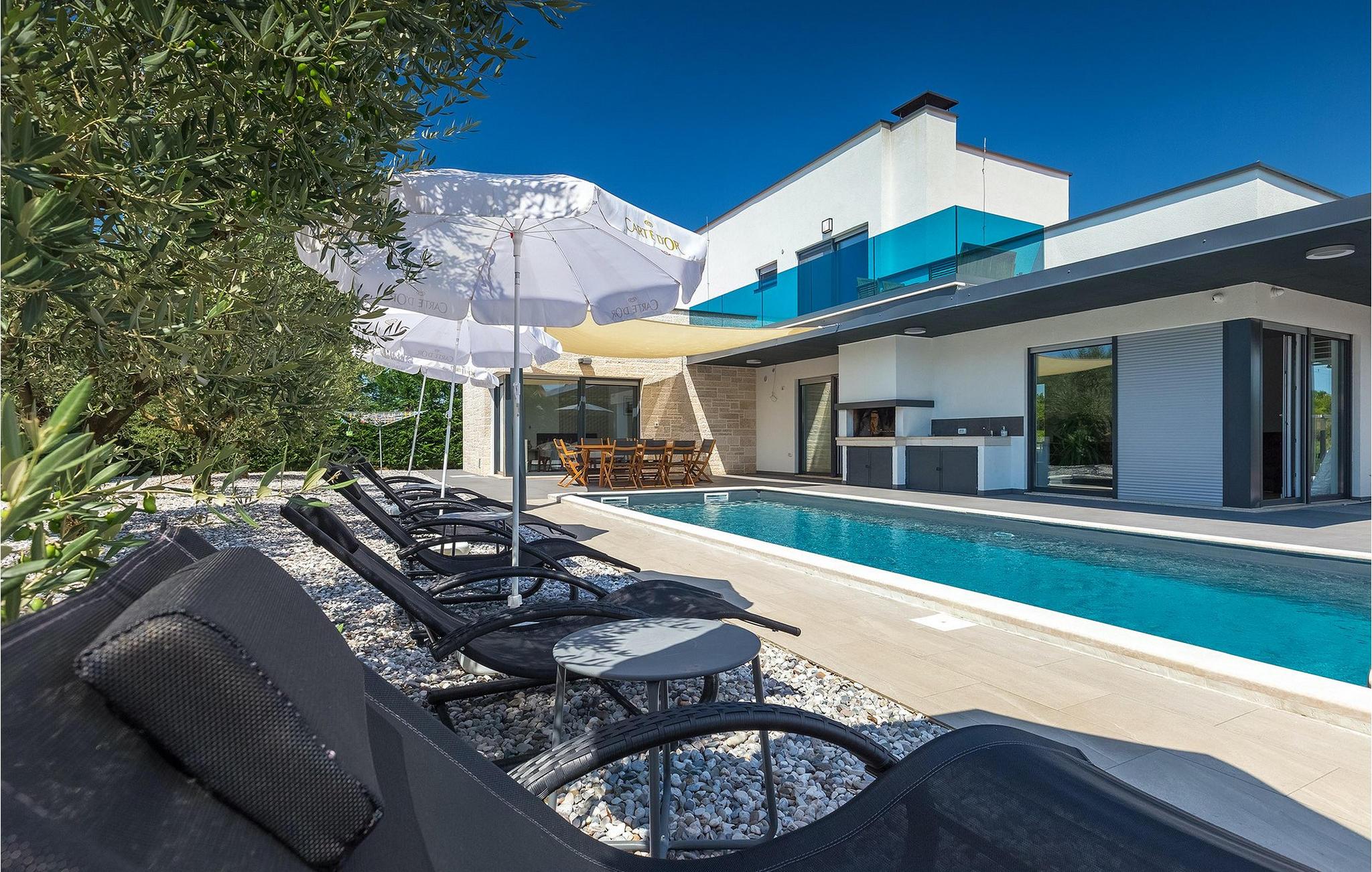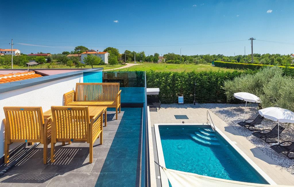 På terrassen kan I nyde lækre grillretter. Udsigten til terrassen, hvor en moderne grill og et rummeligt bord står til rådighed, afslører, hvad der venter dig inde i villaen. Hvis I træder fra terrassen ind i en rummelig stue, ser I det moderne interiør. Flotte møbler i behagelige farver og rene linjer sørger for en hjemlig atmosfære, mens glasvægge med udsigt til omgivelserne giver jer fantastisk udsigt til Istrien. Fra stuen træder man ind i spisestuen og det elegante køkken i dybe farver. Blot et par skridt videre fører en trætrappe op til øverste etage, hvor der er fire soveværelser og tre badeværelser med et moderne look.