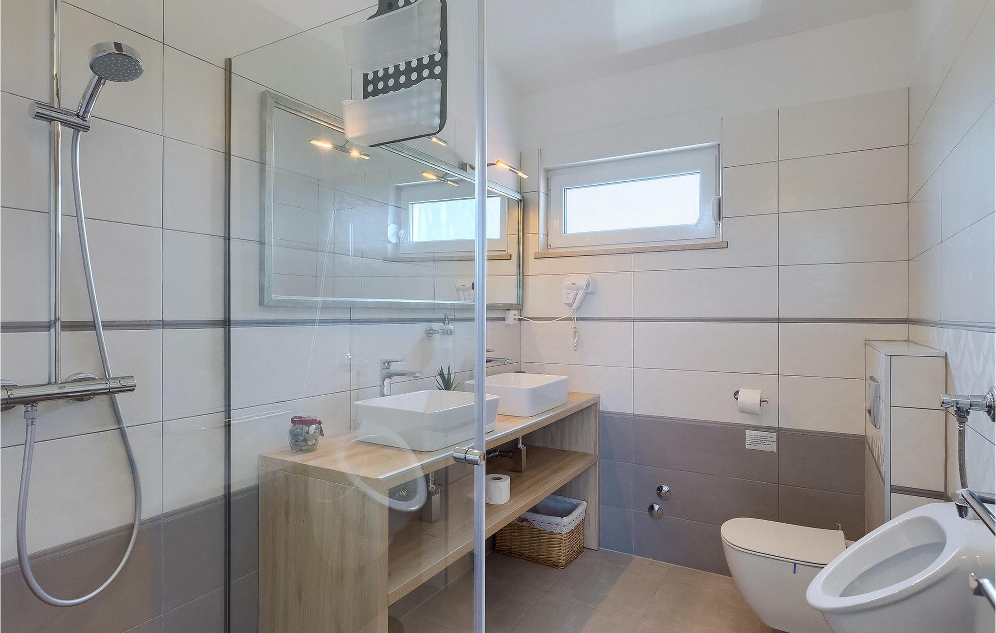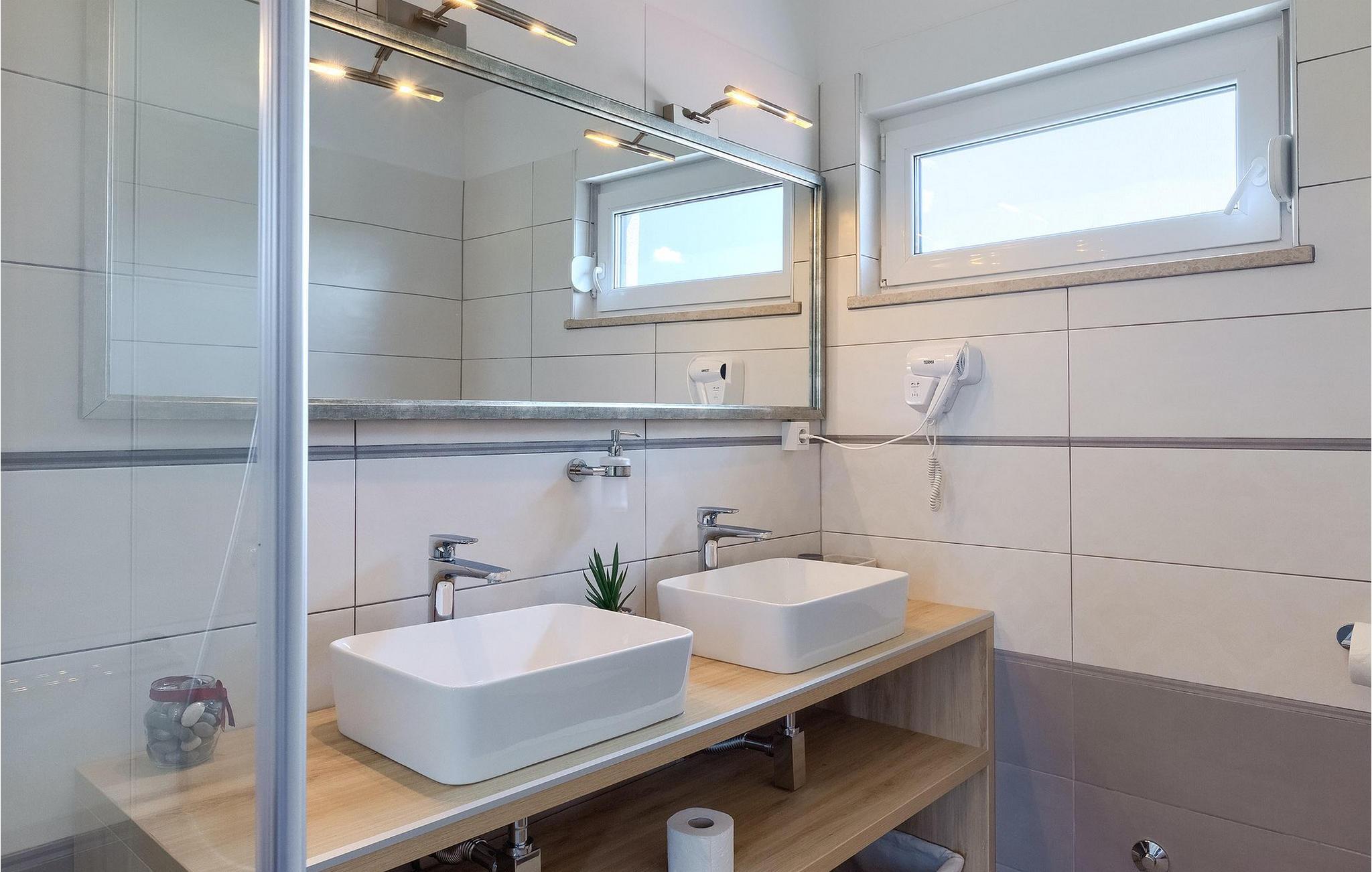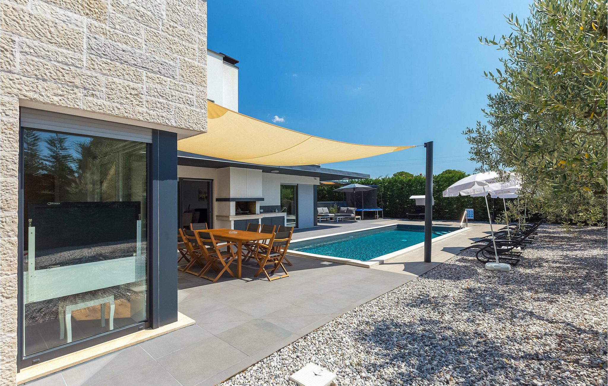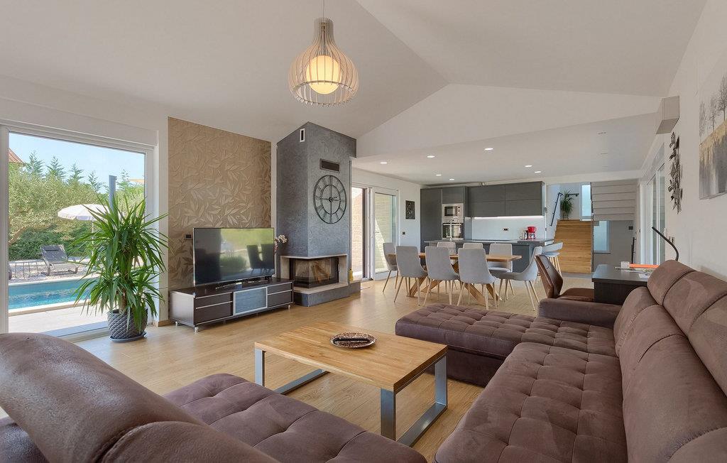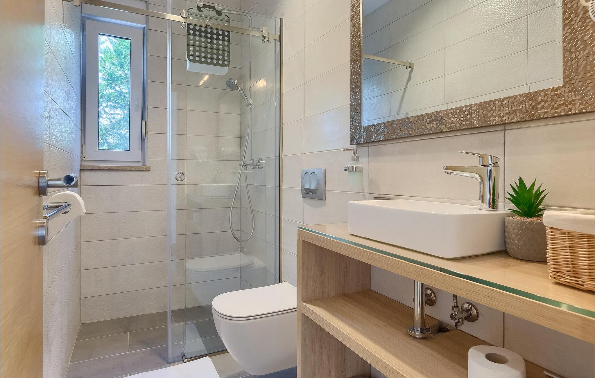 På terrassen kan I nyde lækre grillretter. Udsigten til terrassen, hvor en moderne grill og et rummeligt bord står til rådighed, afslører, hvad der venter dig inde i villaen. Hvis I træder fra terrassen ind i en rummelig stue, ser I det moderne interiør. Flotte møbler i behagelige farver og rene linjer sørger for en hjemlig atmosfære, mens glasvægge med udsigt til omgivelserne giver jer fantastisk udsigt til Istrien. Fra stuen træder man ind i spisestuen og det elegante køkken i dybe farver. Blot et par skridt videre fører en trætrappe op til øverste etage, hvor der er fire soveværelser og tre badeværelser med et moderne look.