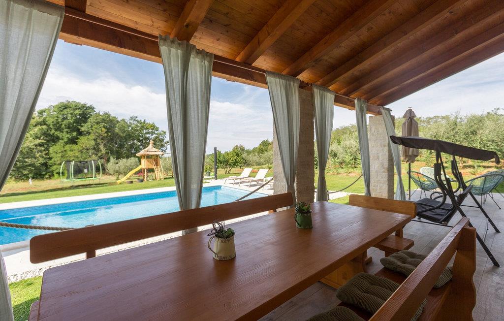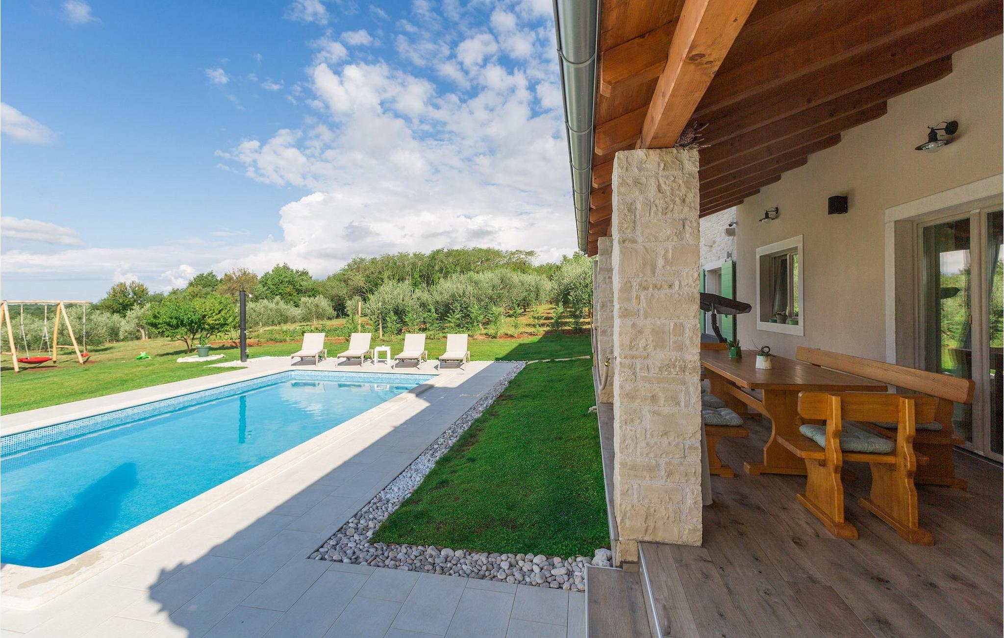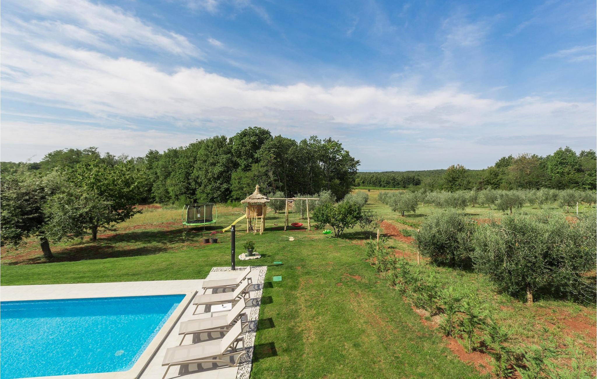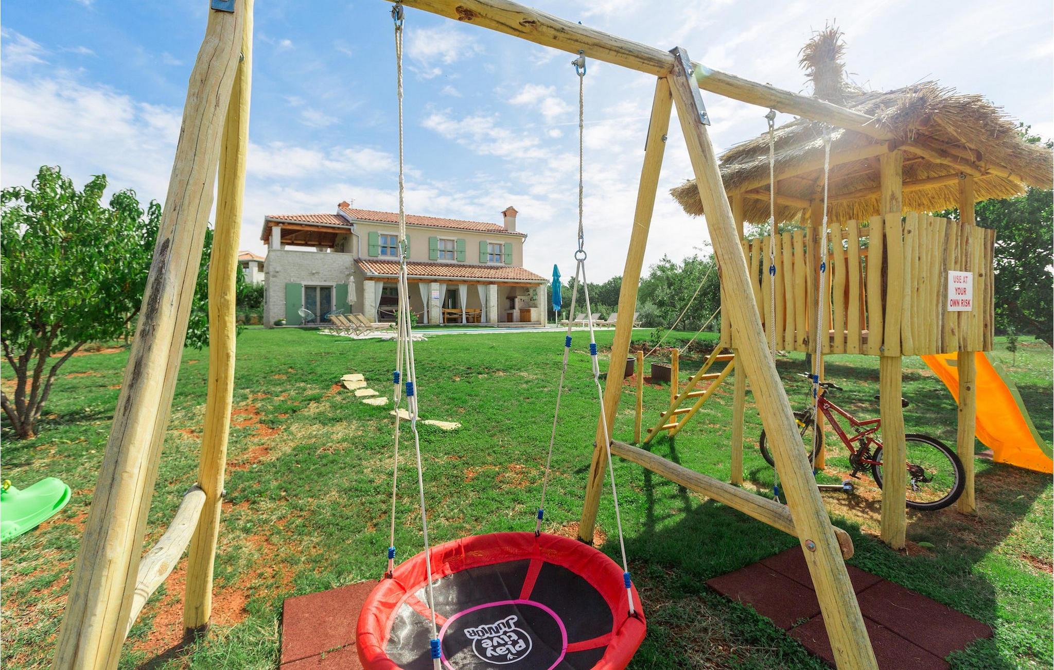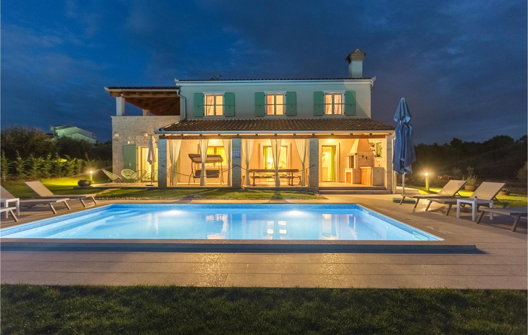 Leder du efter en hyggelig villa på halvøen Istrien med plads nok til op til 8 gæster? Så bør du helt sikkert overveje villa Stella Polaris til din kommende ferie. Mens du nærmer dig denne villa, vil du blive opmærksom på den smukke natur omkring - perfekt til en afslappende tid langt væk fra byens travlhed og menneskemængder. På selve ejendommen er der desuden en olivenlund, som giver villaen en typisk middelhavsfølelse. Inde i villaen byder den hjerteligt indrettede stueetage velkommen i dit sommerhus. Det åbne rum nedenunder, inklusive køkken, spisestue og opholdsstue, med de dejlige, tankevækkende dekorationer vil udløse kærligheden til detaljer i dig. Det fuldt udstyrede køkken er designet i en moderne landlig stil, der matcher spisestedet. I stuen kan du finde dig godt tilpas på sofaen og tænde for noget musik eller fjernsynet. Der er også en pejs til de kolde dage. Udover alt det nævnte byder stueetagen på et soveværelse med eget badeværelse. Et soveværelse i rustik stil ligger ovenpå. Det har ikke kun et ensuite badeværelse, men også en rummelig balkon med møbler og en smuk udsigt. På øverste etage deler yderligere to komfortable soveværelser med adskillelige dobbeltsenge et badeværelse. Alle villaens soveværelser har walk-in regnbruser. På villaens terrasse kan du sidde ned enten på en romantisk havegynge, et loungehjørnesæde eller ved den udendørs spiseplads - især hvis du foretrækker at spise dine måltider i frisk luft. Desuden kan du endda tilberede dine delikatesser på terrassen takket være det udendørs køkken med en grill. For fuld nydelse kan du lægge dig ned på liggestolene ved siden af den forfriskende pool og nyde noget varmt sollys. Haven giver også noget for de mindste - en privat legeplads og en trampolin. Tilbring en afslappende ferie fuld af mindeværdige øjeblikke og book villa Stella Polaris nuI den vestlige del af Istrien nær Porec ligger den lille landsby Visnjan. Gå en tur gennem de brostensbelagte gader i den gamle bydel og undersøg den historiske arv. Tøv ikke med at bede lokalbefolkningen om nogle historielektioner - de vil være ivrige efter at fortælle dig legender om deres hjemby. Går du rundt i den gamle bydel eller mens du udforsker området omkring Visnjan, støder du på traditionelle taverner, hvor du kan smage delikatesser fra det istriske køkken og kvalitetsvine. Nogle af dem falder ind under kategorien agriturisme, hvilket betyder, at der kun tilbydes deres egne landbrugsprodukter der - at sætte sig ned og spise der er en helt speciel oplevelse. Sørg for at besøge det berømte astronomiske observatorium. Lad det inspirere dig til at kigge op i himlen og nyde. Også, ikke langt væk fra Visnjan kan du gå og se Baredine-grotten eller Zarecki krov-vandfaldet - du vil blive bedøvet over den udsigt, du vil få. Og gå selvfølgelig ikke glip af muligheden for at besøge to af de mest populære steder på Istriens kyst - Porec og Novigrad. Der kan du tilbringe en smuk, afslappende dag på stranden eller en dejlig aften i bymidterne.