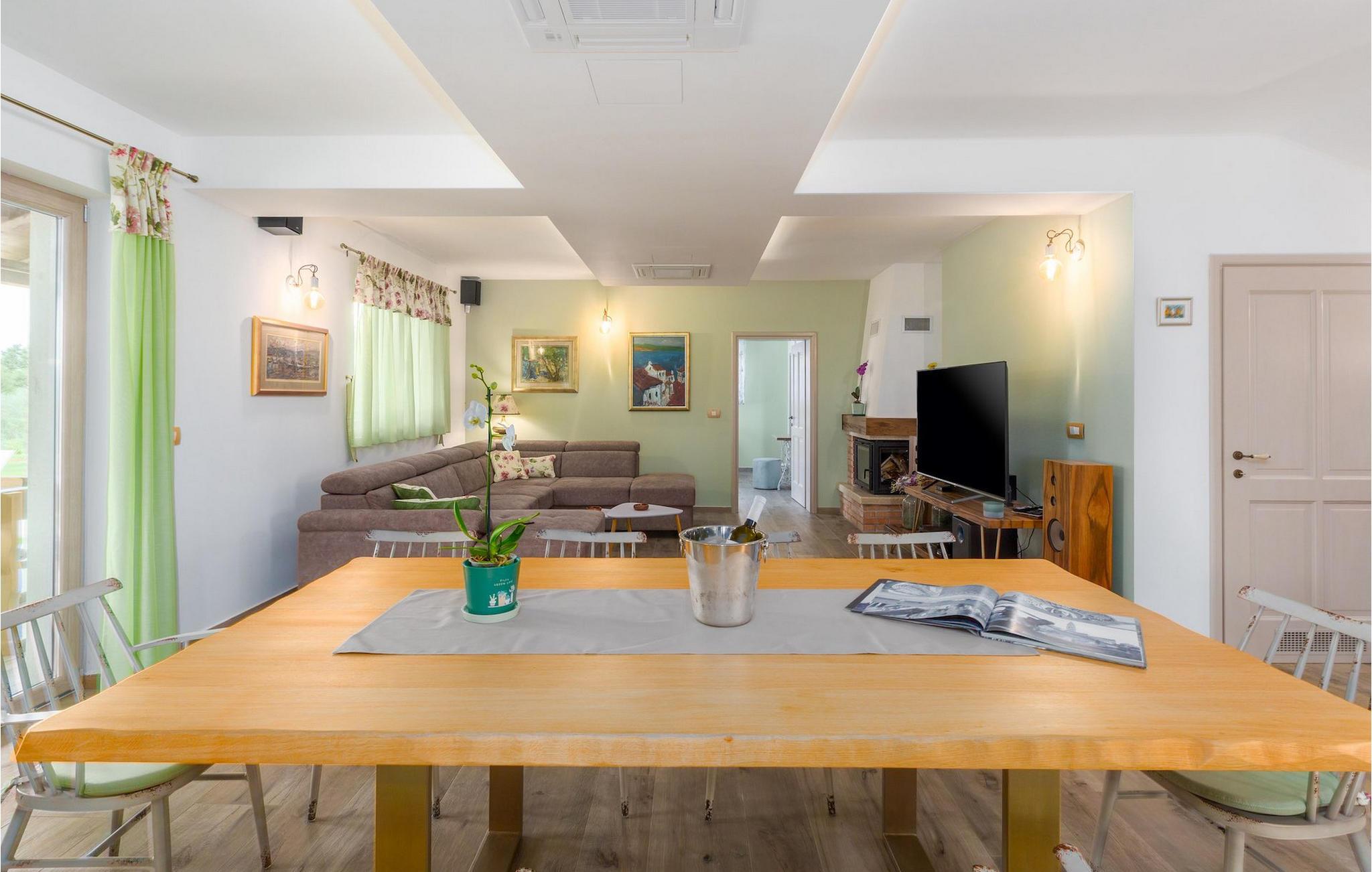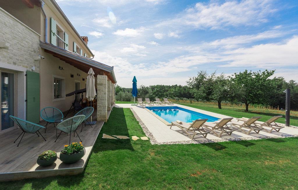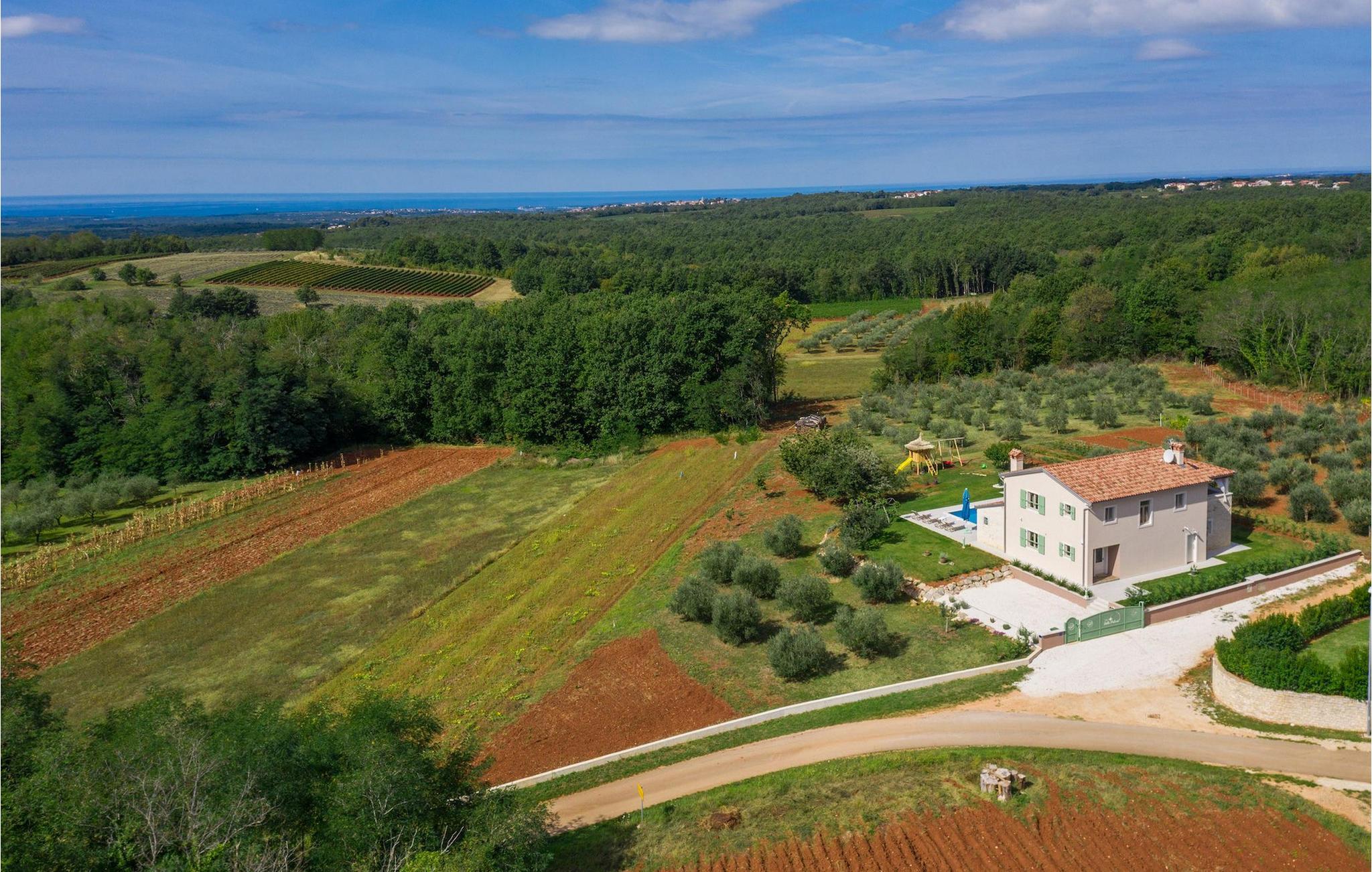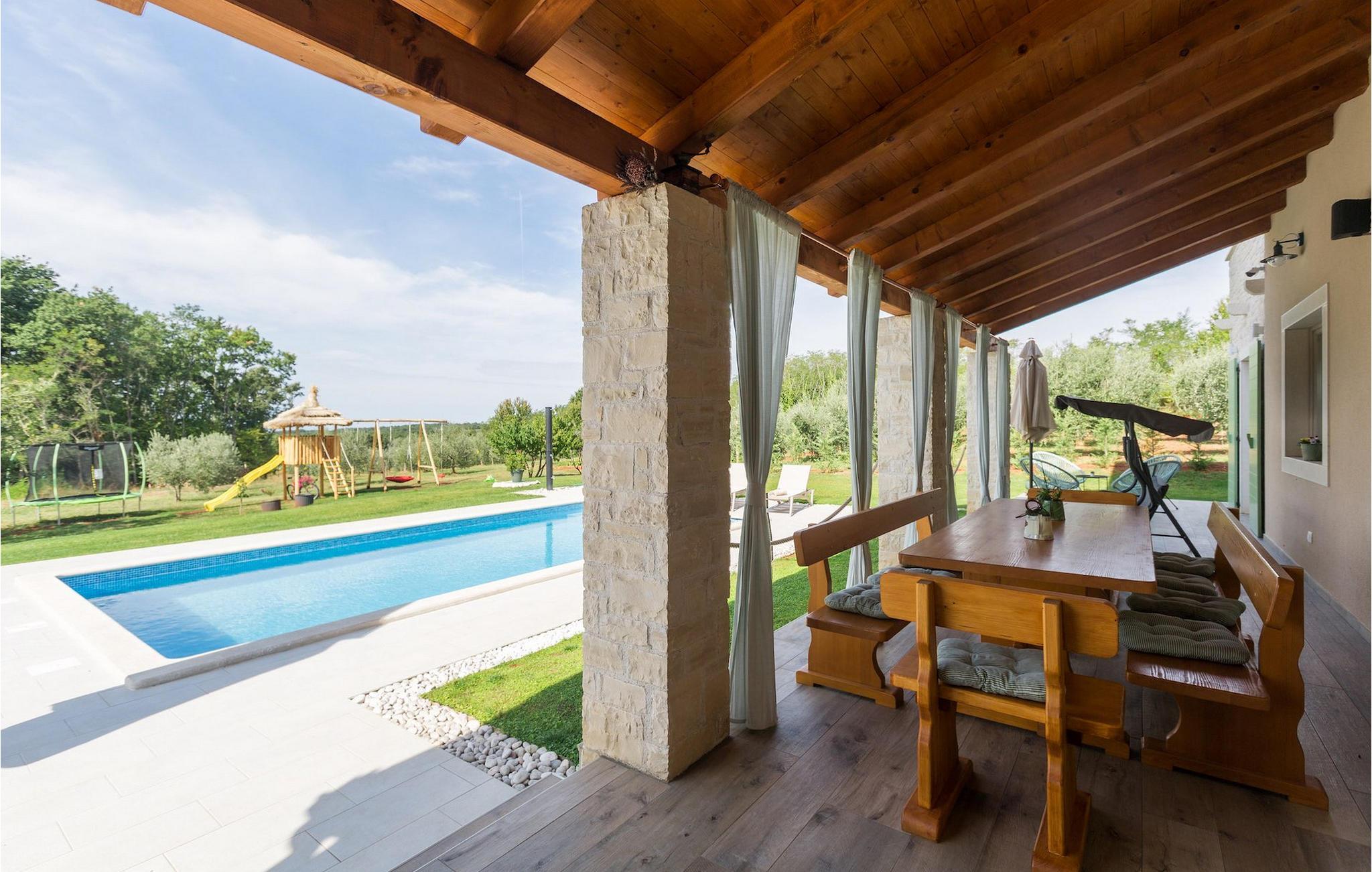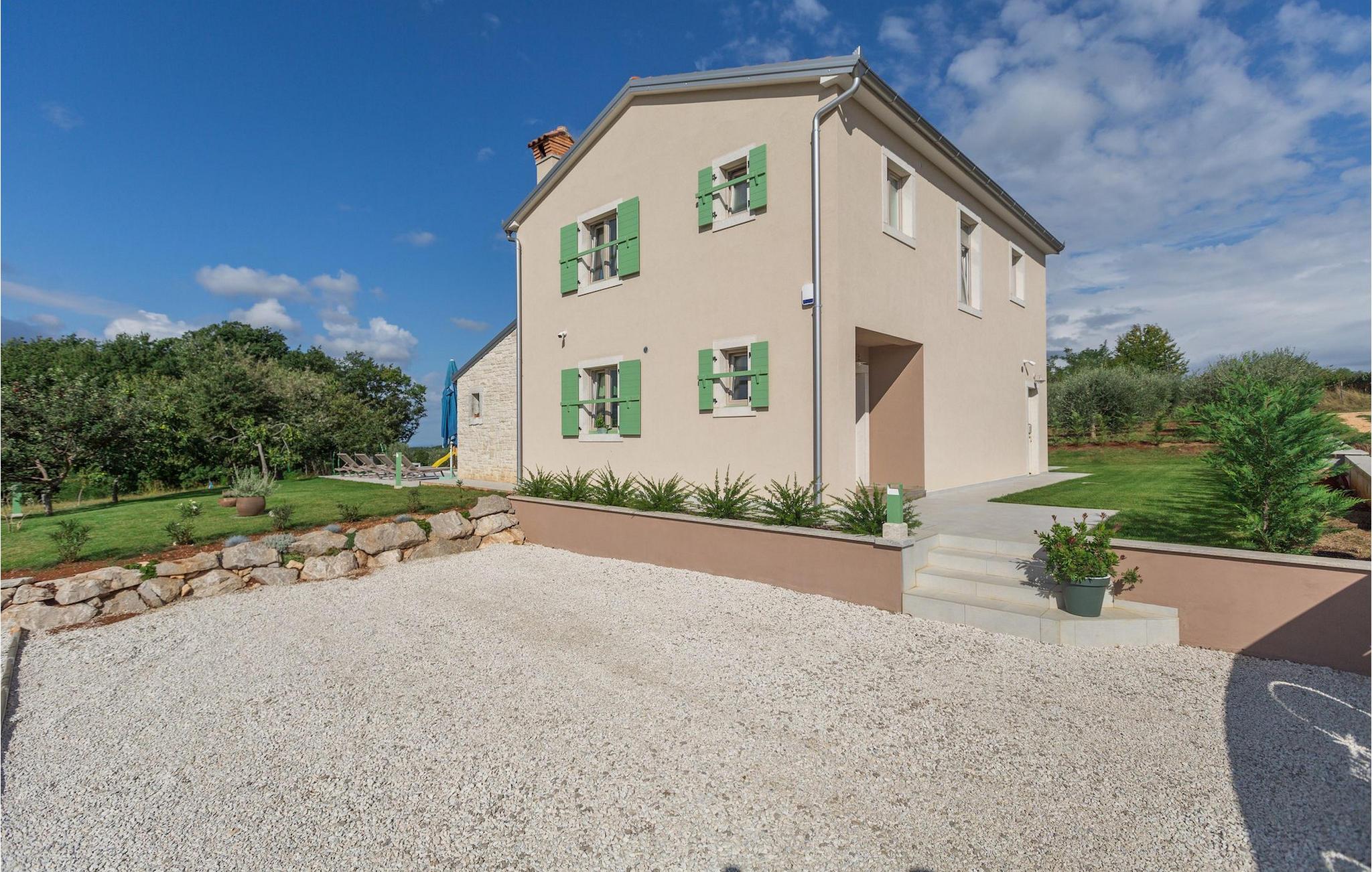 Leder du efter en hyggelig villa på halvøen Istrien med plads nok til op til 8 gæster? Så bør du helt sikkert overveje villa Stella Polaris til din kommende ferie. Mens du nærmer dig denne villa, vil du blive opmærksom på den smukke natur omkring - perfekt til en afslappende tid langt væk fra byens travlhed og menneskemængder. På selve ejendommen er der desuden en olivenlund, som giver villaen en typisk middelhavsfølelse. Inde i villaen byder den hjerteligt indrettede stueetage velkommen i dit sommerhus. Det åbne rum nedenunder, inklusive køkken, spisestue og opholdsstue, med de dejlige, tankevækkende dekorationer vil udløse kærligheden til detaljer i dig. Det fuldt udstyrede køkken er designet i en moderne landlig stil, der matcher spisestedet. I stuen kan du finde dig godt tilpas på sofaen og tænde for noget musik eller fjernsynet. Der er også en pejs til de kolde dage. Udover alt det nævnte byder stueetagen på et soveværelse med eget badeværelse. Et soveværelse i rustik stil ligger ovenpå. Det har ikke kun et ensuite badeværelse, men også en rummelig balkon med møbler og en smuk udsigt. På øverste etage deler yderligere to komfortable soveværelser med adskillelige dobbeltsenge et badeværelse. Alle villaens soveværelser har walk-in regnbruser. På villaens terrasse kan du sidde ned enten på en romantisk havegynge, et loungehjørnesæde eller ved den udendørs spiseplads - især hvis du foretrækker at spise dine måltider i frisk luft. Desuden kan du endda tilberede dine delikatesser på terrassen takket være det udendørs køkken med en grill. For fuld nydelse kan du lægge dig ned på liggestolene ved siden af den forfriskende pool og nyde noget varmt sollys. Haven giver også noget for de mindste - en privat legeplads og en trampolin. Tilbring en afslappende ferie fuld af mindeværdige øjeblikke og book villa Stella Polaris nuI den vestlige del af Istrien nær Porec ligger den lille landsby Visnjan. Gå en tur gennem de brostensbelagte gader i den gamle bydel og undersøg den historiske arv. Tøv ikke med at bede lokalbefolkningen om nogle historielektioner - de vil være ivrige efter at fortælle dig legender om deres hjemby. Går du rundt i den gamle bydel eller mens du udforsker området omkring Visnjan, støder du på traditionelle taverner, hvor du kan smage delikatesser fra det istriske køkken og kvalitetsvine. Nogle af dem falder ind under kategorien agriturisme, hvilket betyder, at der kun tilbydes deres egne landbrugsprodukter der - at sætte sig ned og spise der er en helt speciel oplevelse. Sørg for at besøge det berømte astronomiske observatorium. Lad det inspirere dig til at kigge op i himlen og nyde. Også, ikke langt væk fra Visnjan kan du gå og se Baredine-grotten eller Zarecki krov-vandfaldet - du vil blive bedøvet over den udsigt, du vil få. Og gå selvfølgelig ikke glip af muligheden for at besøge to af de mest populære steder på Istriens kyst - Porec og Novigrad. Der kan du tilbringe en smuk, afslappende dag på stranden eller en dejlig aften i bymidterne.