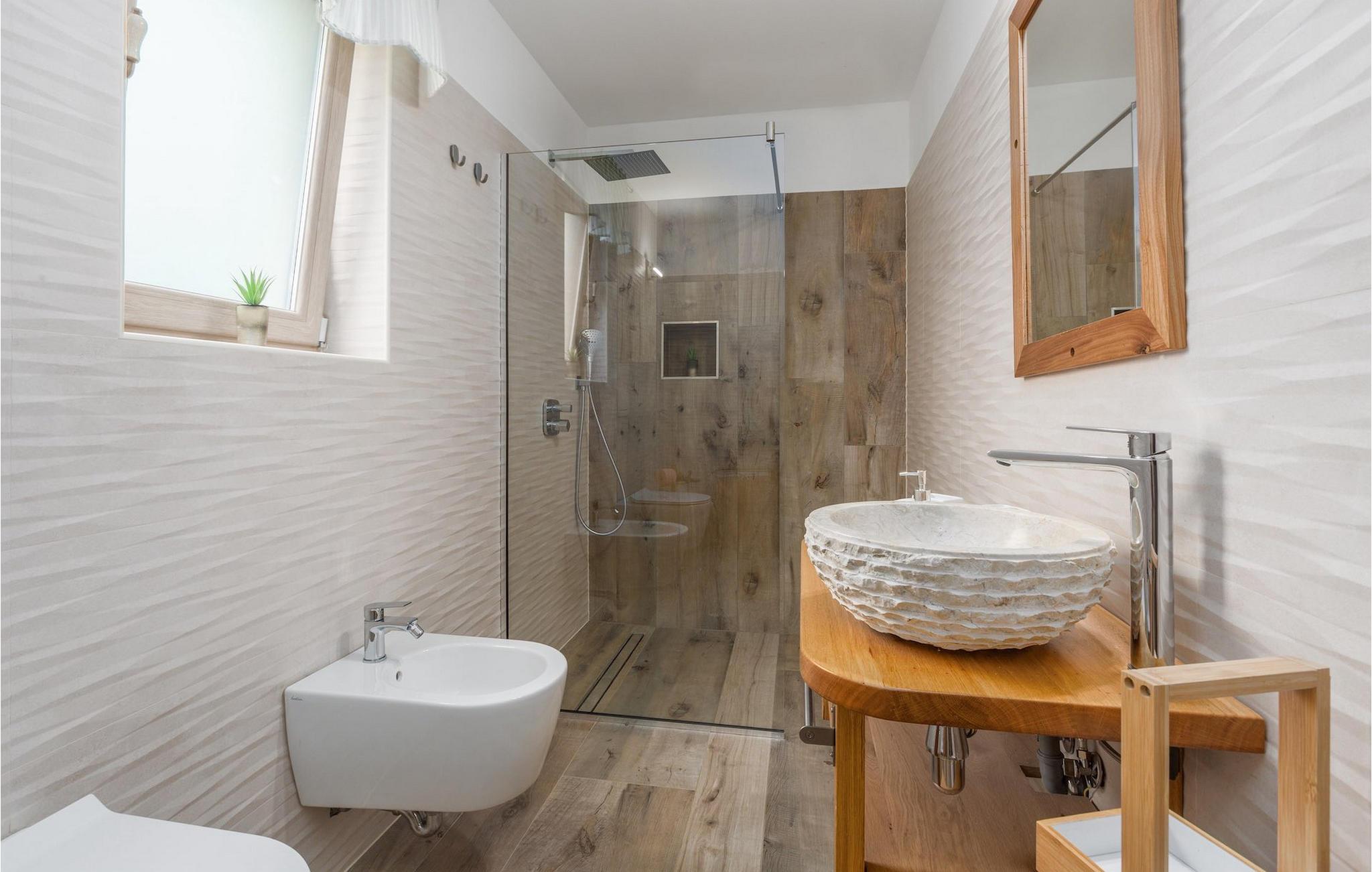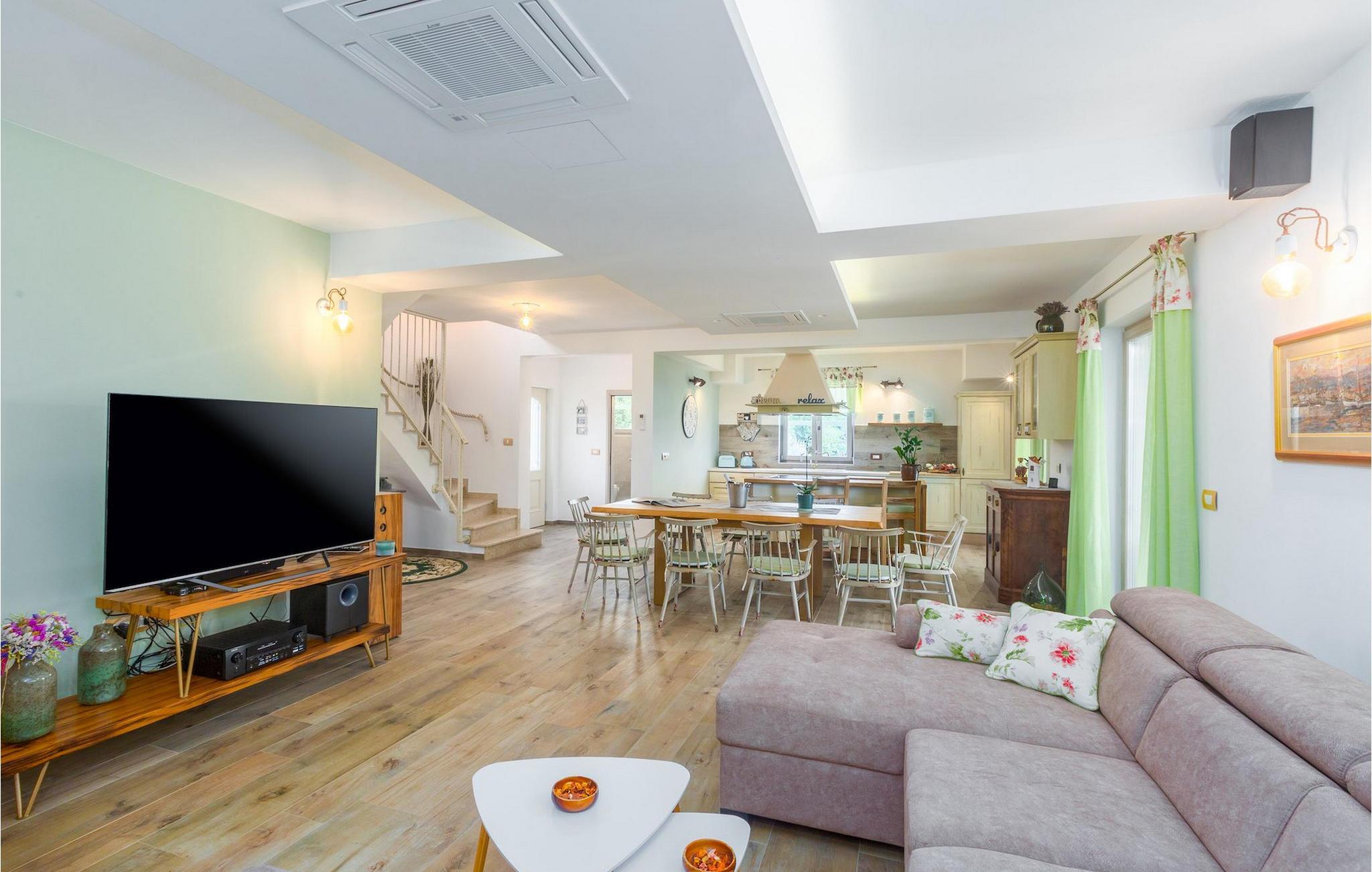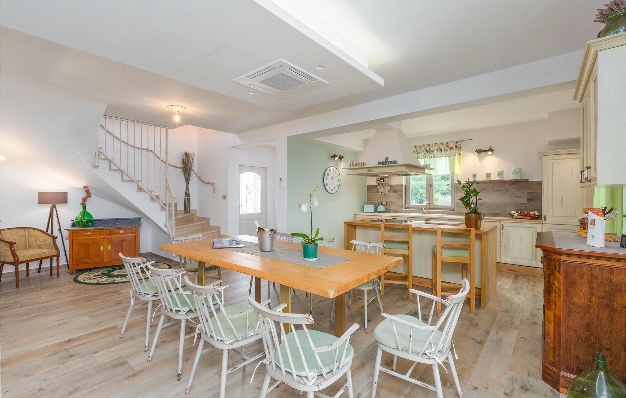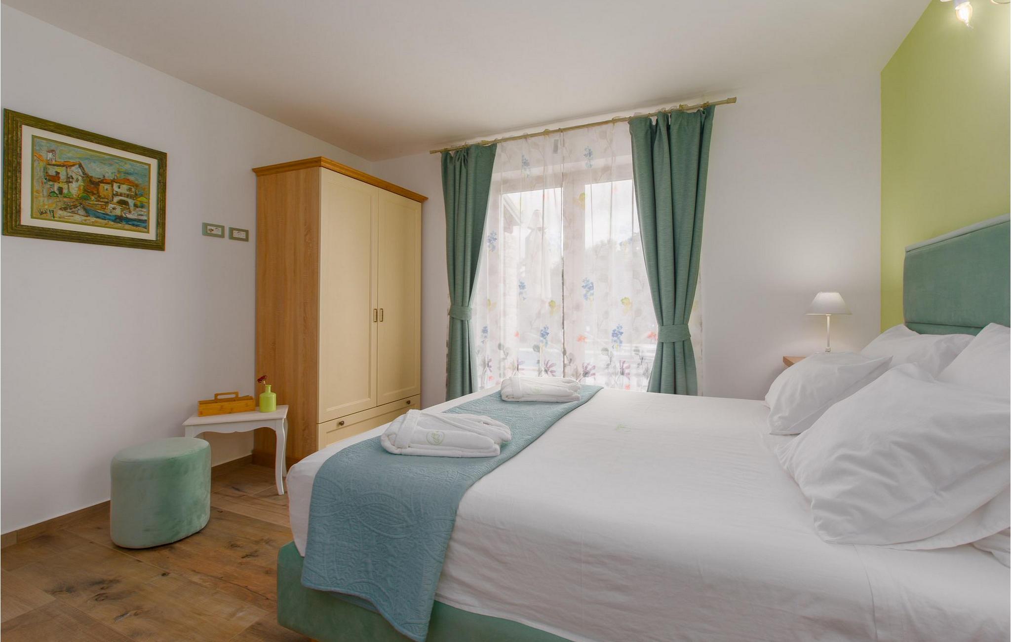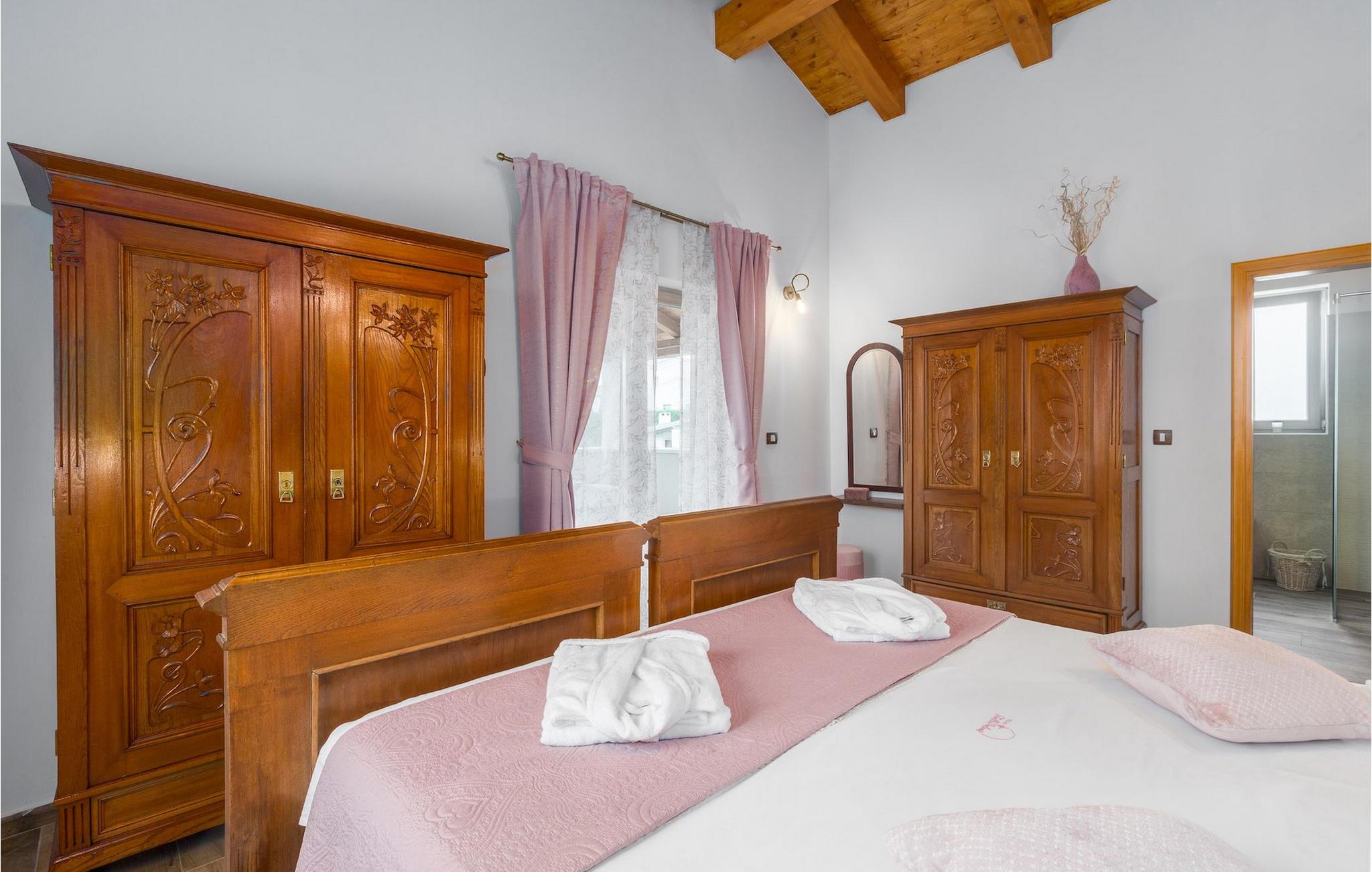 Leder du efter en hyggelig villa på halvøen Istrien med plads nok til op til 8 gæster? Så bør du helt sikkert overveje villa Stella Polaris til din kommende ferie. Mens du nærmer dig denne villa, vil du blive opmærksom på den smukke natur omkring - perfekt til en afslappende tid langt væk fra byens travlhed og menneskemængder. På selve ejendommen er der desuden en olivenlund, som giver villaen en typisk middelhavsfølelse. Inde i villaen byder den hjerteligt indrettede stueetage velkommen i dit sommerhus. Det åbne rum nedenunder, inklusive køkken, spisestue og opholdsstue, med de dejlige, tankevækkende dekorationer vil udløse kærligheden til detaljer i dig. Det fuldt udstyrede køkken er designet i en moderne landlig stil, der matcher spisestedet. I stuen kan du finde dig godt tilpas på sofaen og tænde for noget musik eller fjernsynet. Der er også en pejs til de kolde dage. Udover alt det nævnte byder stueetagen på et soveværelse med eget badeværelse. Et soveværelse i rustik stil ligger ovenpå. Det har ikke kun et ensuite badeværelse, men også en rummelig balkon med møbler og en smuk udsigt. På øverste etage deler yderligere to komfortable soveværelser med adskillelige dobbeltsenge et badeværelse. Alle villaens soveværelser har walk-in regnbruser. På villaens terrasse kan du sidde ned enten på en romantisk havegynge, et loungehjørnesæde eller ved den udendørs spiseplads - især hvis du foretrækker at spise dine måltider i frisk luft. Desuden kan du endda tilberede dine delikatesser på terrassen takket være det udendørs køkken med en grill. For fuld nydelse kan du lægge dig ned på liggestolene ved siden af den forfriskende pool og nyde noget varmt sollys. Haven giver også noget for de mindste - en privat legeplads og en trampolin. Tilbring en afslappende ferie fuld af mindeværdige øjeblikke og book villa Stella Polaris nuI den vestlige del af Istrien nær Porec ligger den lille landsby Visnjan. Gå en tur gennem de brostensbelagte gader i den gamle bydel og undersøg den historiske arv. Tøv ikke med at bede lokalbefolkningen om nogle historielektioner - de vil være ivrige efter at fortælle dig legender om deres hjemby. Går du rundt i den gamle bydel eller mens du udforsker området omkring Visnjan, støder du på traditionelle taverner, hvor du kan smage delikatesser fra det istriske køkken og kvalitetsvine. Nogle af dem falder ind under kategorien agriturisme, hvilket betyder, at der kun tilbydes deres egne landbrugsprodukter der - at sætte sig ned og spise der er en helt speciel oplevelse. Sørg for at besøge det berømte astronomiske observatorium. Lad det inspirere dig til at kigge op i himlen og nyde. Også, ikke langt væk fra Visnjan kan du gå og se Baredine-grotten eller Zarecki krov-vandfaldet - du vil blive bedøvet over den udsigt, du vil få. Og gå selvfølgelig ikke glip af muligheden for at besøge to af de mest populære steder på Istriens kyst - Porec og Novigrad. Der kan du tilbringe en smuk, afslappende dag på stranden eller en dejlig aften i bymidterne.