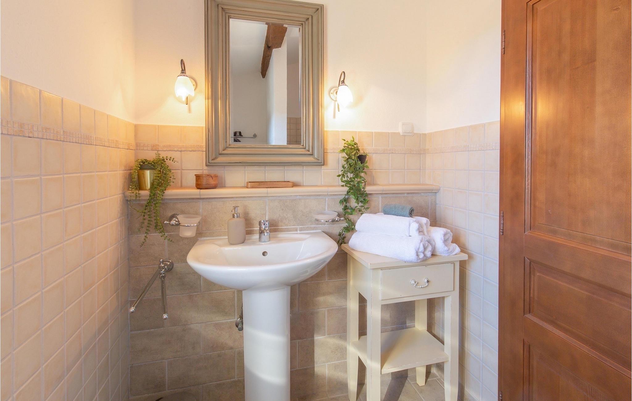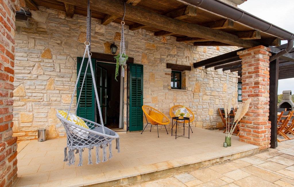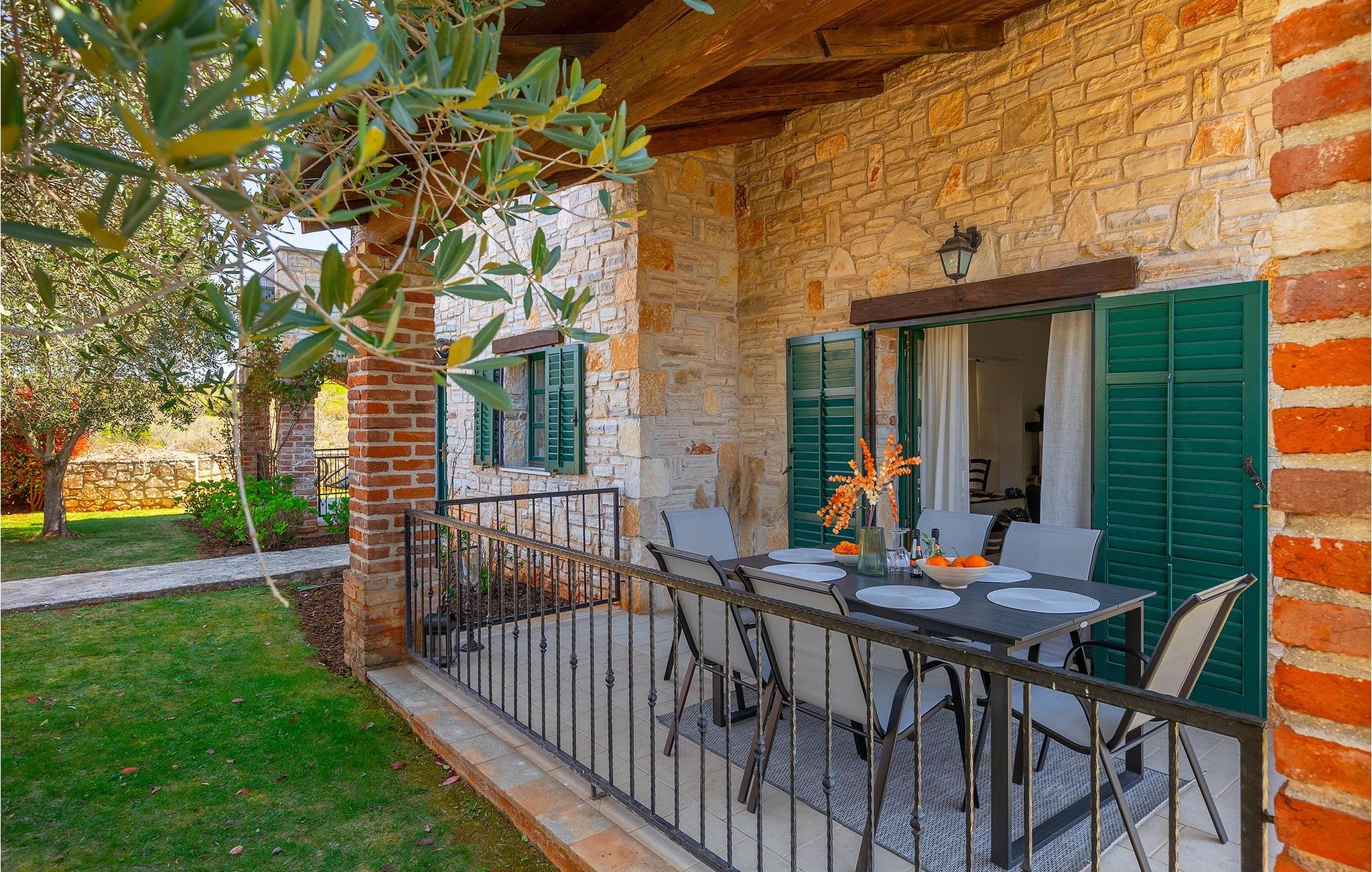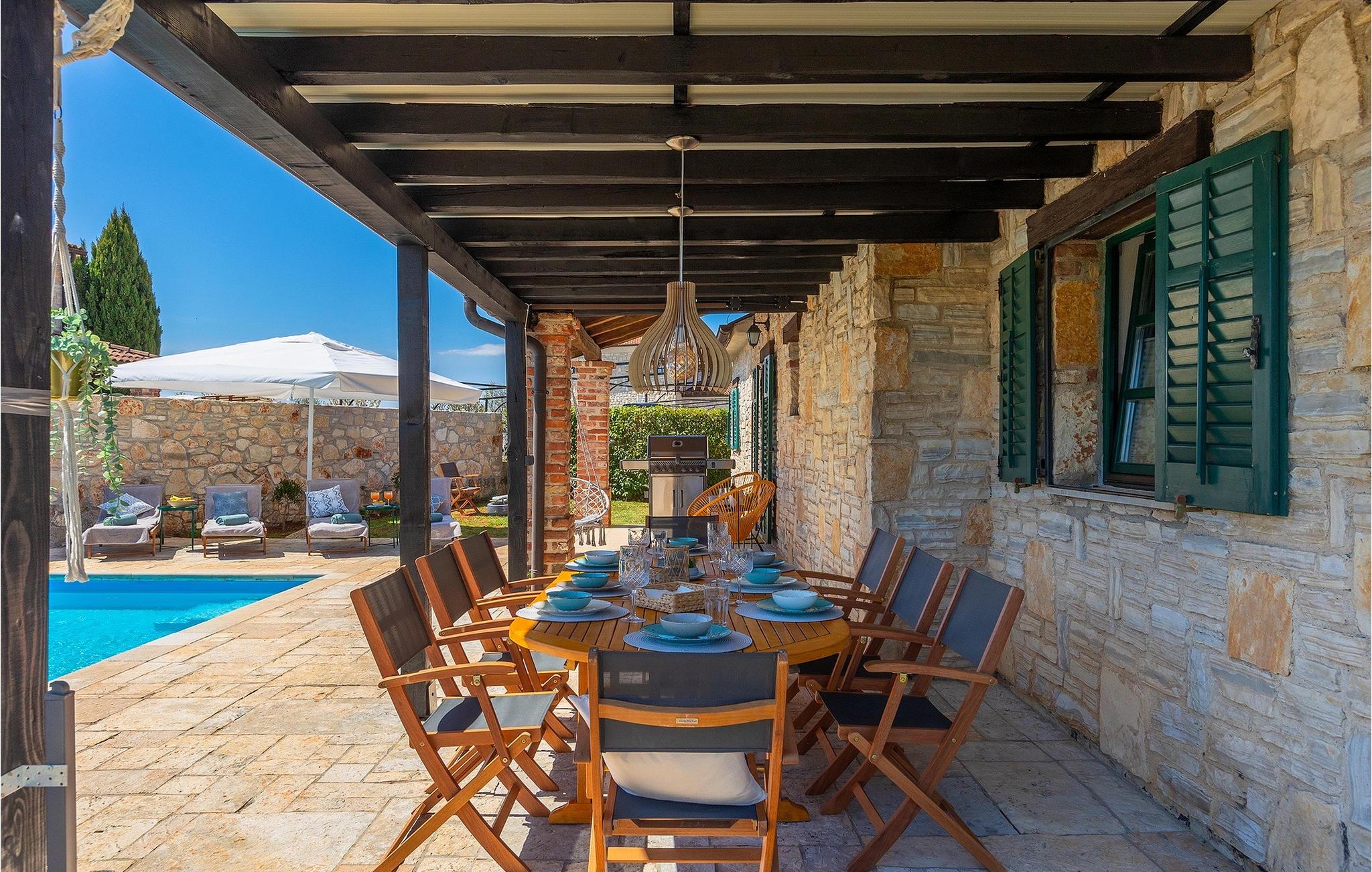Hvis du leder efter en villa til en fredelig ferie, er Villa Silene, et istrisk stenhus med et hjerte, det ideelle valg for dig. Den charmerende villa byder på fire soveværelser for op til otte gæster. På første sal i villaen er der tre soveværelser. Alle tre værelser er lyse og komfortable, træbjælker og møbler giver dem en særlig flair. Hvert værelse har aircondition, en dobbeltseng og udgang til balkonen. Det ene soveværelse har eget badeværelse, mens de to andre bruger et fælles badeværelse, som også er placeret på samme etage. Et af soveværelserne har også et tv. I villaens stueetage finder du et soveværelse med aircondition og eget badeværelse, dobbeltseng og udgang til terrassen. Stueetagen byder også på opholdsstue med TV og pejs, som er forbundet med spisestuen og et fuldt udstyret rummeligt køkken i et åbent rum koncept. Hele dette rum har aircondition. Stenvæggene i interiøret, den store pejs og træbjælkerne, der strækker sig over lofterne, giver en særlig form for charme til villaen.