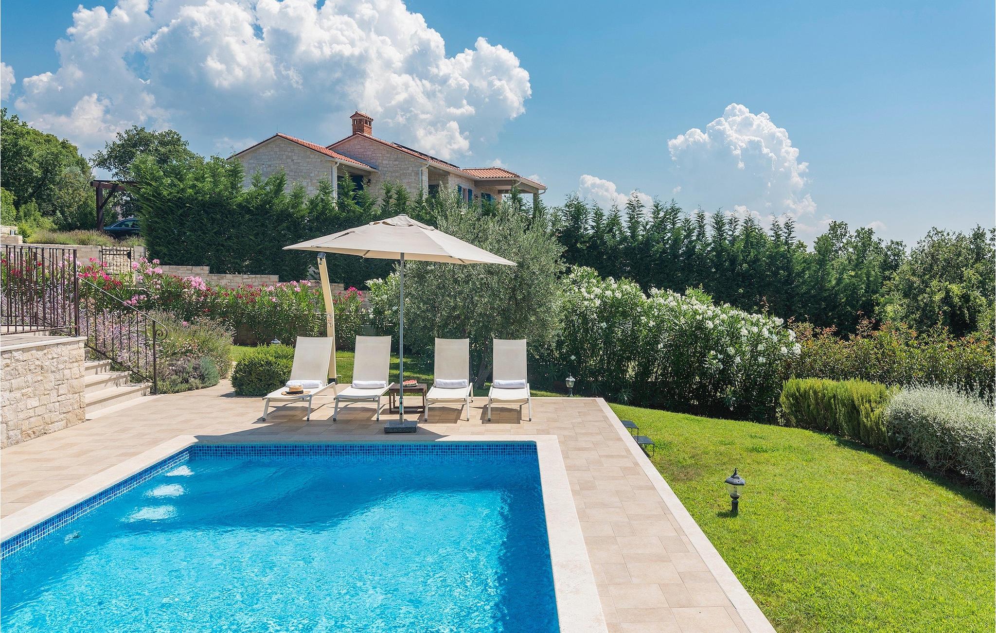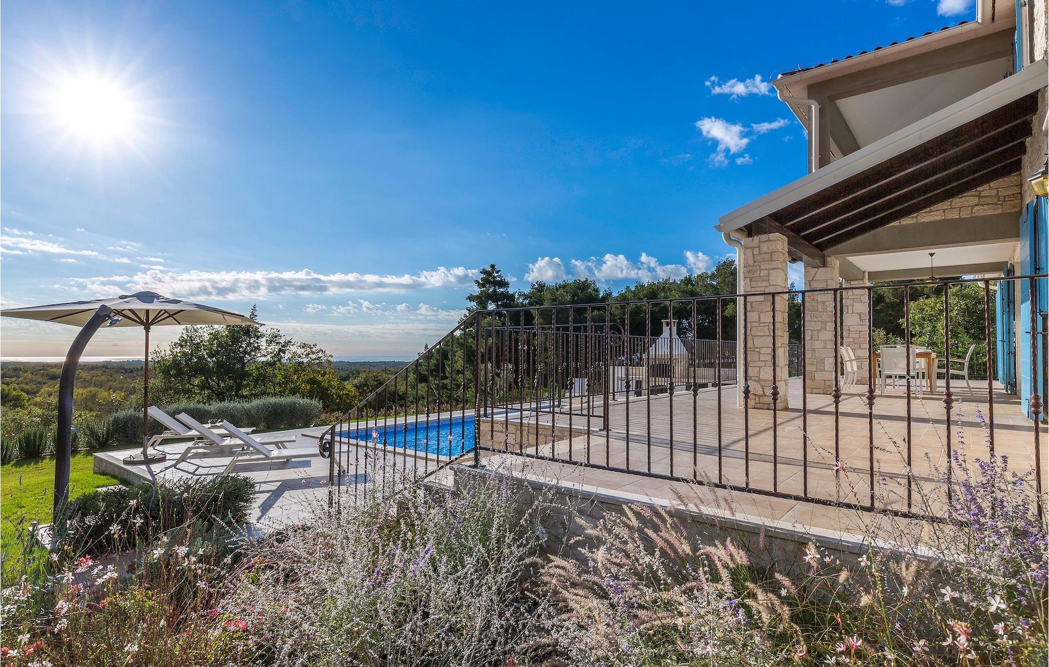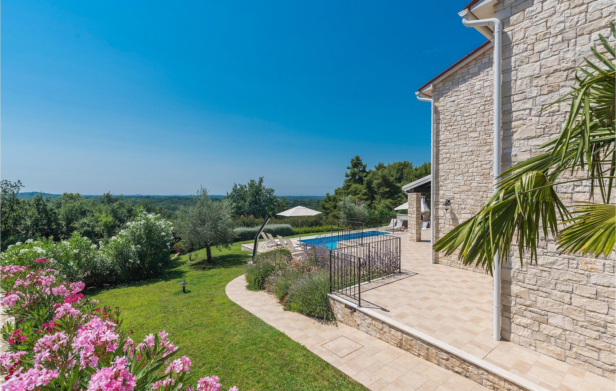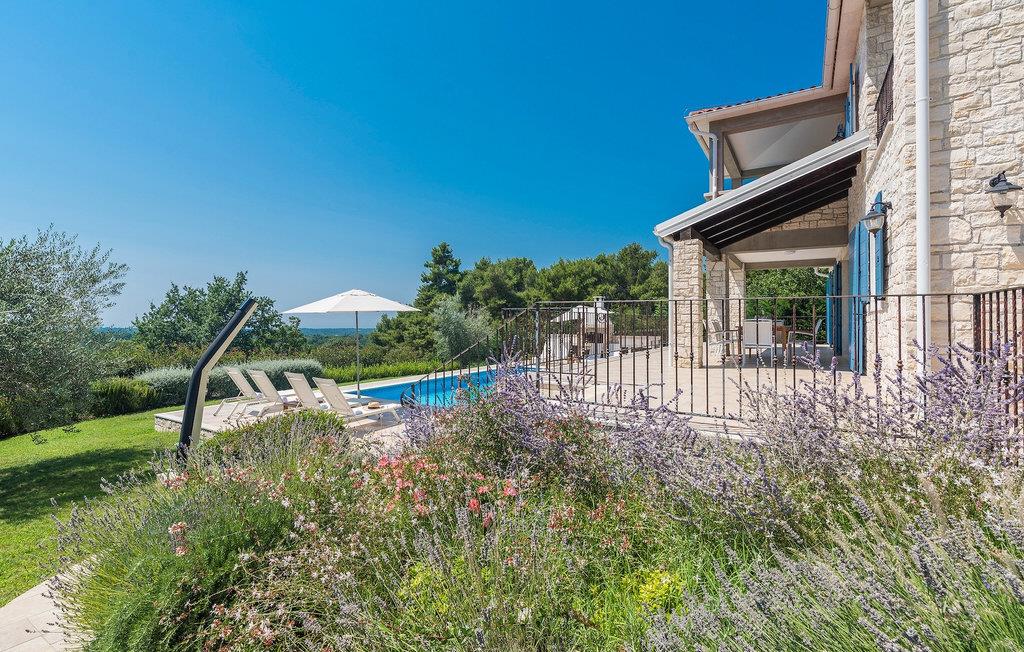 Villa Sterpazzi er en traditionel istrisk villa med en stenfacade og blå skodder. Denne smukke villa er omgivet af grønt og blomster, hvilket du vil bemærke af duften af lavendel, der breder sig gennem ejendommen.