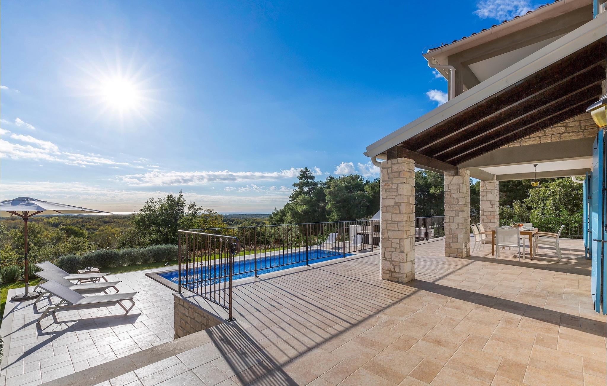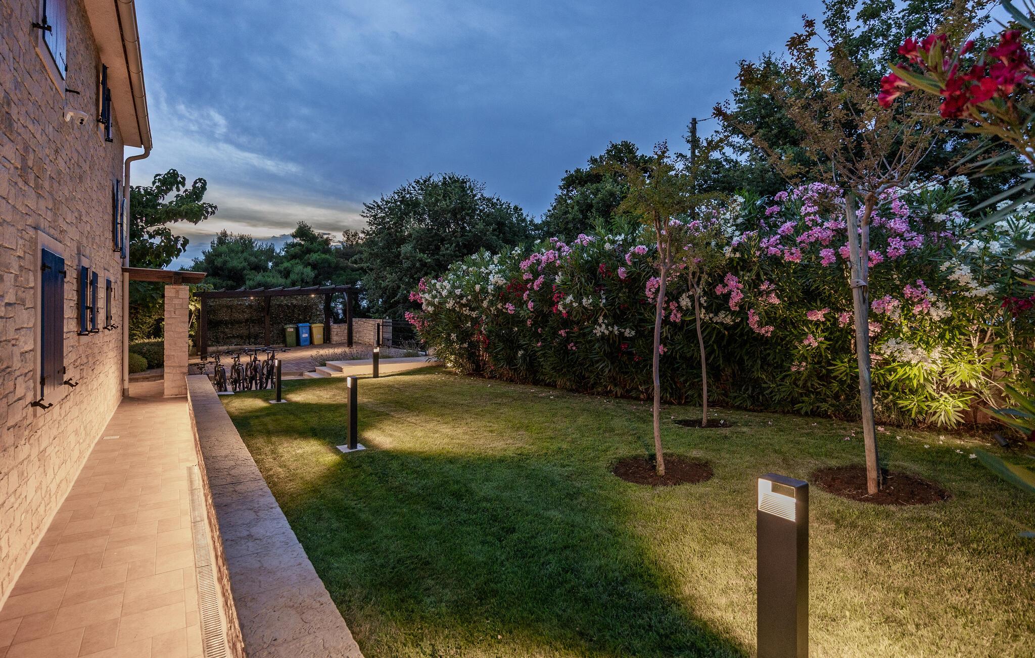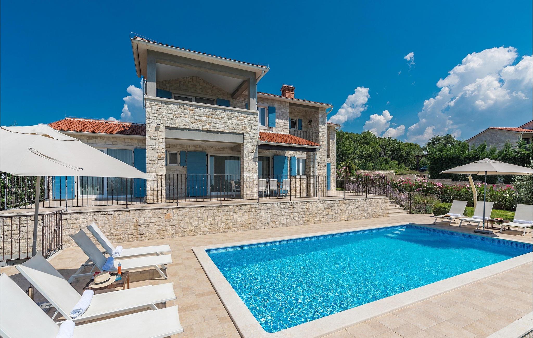 Villa Sterpazzi er en traditionel istrisk villa med en stenfacade og blå skodder. Denne smukke villa er omgivet af grønt og blomster, hvilket du vil bemærke af duften af lavendel, der breder sig gennem ejendommen.