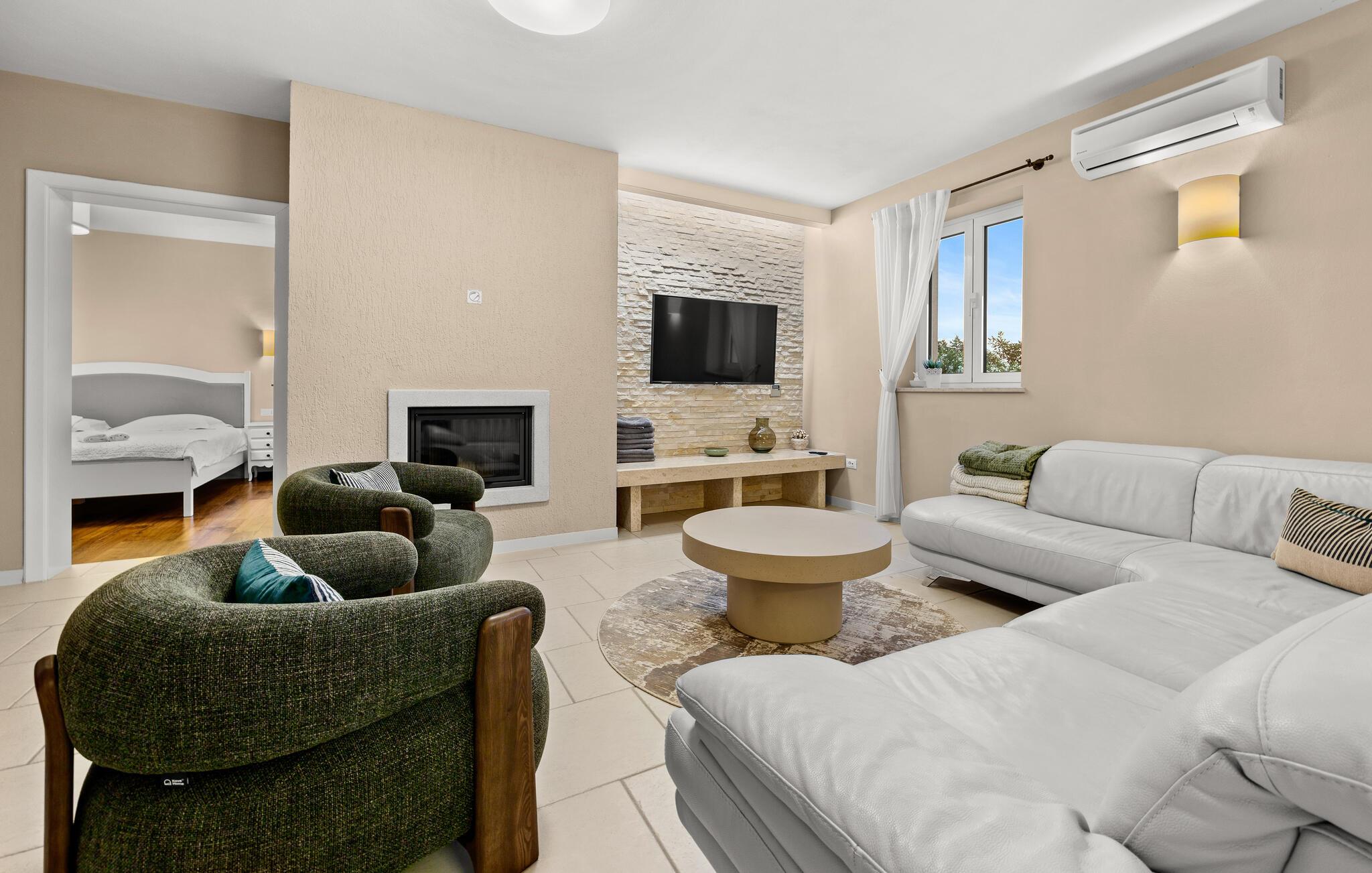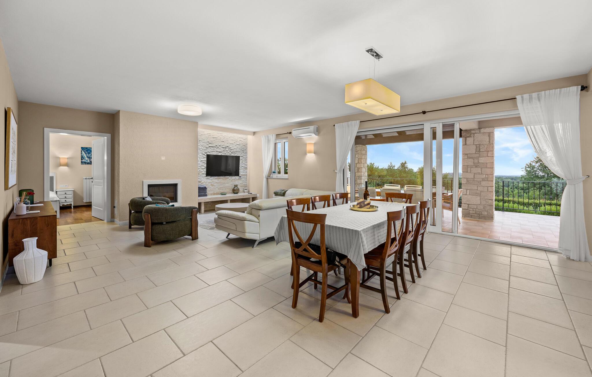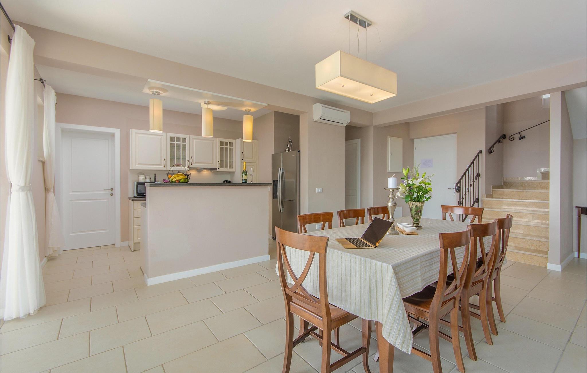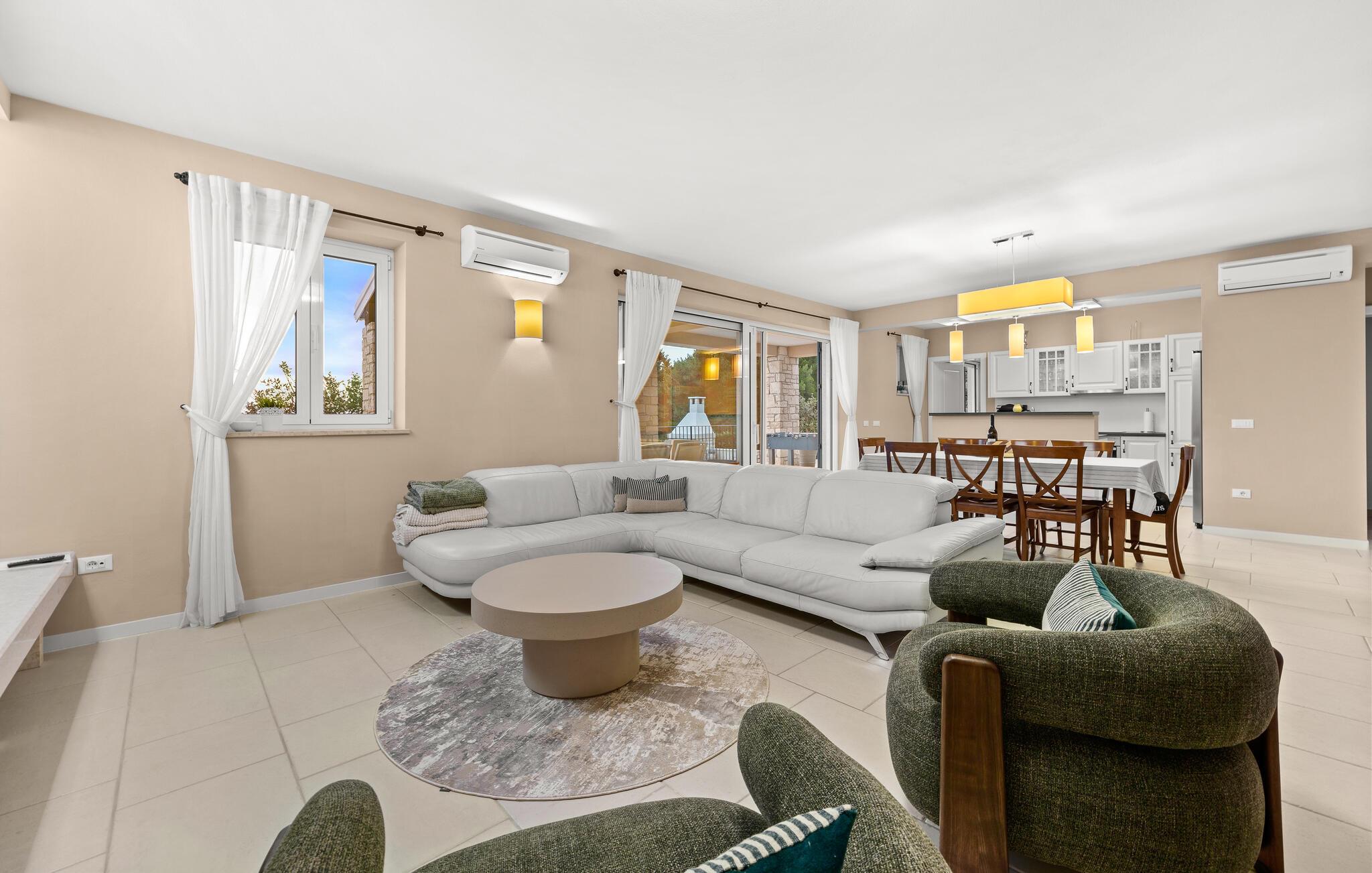 Tag en pause fra din travle hverdag i denne charmerende, rustikke villa til 8 gæster med udsigt til bakkerne og havet. Start din velfortjente ferie ved at hoppe i den private pool eller læse en bog på liggestolene under paraplyen. Den rummelige overdækkede terrasse er det perfekte sted at nyde måltider tilberedt på den udendørs grill eller i det fuldt udstyrede køkken. I stueplan danner køkken, spisestue og stue ét rummeligt værelse med åben planløsning, som er direkte forbundet med terrassen gennem glasdøre. En interessant tilføjelse til stuen er pejsen, som vil skabe en særlig atmosfære, uanset om det er i vinter- eller sommermånederne. Denne stenvilla er på trods af sit rustikke ydre udstyret med alle de bekvemmeligheder, der er nødvendige for det moderne liv - den har aircondition og har gulvvarme i hele huset. For yderligere komfort, især for familier med børn, er der også et rummeligt soveværelse med eget badeværelse og et ekstra separat toilet i stueetagen.