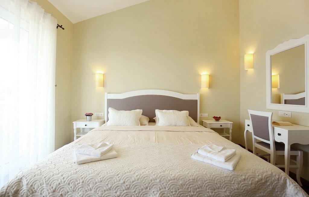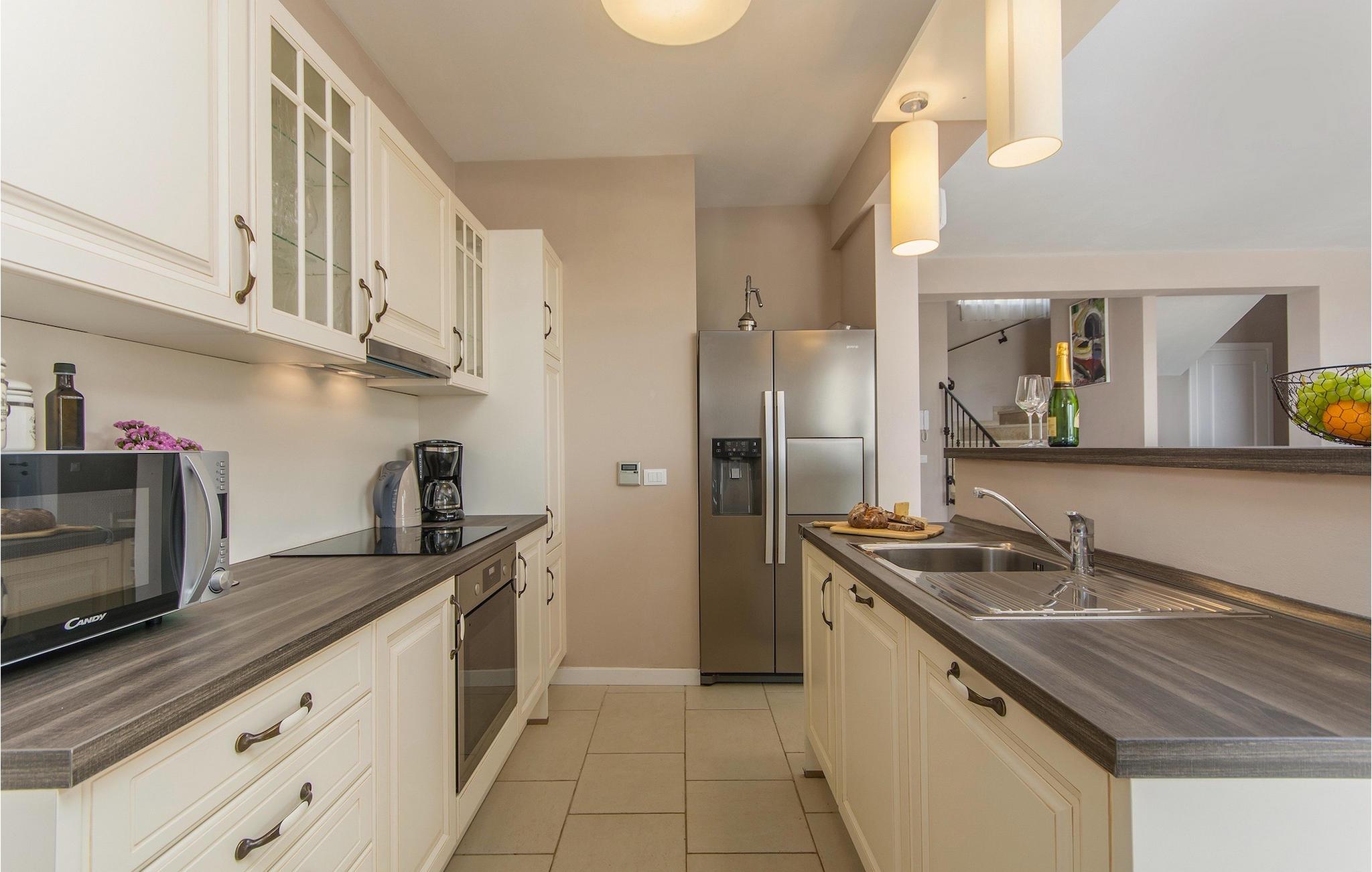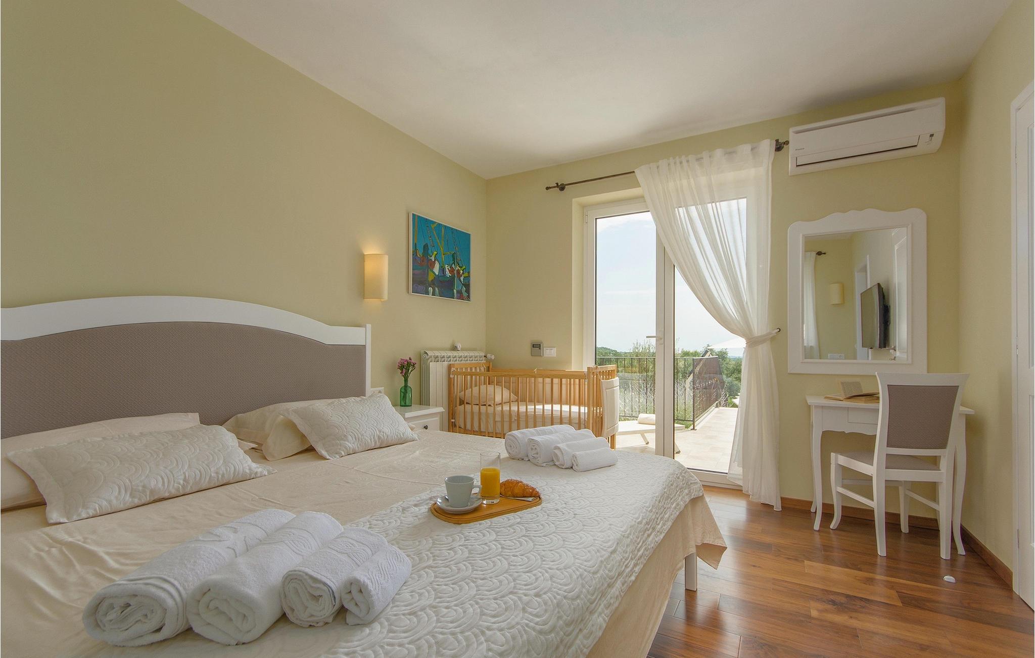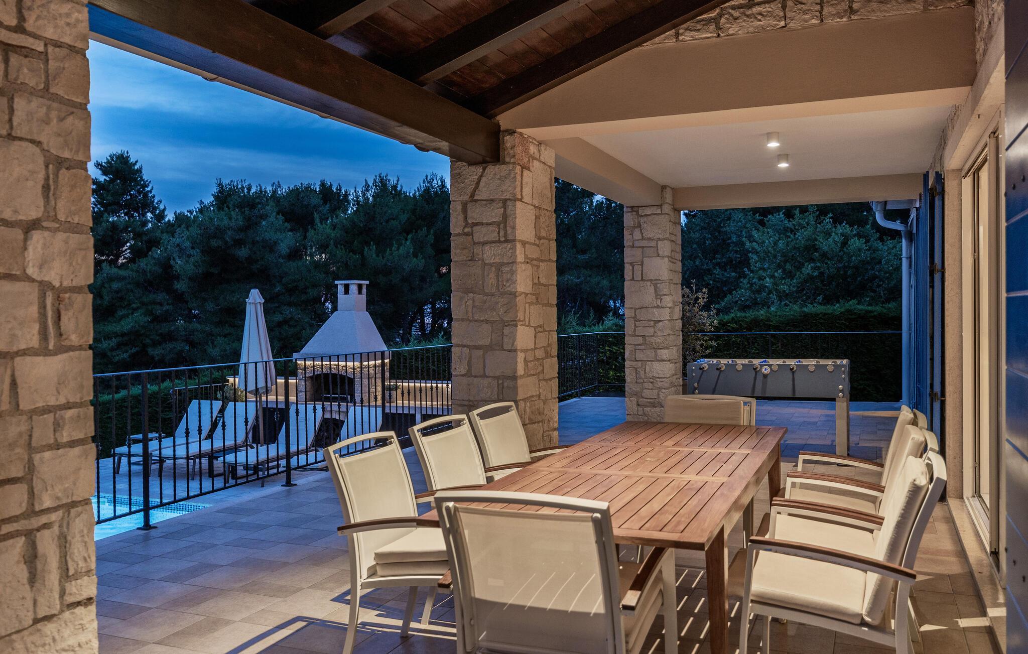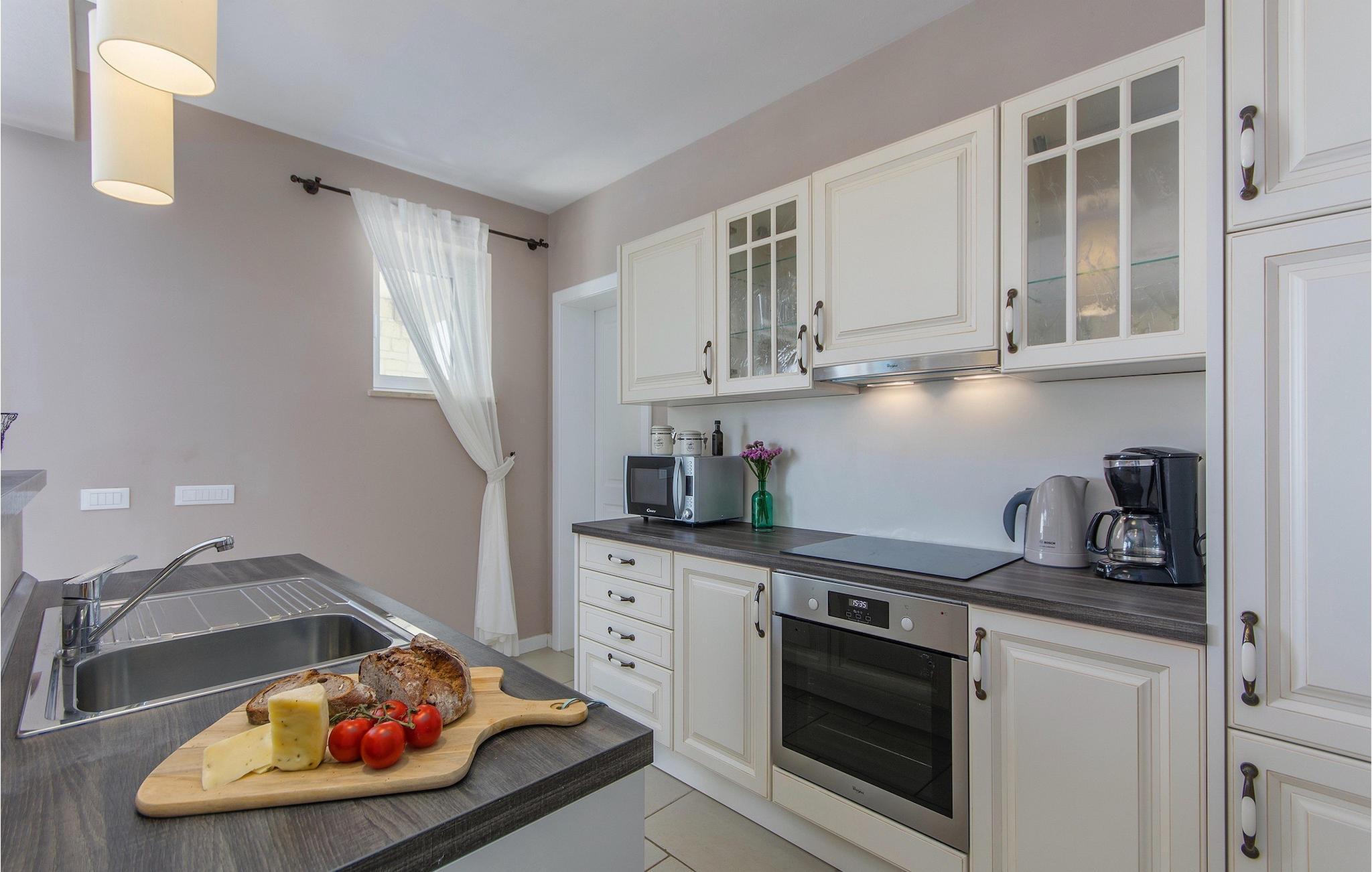 Tag en pause fra din travle hverdag i denne charmerende, rustikke villa til 8 gæster med udsigt til bakkerne og havet. Start din velfortjente ferie ved at hoppe i den private pool eller læse en bog på liggestolene under paraplyen. Den rummelige overdækkede terrasse er det perfekte sted at nyde måltider tilberedt på den udendørs grill eller i det fuldt udstyrede køkken. I stueplan danner køkken, spisestue og stue ét rummeligt værelse med åben planløsning, som er direkte forbundet med terrassen gennem glasdøre. En interessant tilføjelse til stuen er pejsen, som vil skabe en særlig atmosfære, uanset om det er i vinter- eller sommermånederne. Denne stenvilla er på trods af sit rustikke ydre udstyret med alle de bekvemmeligheder, der er nødvendige for det moderne liv - den har aircondition og har gulvvarme i hele huset. For yderligere komfort, især for familier med børn, er der også et rummeligt soveværelse med eget badeværelse og et ekstra separat toilet i stueetagen.