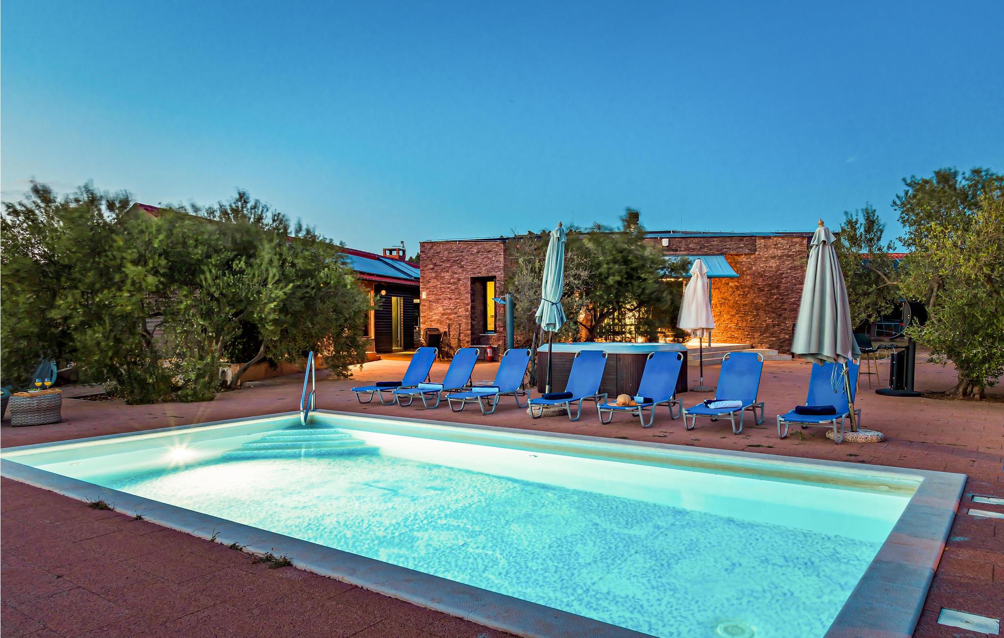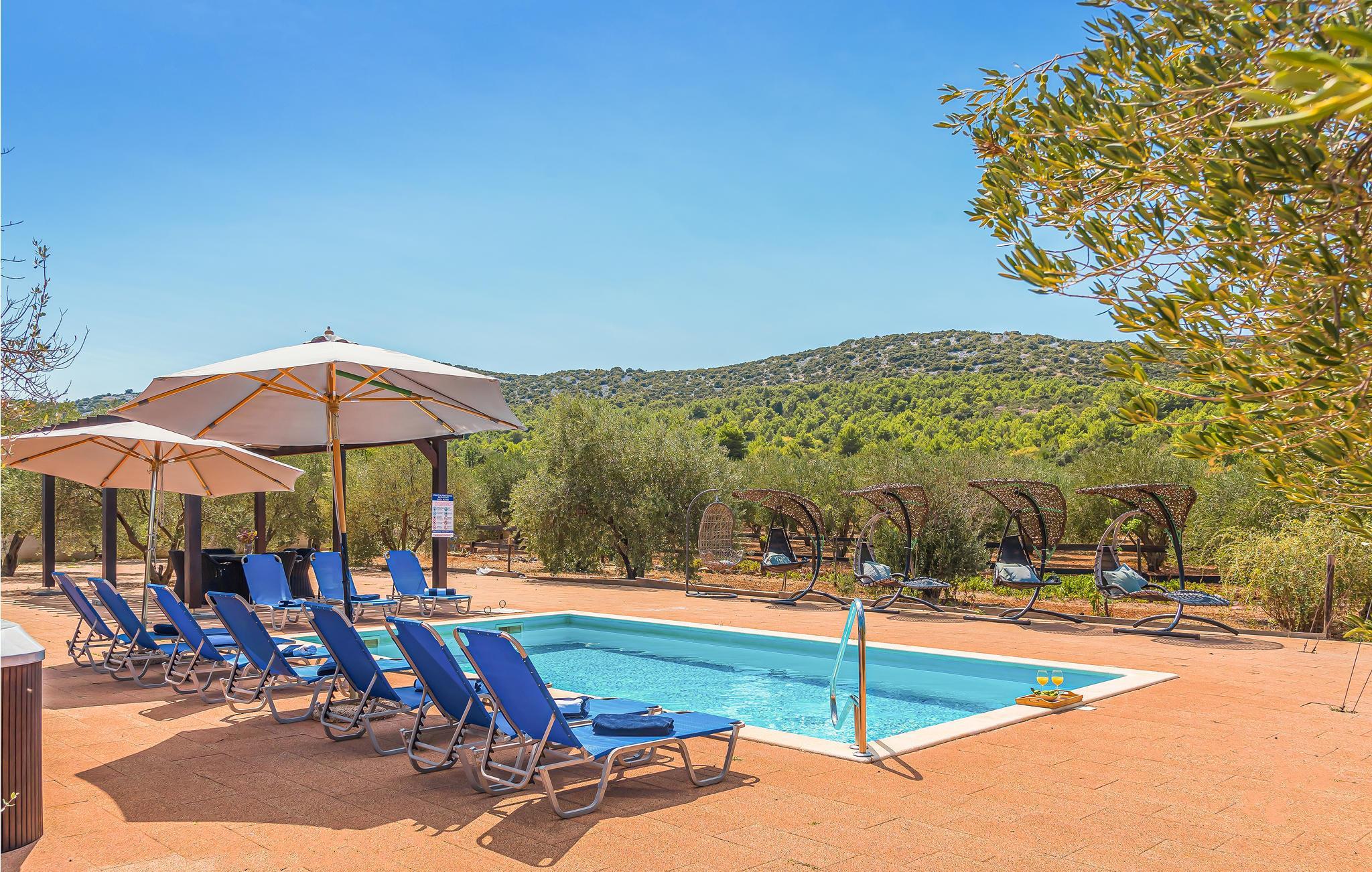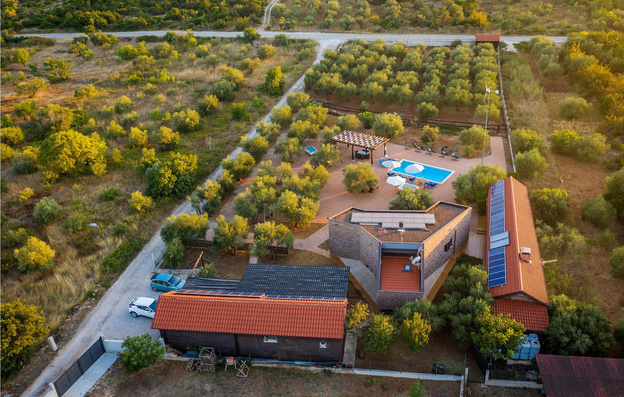 Den lille by Ivinj ligger mellem Tribunj og Tisno og ved siden af øen Murter. Feriehuset ligger uden bebyggelse omkring, så her får I fred og ro. I en diameter på ca. 2 km er der attraktive, ensomme naturstrande, som I kan komme til på cykler, motorcykler, elektriske køretøjer, heste og endda til fods. Den selvstændige ejendom giver jer ideelle forudsætninger for at ride på heste i naturen, der ser ud til at strække sig ud i uendeligheden. Foran grunden, der er på ca. 20.000 m², er der en hippodrom med hestevæddeløb og rideskole, hvor I kan tage ridetimer på racerene araberheste. Oplev også eventyr på motocross- og cykelstier. Selvfølgelig udnyttes de naturlige forekomster på en sådan ejendom, fx drikkevandet, der kommer fra en ca. 80 m dyb brønd. Med dette vand fyldes også poolen og whirlpoolen. Strømmen udvindes fra solvarmeanlæg og en vindmølle. Den nævnte ejendom består af to separate huse, der ligger ved siden af hinanden og udlejes samlet. Derfor er de ideelle til flere familier eller en gruppe af venner, der vil holde ferie sammen. Det ene hus strækker sig over to etager, under- og overetagen, og har en tiltalende indretning. Etagerne er forbundet med hinanden ved hjælp af udendørs trapper. Det andet hus består af en etage, hvor I har to soveværelser, to badeværelser, et rum med rideudstyr, en åben dagligstue og et udekøkken med stor kamin. Ejerne stiller deres eget fiskeudstyr til rådighed for lystfiskere med fisketegn. Hvis fisketuren var kronet med held, er husejerne parate til at vise jer deres traditionelle måde at tilberede fisk på. Bagefter kan I nyde de herlige retter på terrassen, måske med et glas lokal vin til.