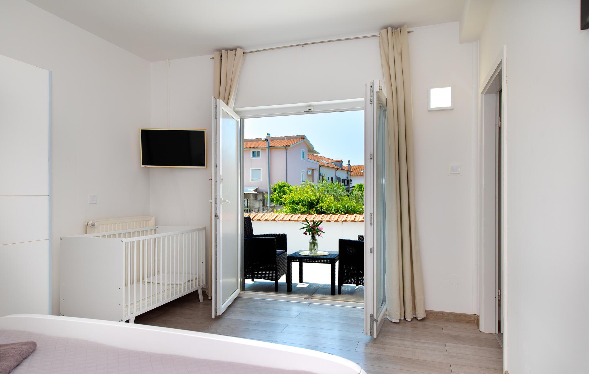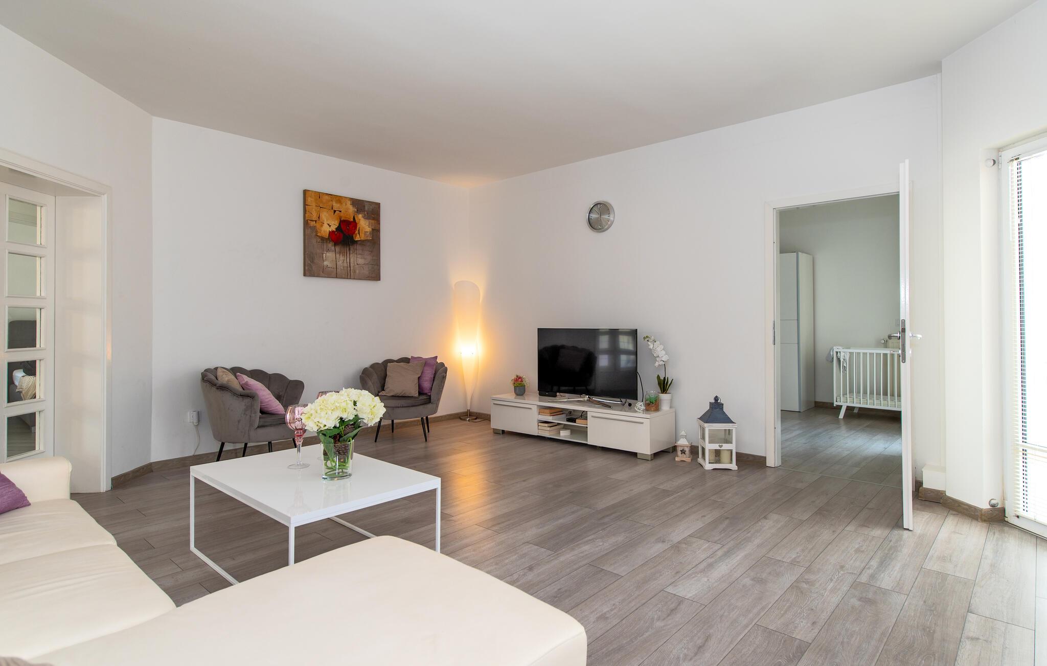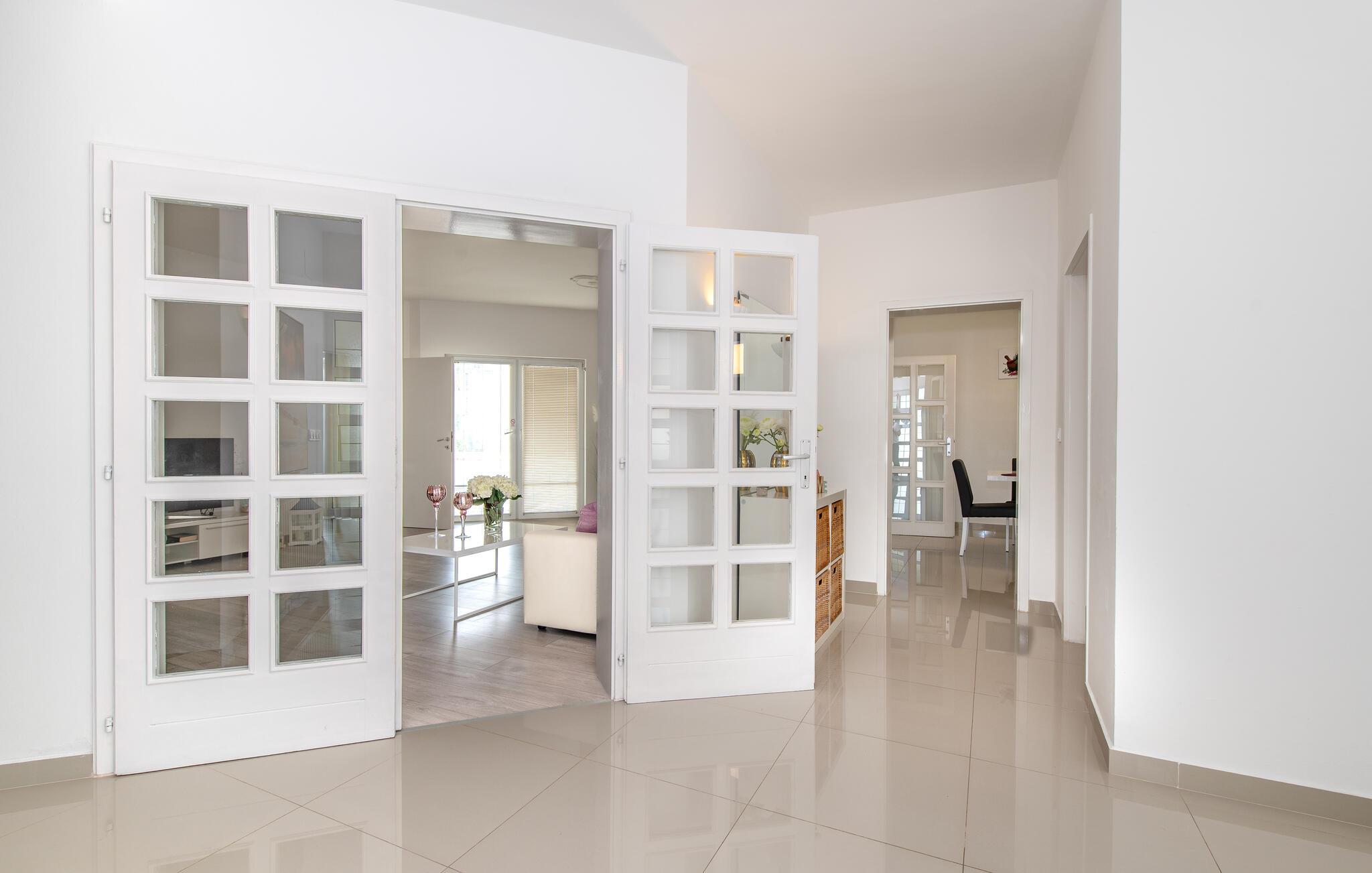 Denne rummelige ferielejlighed er smagfuldt indrettet og giver jer en luksuøs atmosfære og al komfort. Lejligheden er den eneste boligenhed i huset, der udlejes, og har en separat indgang. Den enkelt og smukt anlagte have er udstyret med liggestole, disse indbyder til afslapning. På grillen kan I lave lækre specialiteter. Ferielejligheden ligger i et roligt kvarter i Vodice, men også i nærheden af de skønne strande med muligheder for underholdning, caféer og restauranter. Udnyt også chancen til at besøge nationalparkerne Krka og Kornati samt den smukke by Sibenik. Nyd romantiske aftenspadsereture i den maleriske gamle bydel og lyt til de mange former for livemusik, der gør ferien helt speciel.