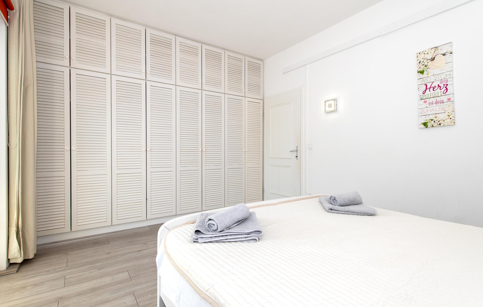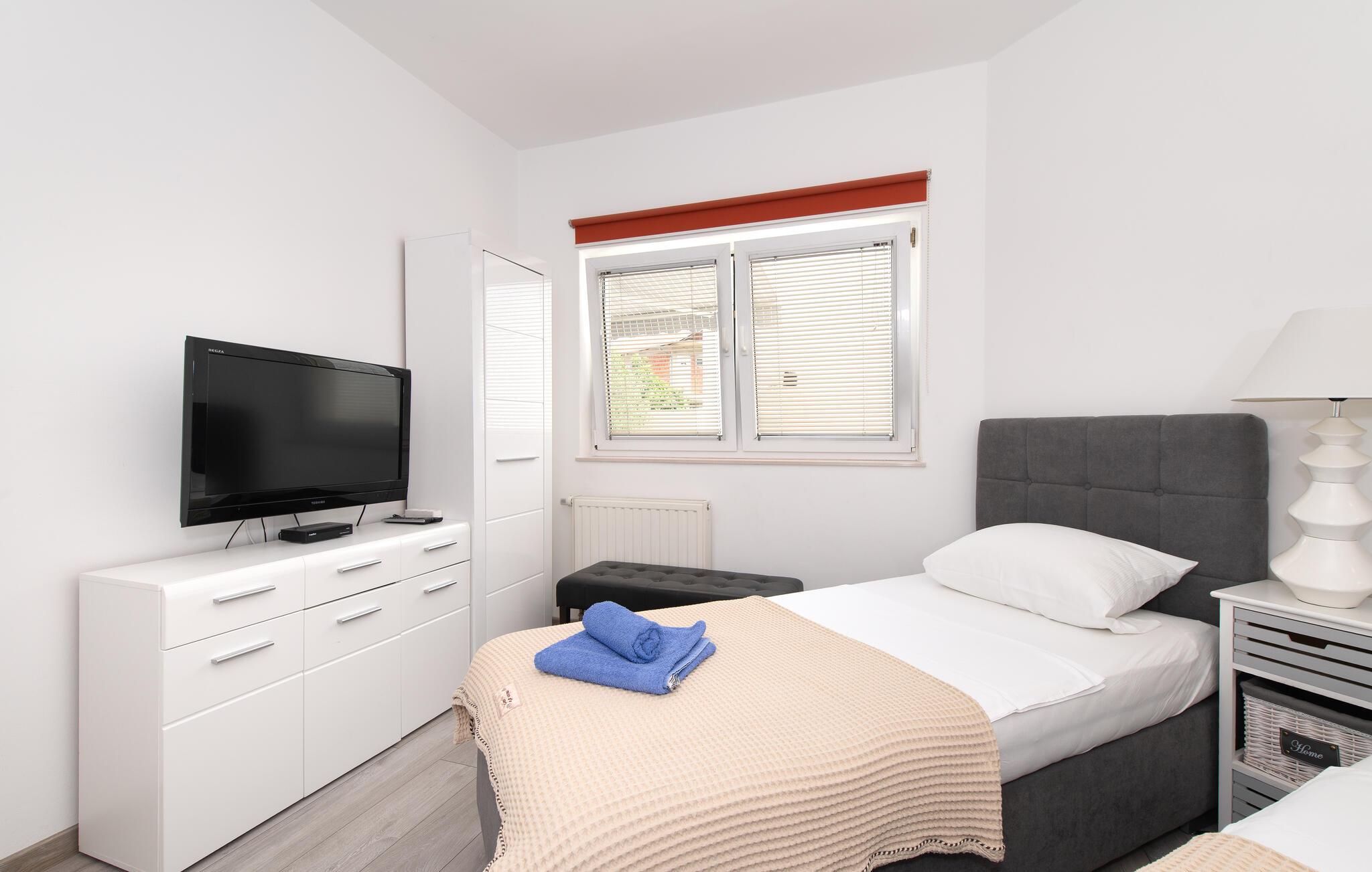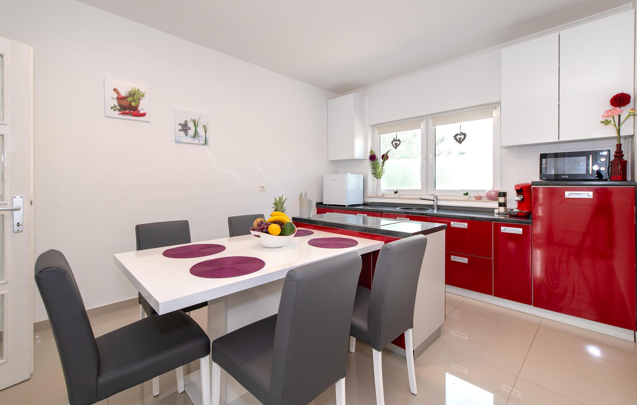 Denne rummelige ferielejlighed er smagfuldt indrettet og giver jer en luksuøs atmosfære og al komfort. Lejligheden er den eneste boligenhed i huset, der udlejes, og har en separat indgang. Den enkelt og smukt anlagte have er udstyret med liggestole, disse indbyder til afslapning. På grillen kan I lave lækre specialiteter. Ferielejligheden ligger i et roligt kvarter i Vodice, men også i nærheden af de skønne strande med muligheder for underholdning, caféer og restauranter. Udnyt også chancen til at besøge nationalparkerne Krka og Kornati samt den smukke by Sibenik. Nyd romantiske aftenspadsereture i den maleriske gamle bydel og lyt til de mange former for livemusik, der gør ferien helt speciel.