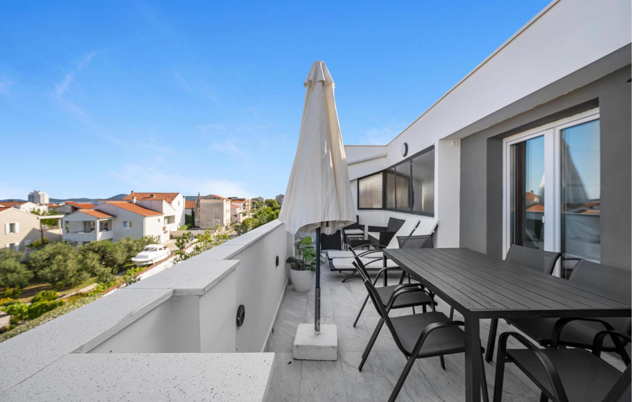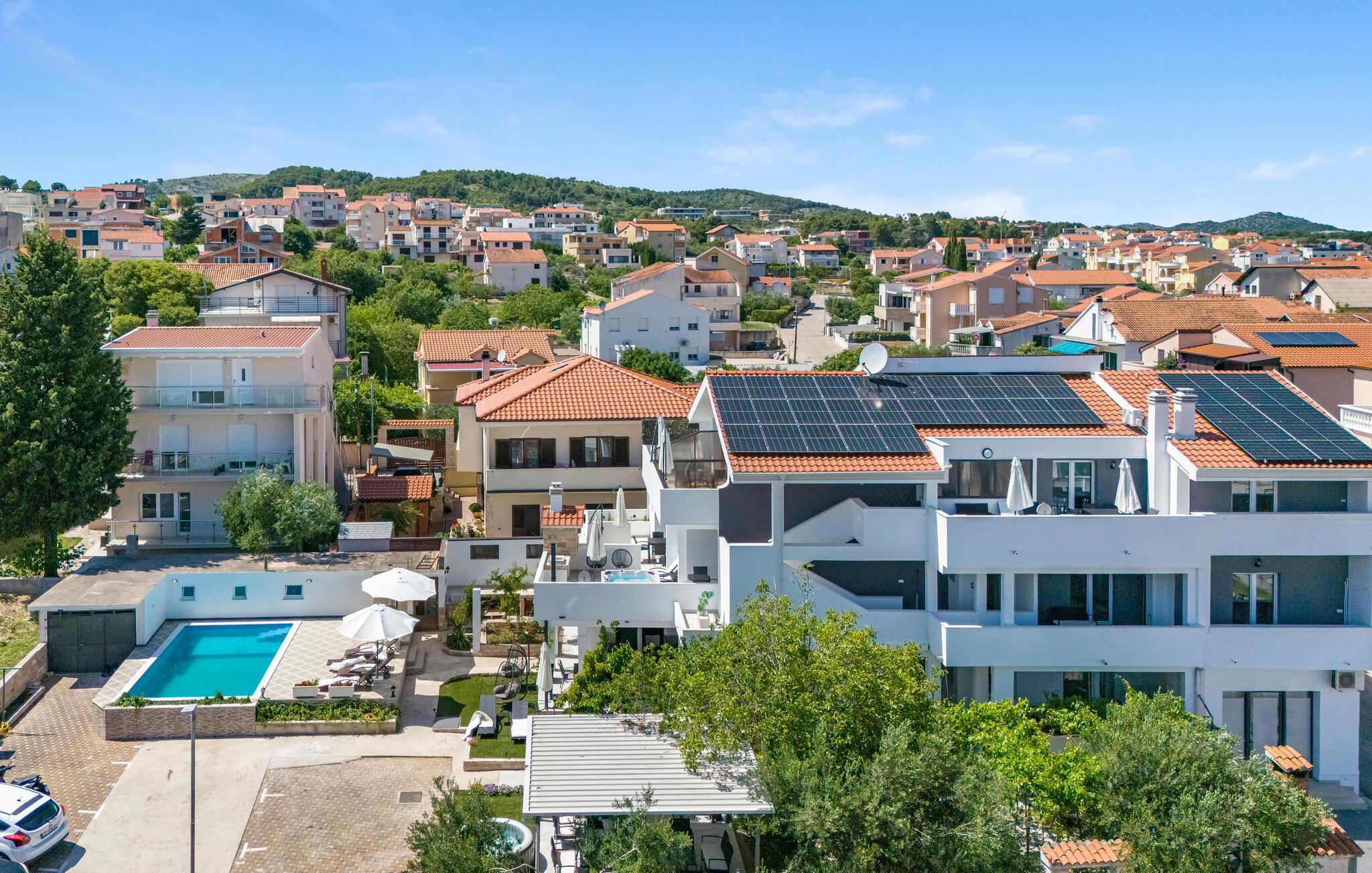 Den livlige kystby Vodice er kendt for sine smukke strande og det klare vand. Lejligheden ligger kun få minutters gang fra Plave-pladsen og stranden Hangar. Byens centrum indbyder til en gåtur med caféer, restauranter og små butikker, og den nærliggende marina er perfekt til en spadseretur langs vandet. Udflugter til Nationalpark Krka eller Kornati-øerne byder på uforglemmelige naturoplevelser og er let tilgængelige herfra.