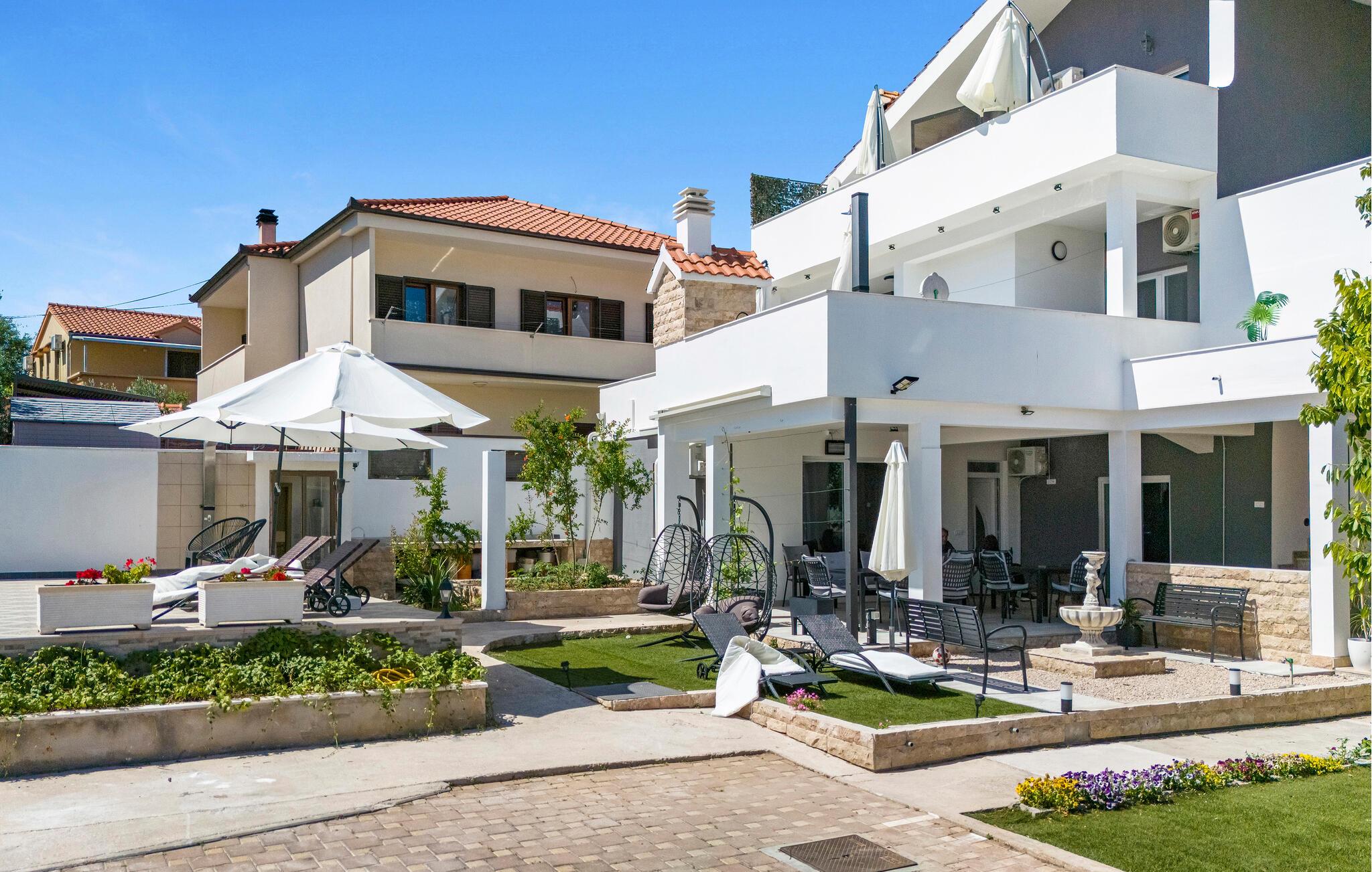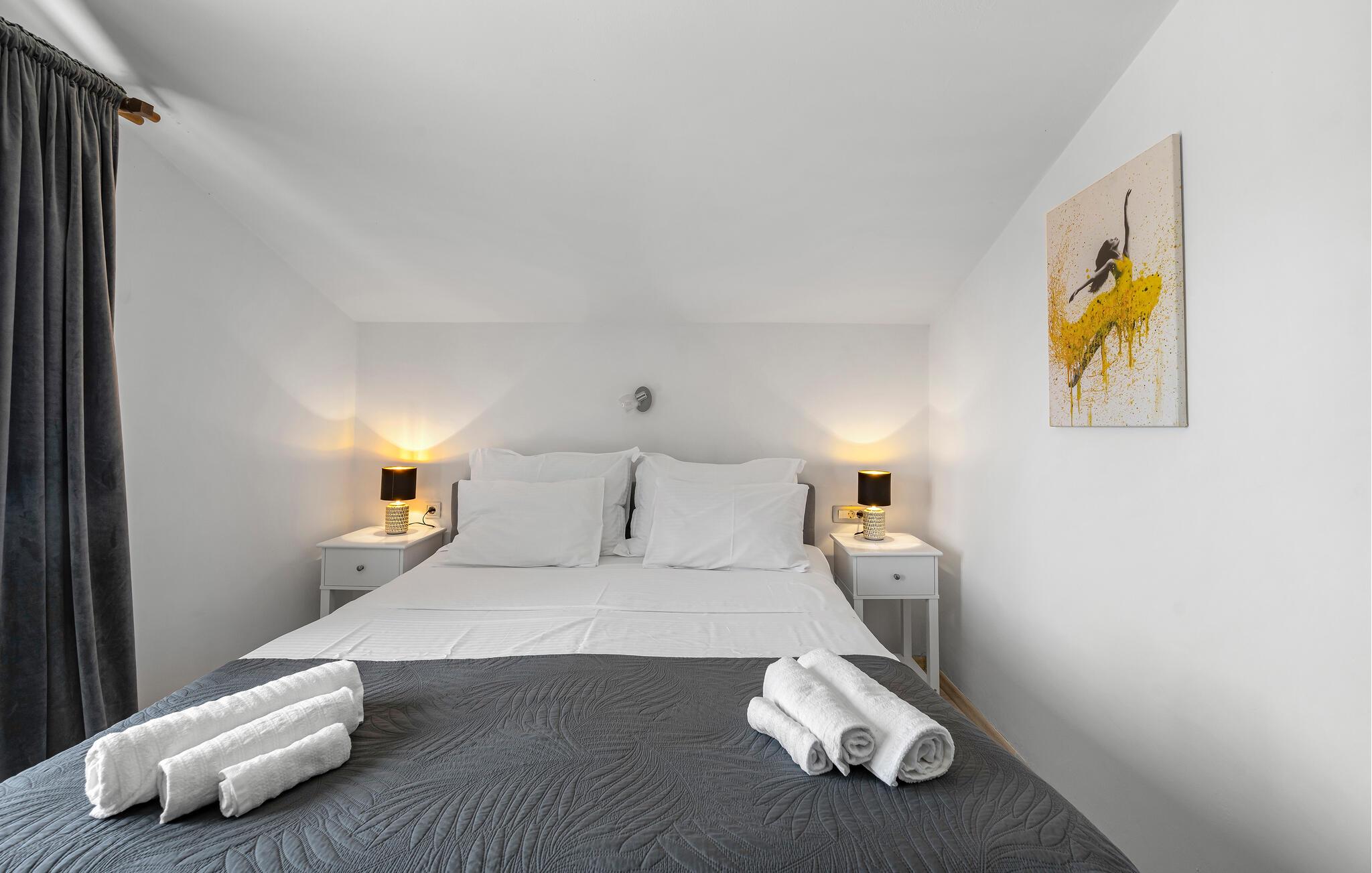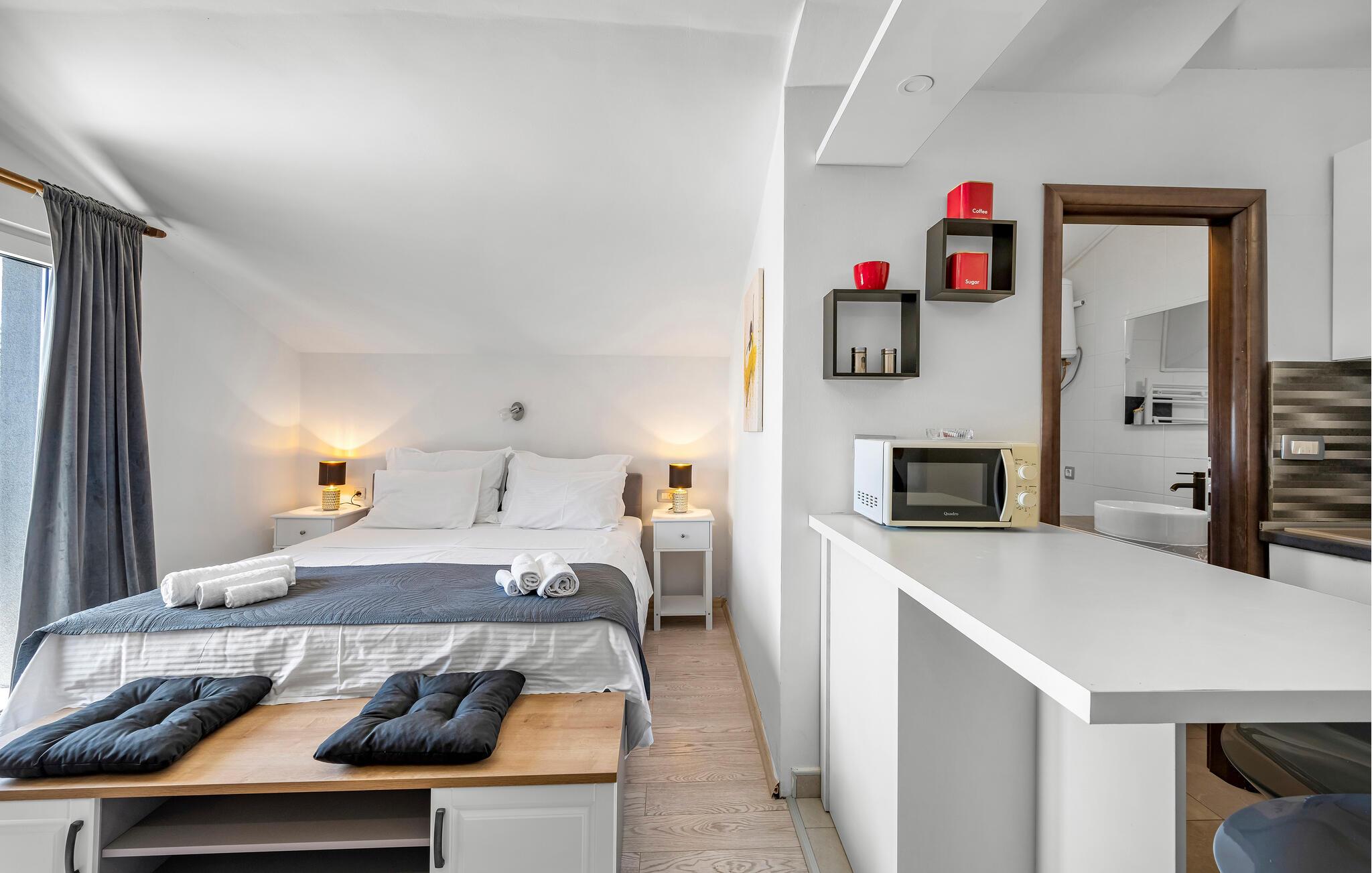 Den livlige kystby Vodice er kendt for sine smukke strande og det klare vand. Lejligheden ligger kun få minutters gang fra Plave-pladsen og stranden Hangar. Byens centrum indbyder til en gåtur med caféer, restauranter og små butikker, og den nærliggende marina er perfekt til en spadseretur langs vandet. Udflugter til Nationalpark Krka eller Kornati-øerne byder på uforglemmelige naturoplevelser og er let tilgængelige herfra.
