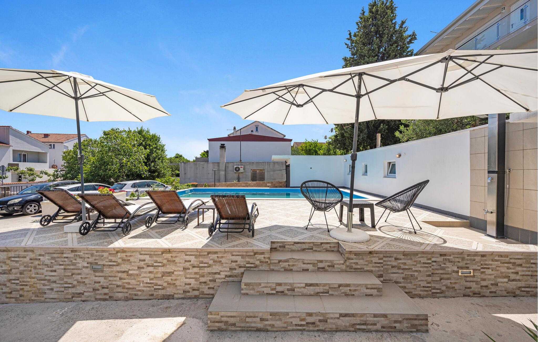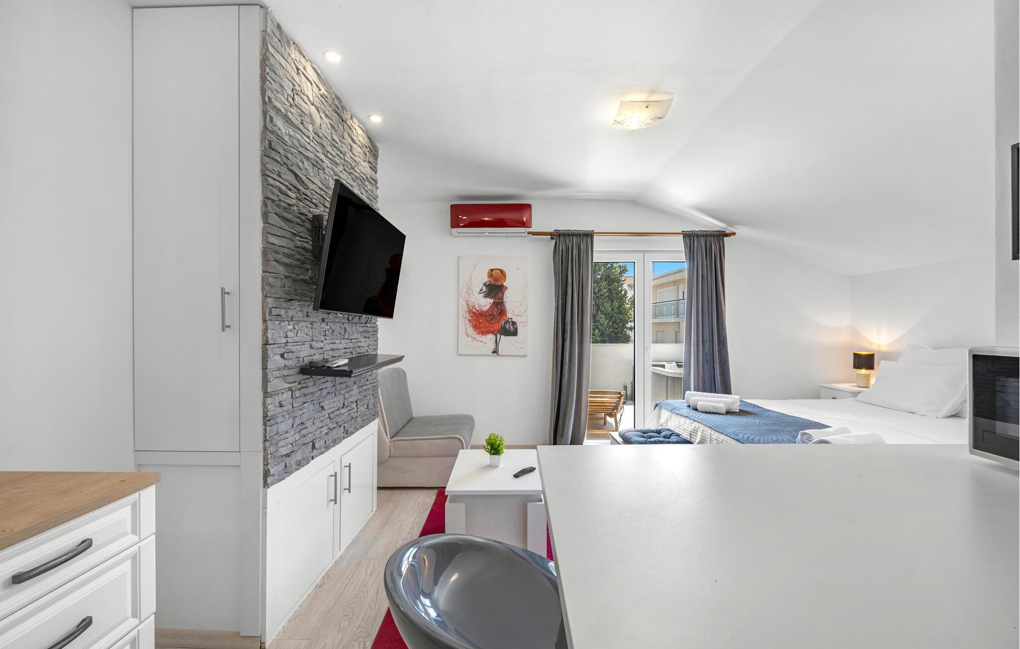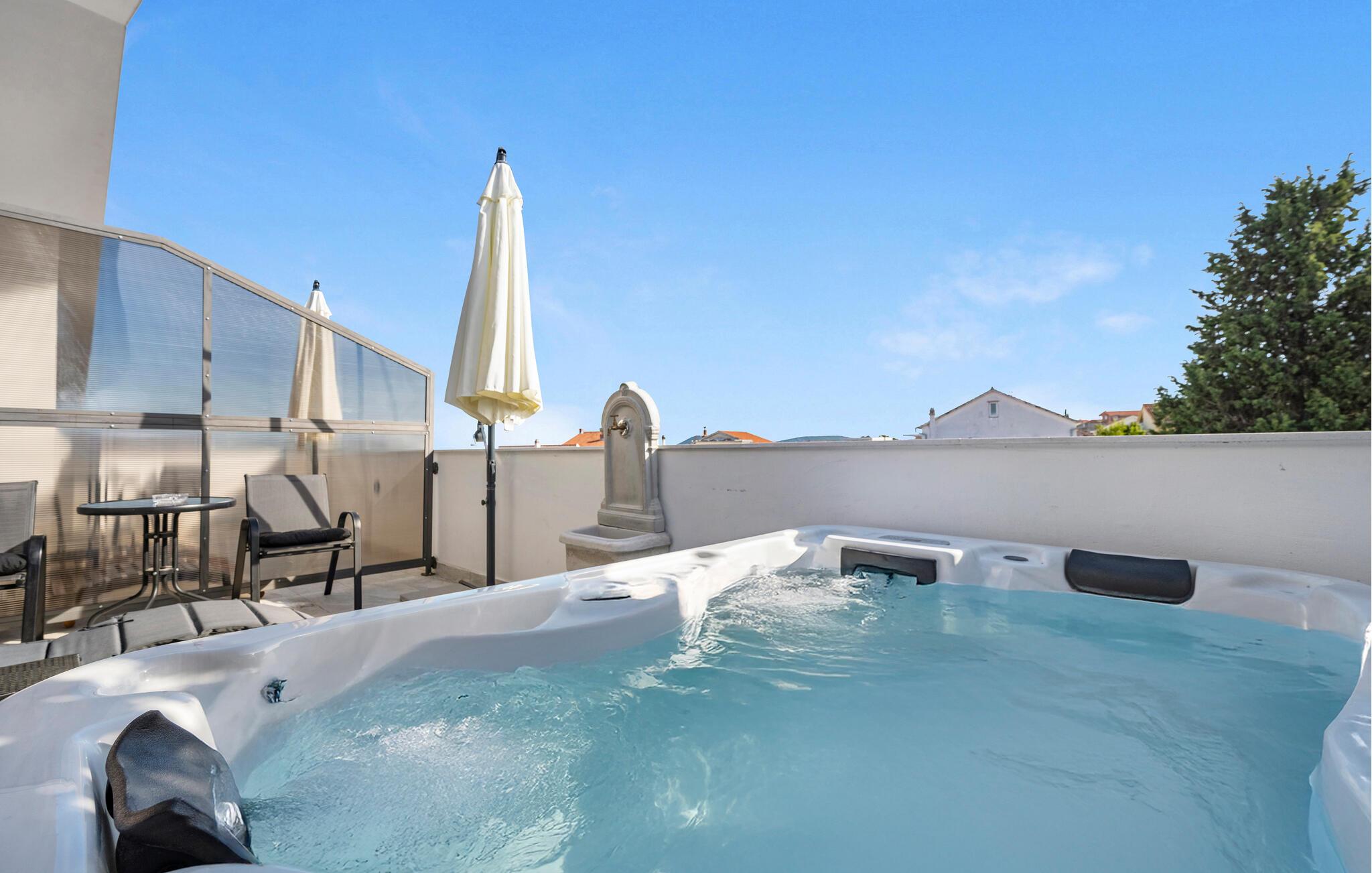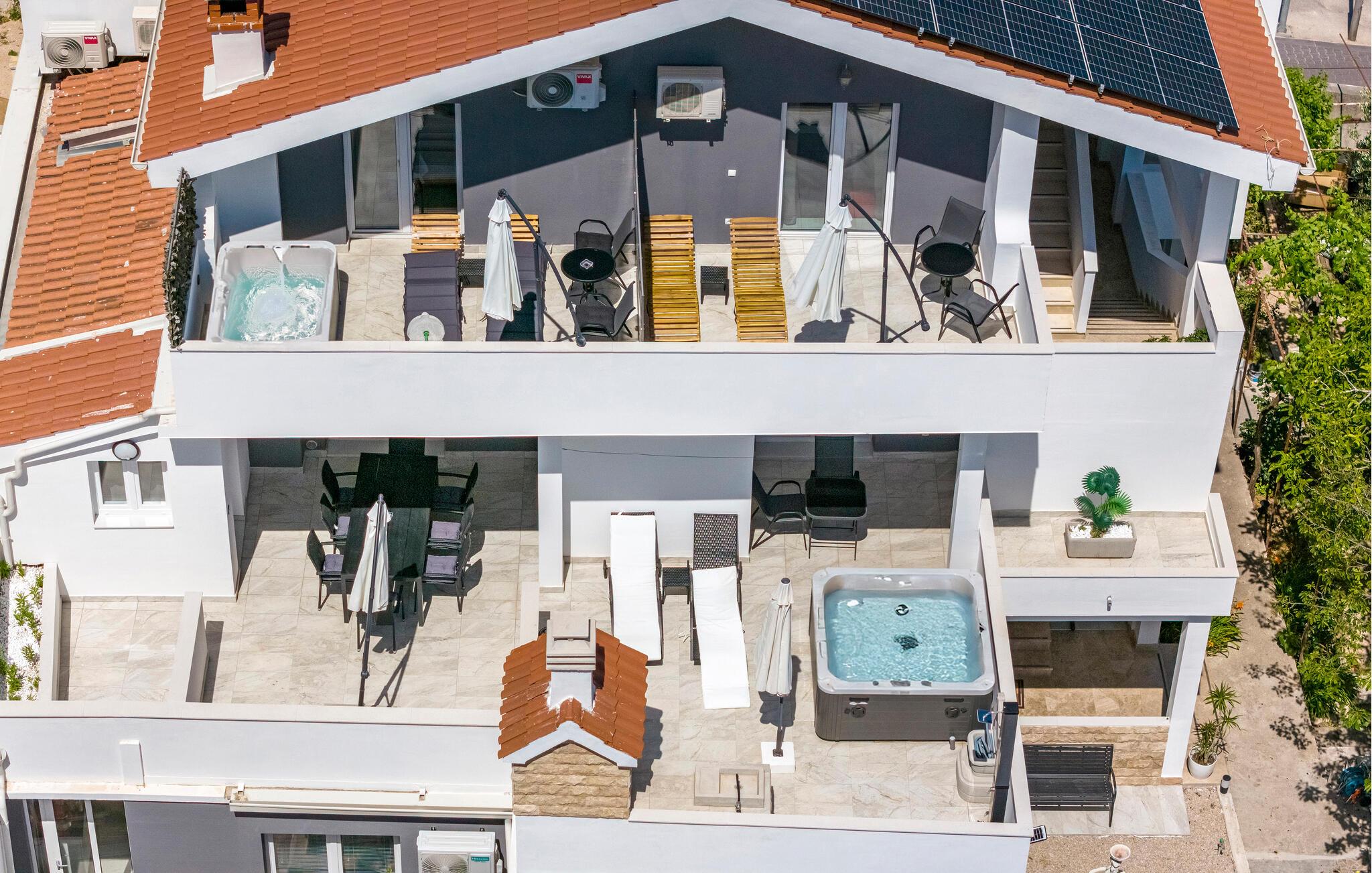 Den livlige kystby Vodice er kendt for sine smukke strande og det klare vand. Lejligheden ligger kun få minutters gang fra Plave-pladsen og stranden Hangar. Byens centrum indbyder til en gåtur med caféer, restauranter og små butikker, og den nærliggende marina er perfekt til en spadseretur langs vandet. Udflugter til Nationalpark Krka eller Kornati-øerne byder på uforglemmelige naturoplevelser og er let tilgængelige herfra.