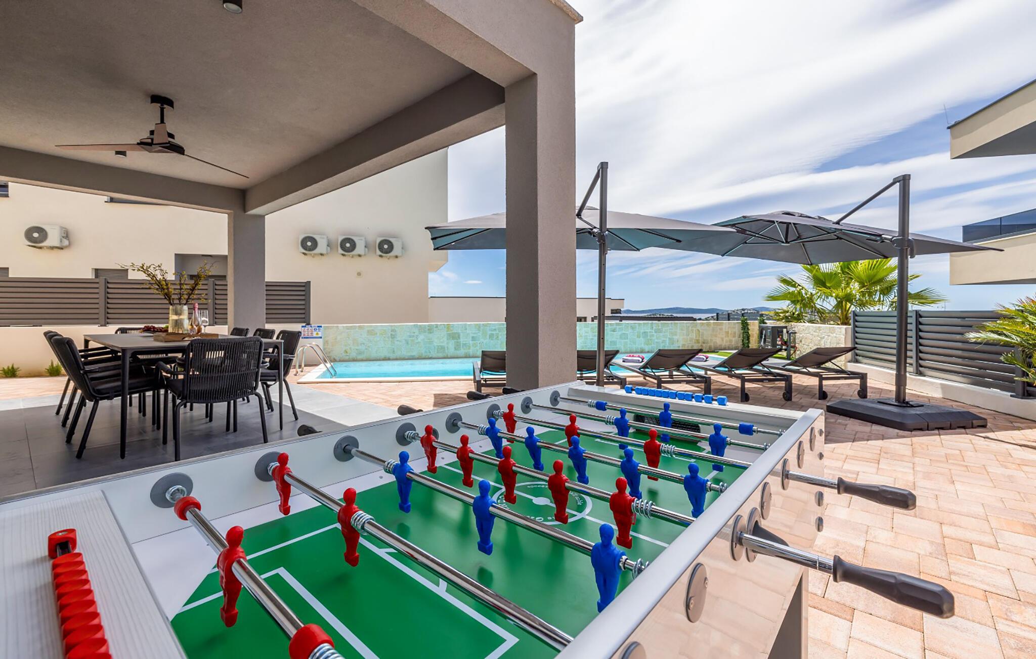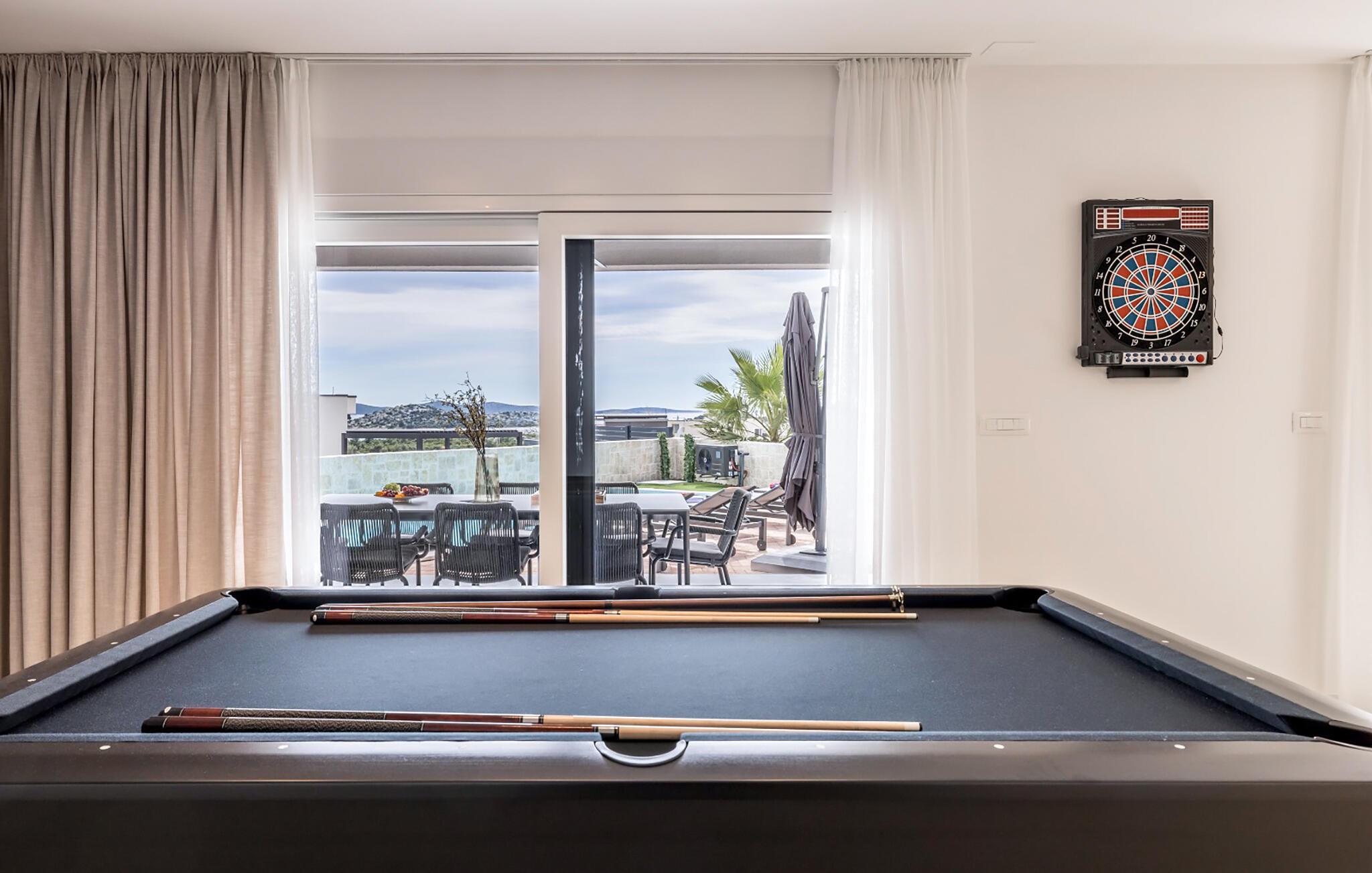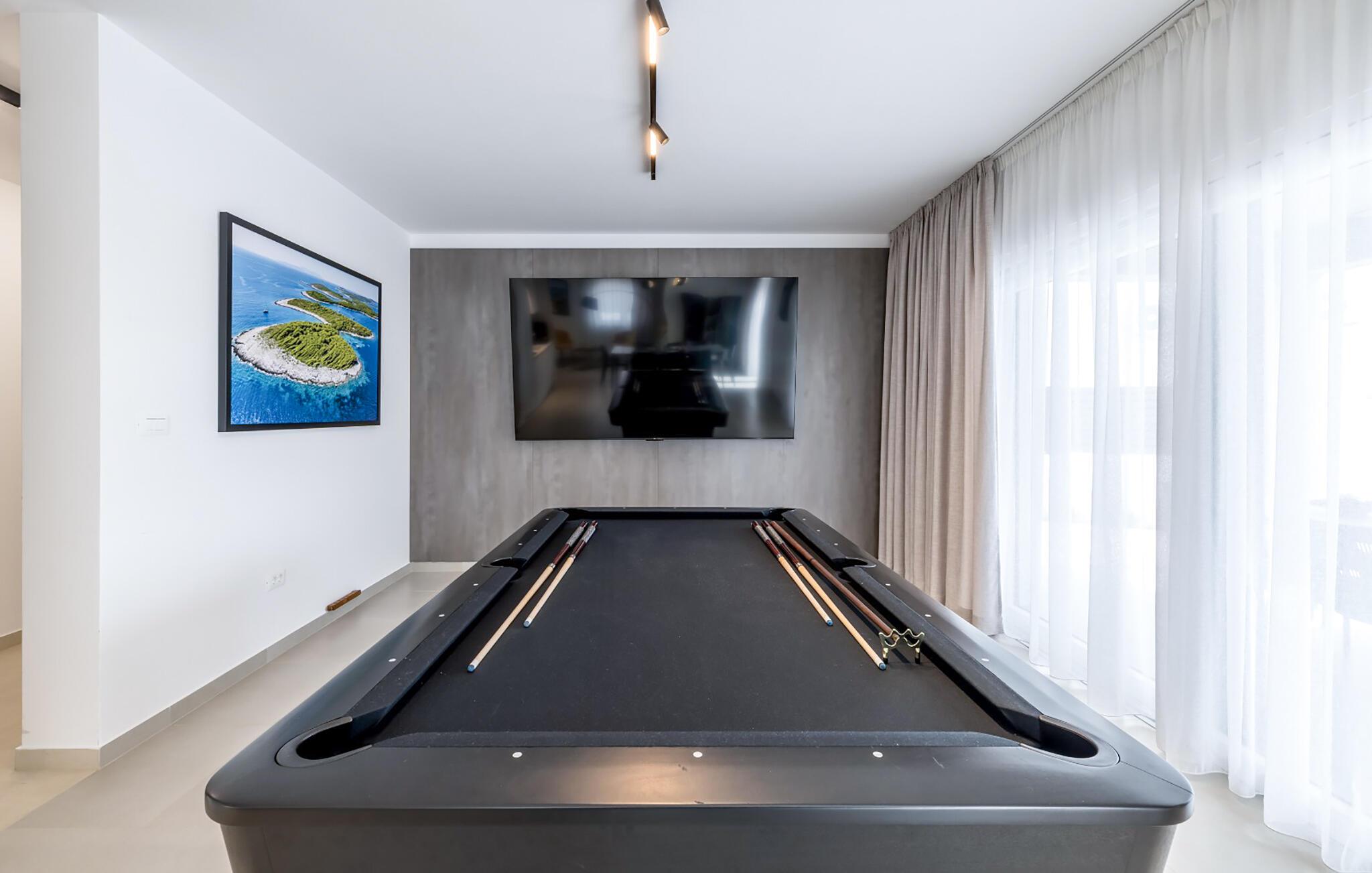 Slap af i dette luksuriøse feriehus med pool, spabad og sauna. Dette moderne hjem kombinerer stilfuld elegance og komfort på en unik måde. Rummelige opholdsrum med gulv-til-loft-vinduer, stilfulde møbler og et moderne udstyret køkken skaber en afslappet atmosfære, hvor I hurtigt kan genoplade batterierne. Slap af i sofaen med en kop kaffe, lyt til jeres yndlingsmusik eller en interessant podcast. Hvis I leder efter noget motion, er der intet, der forhindrer jer i at spille billard, bordfodbold eller træne i fitnesscentret. Hop i poolen om morgenen og tag en afslappende svømmetur. Slap af på en liggestol med en kølig drink og nyd udsigten over havet og de fjerne kystlinjer. Slap af i spabadet om eftermiddagen, inden I nyder en grillfest med familie eller venner og en afslappende aften. Tilbring afslappende timer på Vodices strande, hvor klart vand, fine småsten og hyggelige strandbarer venter på jer. Gå en tur gennem Vodices livlige centrum med restauranter, butikker og smukke havnepromenade. Tag bådture til øerne uden for kysten, eller udforsk nærliggende nationalparker som Krka eller Kornati. De, der leder efter noget mere aktivt, kan nyde cykling, snorkling eller kajaksejlads langs kysten.