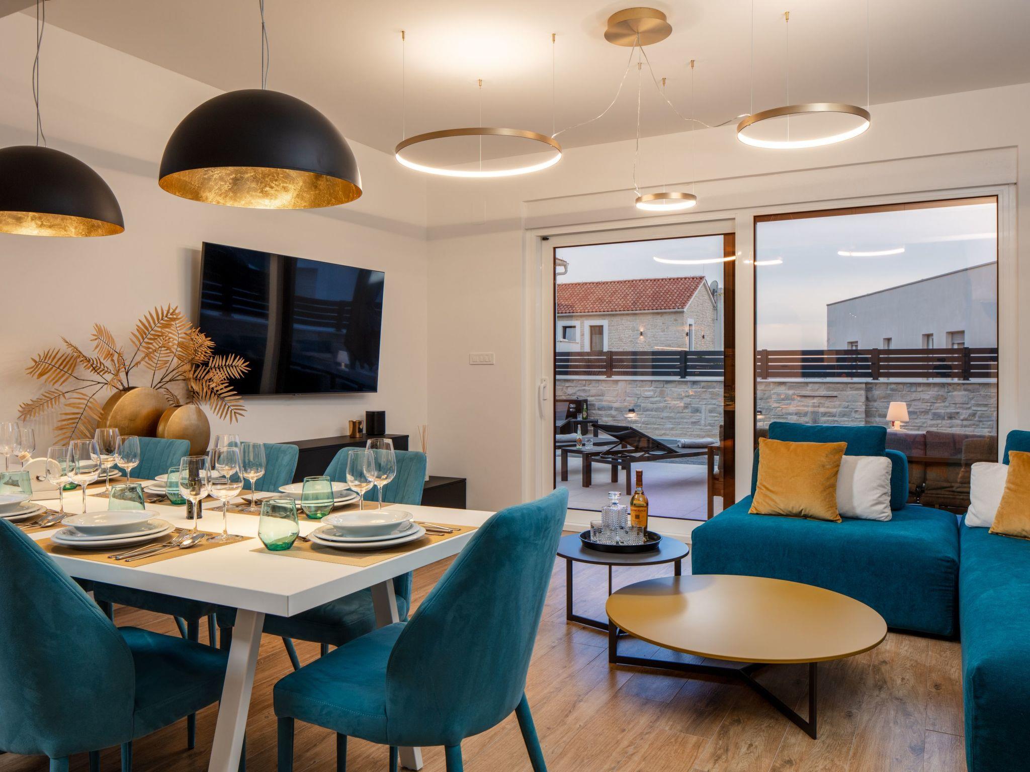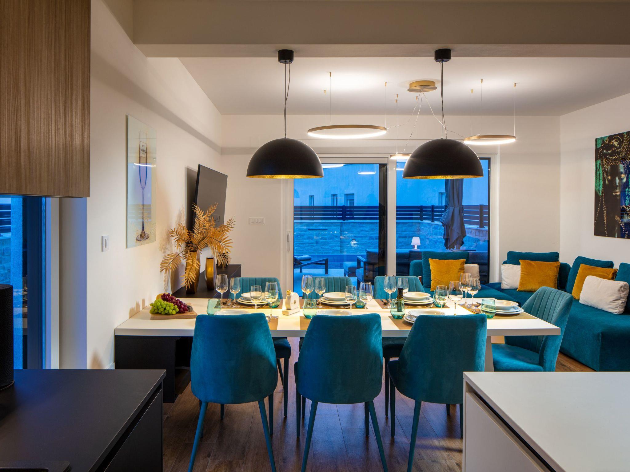 This gorgeous villa can accommodate up to 8 guests within 4 double bedrooms. On the ground floor, there is a living room with direct access to the outdoor terrace. The living room is connected with a dining area and a fully equipped kitchen. There is also one bedroom on the ground floor. The other three bedrooms are on the first floor of the villa.