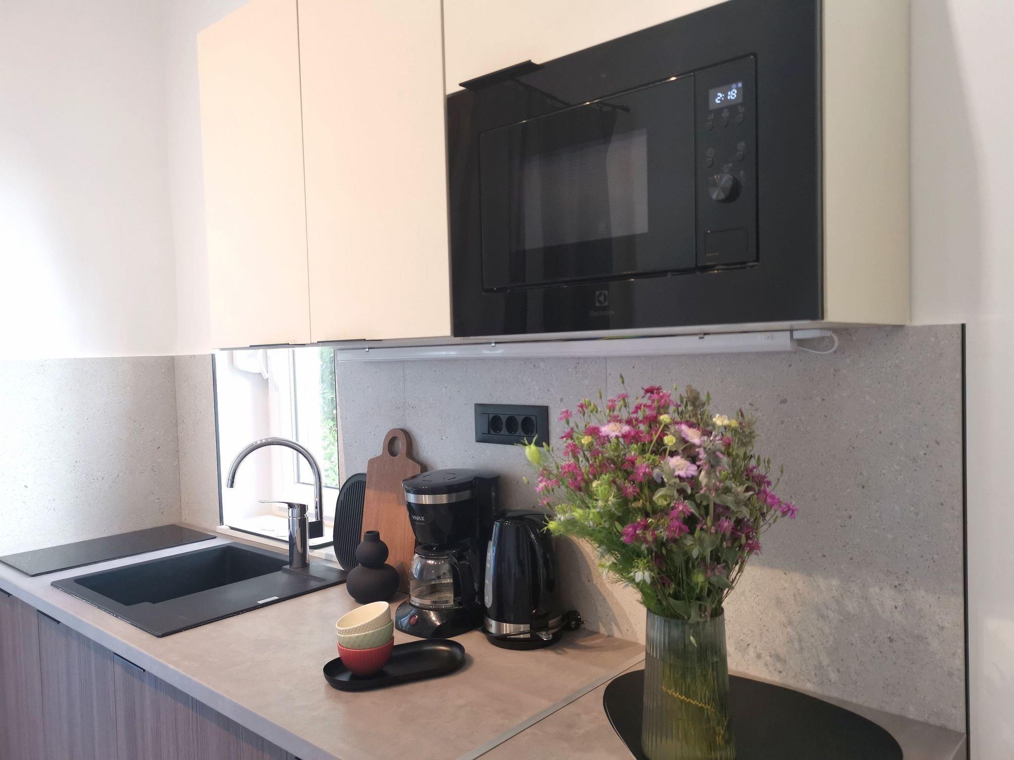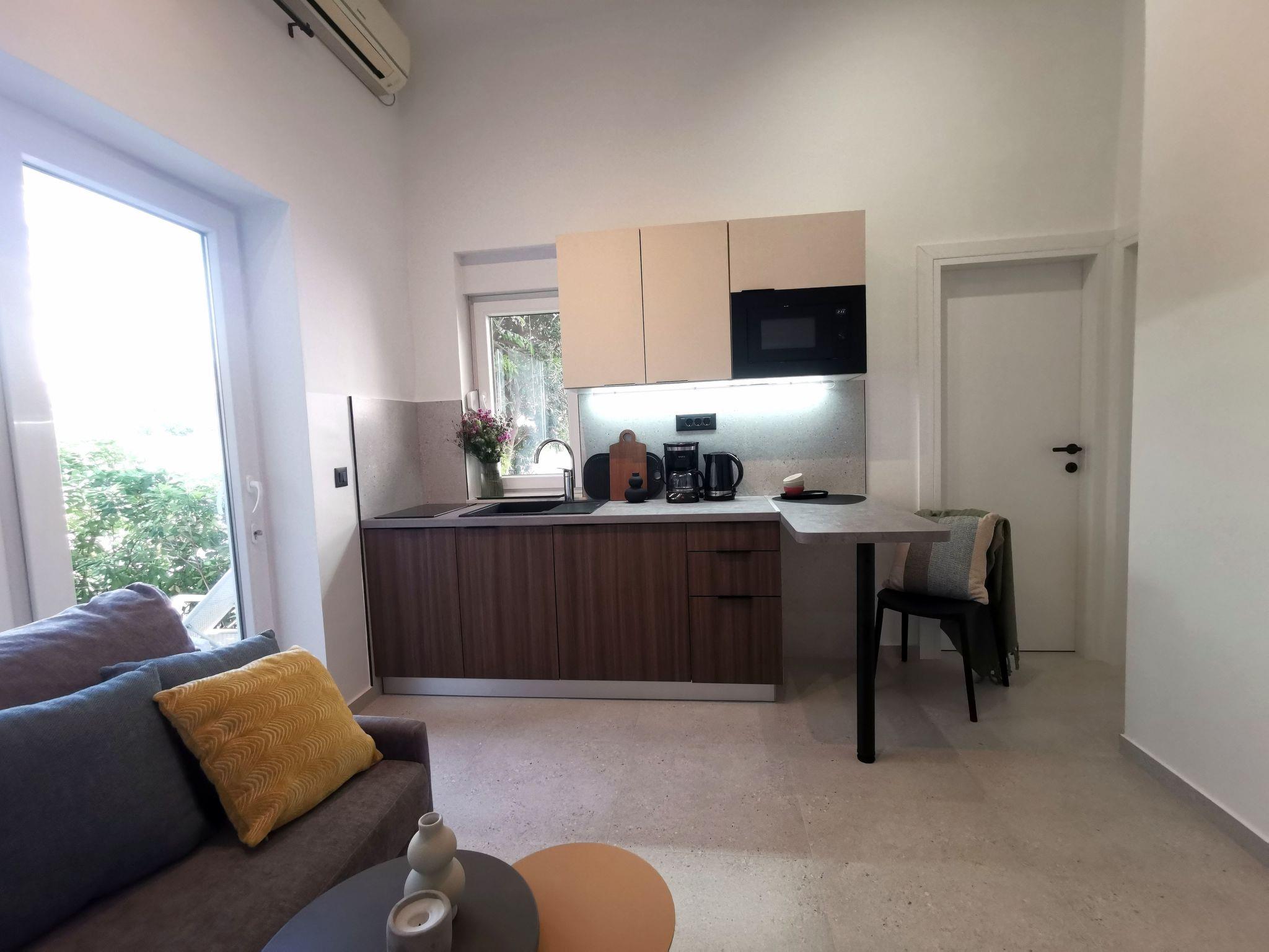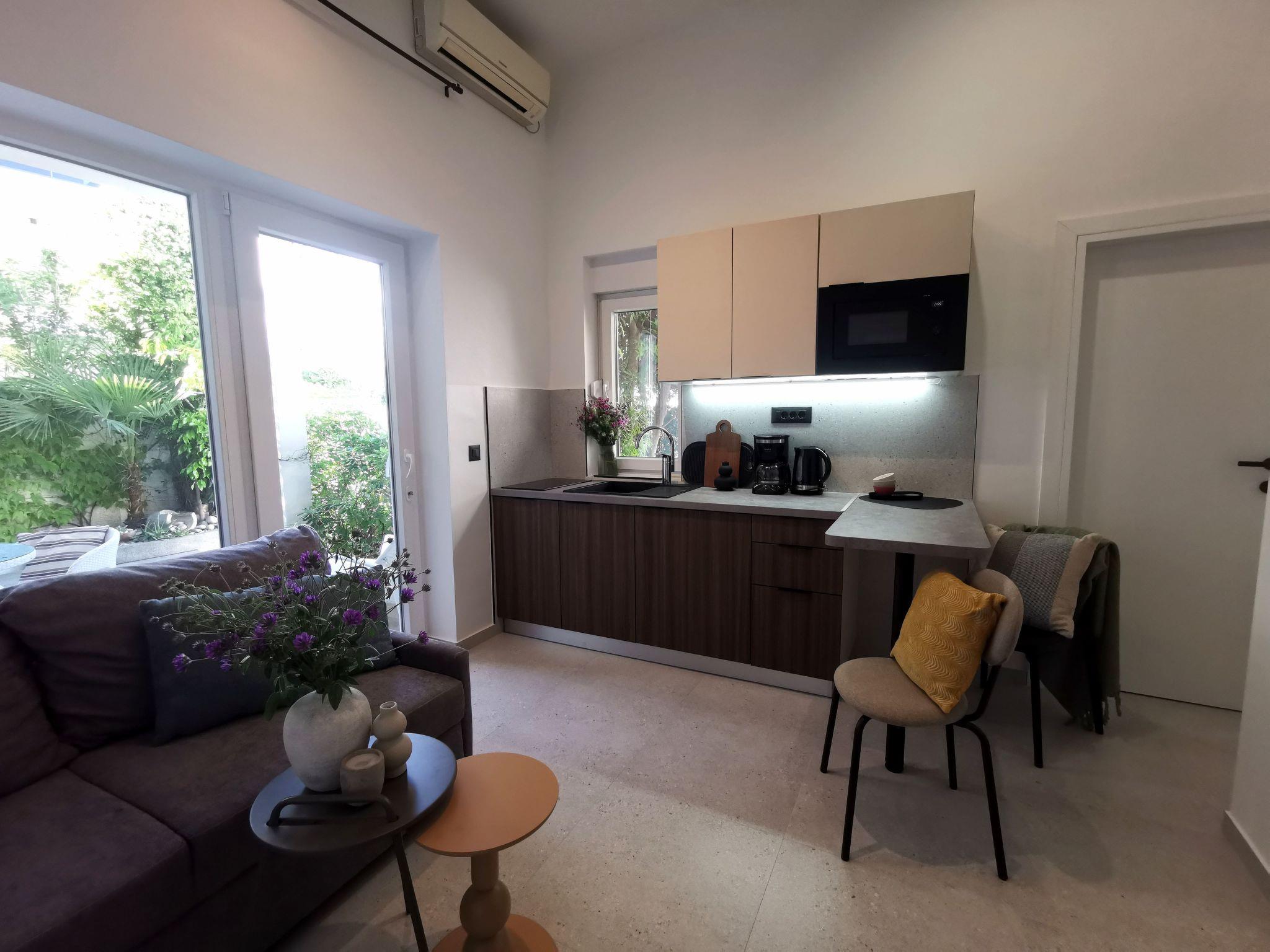 Apartment is a new, modern design with big private terrace with Mediterranean garden; 1 bedroom with double bed, living room with flatscreen TV with satellite programs with dining room and fully equipped sea view kitchen. Bed linen is provided.