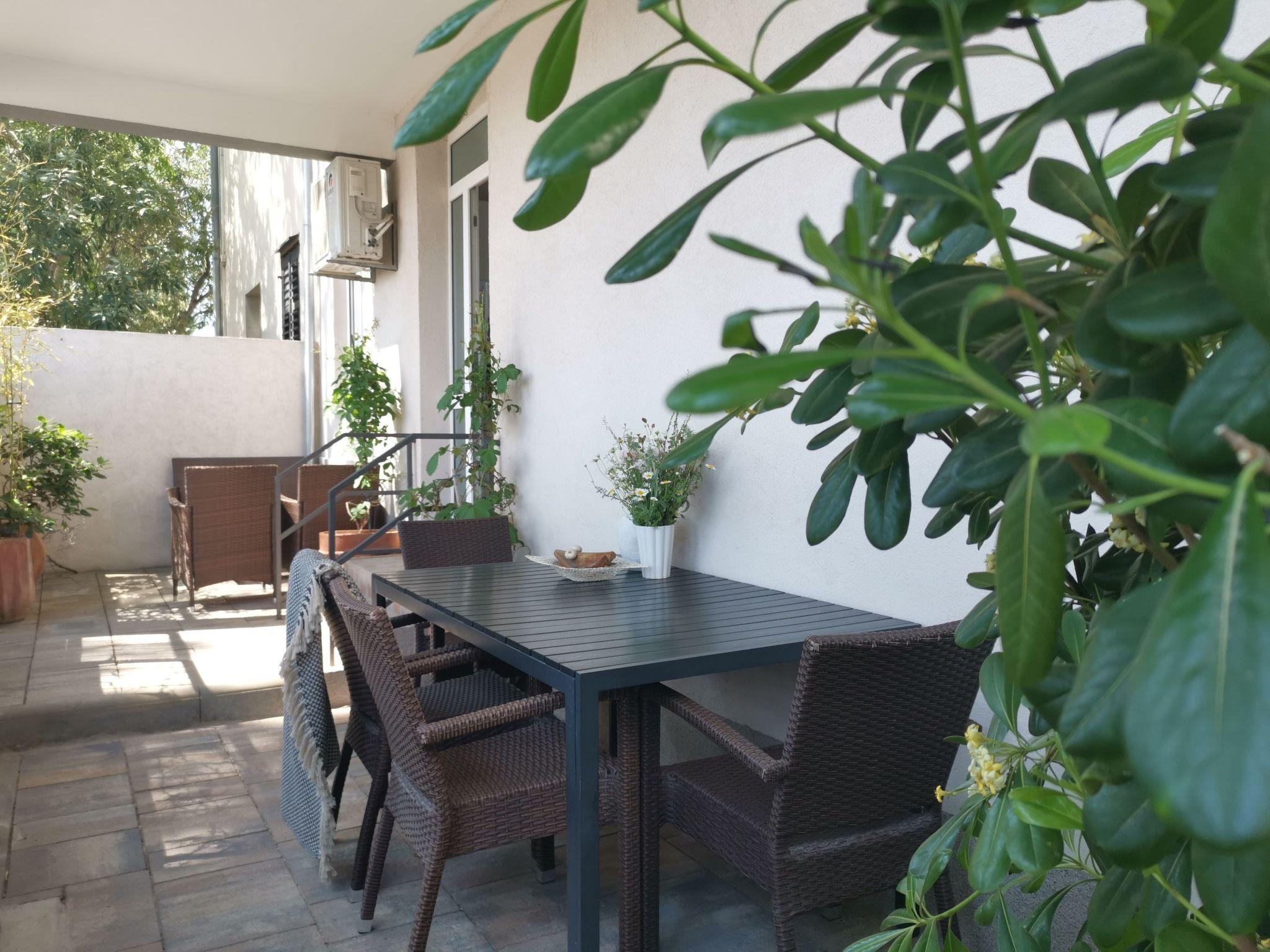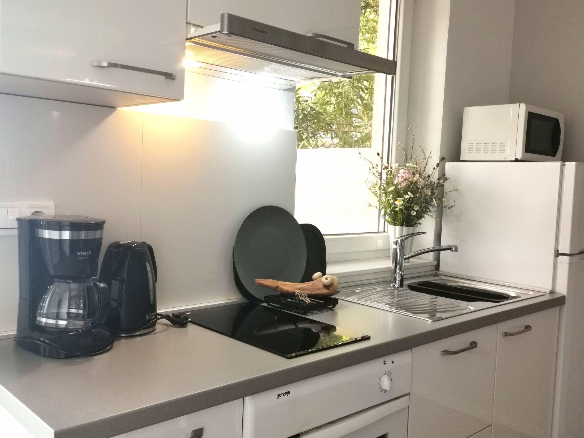 Apartment has a 2 bedrooms with double beds, living room with flatscreen TV with satellite programs with dining room and fully equipped sea view kitchen. Bed linen is provided and the beds are already made on arrival.There is also bathroom with shower cabine, toilet with toilet paper, soap. Washing machine is in laundry (option, paymnet). This apartment has large terrace with garden furniture and Mediterranean plants. Villa has private parking space and for 1 apartment is reserved 1 parking space.