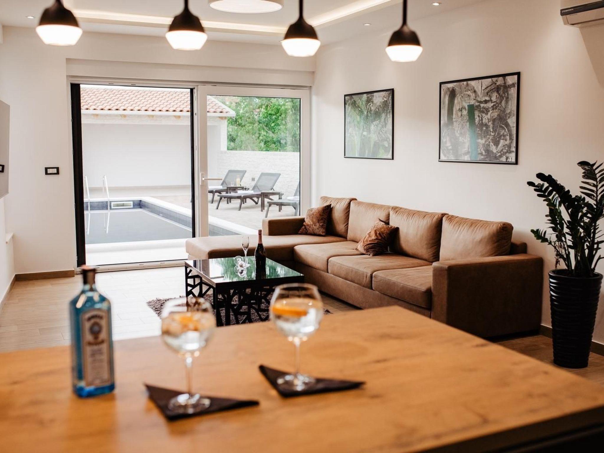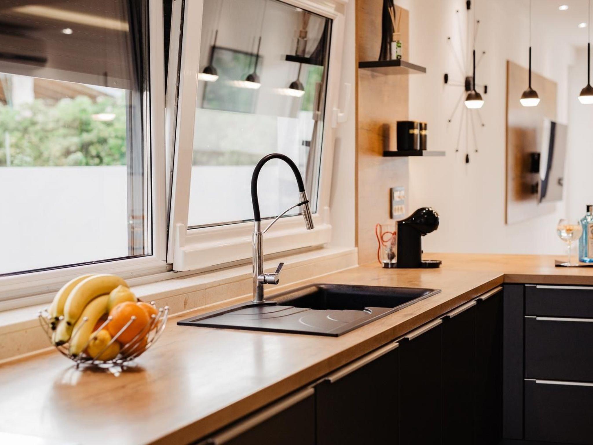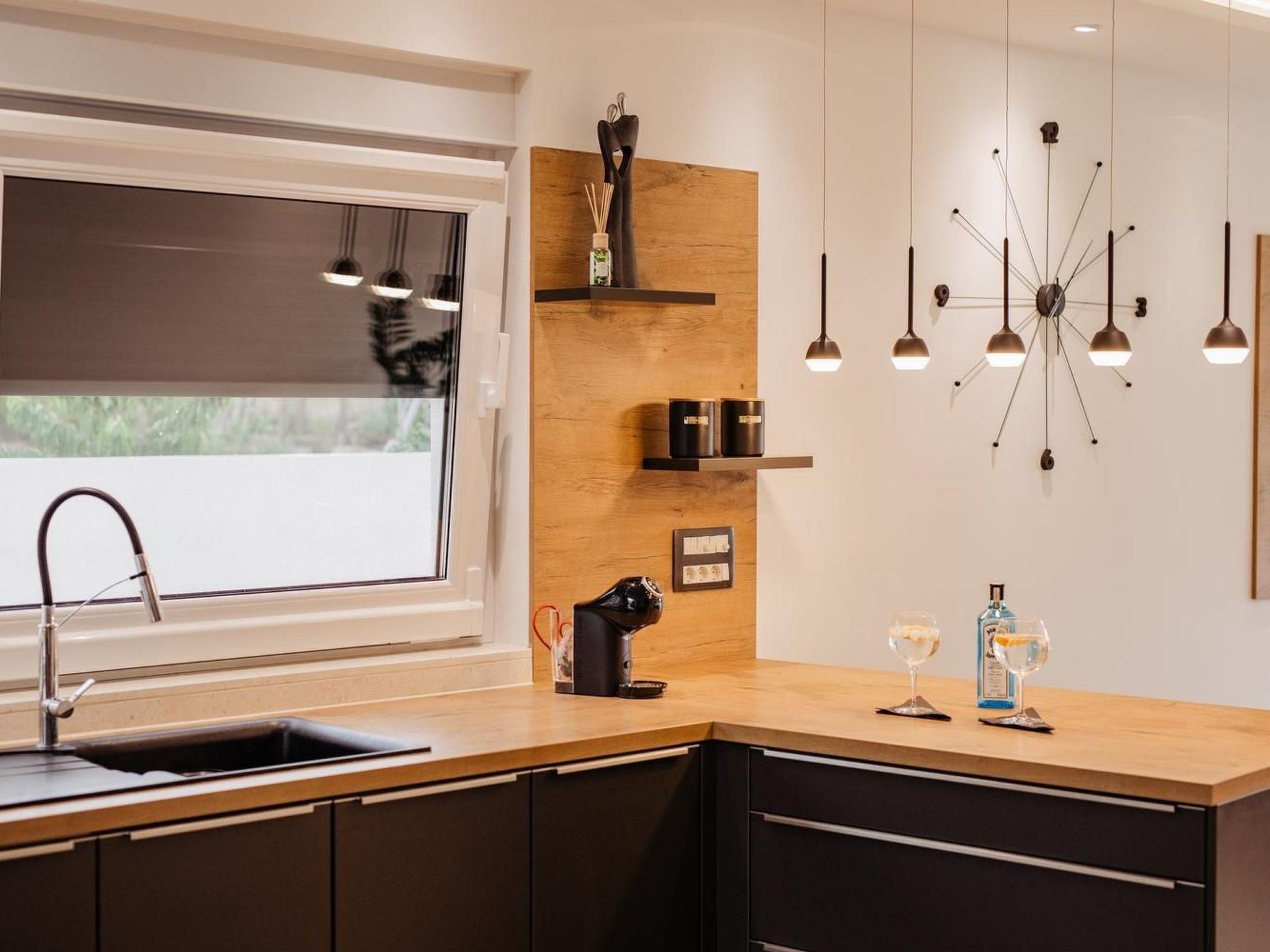 t can accommodate 8 guests in its four beautifully decorated bedrooms. The three bedrooms have double beds and an en-suite bathroom, while the fourth bedroom is ideal for children as it has two single beds. The villa also has another separate bathroom. The private gym located within the villa allows you to maintain your shape even on holiday. A fully equipped kitchen with a dining area and living room are located on the ground floor of the villa. Balcony doors separate the living room from the outside area.