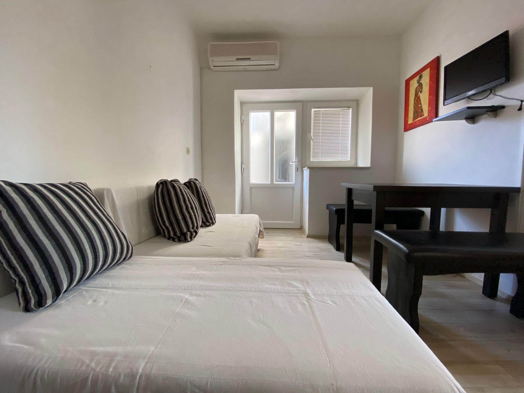Inside you will find a tasteful and functional interior, perfectly designed for families or friends. The 57 m² flat has a separate bedroom with a double bed and another bedroom with two single beds. There is also a bathroom with WC and a spacious living room with an additional sofa bed (approx. 150x200 cm). The kitchenette is fully equipped with the most basic cooking utensils as well as an oven, fridge, freezer and hob. Air-conditioned and traditionally kept cool by the thick stone walls, the flat guarantees a pleasant indoor climate even on hot days.