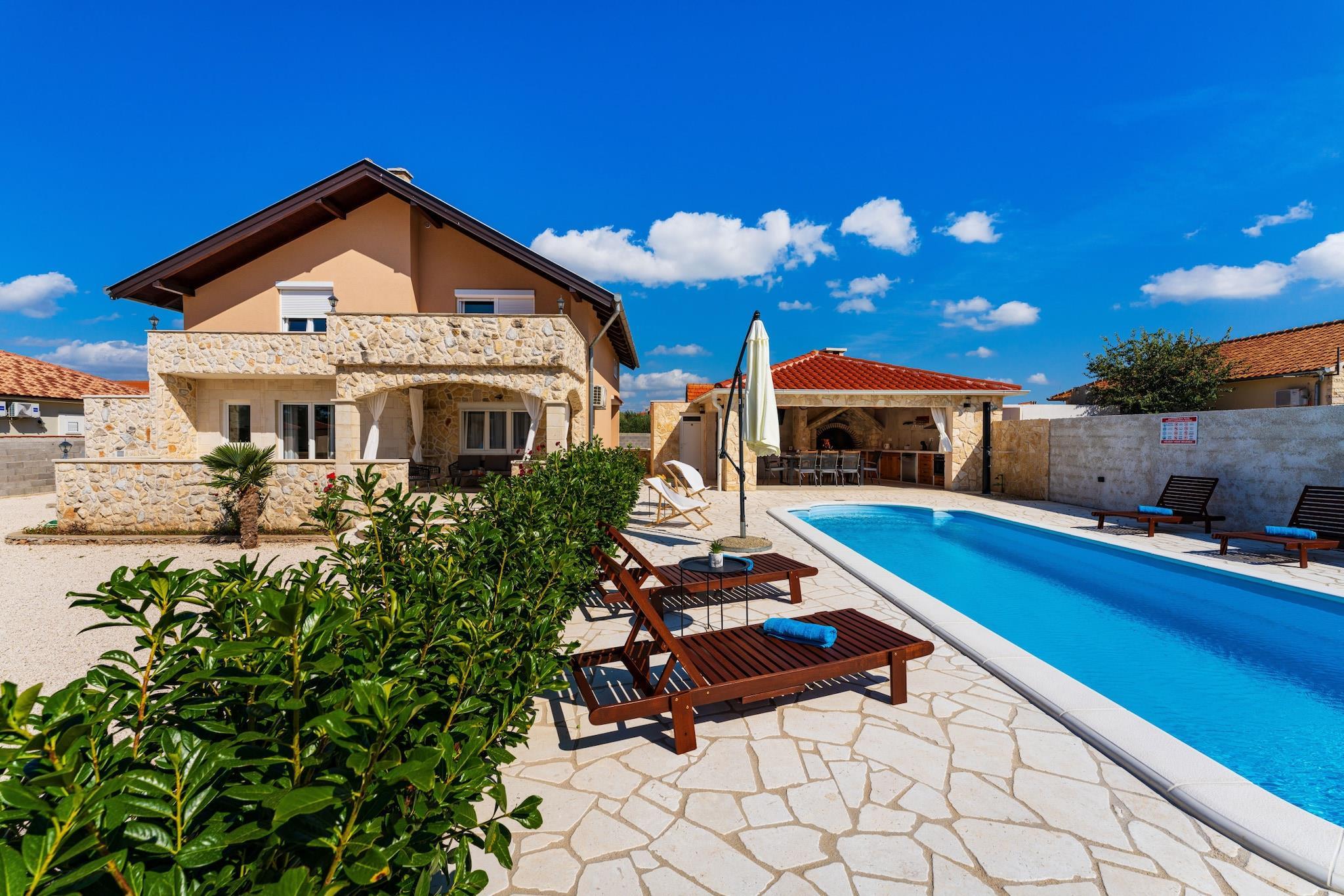 Dette charmerende feriehus ligger i et roligt område inde i landet nær Sibenik, kun 15 km fra den nærmeste strand. Omgivet af natur og tæt på Krka Nationalpark er det det perfekte sted for en afslappende familieferie. Huset er designet med komfort og privatliv for øje og har en privat pool, udendørs køkken og en rummelig, indhegnet have, der er ideel til op til 8 personer. Indenfor finder gæsterne fire klimatiserede soveværelser, to moderne badeværelser, et lyst åbent køkken med spiseplads og en hyggelig stue. Ekstra komfort tilbydes i form af et fritidsrum og en balkon med udsigt over poolen. Udenfor er der en overdækket terrasse med spiseplads, liggestole ved poolen, ekstra toilet og bevogtet parkering. Gæsterne har adgang til en trampolin, bordtennisbord, dart og brætspil, som sikrer underholdning for alle aldersgrupper. Beliggenheden er perfekt til at udforske Dalmiens skønhed. Krka Nationalpark og Vrana-søens naturpark ligger kun 15 minutters kørsel derfra, og kystbyerne Vodice og Pirovac samt byerne Sibenik, Zadar og Split ligger inden for rækkevidde. Dette feriehus er et fremragende valg for familier eller grupper, der ønsker at kombinere ro, komfort og adgang til nogle af de smukkeste steder i Kroatien.
