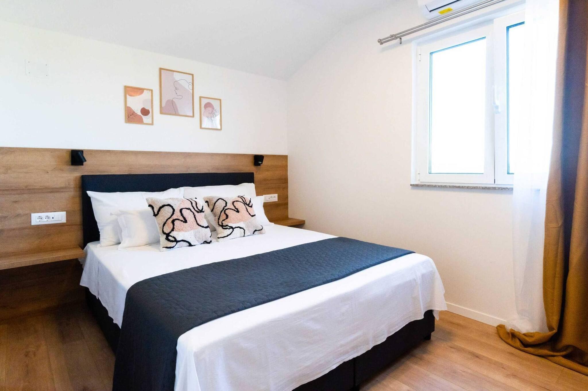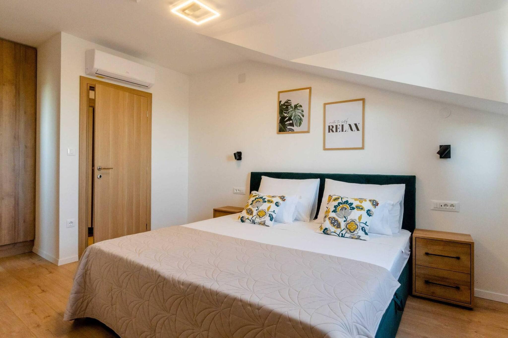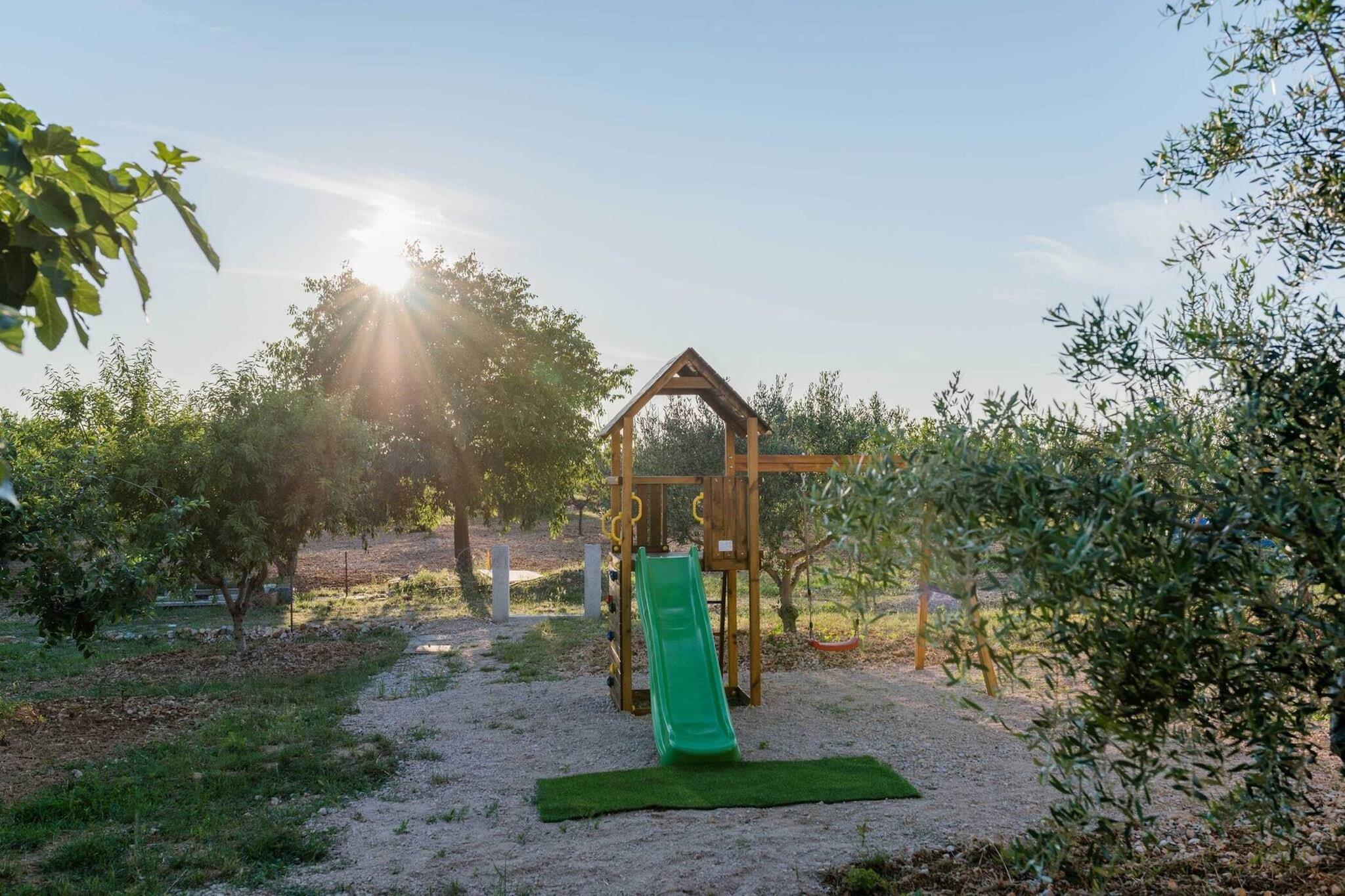 Træd ind i en fredfyldt oase gemt væk i olivenlundene bag Vodice, hvor tiden går langsommere, og naturen er i centrum. Lige uden for døren ligger en smukt bygget to-etagers villa på ca. 150 m², designet med komfort og samvær for øje. Ovenpå finder du tre soveværelser med aircondition, hver med eget badeværelse og tv – perfekt til to familier eller en gruppe venner, der søger både privatliv og samvær. Nedenunder fører det åbne køkken, spisestue og opholdsstue ud til en overdækket terrasse med en stenbarbecue, plads til lange måltider og en generøs udsigt over den private swimmingpool (9 × 4 m) og den store have. Udenfor føles grunden som din egen lukkede oase: en indhegnet have, en legeplads, bordtennis, boccia-bane, basketballkurv, fem cykler og endda en trampolin venter. Poolen er helt din til dovne svømmeture, solbadning eller aftenbad under stjernerne. Uanset om du krøller dig sammen ved den stenede pejs indenfor, slapper af på terrassen eller cykler gennem oliventræerne, er komforten altid inden for rækkevidde. Det bedste af det hele: kæledyr er velkomne (undtagen farlige racer), så din firbenede ven også kan være med til det sjove. Der må ikke ryges indenfor, så luften forbliver frisk for alle. På trods af følelsen af afsondrethed er du meget tæt på Dalmatiens herligheder. Den nærmeste stenstrand ligger cirka 15 kilometer væk, mens den fantastiske Krka Nationalpark og den fredelige Vrana Lake Nature Park begge ligger inden for kort køreafstand. Kystbyerne Vodice og Pirovac indbyder til afslappede middage ved havet, og både Zadar og Split kan nås på under en time. Her får du det bedste fra begge verdener: en rolig base på landet med nem adgang til Adriaterhavskysten, historie, natur og lokal charme.