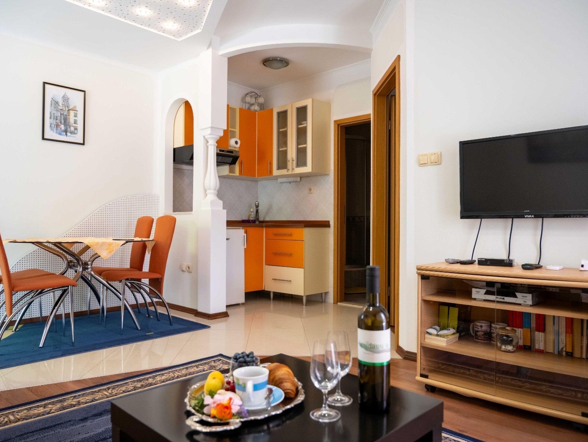 Ferienwohnung bietet Platz für 2 Gäste. Die Betten sind in Schlafzimmern, die es 1 gibt, innerhalb einer Gesamtfläche von 43m2, angeordnet. Die Gäste haben eine eigene Terrasse zur Verfügung, auf der sie in warmen Sommernächten genießen können. Es ist erlaubt, Speisen auf dem Gemeinschafts-Grill vorzubereiten. IM PREIS INBEGRIFFEN: Kurtaxe, Endreinigung, Parkplatz, Internet, Kinderbett, Bügeleisen, Bügelbrett, Föhn. VERBINDLICHE ZUSÄTZLICHE KOSTEN: Aufzahlung für Kurzaufenthalte (prozentualer Zuschlag pro Nächtigungsanzahl: 30% - 1, 20% - 2, 10% - 3). UNVERBINDLICHE ZUSÄTZLICHE KOSTEN: Klimatisierung (7,00 € pro Nacht). Die Verfügbarkeit zusätzlicher Dienstleistungen in Ihrem reservierten Termin und die Preise derselben (falls nicht aufgeführt) müssen im Voraus überprüft werden. Zusätzliche Dienstleistungen die in der Zahlungsaufforderung nicht aufgeführt sind werden direkt beim Vermieter bezahlt, angenommen der Gast nutzt auch diese.