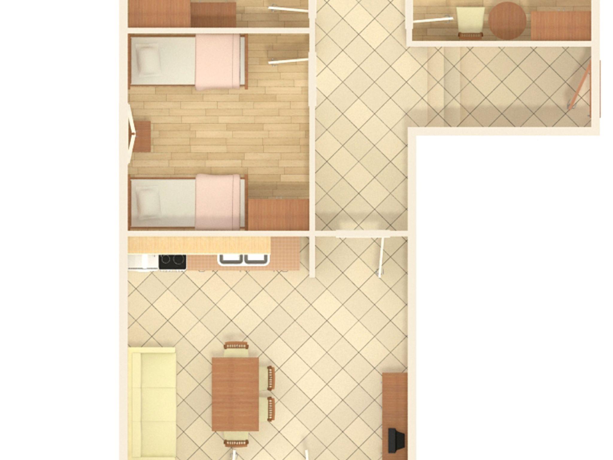 Ferienwohnung bietet Platz für 6 Gäste. Die Betten sind in Schlafzimmern, die es 3 gibt, innerhalb einer Gesamtfläche von 54m2, angeordnet. Die Gäste haben eine eigene Terrasse zur Verfügung, auf der sie in warmen Sommernächten genießen können. Es ist erlaubt, Speisen auf dem Gemeinschafts-Grill vorzubereiten. In der Unterkunftseinheit besteht die Möglichkeit des Mitbringens von Haustieren gegen Aufpreis. IM PREIS INBEGRIFFEN: Kurtaxe, Endreinigung, Parkplatz, Internet, Kinderbett, Bügelbrett, Föhn. VERBINDLICHE ZUSÄTZLICHE KOSTEN: Aufzahlung für Kurzaufenthalte (prozentualer Zuschlag pro Nächtigungsanzahl: 30% - 1, 20% - 2, 10% - 3). UNVERBINDLICHE ZUSÄTZLICHE KOSTEN: Klimatisierung (7,00 € pro Nacht), Wäschewaschen (5,00 € Waschen), Haustiere (5,00 € pro Nacht), Zusatzbett (10,00 € pro Nacht). Die Verfügbarkeit zusätzlicher Dienstleistungen in Ihrem reservierten Termin und die Preise derselben (falls nicht aufgeführt) müssen im Voraus überprüft werden. Zusätzliche Dienstleistungen die in der Zahlungsaufforderung nicht aufgeführt sind werden direkt beim Vermieter bezahlt, angenommen der Gast nutzt auch diese.