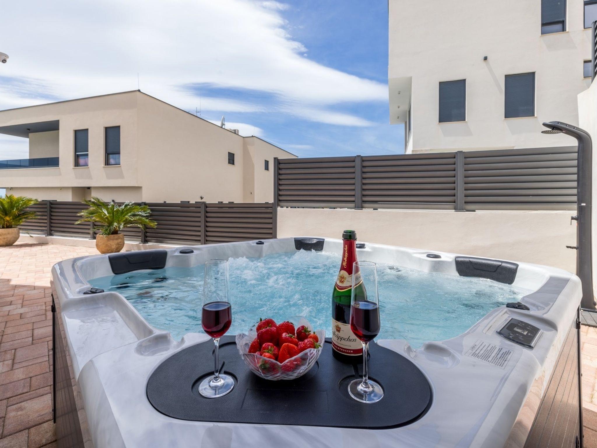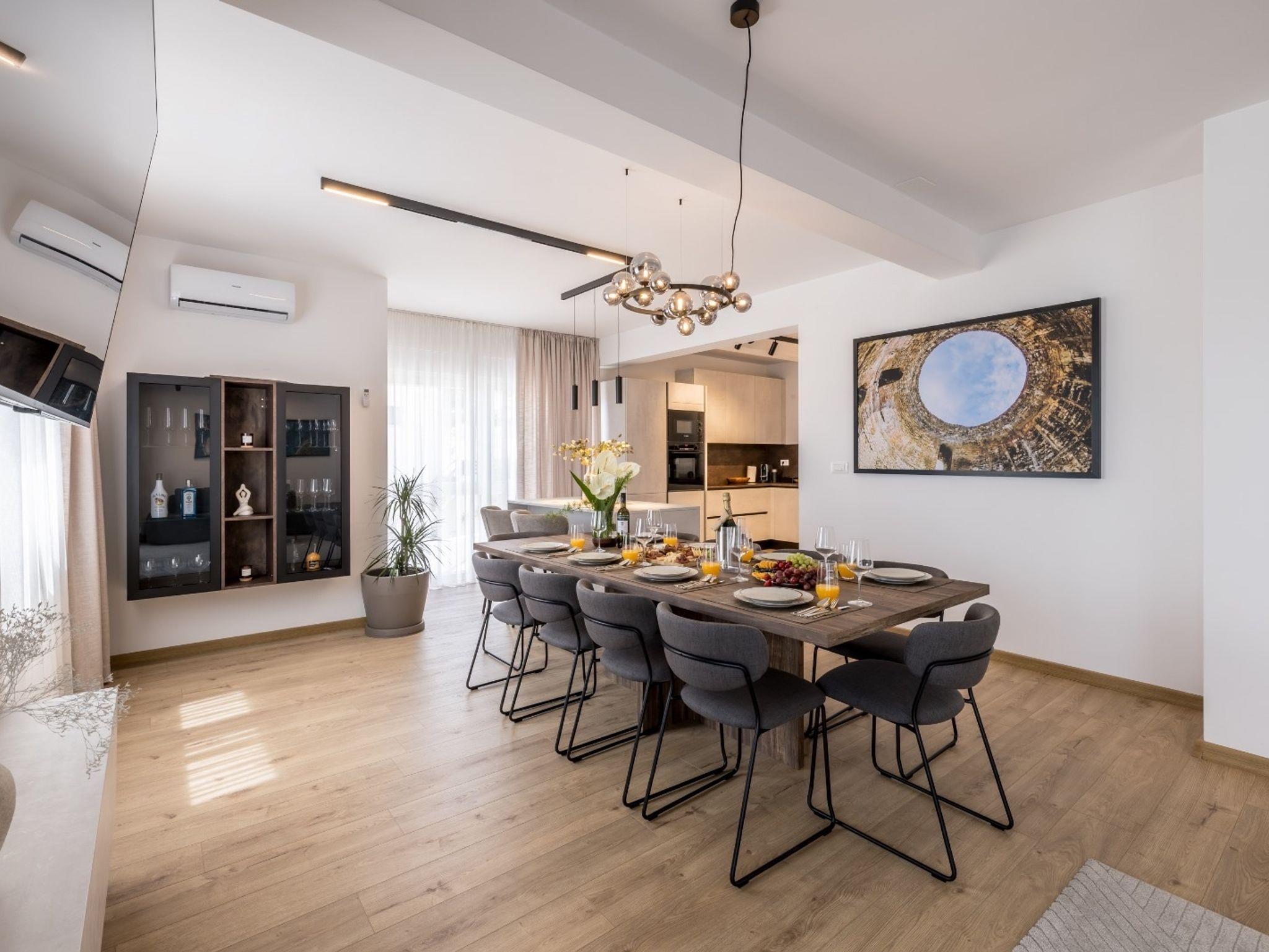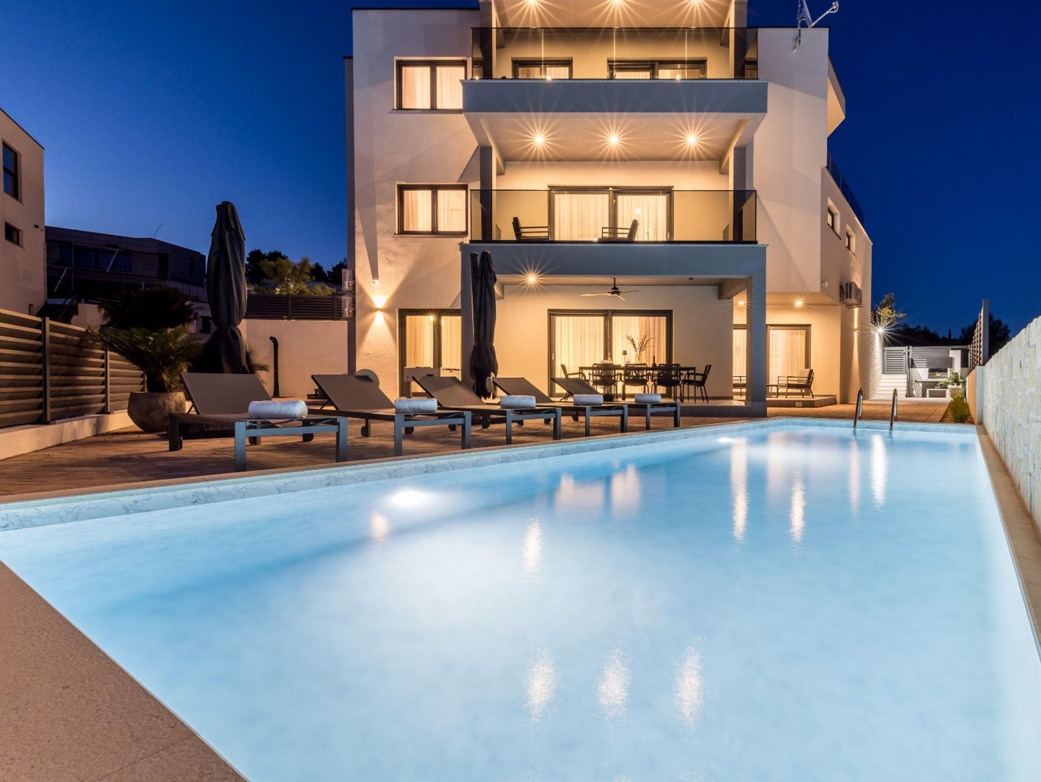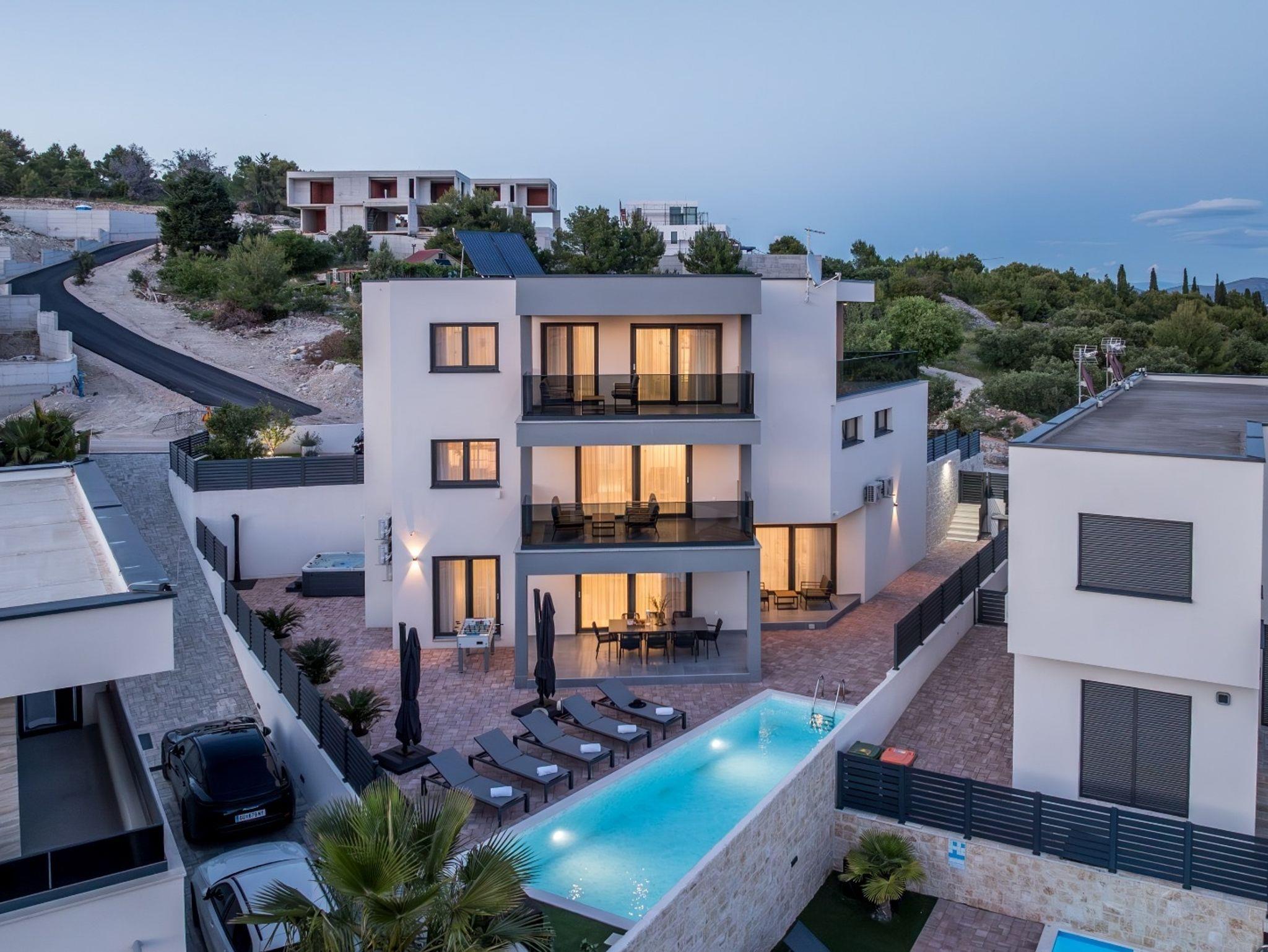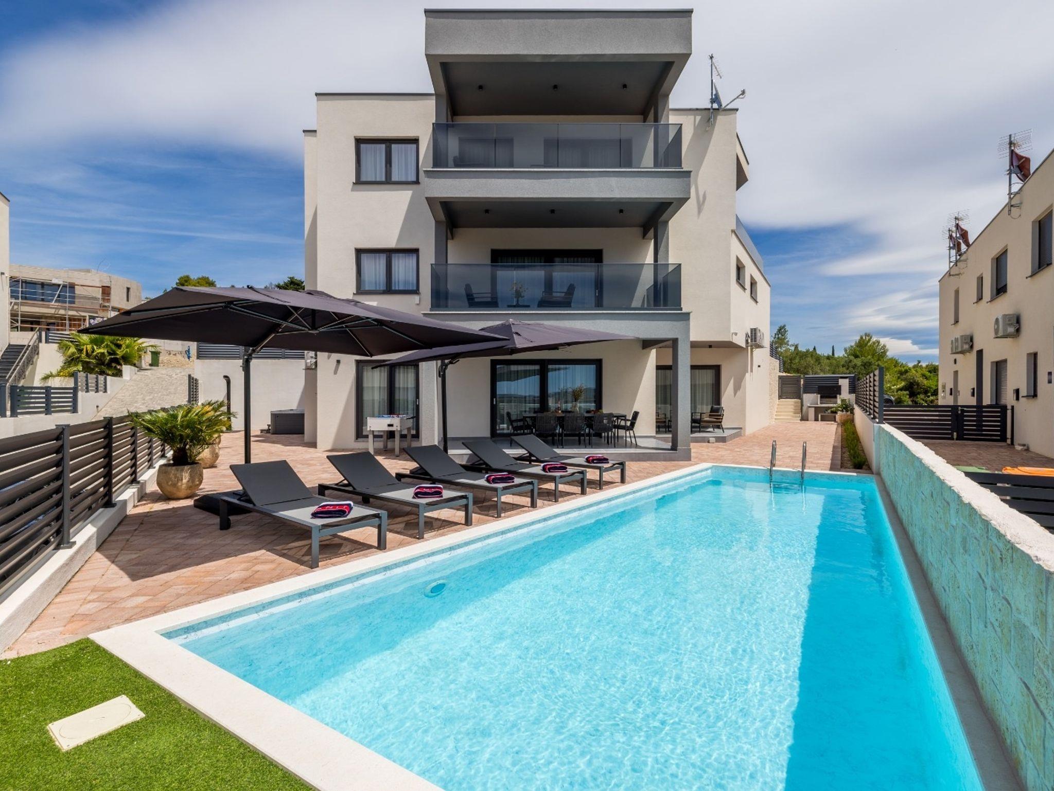 Haus bietet Platz für 10 Gäste. Die Betten sind in Schlafzimmern, die es 4 gibt, und in Wohnzimmer, innerhalb einer Gesamtfläche von 223m2, angeordnet. Die Gäste haben eine eigene Terrasse zur Verfügung, auf der sie in warmen Sommernächten genießen können. Das Haus bietet Meerblick. Für vollen Genuss und Entspannung gibt es einen privaten Grill für Gäste dieser Unterkunft. Während ihres Aufenthalts können sich Gäste im privaten Schwimmbad entspannen. IM PREIS INBEGRIFFEN: Kurtaxe, Endreinigung, Klimatisierung, Pool, Parkplatz, Internet, Kinderbett, Bügeleisen, Bügelbrett, Föhn, Sonnenschirm, Liegestühle. Die Verfügbarkeit zusätzlicher Dienstleistungen in Ihrem reservierten Termin und die Preise derselben (falls nicht aufgeführt) müssen im Voraus überprüft werden. Zusätzliche Dienstleistungen die in der Zahlungsaufforderung nicht aufgeführt sind werden direkt beim Vermieter bezahlt, angenommen der Gast nutzt auch diese.