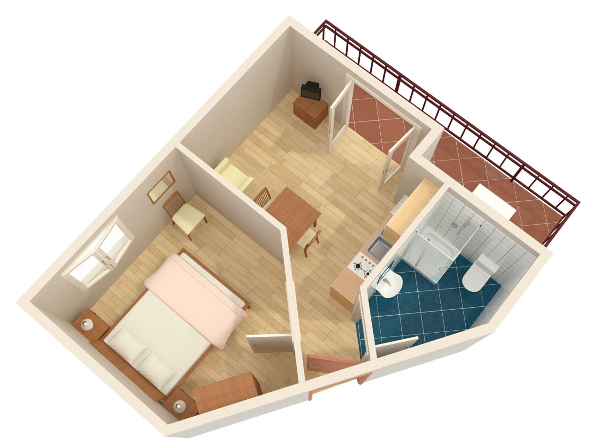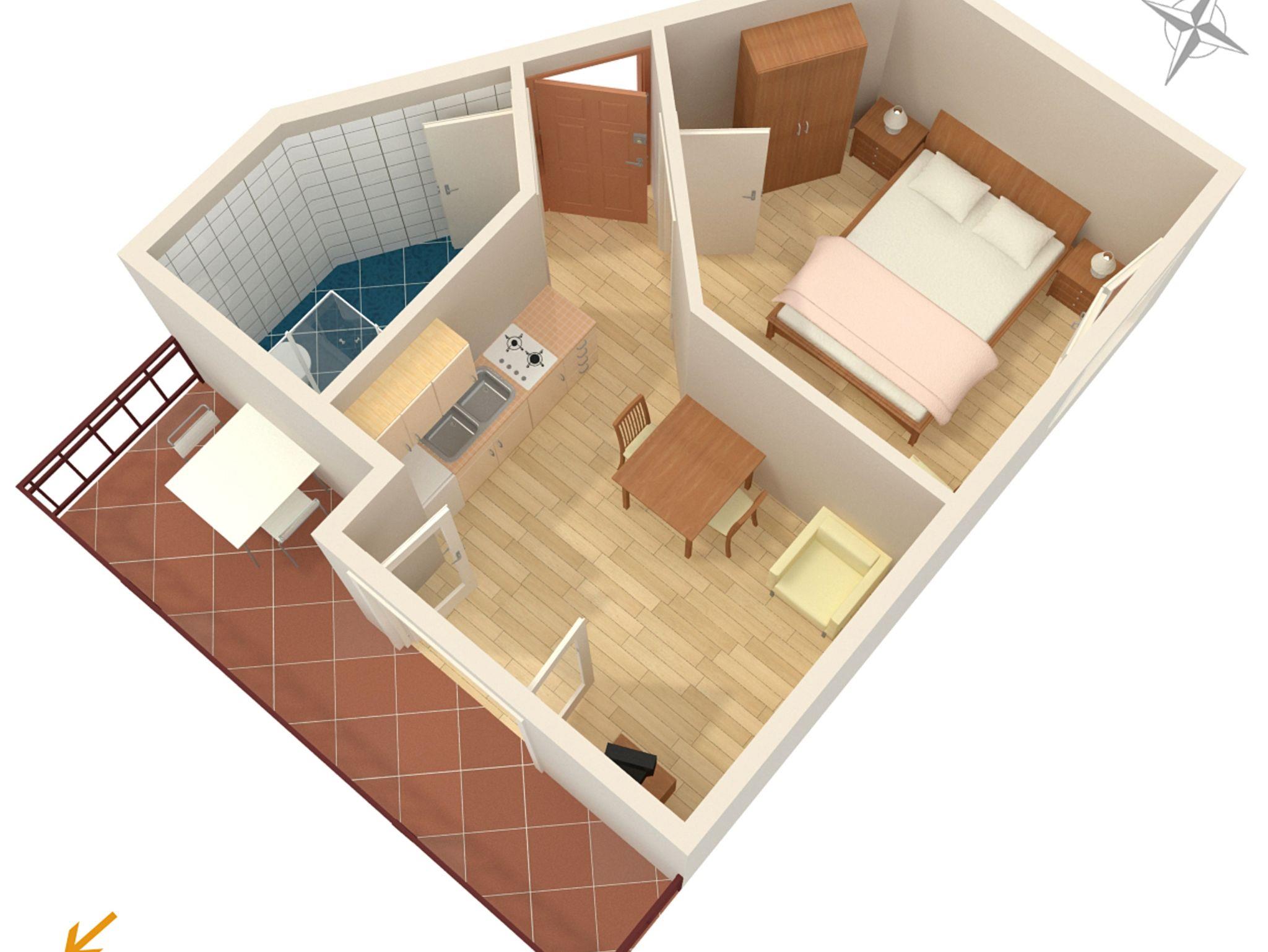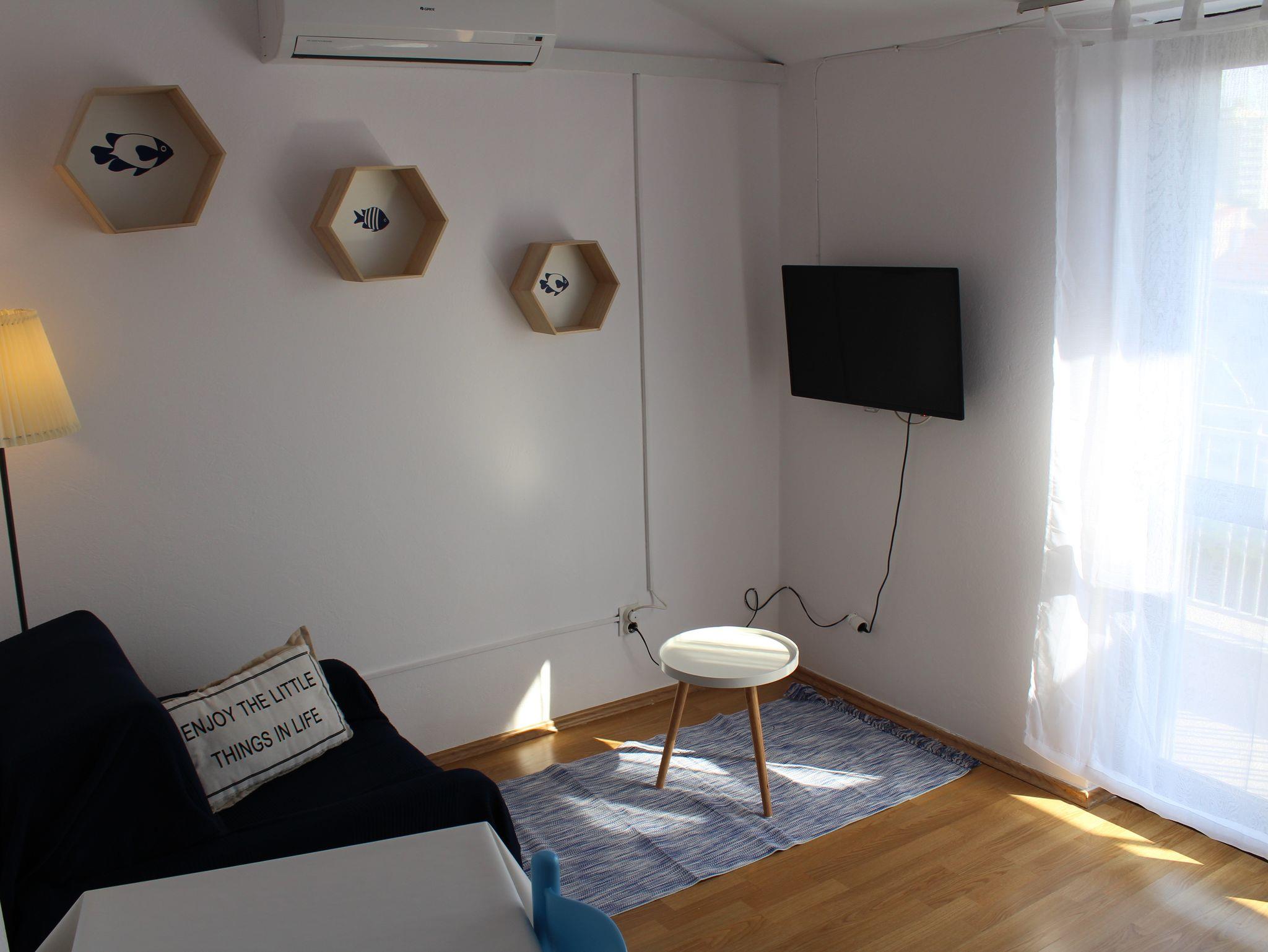 Ferienwohnung bietet Platz für 2 Gäste. Die Betten sind in Schlafzimmern, die es 1 gibt, innerhalb einer Gesamtfläche von 24m2, angeordnet. Die Gäste haben eine eigene Terrasse zur Verfügung, auf der sie in warmen Sommernächten genießen können. Das Apartment bietet Meerblick. Es ist erlaubt, Speisen auf dem Gemeinschafts-Grill vorzubereiten. IM PREIS INBEGRIFFEN: Kurtaxe, Endreinigung, Klimatisierung, Parkplatz, Internet, Bügeleisen, Bügelbrett, Föhn. VERBINDLICHE ZUSÄTZLICHE KOSTEN: Aufzahlung für Kurzaufenthalte (prozentualer Zuschlag pro Nächtigungsanzahl: 30% - 1, 20% - 2, 10% - 3). Die Verfügbarkeit zusätzlicher Dienstleistungen in Ihrem reservierten Termin und die Preise derselben (falls nicht aufgeführt) müssen im Voraus überprüft werden. Zusätzliche Dienstleistungen die in der Zahlungsaufforderung nicht aufgeführt sind werden direkt beim Vermieter bezahlt, angenommen der Gast nutzt auch diese. Ermäßigung auf den Grundpreis: Gratistag 14=13 (bei einem Aufenthalt von 14 Tagen oder mehr erhalten Sie einen Gratistag für den Aufenthalt bis 31.12.26).