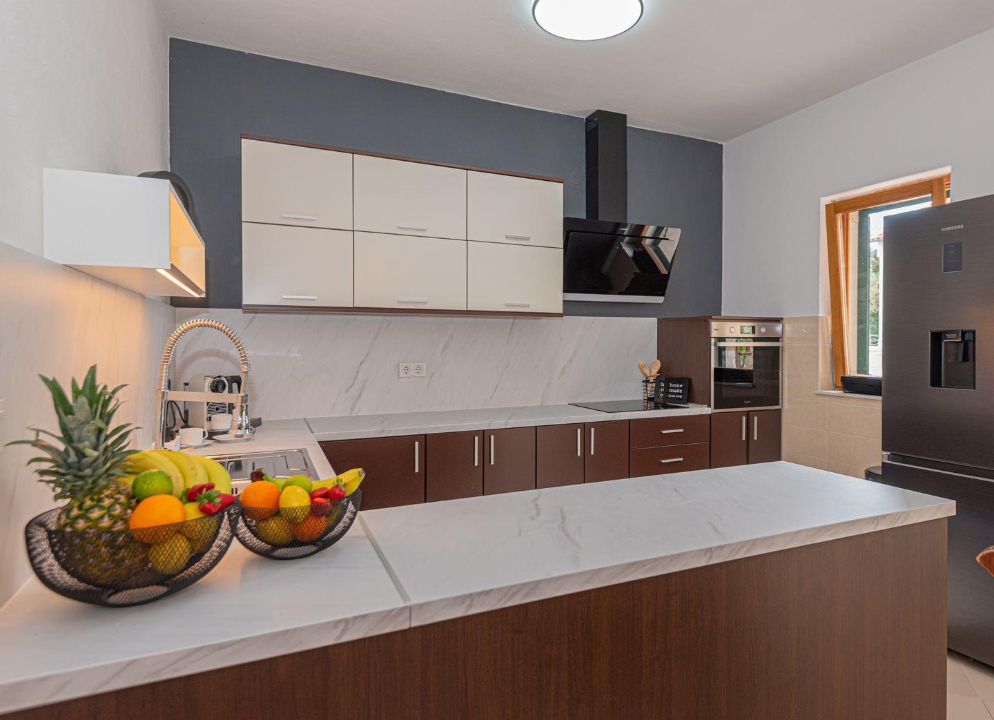 Die Villa Luxury V4 in Vodice liegt in einer ruhigen Gegend und erstreckt sich über zwei Etagen. Mit drei Schlafzimmern und drei Badezimmern bietet sie Schlafmöglichkeiten für bis zu sieben Personen auf einer Wohnfläche von 190 m². Die stilvoll eingerichtete Villa verfügt über eine voll ausgestattete Küche, die offen in den Essbereich und das gemütliche Wohnzimmer mit Kamin übergeht – ideal für entspannte Abende.