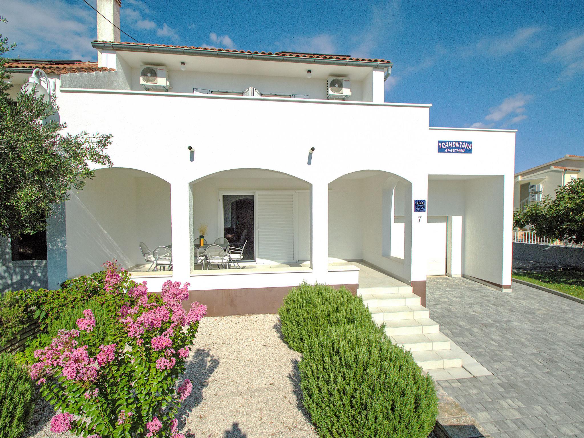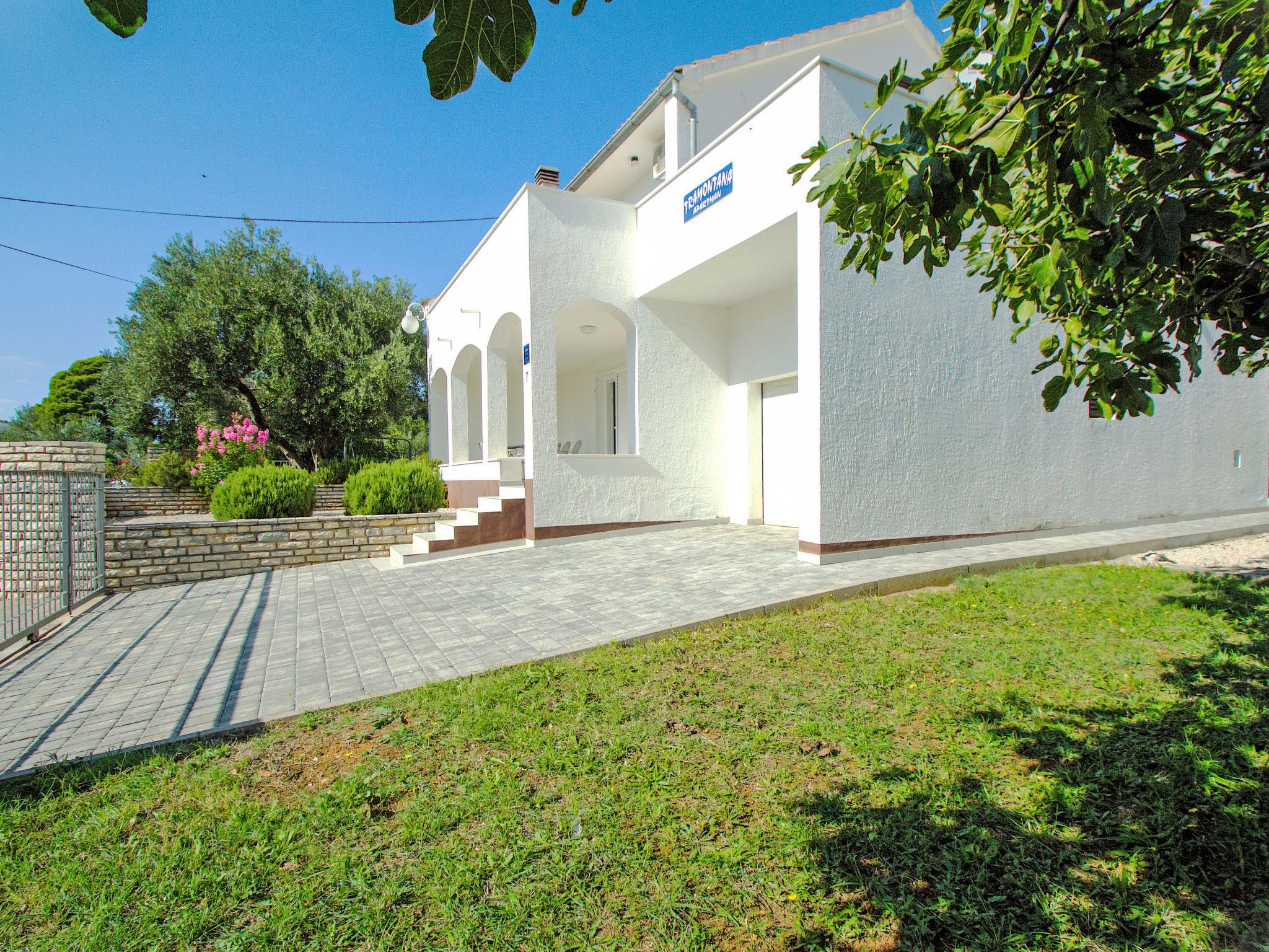 Tribunj 3 km from Vodice: Beautiful semi-detached house "Tramontana", 2 storeys. In the hamlet Sovlje 1.5 km from the centre of Tribunj, in a quiet, sunny position, 400 m from the sea, 400 m from the beach. Private: property 400 m2 (fenced). Terrace (15 m2), garden furniture, barbecue. In the house: internet access, washing machine. Parking at the house on the premises, single garage. Shop 1.5 km, restaurant 100 m, bus stop 6.3 km, pebble beach, rocky beach, concrete beach 400 m. Groups of teenagers on request only. By groups of young people double deposit is requested on arrival. Concrete beach with showers in the bay of Sovlje, 400 m from the house.