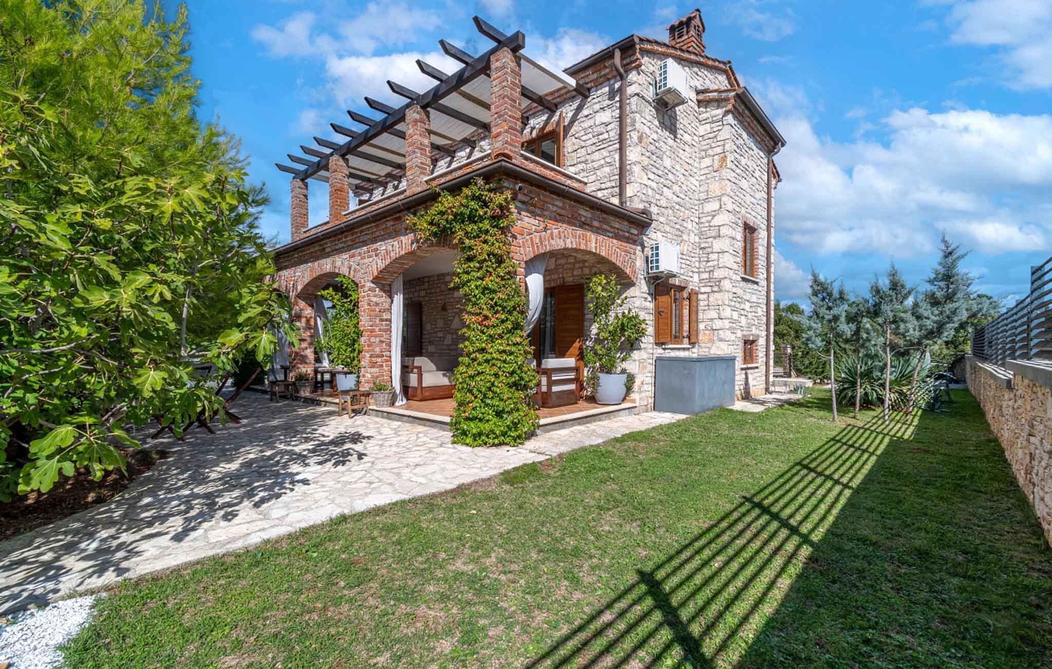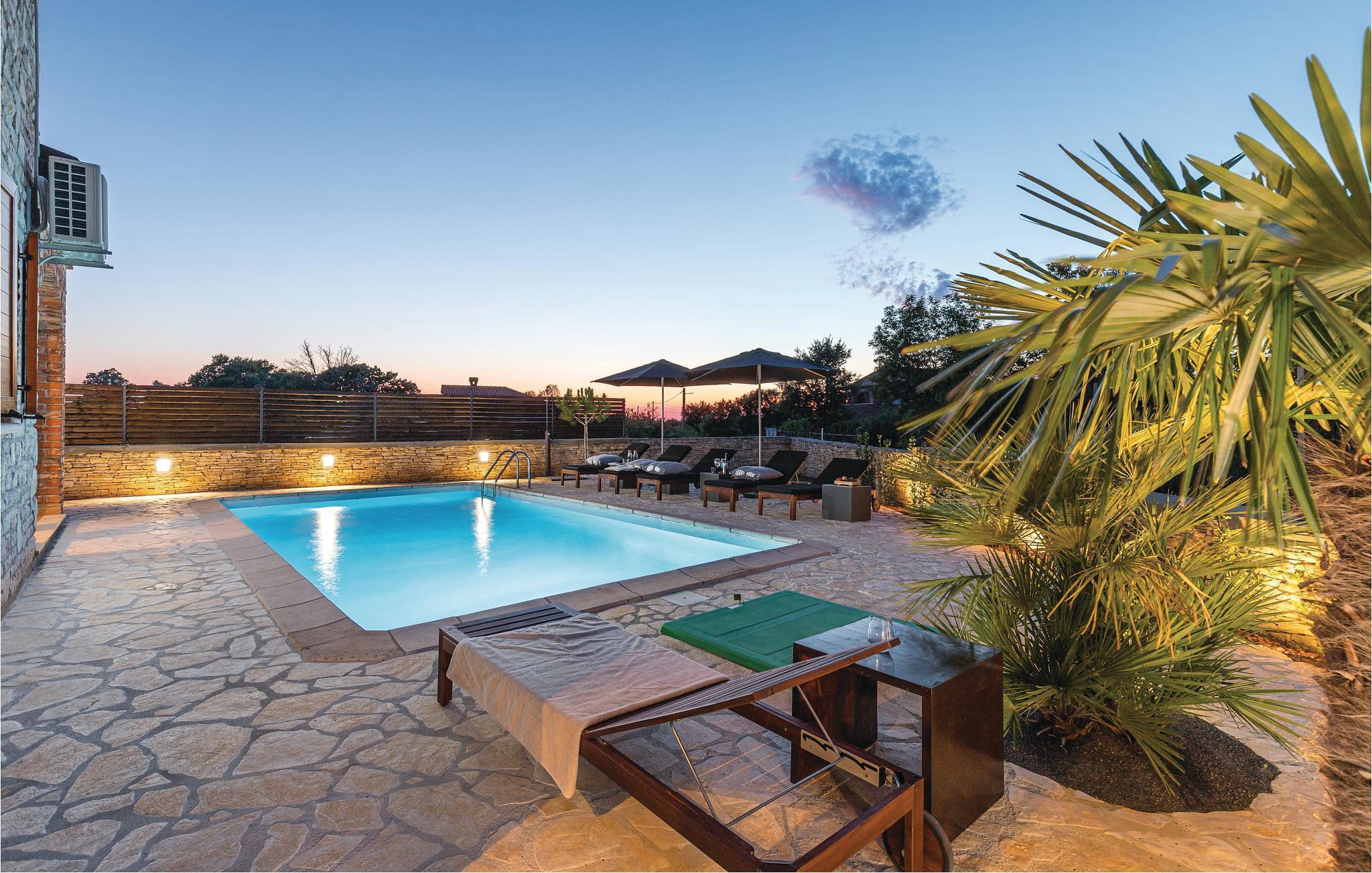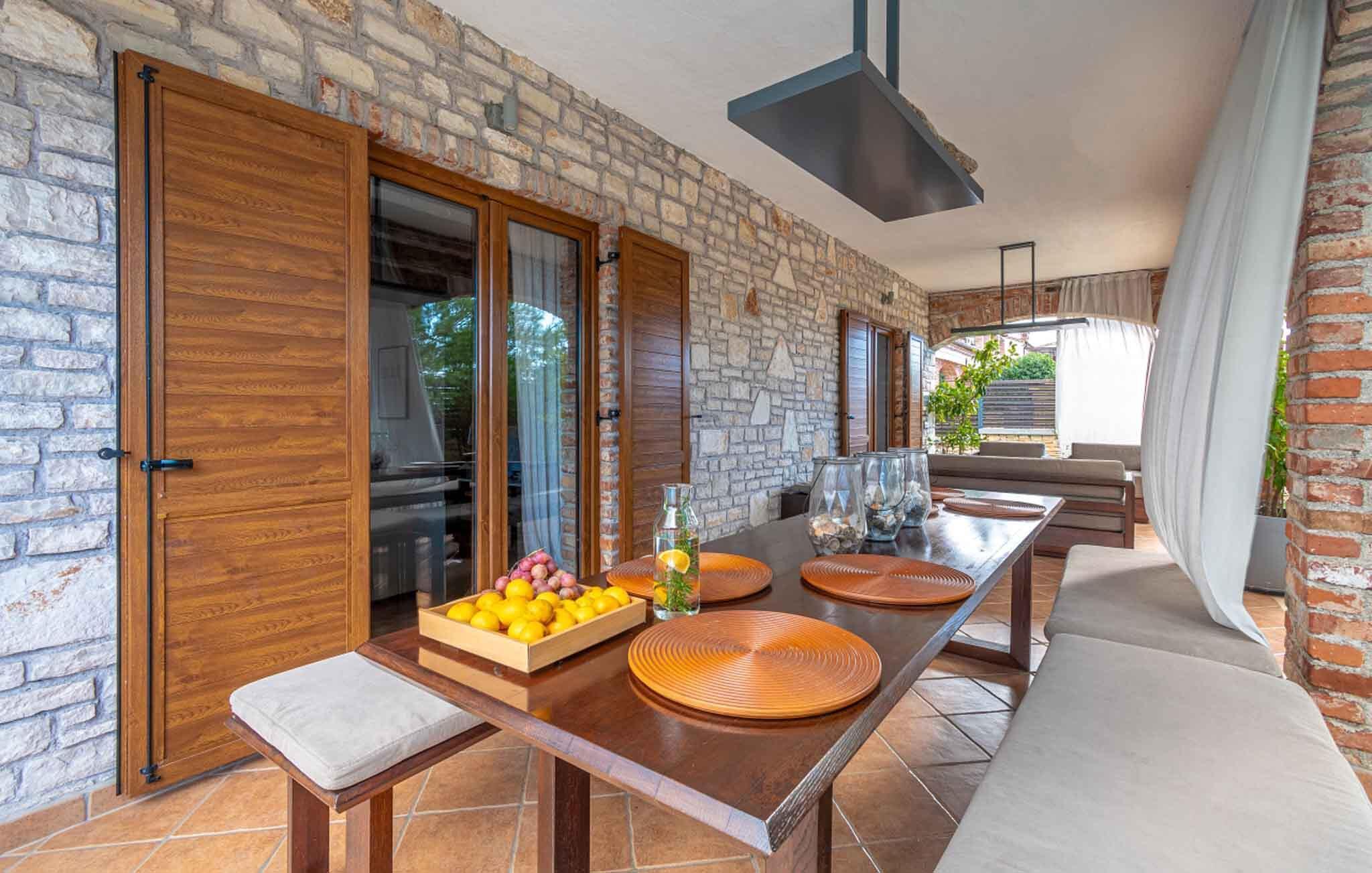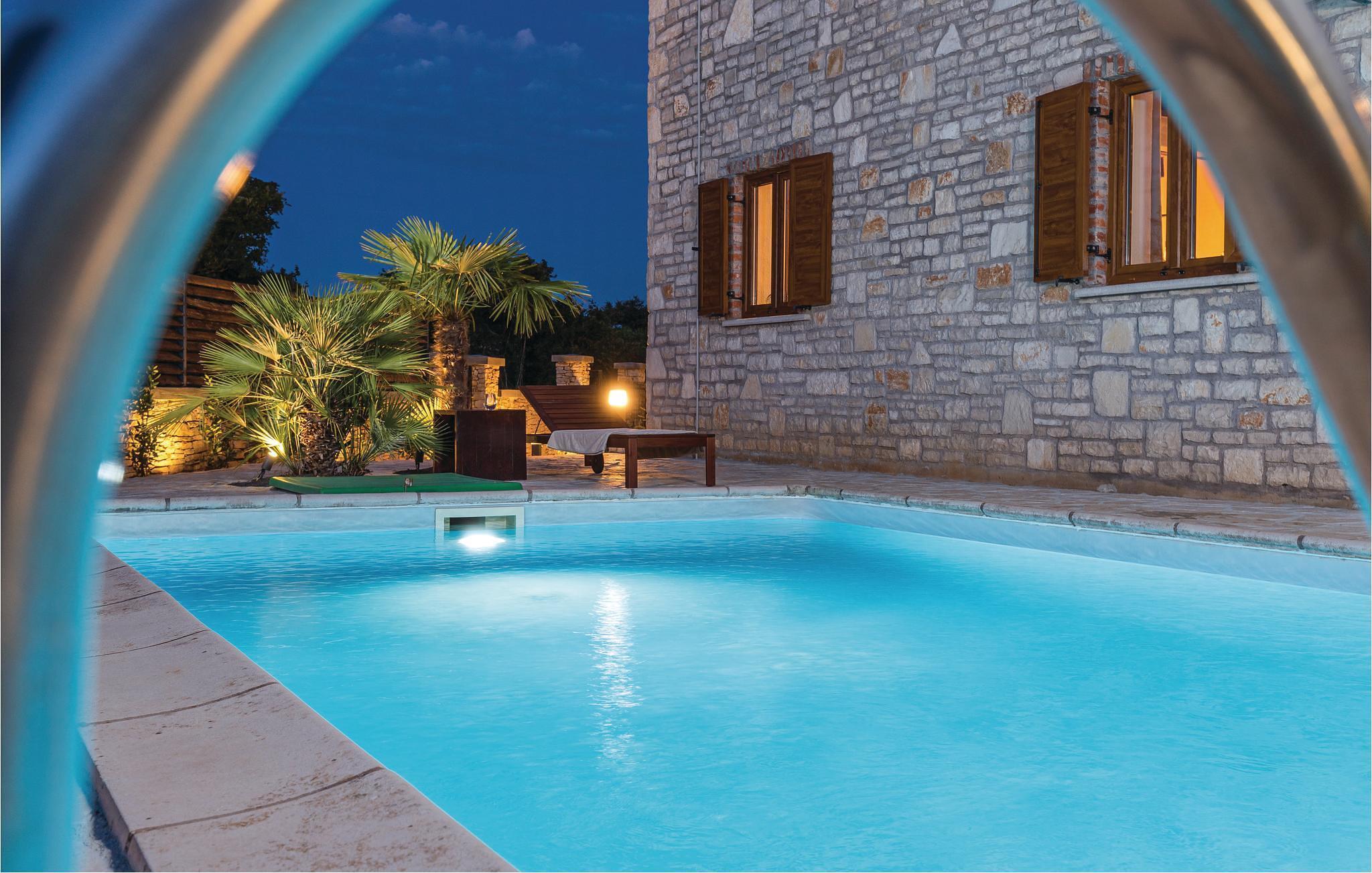 Dette usædvanlige feriehus med privat pool, ligger i en lille by og har en skøn beliggenhed og en komfortable indretning både ude og inde til en afslappet ferie. Huset er indrettet med kærlighed helt ned i de små detaljer og kombinationen af sten og træ, tilføjer huset noget ganske særligt. Poolen med solstole, den indhegnede og velplejede have, samt den dejlige overdækkede veranda med loungeområde og den udendørs grill, sætter prikken over jeres vellykkede deler det krystalklare hav med øerne i Brioni Nationalparken. Tag med på tur til en af disse vidunderlige øer og besøg også den nærliggende by Fažana, hvor der er mange former for underholdning om aftenen og rigtig gode restauranter.