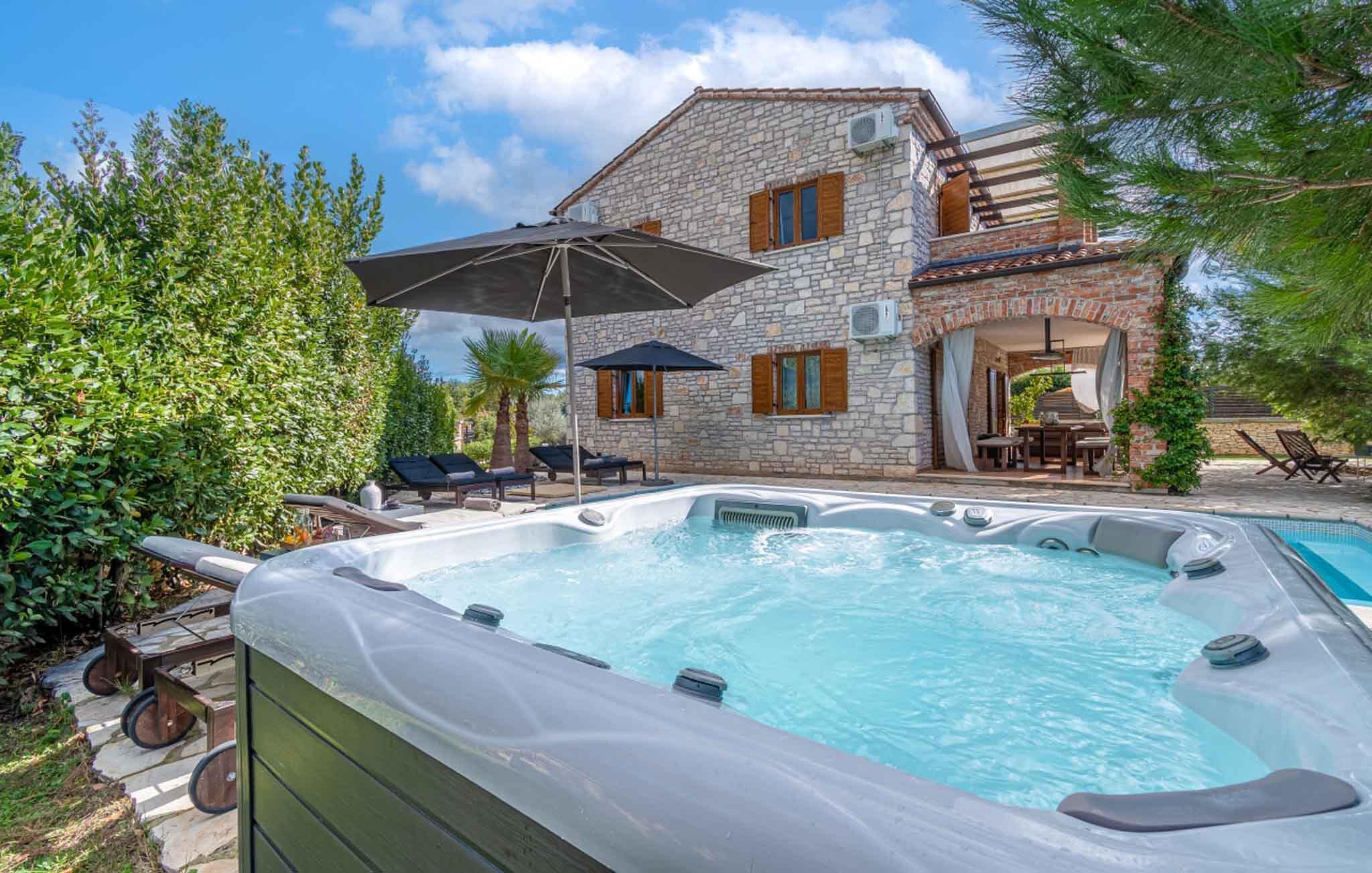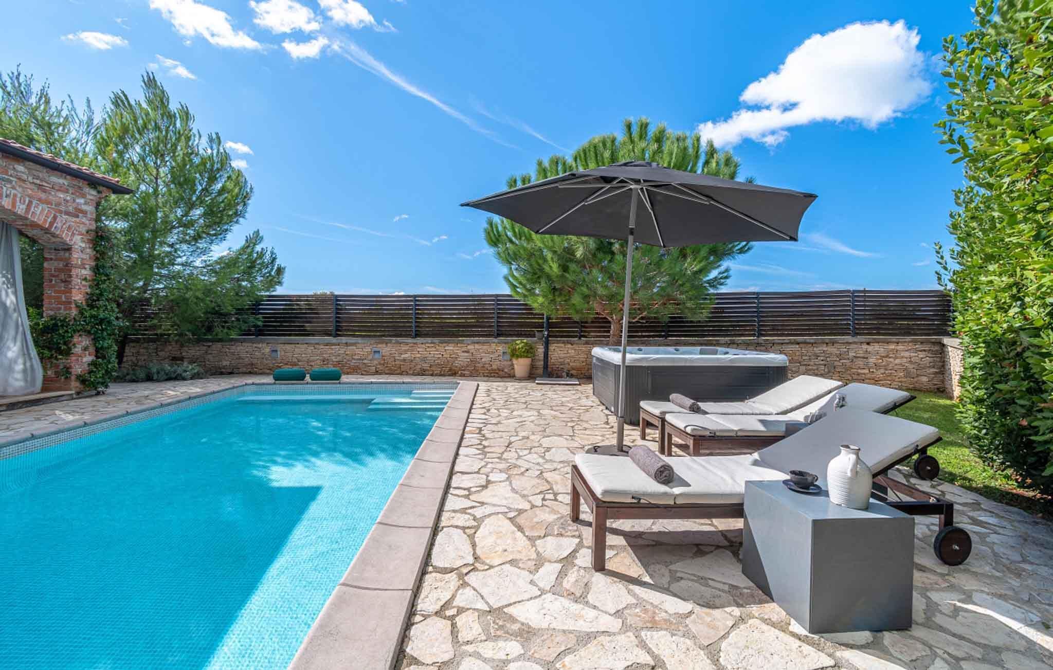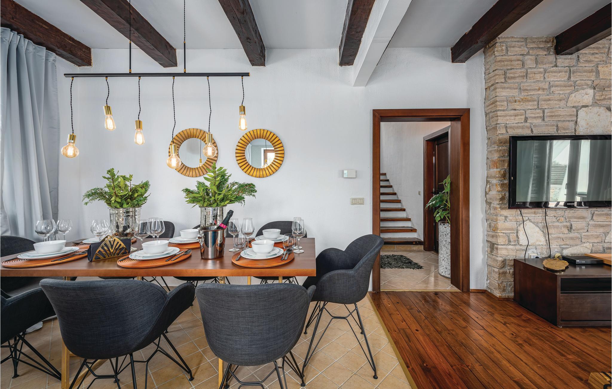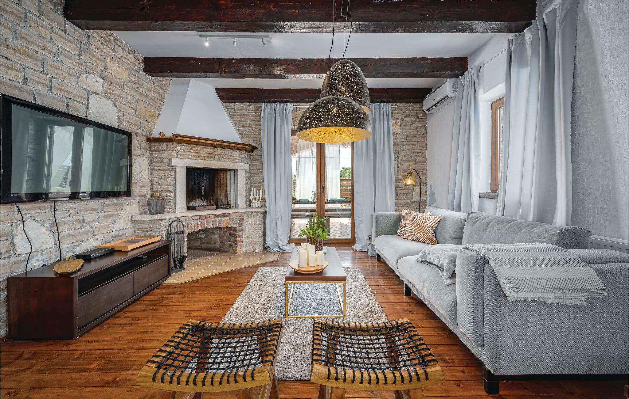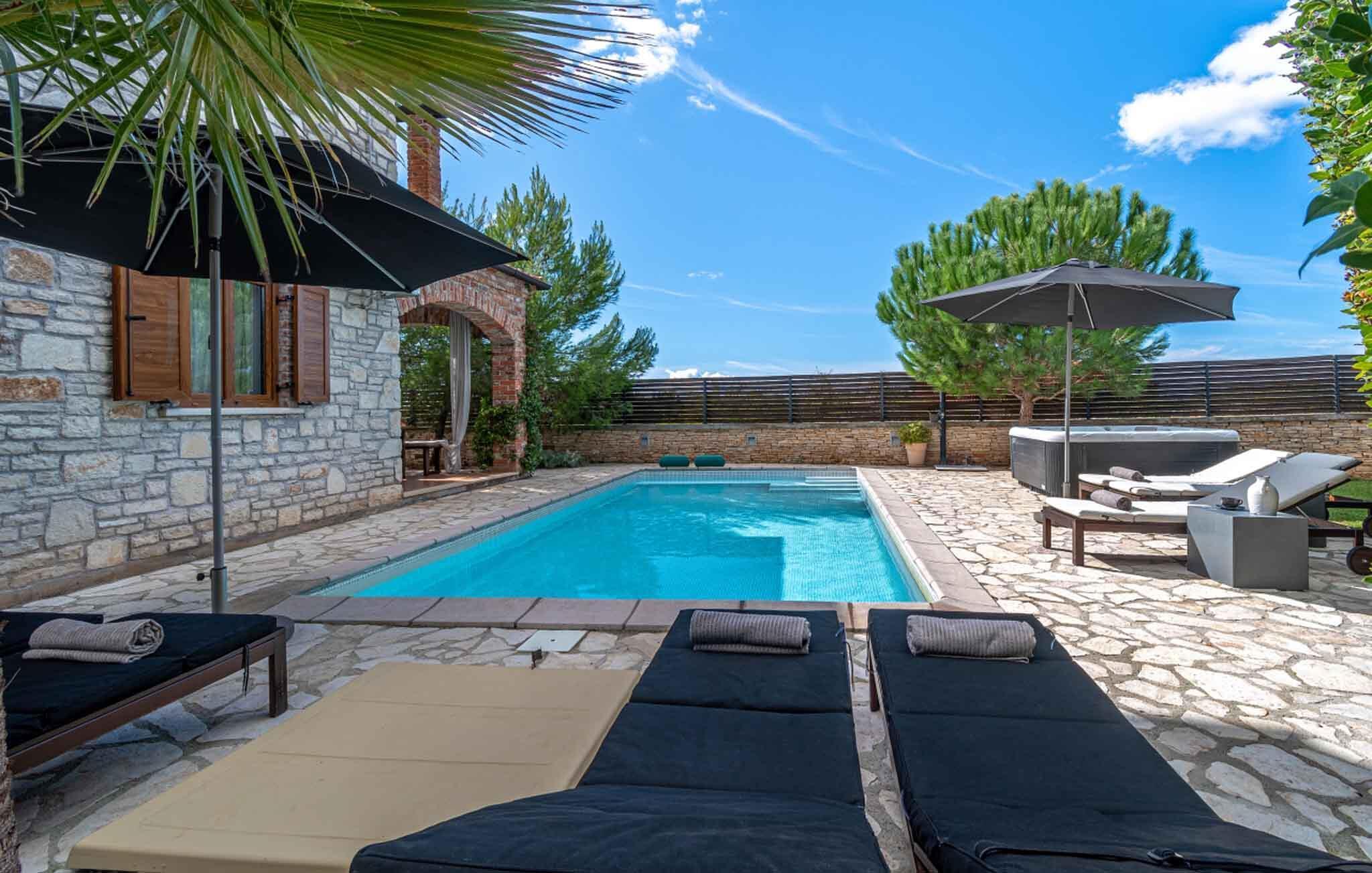 Dette usædvanlige feriehus med privat pool, ligger i en lille by og har en skøn beliggenhed og en komfortable indretning både ude og inde til en afslappet ferie. Huset er indrettet med kærlighed helt ned i de små detaljer og kombinationen af sten og træ, tilføjer huset noget ganske særligt. Poolen med solstole, den indhegnede og velplejede have, samt den dejlige overdækkede veranda med loungeområde og den udendørs grill, sætter prikken over jeres vellykkede deler det krystalklare hav med øerne i Brioni Nationalparken. Tag med på tur til en af disse vidunderlige øer og besøg også den nærliggende by Fažana, hvor der er mange former for underholdning om aftenen og rigtig gode restauranter.
