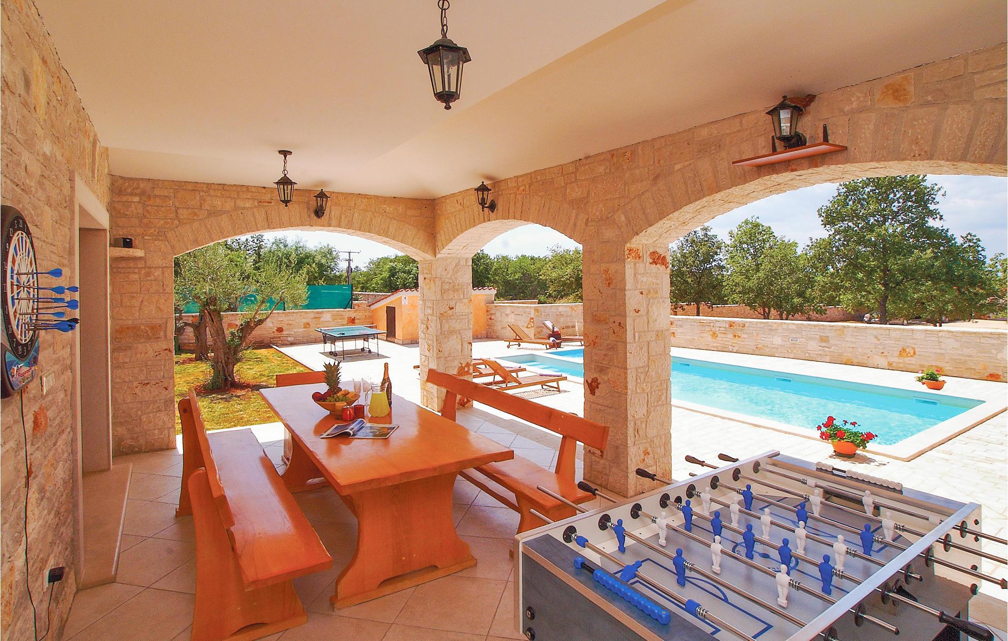 Kun få minutter i bil fra grusstrandene i Brijuni-øhavet ligger dette dejlige feriehus med pool. Med detaljer af sten og træ trylles Istriens autentiske miljø frem. Huset er komplet opvarmet og klimatiseret. Det trådløse internet holder jer underrettede om de sidste nyheder også i ferien. Vidunderligt flyder det indvendige og det udvendige område sammen til en enhed via den dejlige, overdækkede terrasse med adgang til den udendørs pool. Her er der også en whirlpool til 6 personer. Ejerne har anlagt haven godt til små børn, men der er også plads til Badminton eller volleyball. Bygningens stueetage består af en stor spisestue med kamin, spisestue og køkken, badeværelse med hydromassage-badekar til to personer og et soveværelse med eget bad (egen adgang til terrassen). I overetagen ligger tre yderligere soveværelser med deres egne terrasser og badeværelser en suite. Terrassen har havudsigt. I kun 7 km’s afstand når I Vodnjan, hvor I kan finde alle de nødvendige services og produkter.