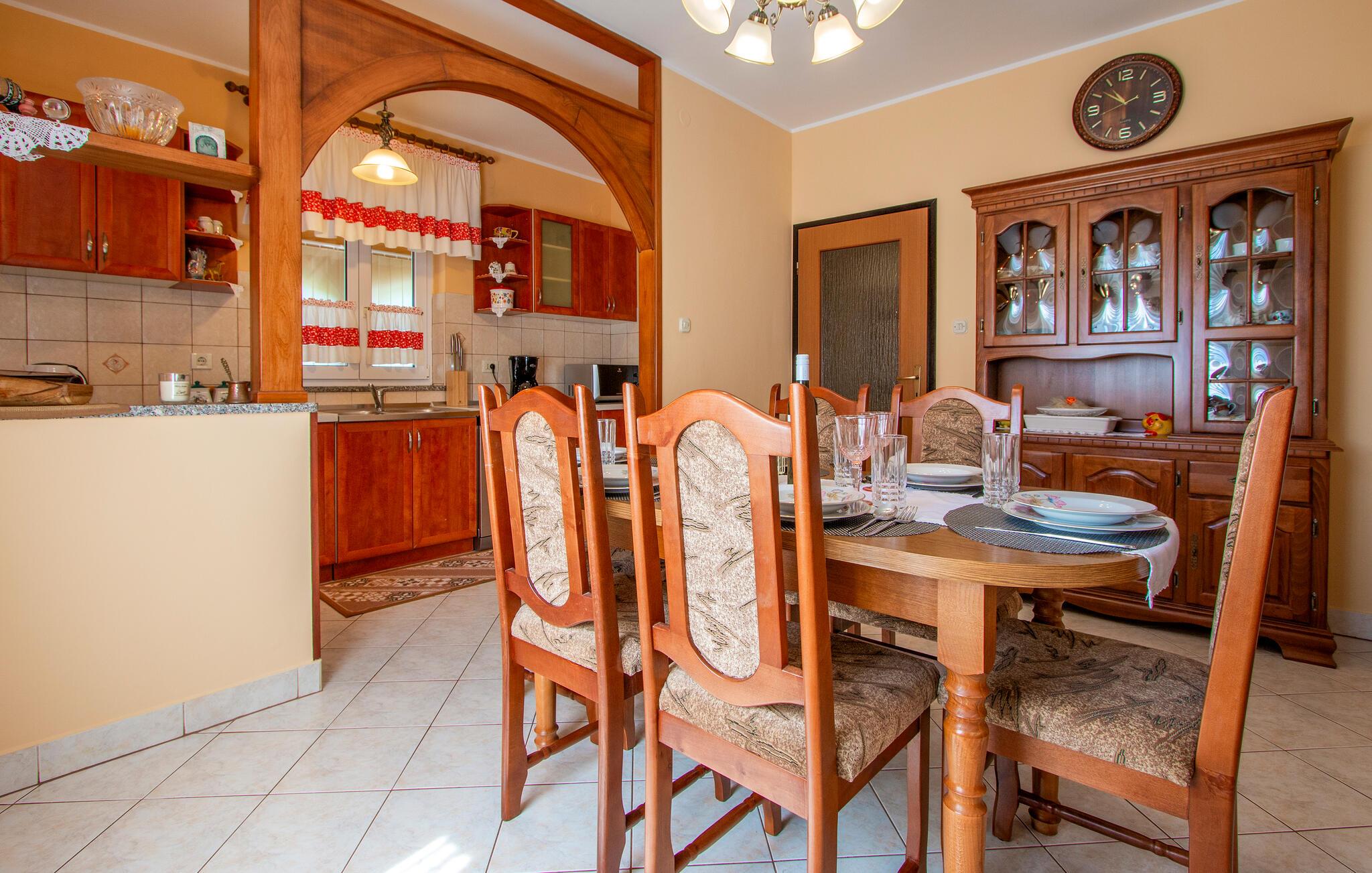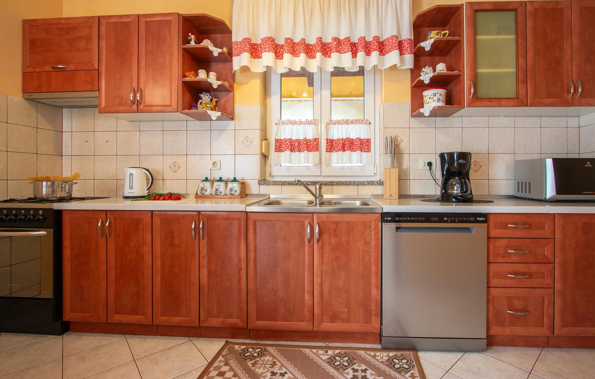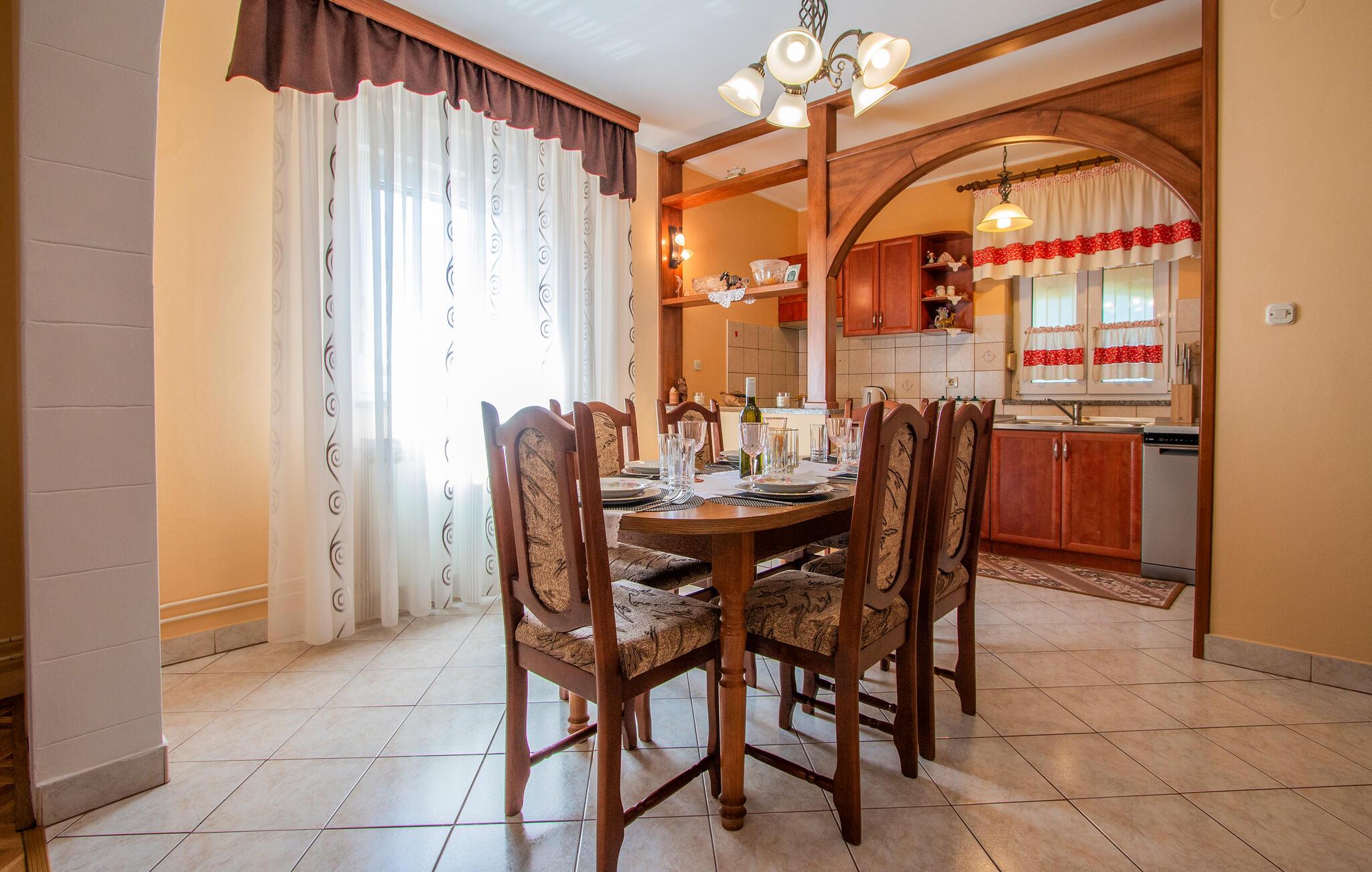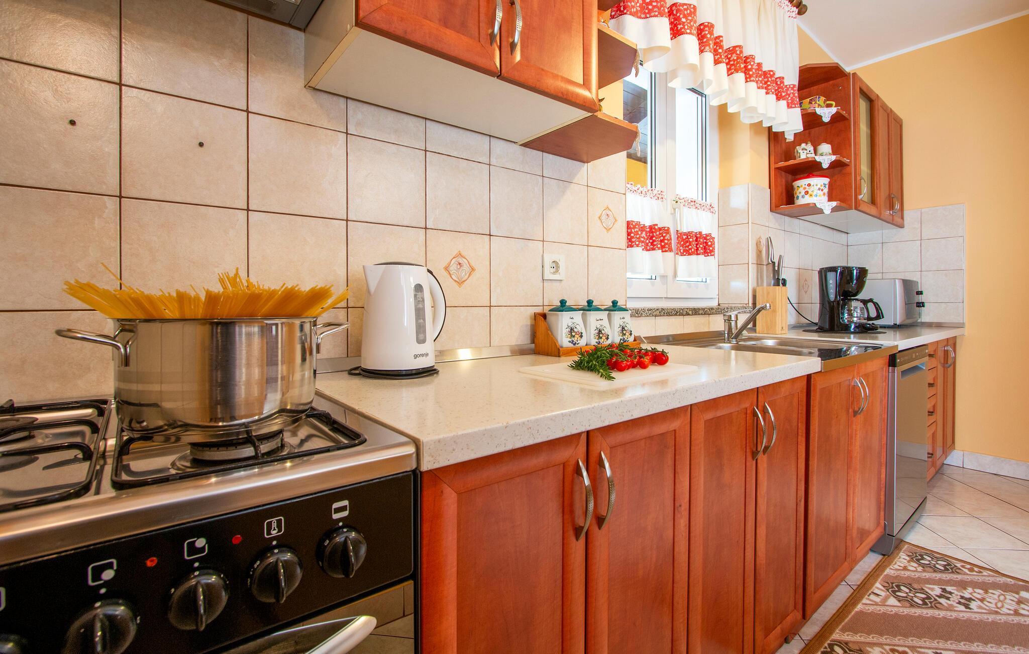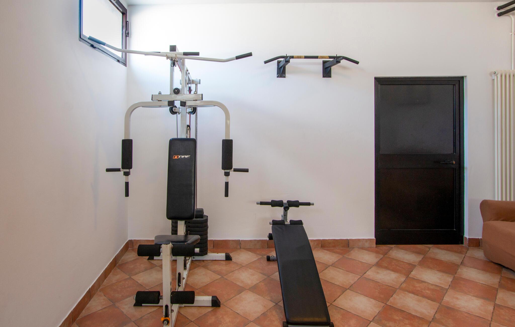 Kom ind og føl jer hjemme i dette rummelige feriehus. Tilbered jeres måltider sammen i det rummelige køkken, træn i fitnessrummet og brug det komfortable sofaområde til sjove spilleaftener og afslappende læsetimer.