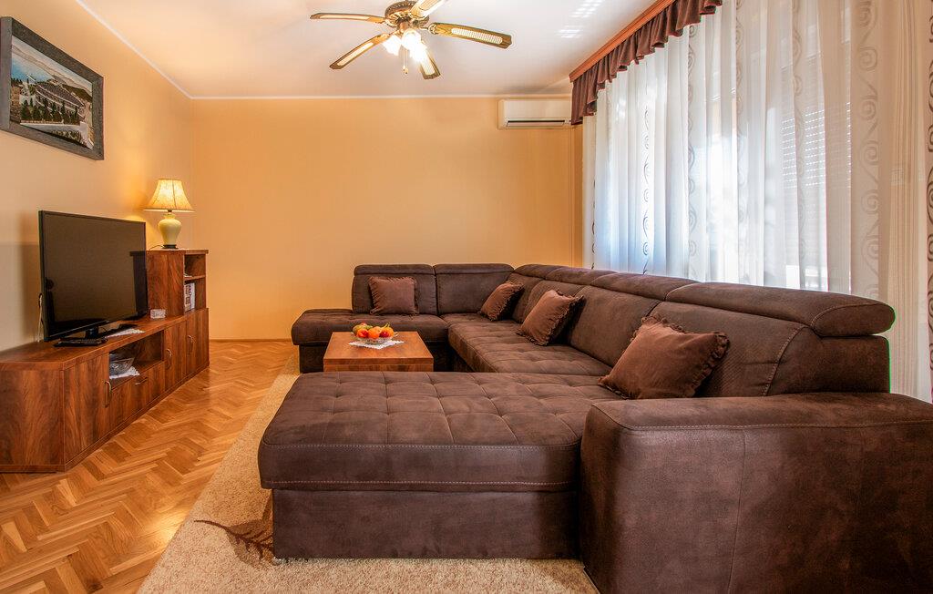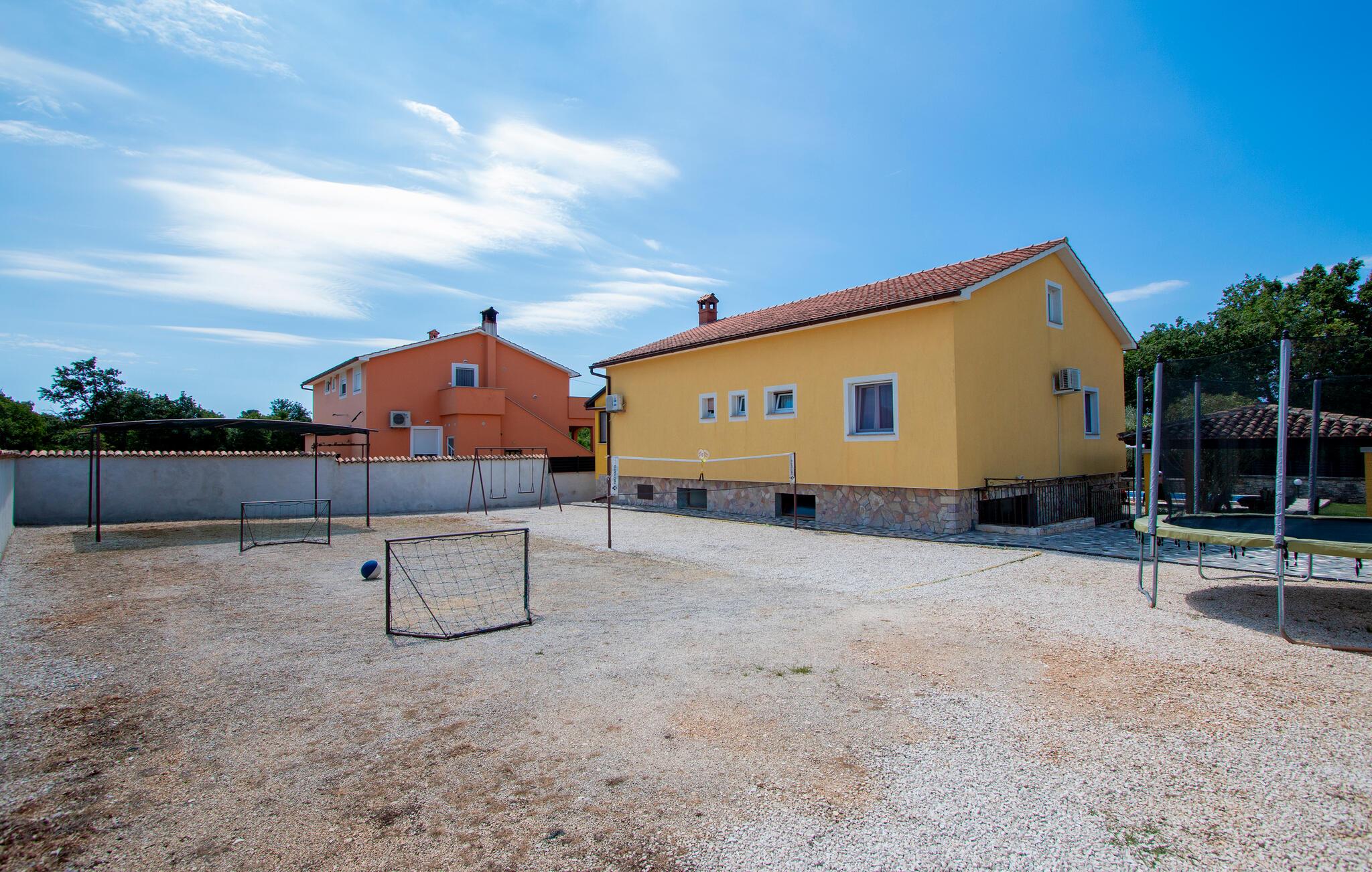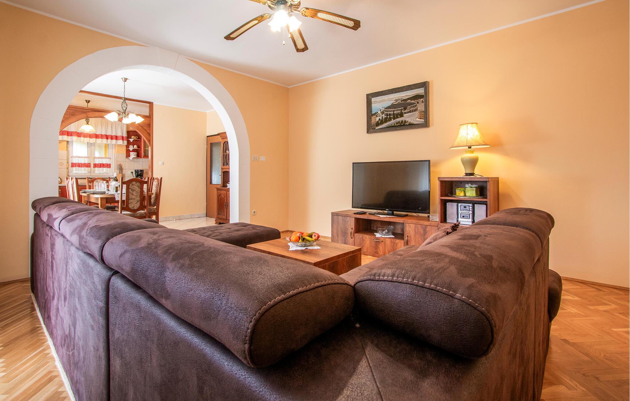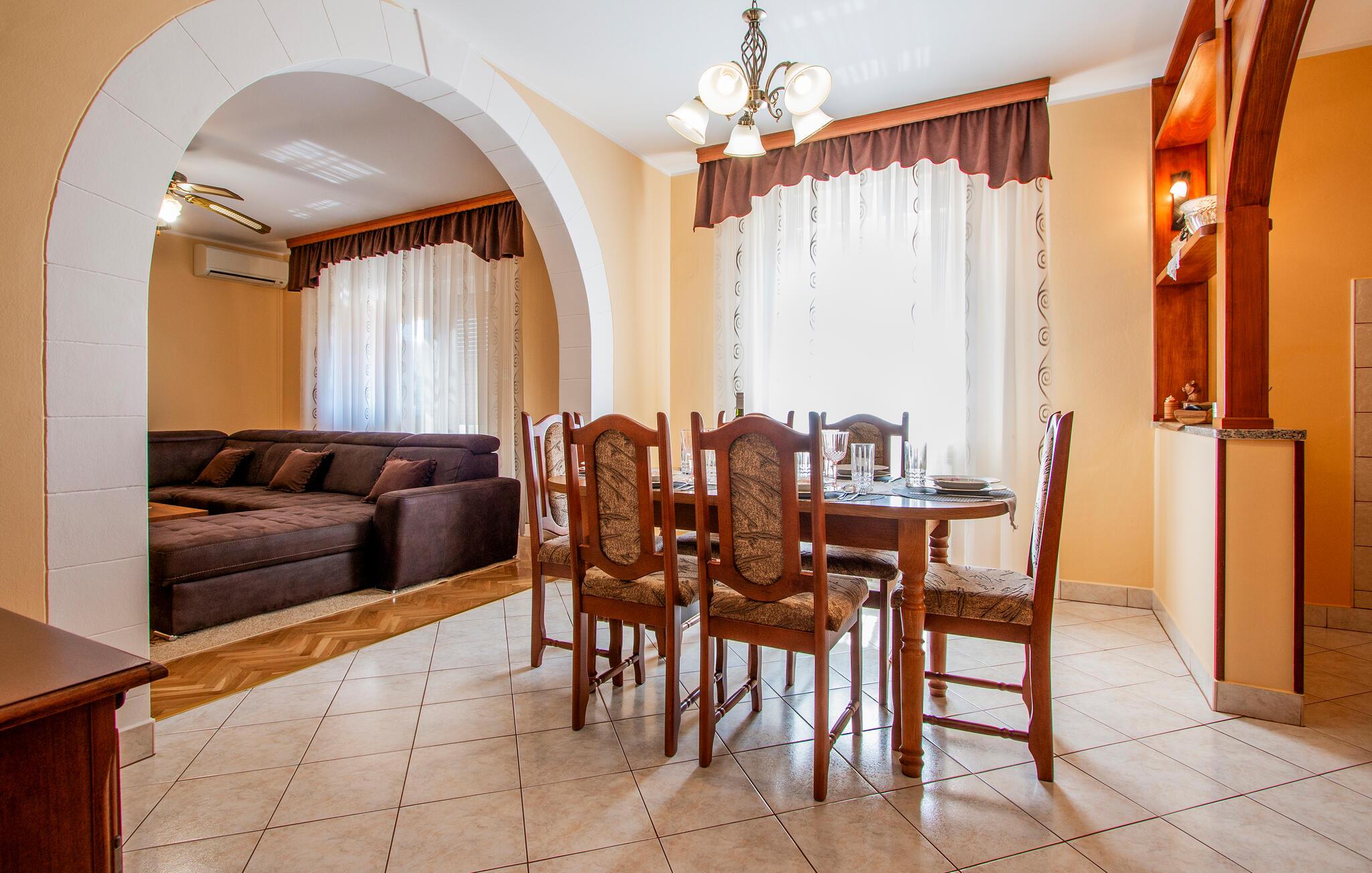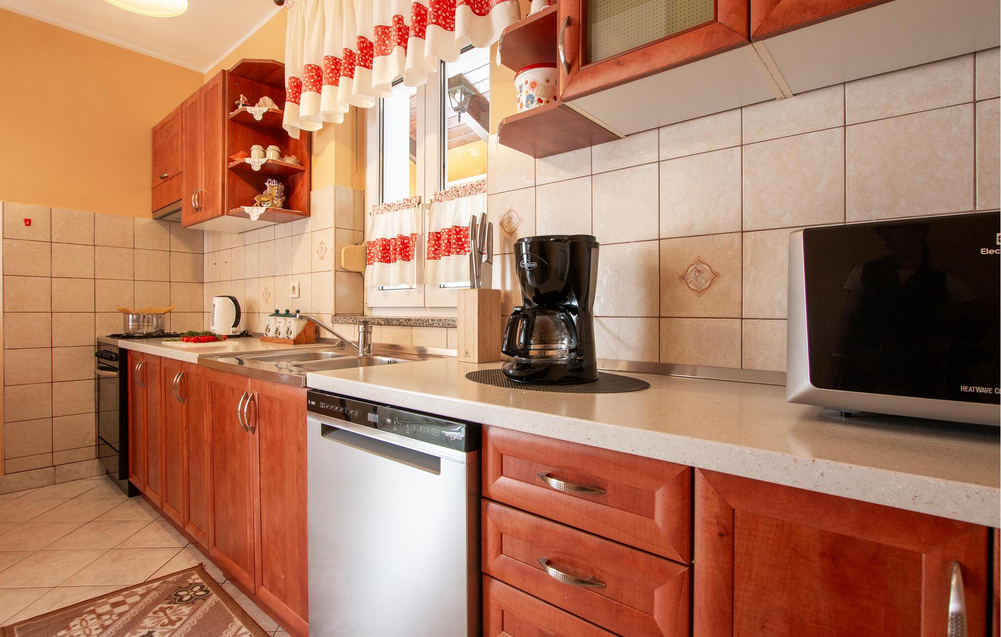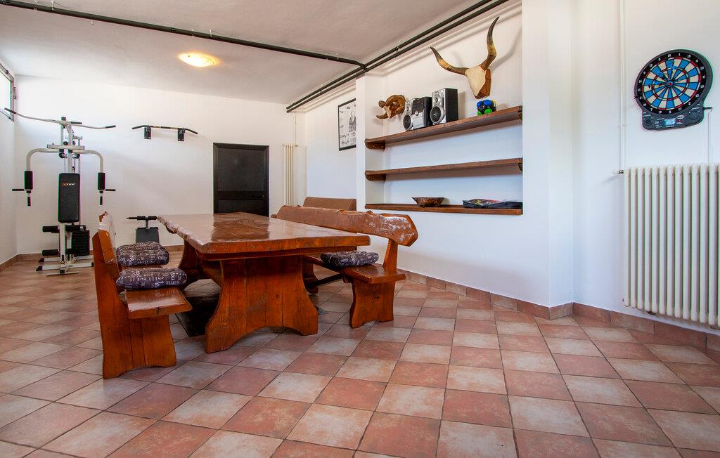 Kom ind og føl jer hjemme i dette rummelige feriehus. Tilbered jeres måltider sammen i det rummelige køkken, træn i fitnessrummet og brug det komfortable sofaområde til sjove spilleaftener og afslappende læsetimer.