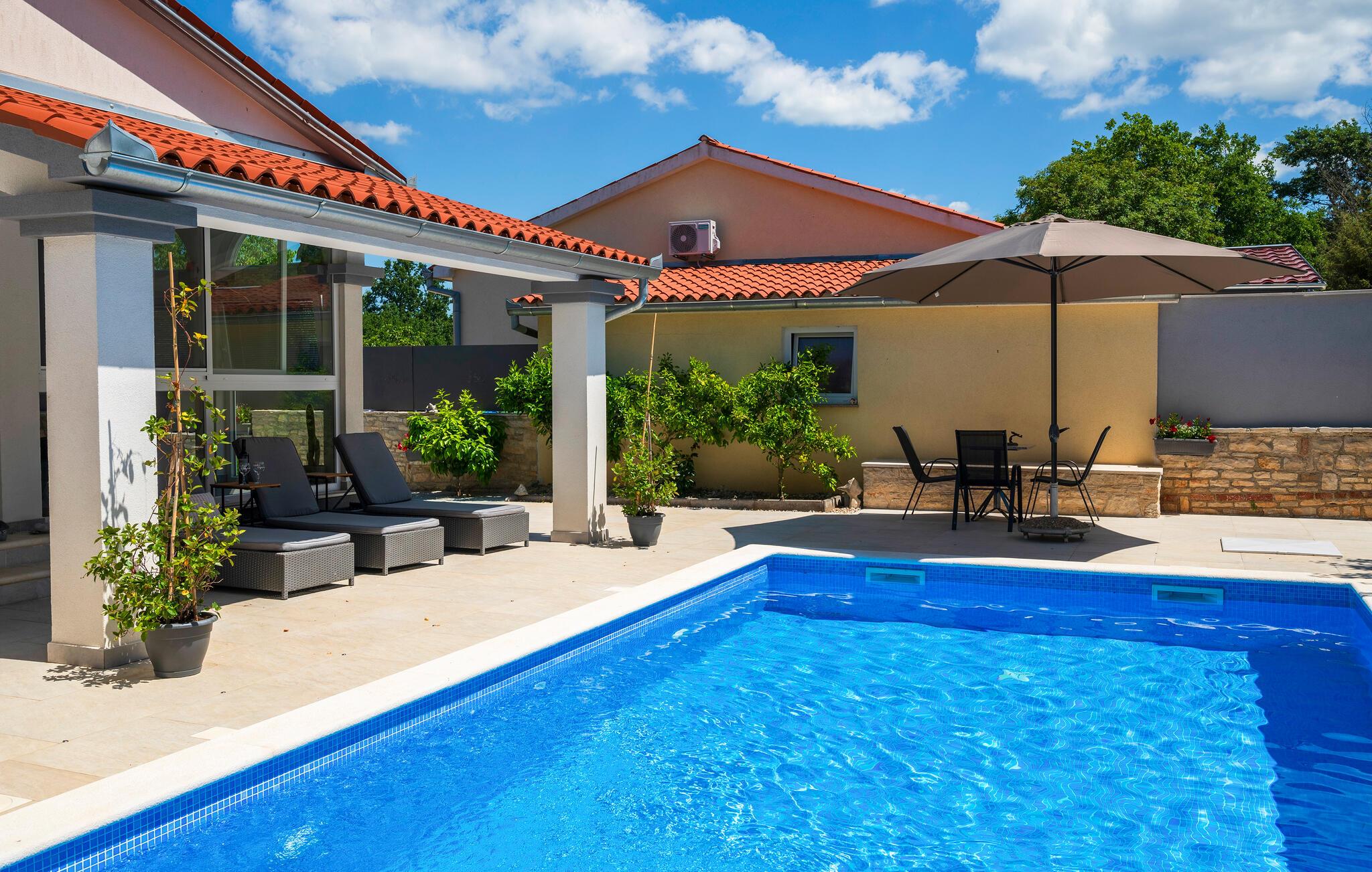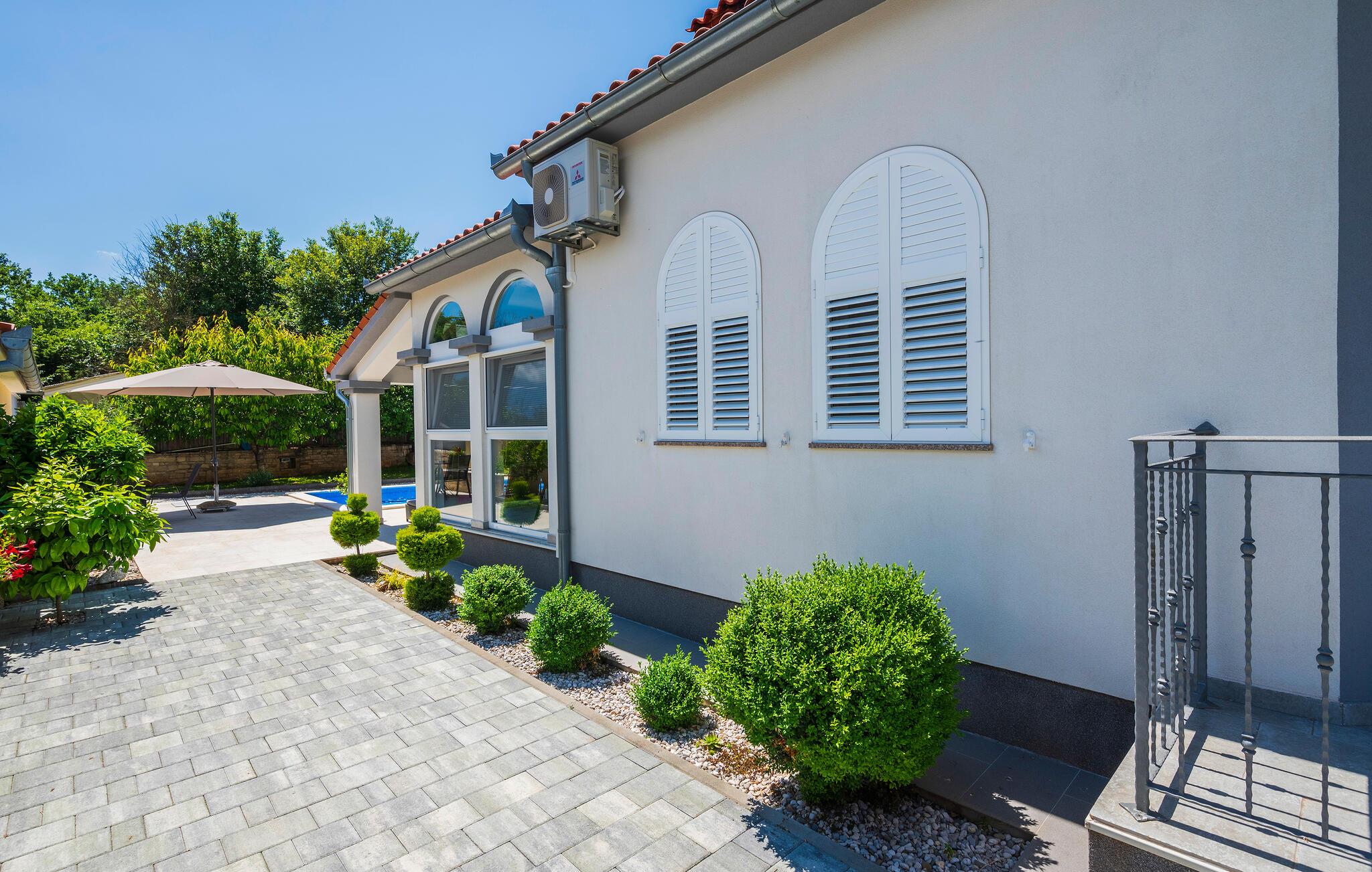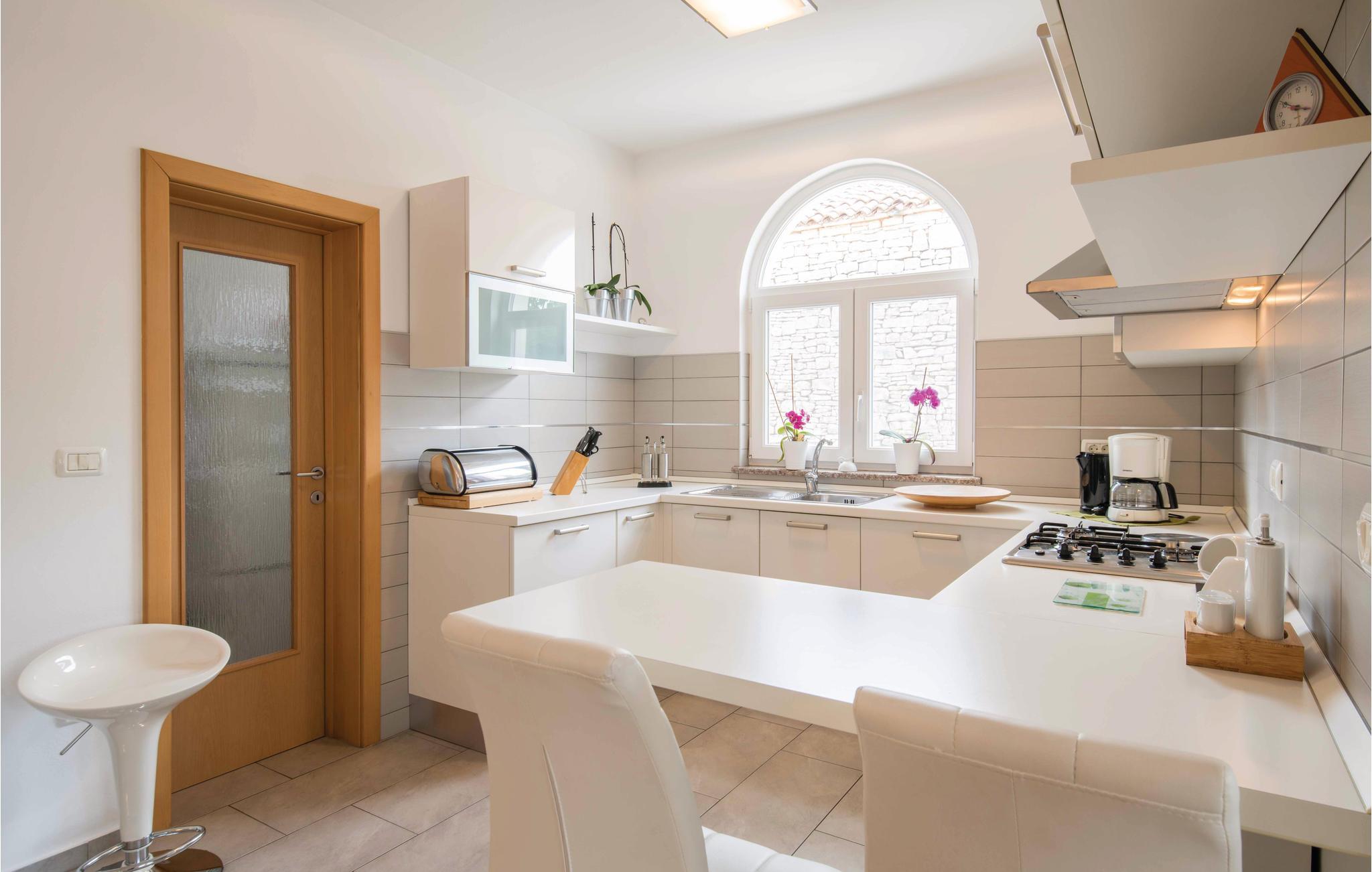 Dette dejlige feriehus vil garanteret leve op til jeres ferieforventninger. Huset ligger i Kacani, i rolige omgivelser og ikke langt fra Vodnjan. I den omgivende natur er der skønne og velduftende planter. Huset er moderne og komfortabelt indrettet. Der er klimaanlæg i stuen. Fra stuen kommer i ud på den store overdækkede terrasse, med grill, havemøbler og udsigt over naturen. Besøg Vodnjan og den antikke by Pula med sine mange underholdende sommerarrangementer.