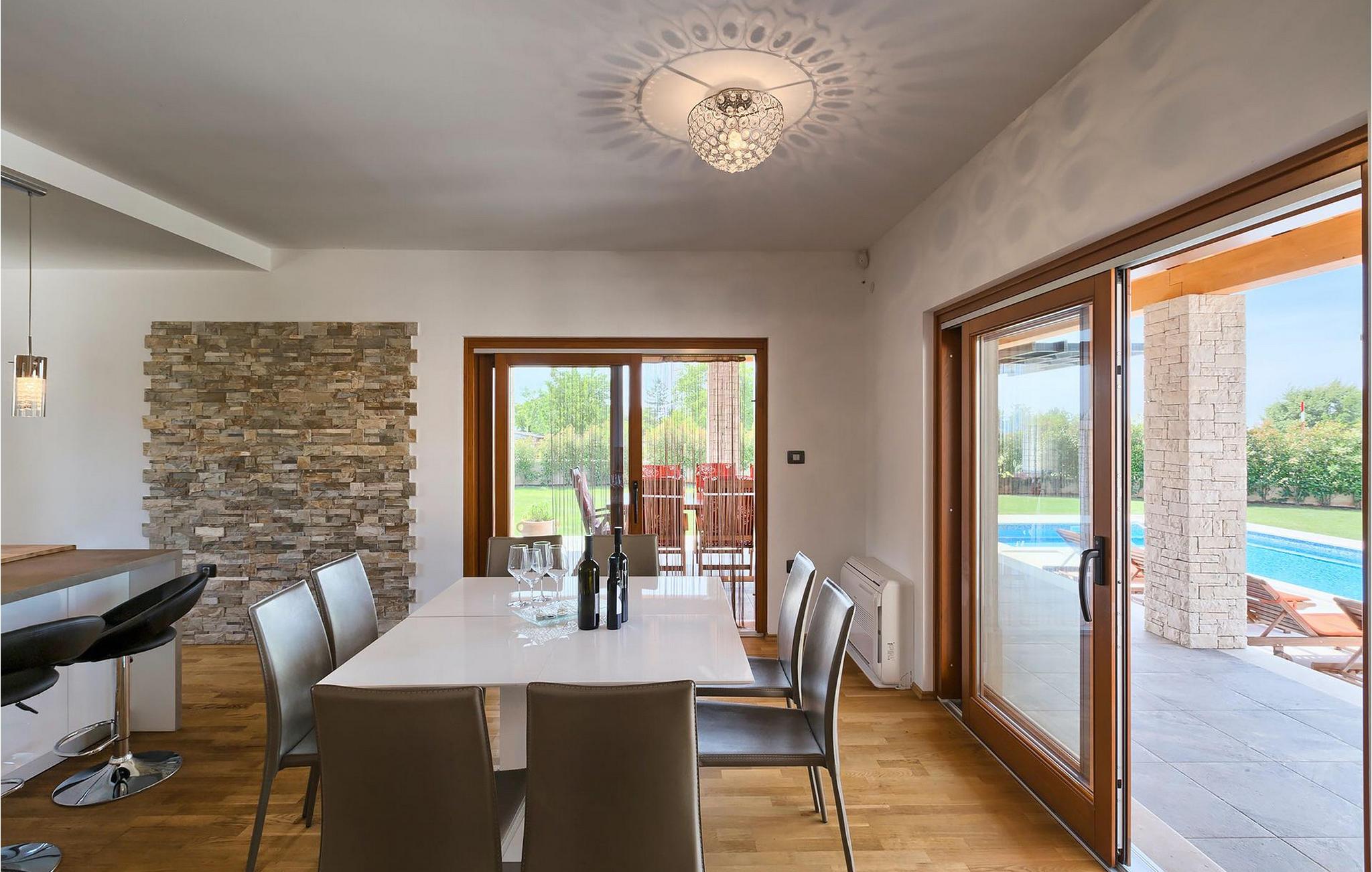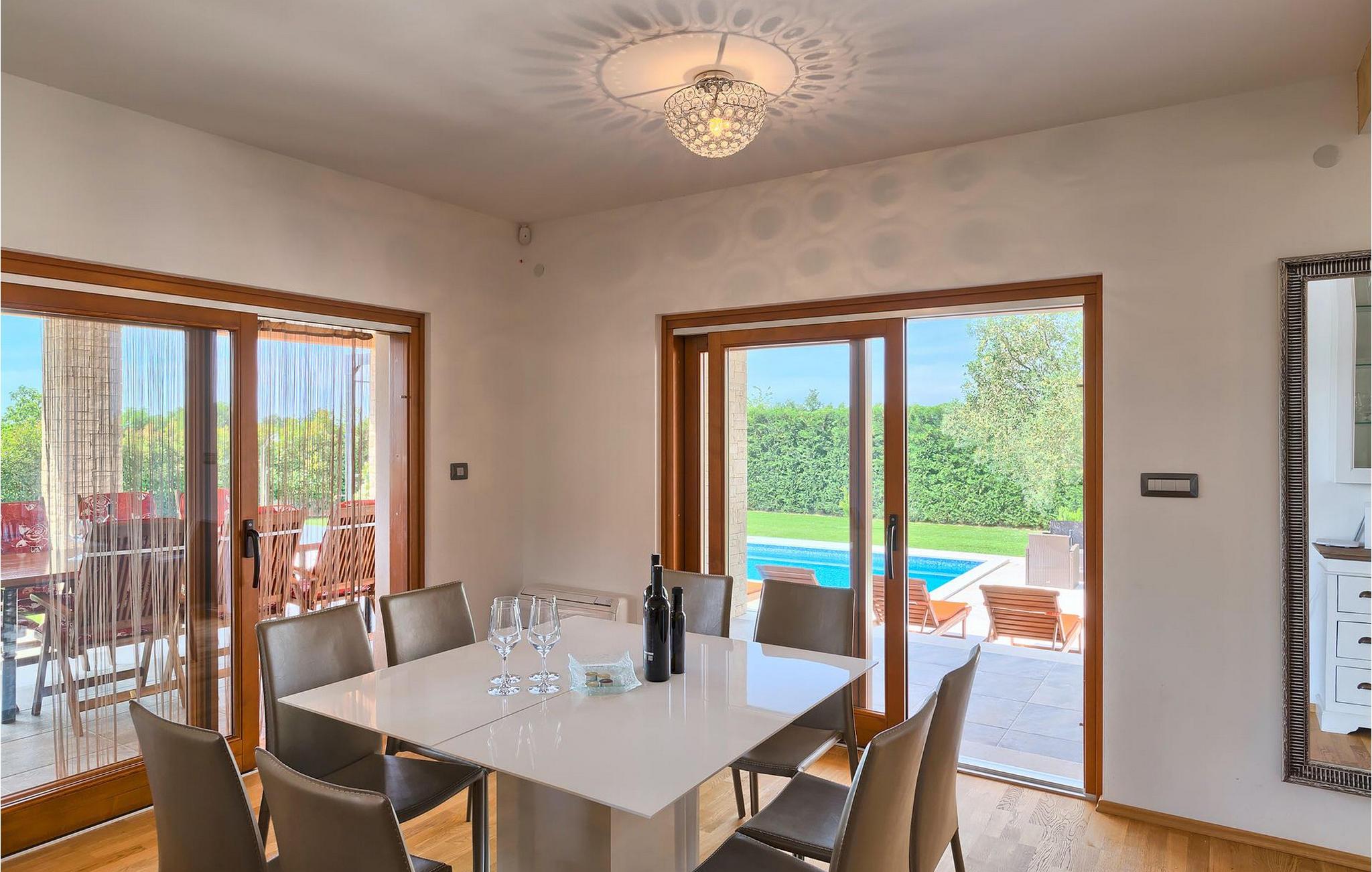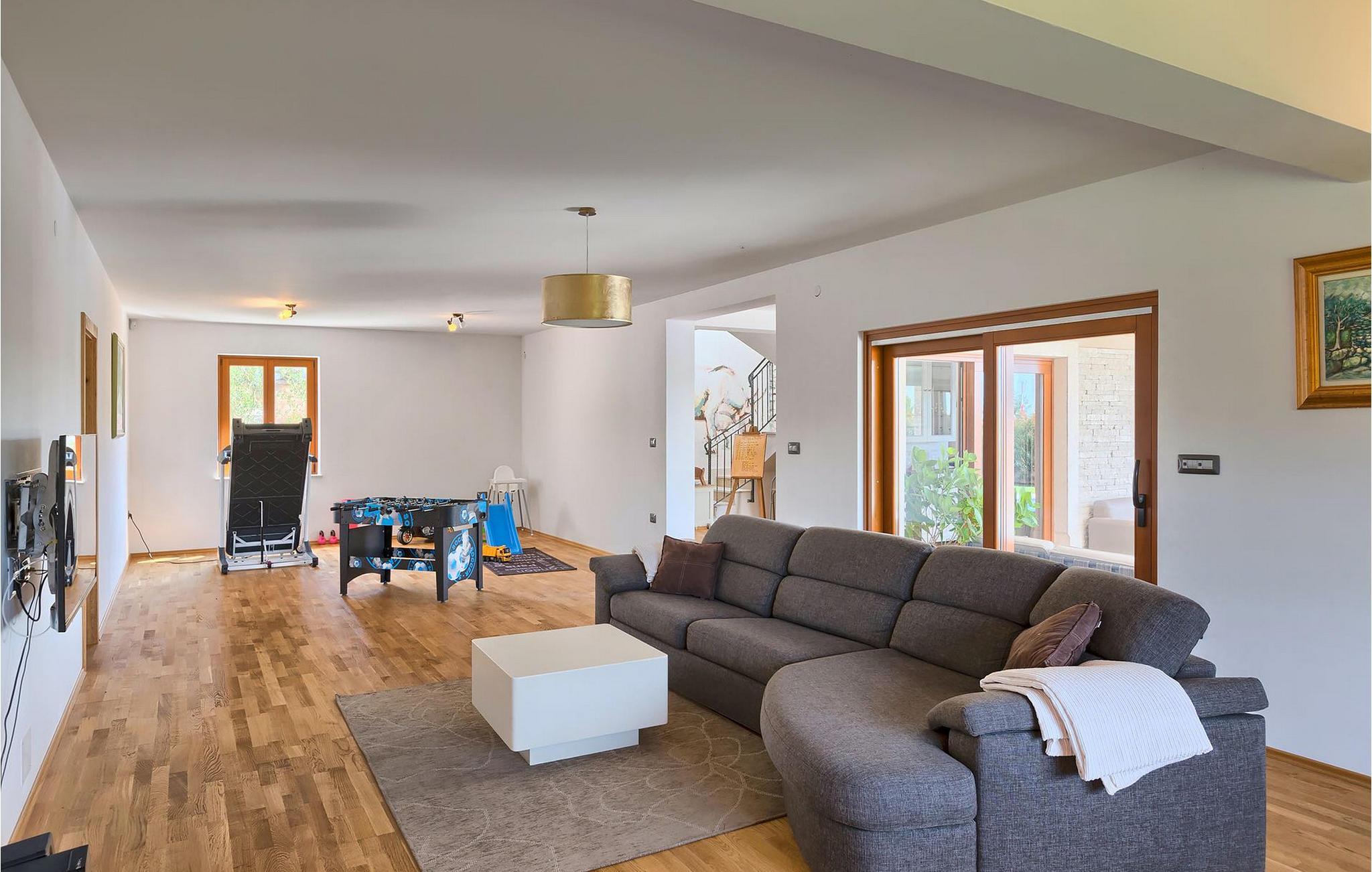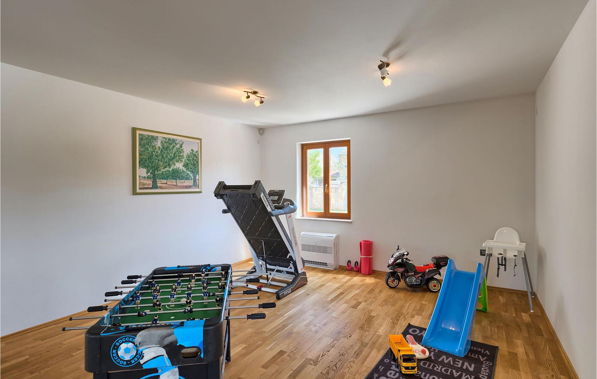 Stueetagen består af et fuldt udstyret køkken og spiseplads med direkte adgang til terrassen og en rummelig stue, der er forbundet med et legerum, hvor du kan nyde at spille bordfodbold eller bruge løbebåndet og fitnesscyklen. Den øverste etage er hvor soveværelserne er. Tre soveværelser, hver har en dobbeltseng og eget badeværelse og hver er indrettet i sin egen specielle stil. På øverste etage finder du desuden en skøn terrasse, hvor du kan nyde din morgenkaffe med en vidunderlig udsigt. Villaens have er rummelig og gør det muligt at have det sjovt udendørs. Bortset fra den private pool er der også en lille legeplads for børn med gynge og trampolin, samt en spiseplads, hvor du kan nyde et frisklavet måltid i udekøkkenet eller på grillen. Der er også et vinkøleskab til din rådighed til særlige priser. Villa Salambati er det perfekte valg til en afslappende ferie med familie eller venner.Salambati er en lille landsby beliggende i det centrale Istrien, nær Svetvincenat. Denne lille by, såvel som mange andre lignende byer over hele det centrale Istrien, er ægte små kulturelle og gastronomiske skatte, absolut værd at udforske. Denne del af Kroatien er også berømt for forskellige cykelstier. Men hvis du vil nyde strandene langs den istriske kyst, er det nødvendigt med en cirka 20 km lang tur for at nå klippe- eller sandstrande, hvis du vil udforske øst- eller vestkysten. Lidt mindre end 30 km adskiller dig fra den fantastiske by Rovinj og lidt mere end 30 km fra den historiske by Pula. Benyt også lejligheden og besøg Lim, bugten med en beskyttet landskabsstatus.
