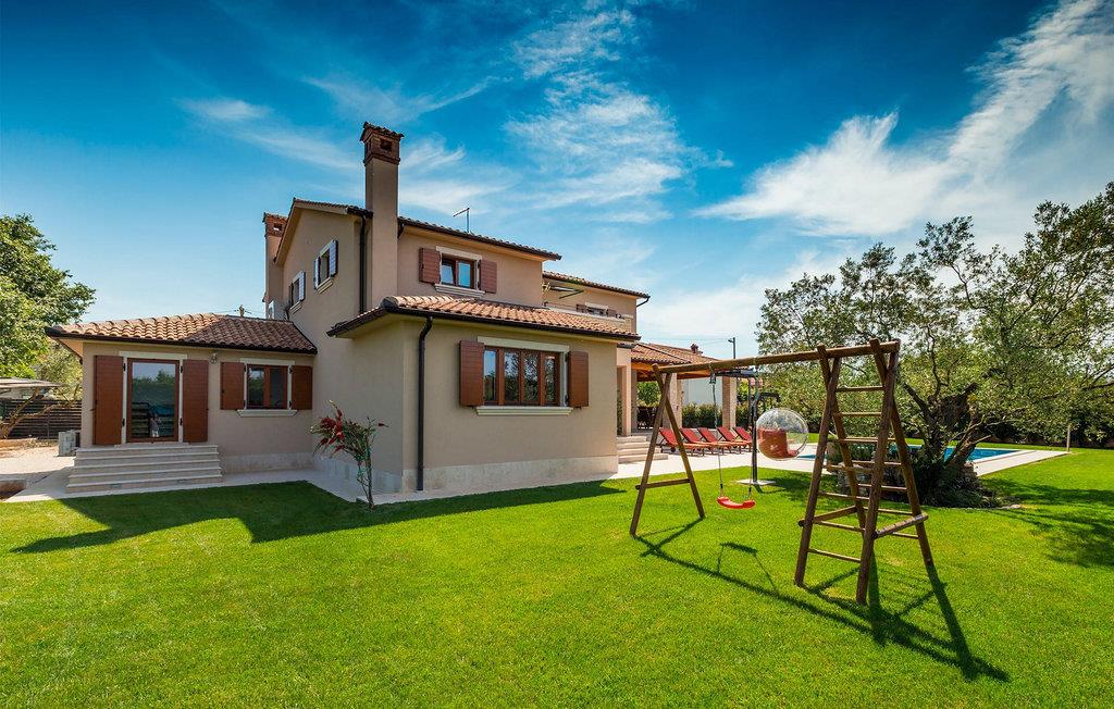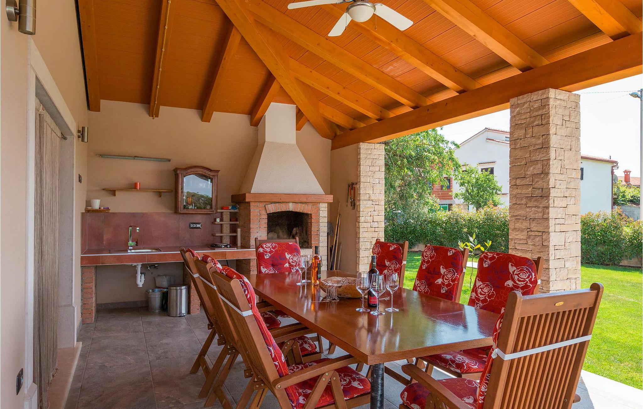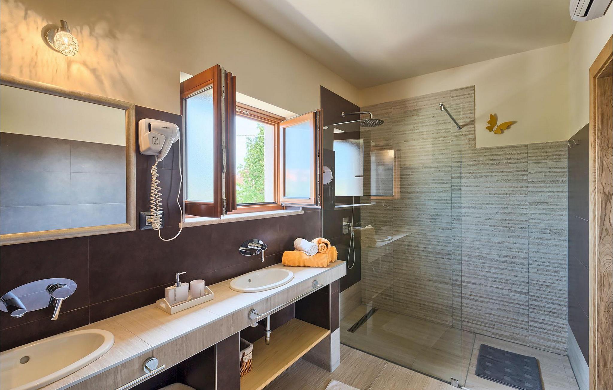 Stueetagen består af et fuldt udstyret køkken og spiseplads med direkte adgang til terrassen og en rummelig stue, der er forbundet med et legerum, hvor du kan nyde at spille bordfodbold eller bruge løbebåndet og fitnesscyklen. Den øverste etage er hvor soveværelserne er. Tre soveværelser, hver har en dobbeltseng og eget badeværelse og hver er indrettet i sin egen specielle stil. På øverste etage finder du desuden en skøn terrasse, hvor du kan nyde din morgenkaffe med en vidunderlig udsigt. Villaens have er rummelig og gør det muligt at have det sjovt udendørs. Bortset fra den private pool er der også en lille legeplads for børn med gynge og trampolin, samt en spiseplads, hvor du kan nyde et frisklavet måltid i udekøkkenet eller på grillen. Der er også et vinkøleskab til din rådighed til særlige priser. Villa Salambati er det perfekte valg til en afslappende ferie med familie eller venner.Salambati er en lille landsby beliggende i det centrale Istrien, nær Svetvincenat. Denne lille by, såvel som mange andre lignende byer over hele det centrale Istrien, er ægte små kulturelle og gastronomiske skatte, absolut værd at udforske. Denne del af Kroatien er også berømt for forskellige cykelstier. Men hvis du vil nyde strandene langs den istriske kyst, er det nødvendigt med en cirka 20 km lang tur for at nå klippe- eller sandstrande, hvis du vil udforske øst- eller vestkysten. Lidt mindre end 30 km adskiller dig fra den fantastiske by Rovinj og lidt mere end 30 km fra den historiske by Pula. Benyt også lejligheden og besøg Lim, bugten med en beskyttet landskabsstatus.