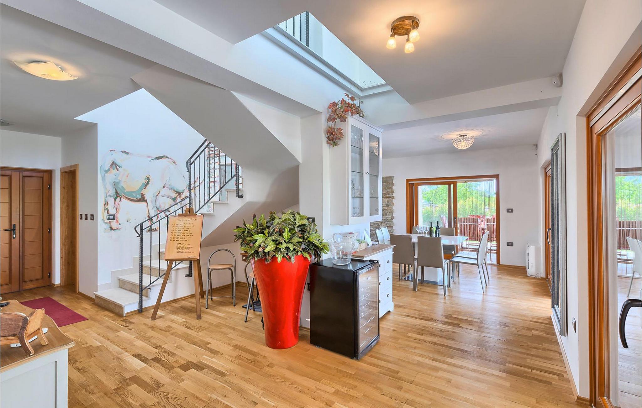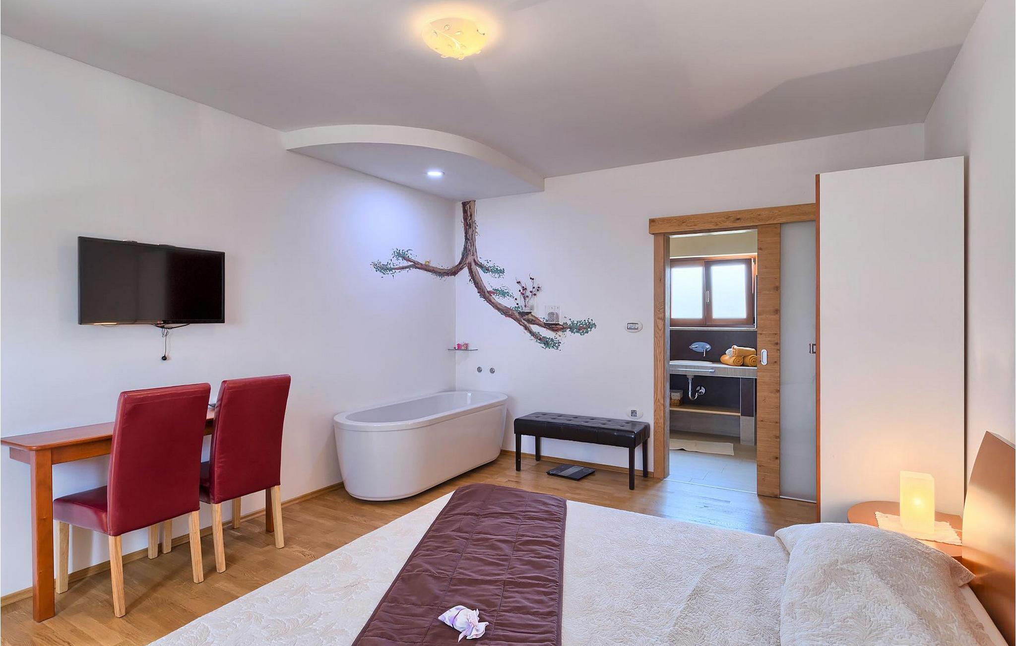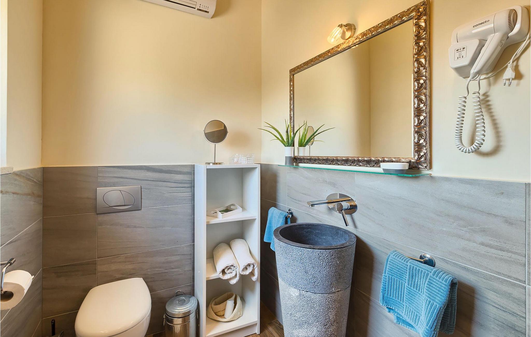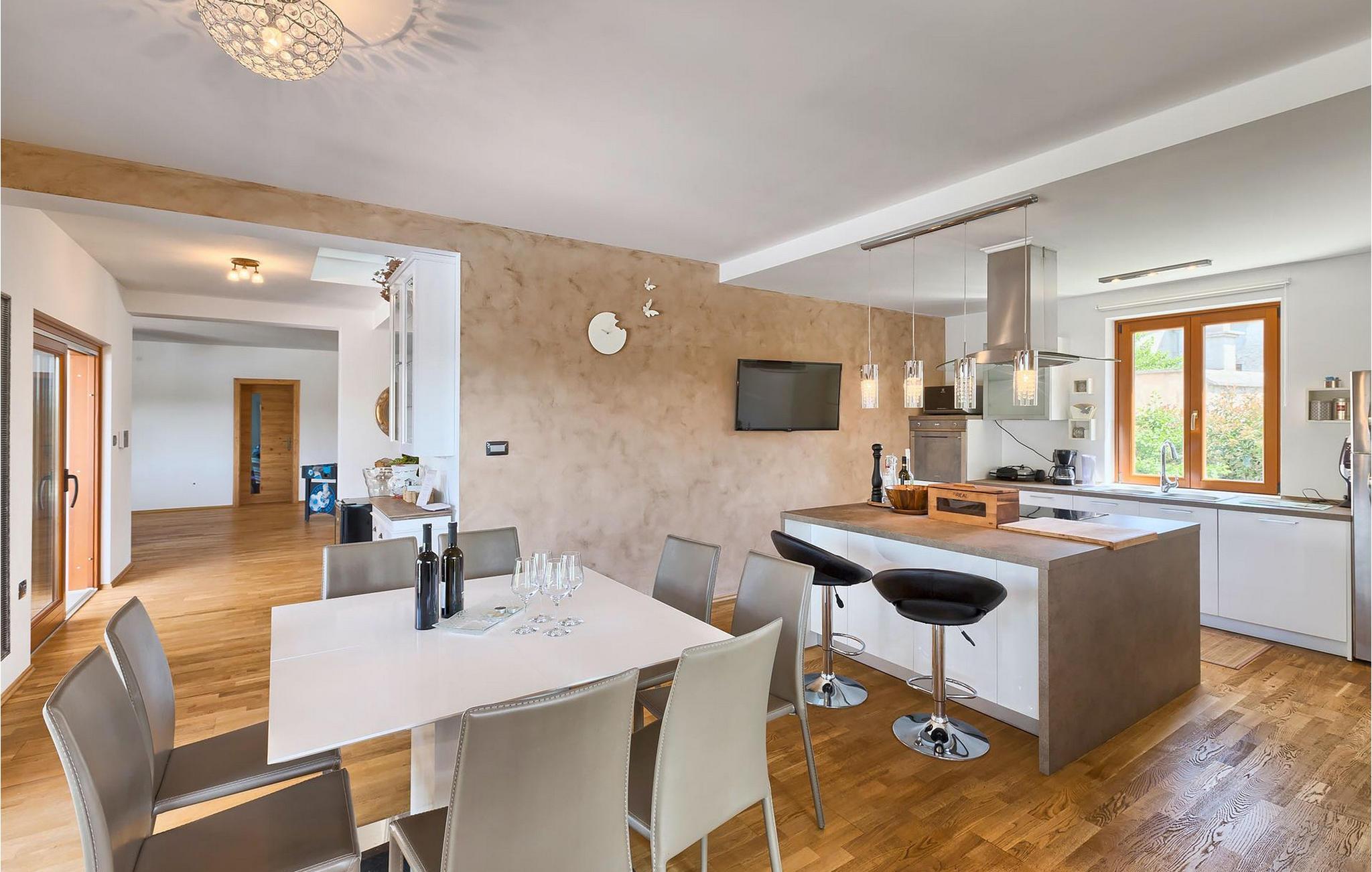 Stueetagen består af et fuldt udstyret køkken og spiseplads med direkte adgang til terrassen og en rummelig stue, der er forbundet med et legerum, hvor du kan nyde at spille bordfodbold eller bruge løbebåndet og fitnesscyklen. Den øverste etage er hvor soveværelserne er. Tre soveværelser, hver har en dobbeltseng og eget badeværelse og hver er indrettet i sin egen specielle stil. På øverste etage finder du desuden en skøn terrasse, hvor du kan nyde din morgenkaffe med en vidunderlig udsigt. Villaens have er rummelig og gør det muligt at have det sjovt udendørs. Bortset fra den private pool er der også en lille legeplads for børn med gynge og trampolin, samt en spiseplads, hvor du kan nyde et frisklavet måltid i udekøkkenet eller på grillen. Der er også et vinkøleskab til din rådighed til særlige priser. Villa Salambati er det perfekte valg til en afslappende ferie med familie eller venner.Salambati er en lille landsby beliggende i det centrale Istrien, nær Svetvincenat. Denne lille by, såvel som mange andre lignende byer over hele det centrale Istrien, er ægte små kulturelle og gastronomiske skatte, absolut værd at udforske. Denne del af Kroatien er også berømt for forskellige cykelstier. Men hvis du vil nyde strandene langs den istriske kyst, er det nødvendigt med en cirka 20 km lang tur for at nå klippe- eller sandstrande, hvis du vil udforske øst- eller vestkysten. Lidt mindre end 30 km adskiller dig fra den fantastiske by Rovinj og lidt mere end 30 km fra den historiske by Pula. Benyt også lejligheden og besøg Lim, bugten med en beskyttet landskabsstatus.
