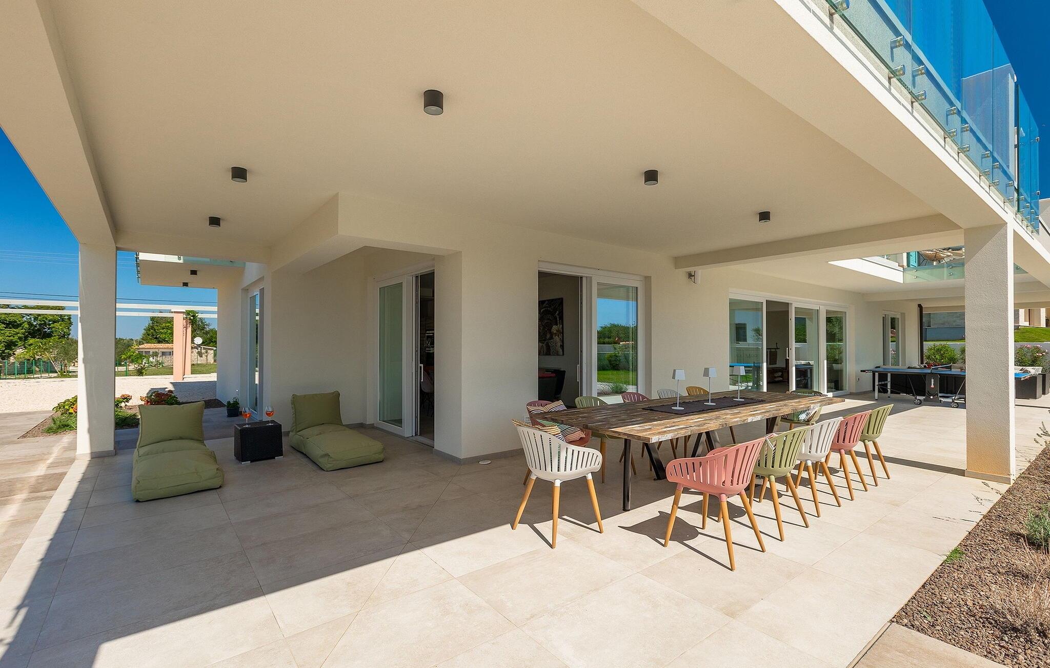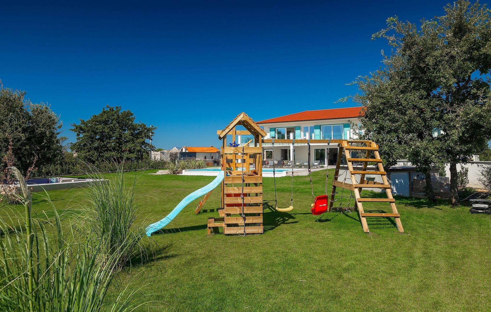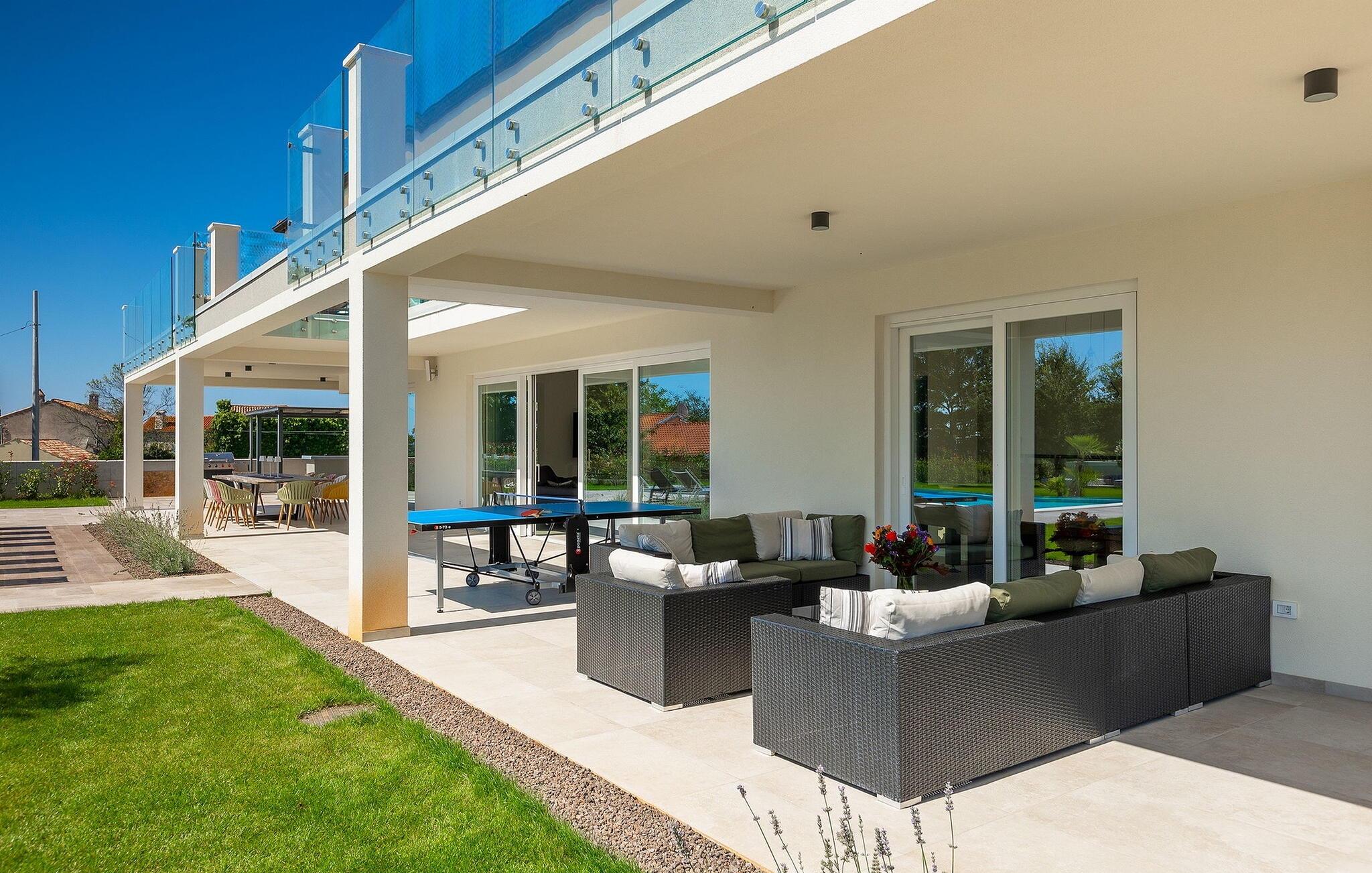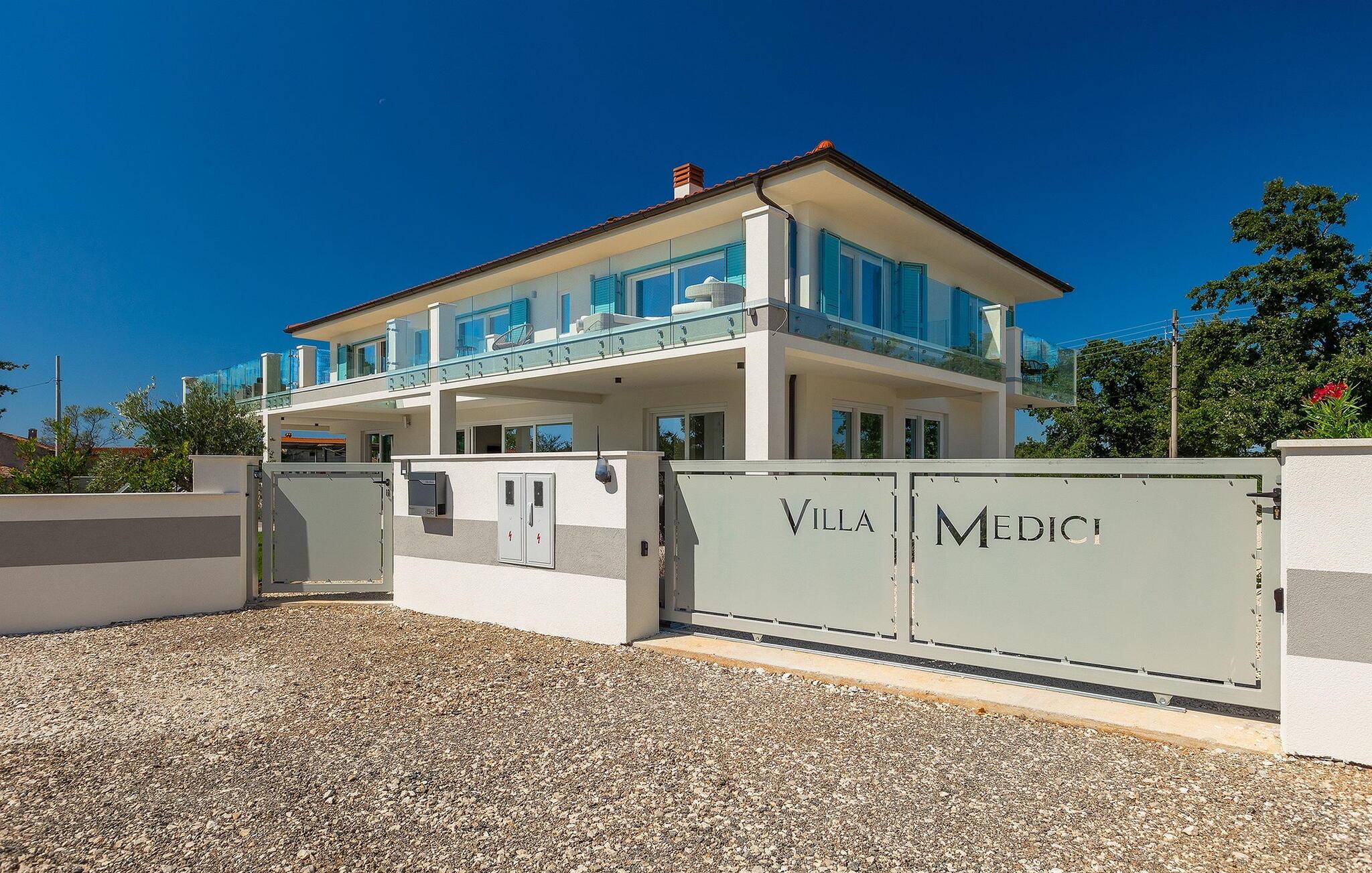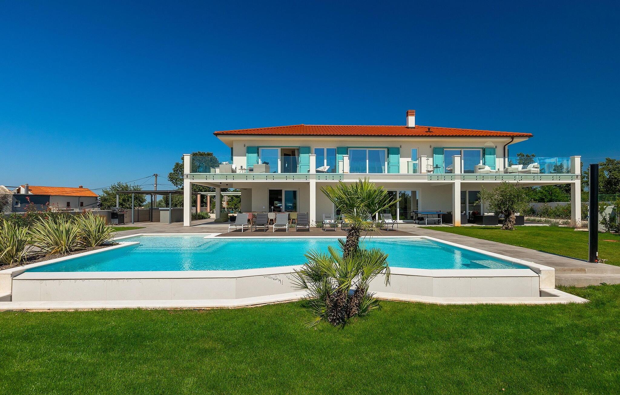 Villa Medici er en fantastisk luksusvilla med privat pool nær byen Pula. Ejendommen er det ideelle tilflugtssted for en større gruppe på 12+2 gæster i alt på 2 etager, 6 soveværelser, 6 badeværelser og et fantastisk udendørsområde. Der er mange højdepunkter udenfor, såsom den 65 m² opvarmede og private pool, hvor masser af sjov kan finde sted under dit ophold. Børnene vil helt sikkert nyde at tilbringe hele dagen i poolen, og forældrene kan have ro i sindet, da poolen har en dybde på 40 til 140 cm, hvilket gør den perfekt til alle aldre. Nyd andre fantastiske funktioner såsom lounge og pejs, solterrasse, et udendørs køkken, en hel legeplads for børn, bordtennis, volleyball og meget mere. Tilbered lækre og traditionelle kroatiske retter på gasgrillen og nyd dejlige familieaftener med dine kære i den overdækkede udendørs spiseplads. Villaens indretning vil også glæde dig - på de to etager kan du se et moderne og nøje udvalgt design med masser af træ og grå detaljer samt mange farverige billeder og statuer, der fremhæver villaens lysstyrke. Stueetagen af ??villaen har en rummelig opholds- og spisestue med masser af naturligt lys, et fuldt udstyret køkken, et dejligt bibliotek med en bogsamling og et fodboldbord, et separat toilet og et soveværelse med dobbeltseng og eget badeværelse med et brusebad. Hvis du tager trappen til det øverste niveau, vil du finde yderligere 5 soveværelser og deres badeværelser. Alle værelser i Villa Medici har aircondition, alle har SAT TV og enten udgang til stueetagens terrasse eller udgang til altanerne, hvor du kan nyde den smukke udsigt fra havemøblerne. Villa Medici tilbyder også sine gæster fuldt klimatiseret indkvartering, en stærk WiFi-forbindelse og en ladestation til elbiler. Book Villa Medici og tilbring en uforglemmelig ferie i en luksusejendom i hjertet af Istrien.