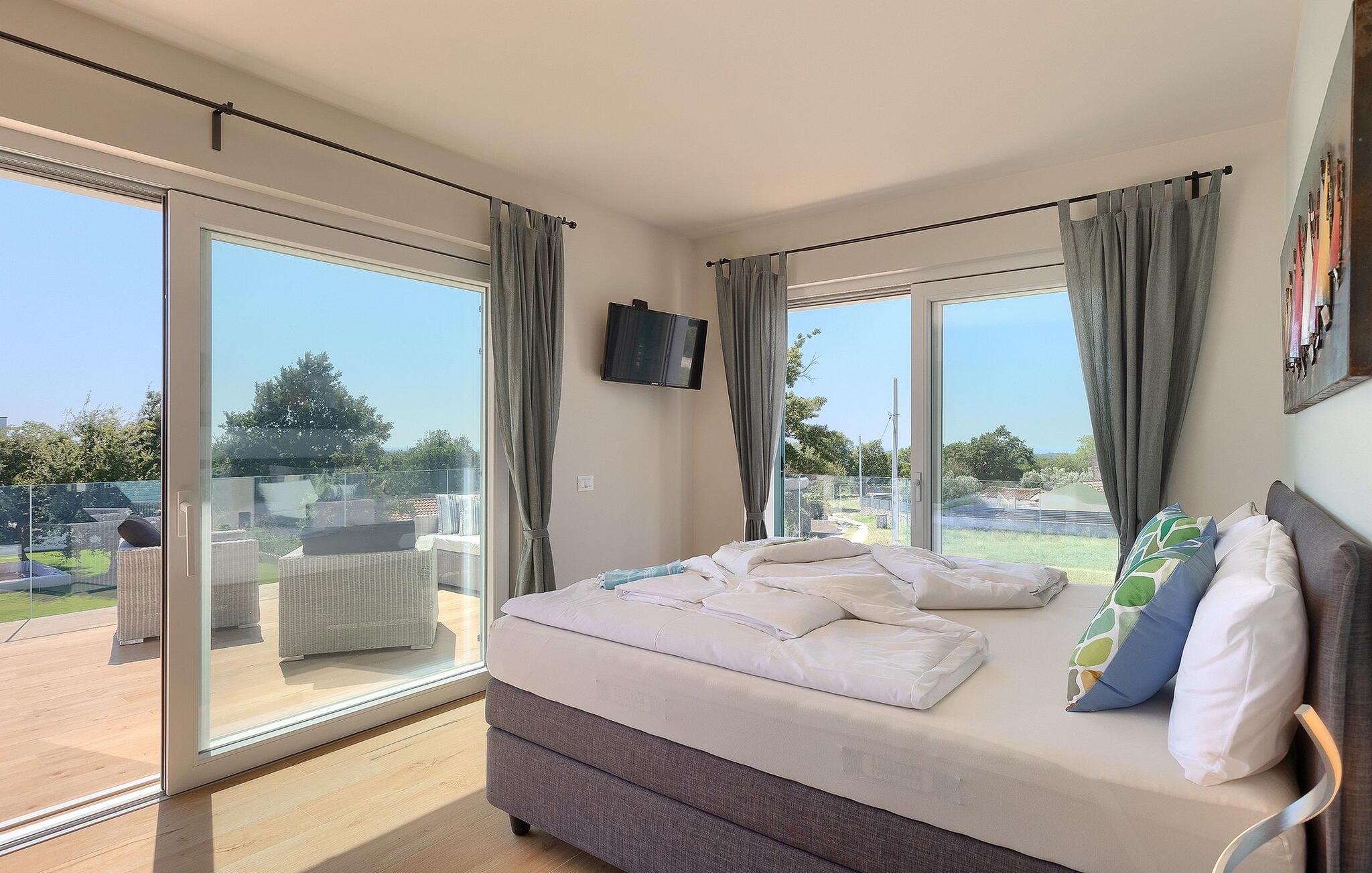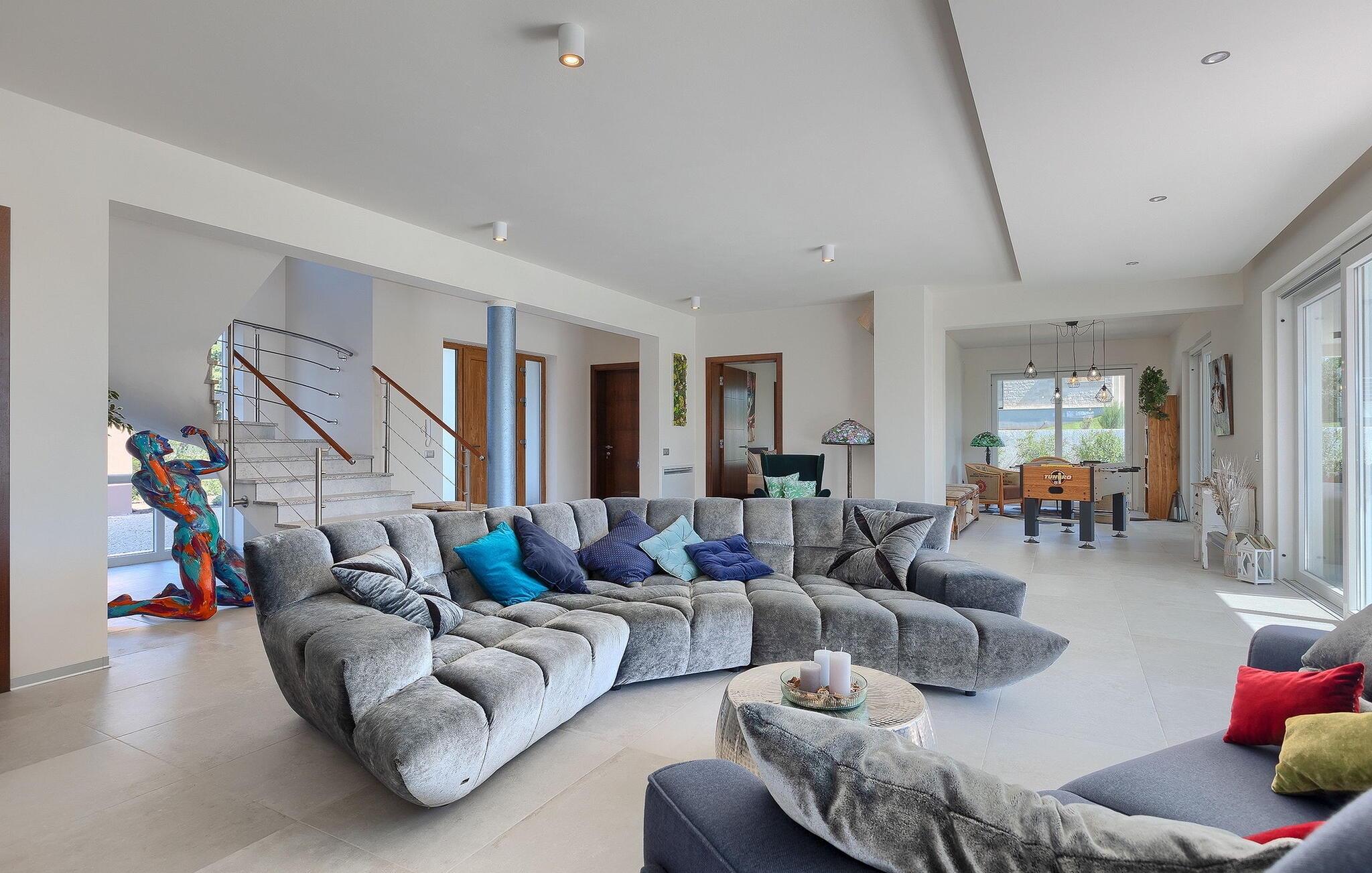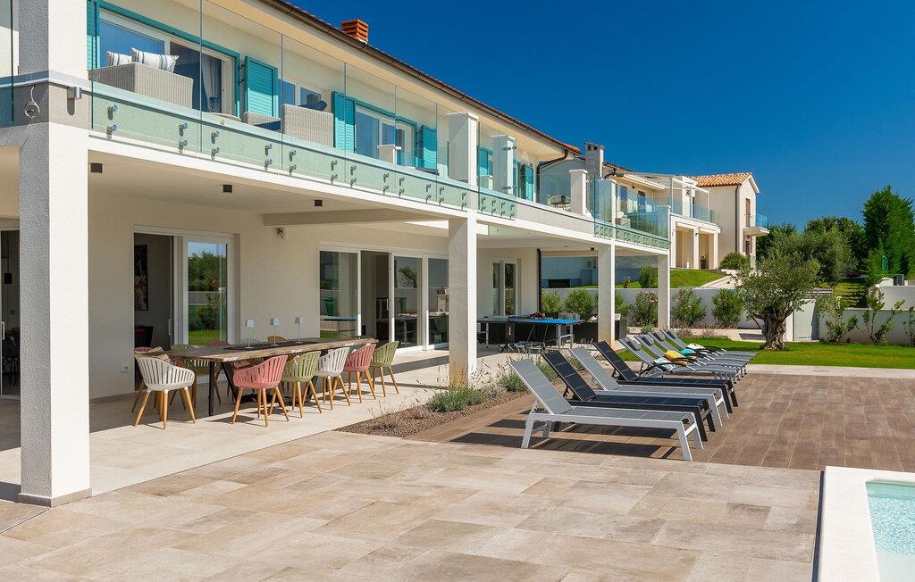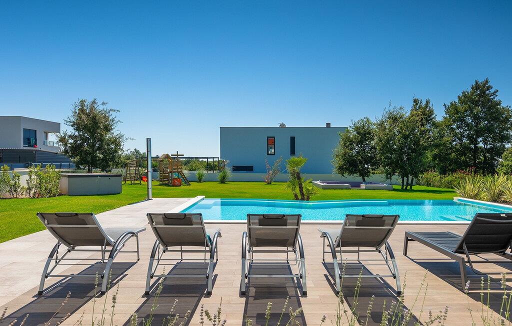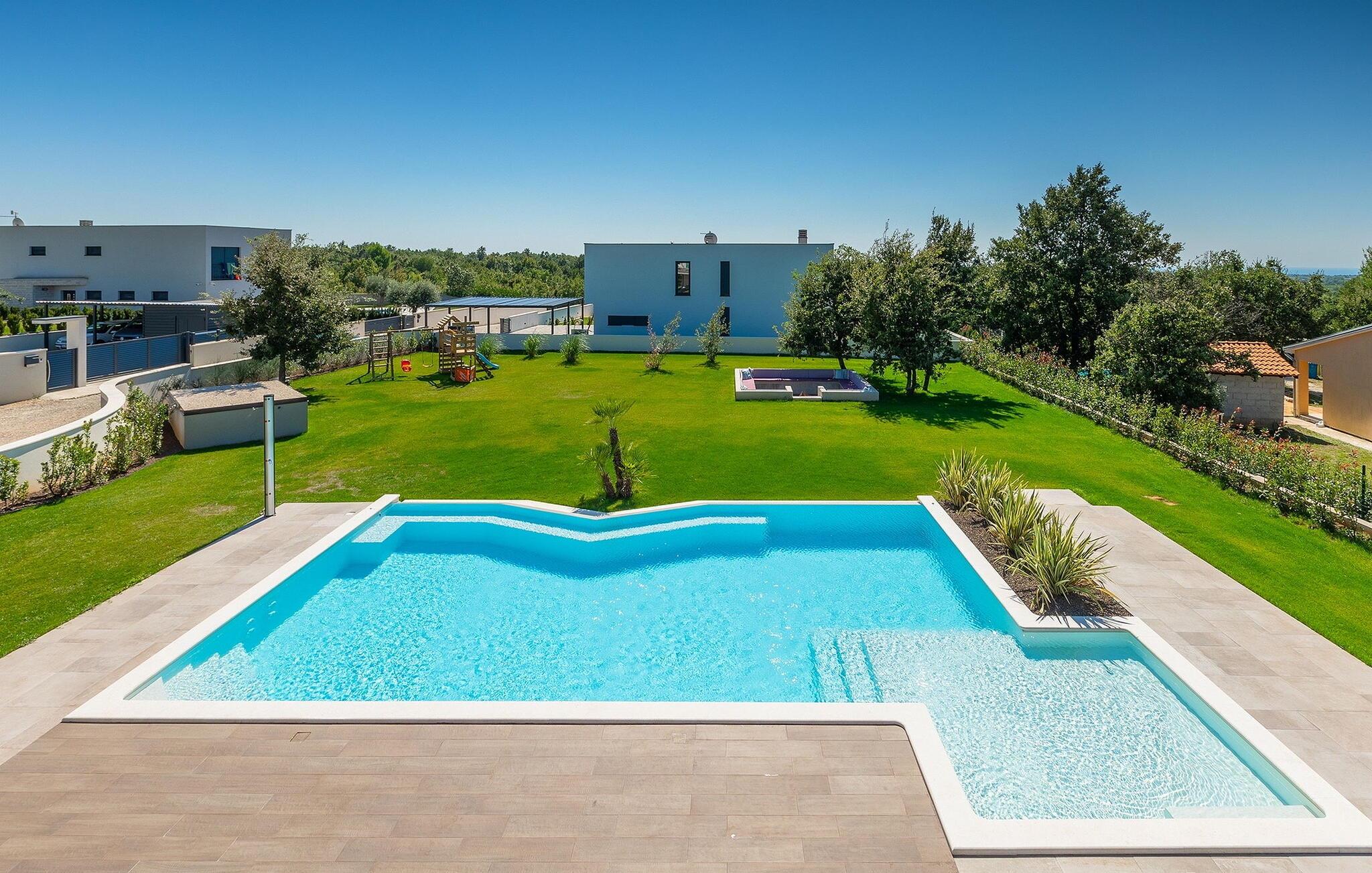 Villa Medici er en fantastisk luksusvilla med privat pool nær byen Pula. Ejendommen er det ideelle tilflugtssted for en større gruppe på 12+2 gæster i alt på 2 etager, 6 soveværelser, 6 badeværelser og et fantastisk udendørsområde. Der er mange højdepunkter udenfor, såsom den 65 m² opvarmede og private pool, hvor masser af sjov kan finde sted under dit ophold. Børnene vil helt sikkert nyde at tilbringe hele dagen i poolen, og forældrene kan have ro i sindet, da poolen har en dybde på 40 til 140 cm, hvilket gør den perfekt til alle aldre. Nyd andre fantastiske funktioner såsom lounge og pejs, solterrasse, et udendørs køkken, en hel legeplads for børn, bordtennis, volleyball og meget mere. Tilbered lækre og traditionelle kroatiske retter på gasgrillen og nyd dejlige familieaftener med dine kære i den overdækkede udendørs spiseplads. Villaens indretning vil også glæde dig - på de to etager kan du se et moderne og nøje udvalgt design med masser af træ og grå detaljer samt mange farverige billeder og statuer, der fremhæver villaens lysstyrke. Stueetagen af ??villaen har en rummelig opholds- og spisestue med masser af naturligt lys, et fuldt udstyret køkken, et dejligt bibliotek med en bogsamling og et fodboldbord, et separat toilet og et soveværelse med dobbeltseng og eget badeværelse med et brusebad. Hvis du tager trappen til det øverste niveau, vil du finde yderligere 5 soveværelser og deres badeværelser. Alle værelser i Villa Medici har aircondition, alle har SAT TV og enten udgang til stueetagens terrasse eller udgang til altanerne, hvor du kan nyde den smukke udsigt fra havemøblerne. Villa Medici tilbyder også sine gæster fuldt klimatiseret indkvartering, en stærk WiFi-forbindelse og en ladestation til elbiler. Book Villa Medici og tilbring en uforglemmelig ferie i en luksusejendom i hjertet af Istrien.