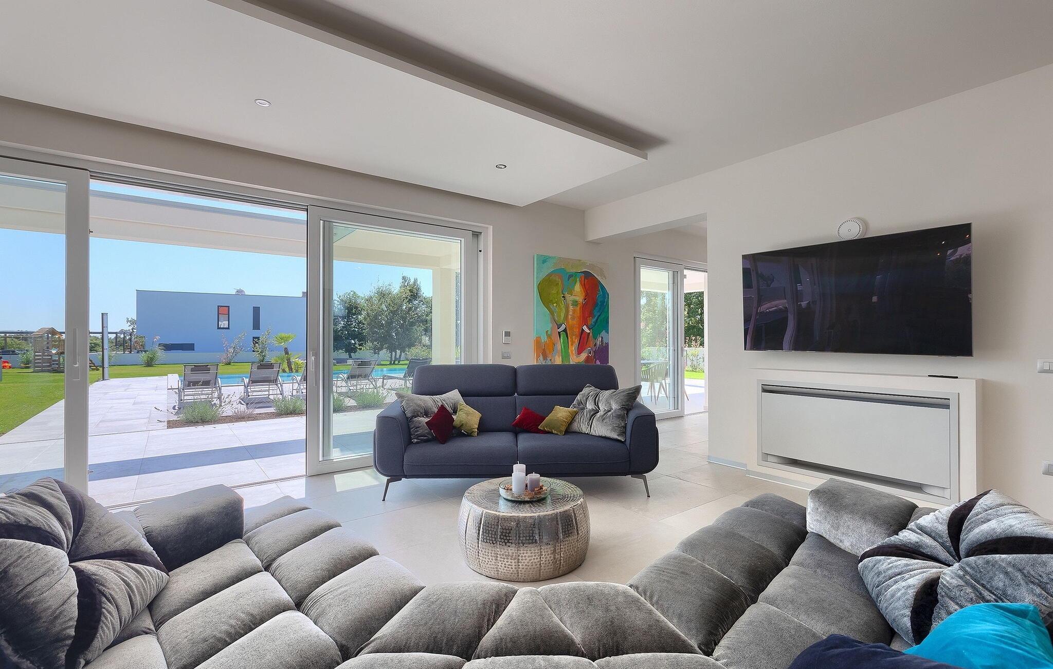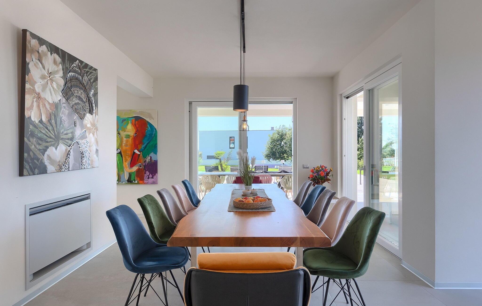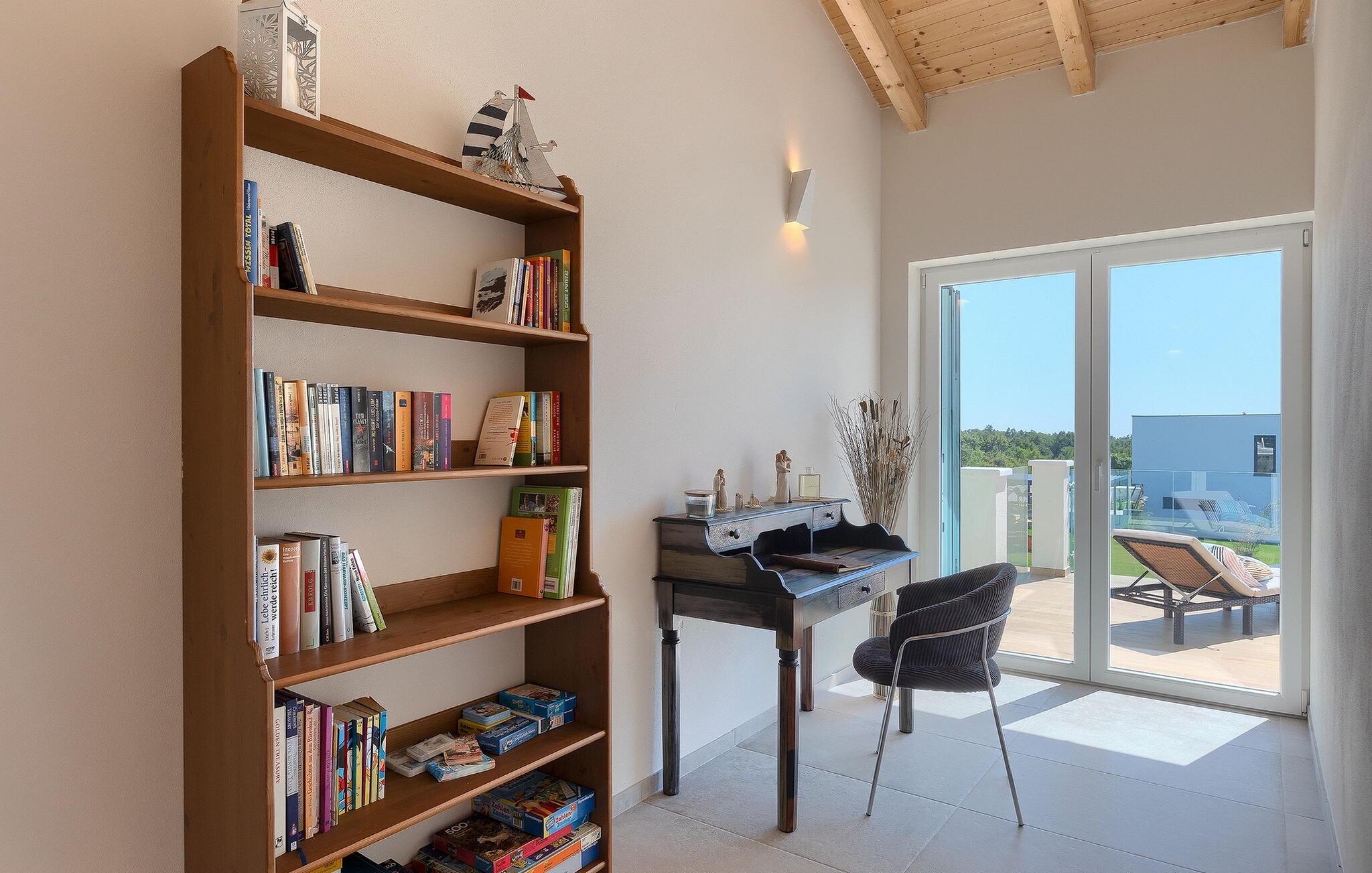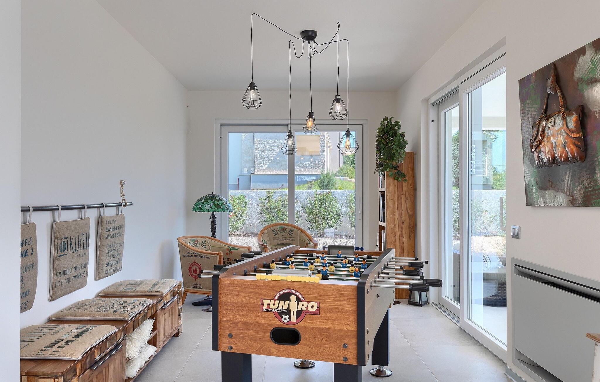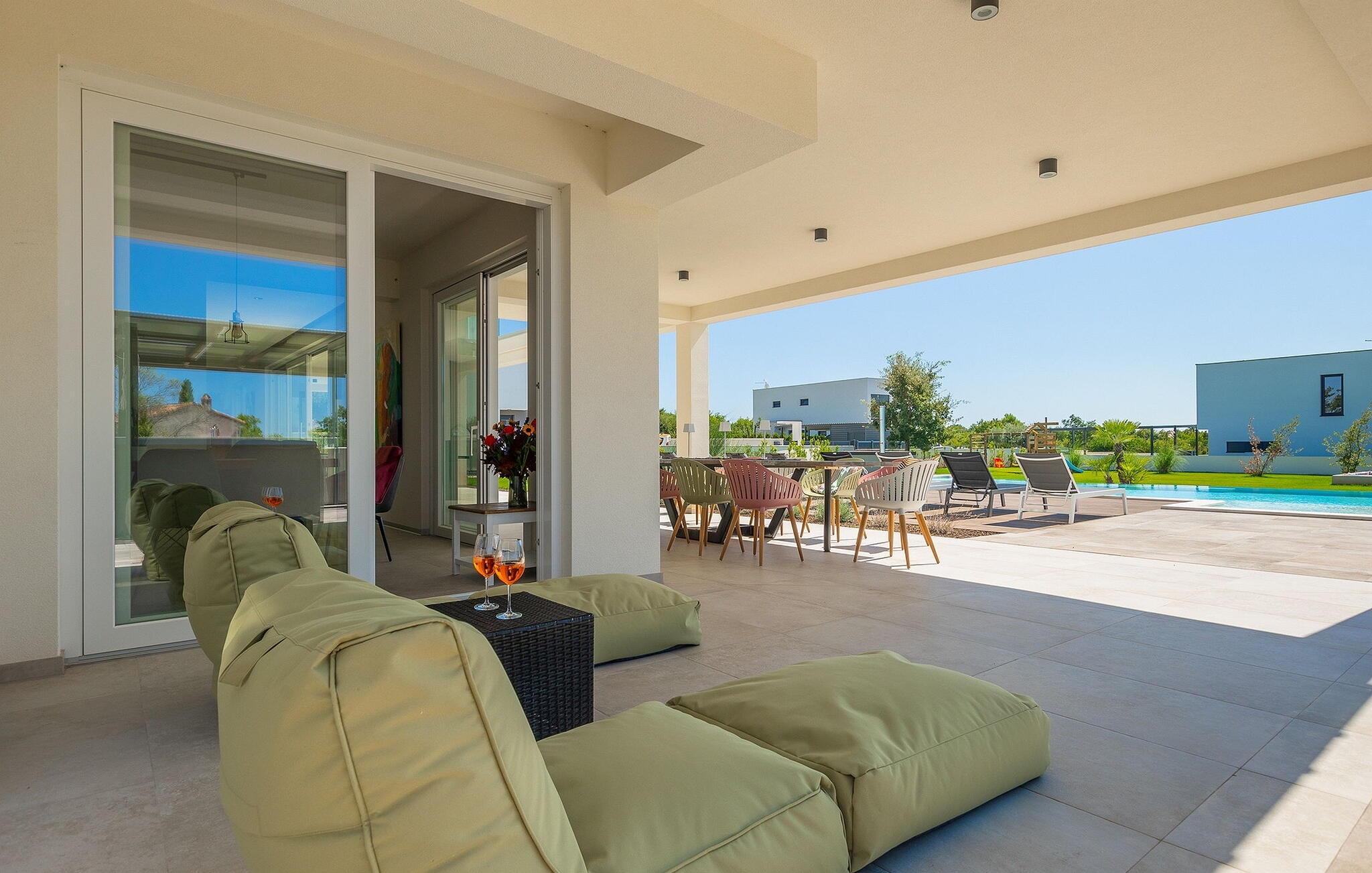 Villa Medici er en fantastisk luksusvilla med privat pool nær byen Pula. Ejendommen er det ideelle tilflugtssted for en større gruppe på 12+2 gæster i alt på 2 etager, 6 soveværelser, 6 badeværelser og et fantastisk udendørsområde. Der er mange højdepunkter udenfor, såsom den 65 m² opvarmede og private pool, hvor masser af sjov kan finde sted under dit ophold. Børnene vil helt sikkert nyde at tilbringe hele dagen i poolen, og forældrene kan have ro i sindet, da poolen har en dybde på 40 til 140 cm, hvilket gør den perfekt til alle aldre. Nyd andre fantastiske funktioner såsom lounge og pejs, solterrasse, et udendørs køkken, en hel legeplads for børn, bordtennis, volleyball og meget mere. Tilbered lækre og traditionelle kroatiske retter på gasgrillen og nyd dejlige familieaftener med dine kære i den overdækkede udendørs spiseplads. Villaens indretning vil også glæde dig - på de to etager kan du se et moderne og nøje udvalgt design med masser af træ og grå detaljer samt mange farverige billeder og statuer, der fremhæver villaens lysstyrke. Stueetagen af ??villaen har en rummelig opholds- og spisestue med masser af naturligt lys, et fuldt udstyret køkken, et dejligt bibliotek med en bogsamling og et fodboldbord, et separat toilet og et soveværelse med dobbeltseng og eget badeværelse med et brusebad. Hvis du tager trappen til det øverste niveau, vil du finde yderligere 5 soveværelser og deres badeværelser. Alle værelser i Villa Medici har aircondition, alle har SAT TV og enten udgang til stueetagens terrasse eller udgang til altanerne, hvor du kan nyde den smukke udsigt fra havemøblerne. Villa Medici tilbyder også sine gæster fuldt klimatiseret indkvartering, en stærk WiFi-forbindelse og en ladestation til elbiler. Book Villa Medici og tilbring en uforglemmelig ferie i en luksusejendom i hjertet af Istrien.