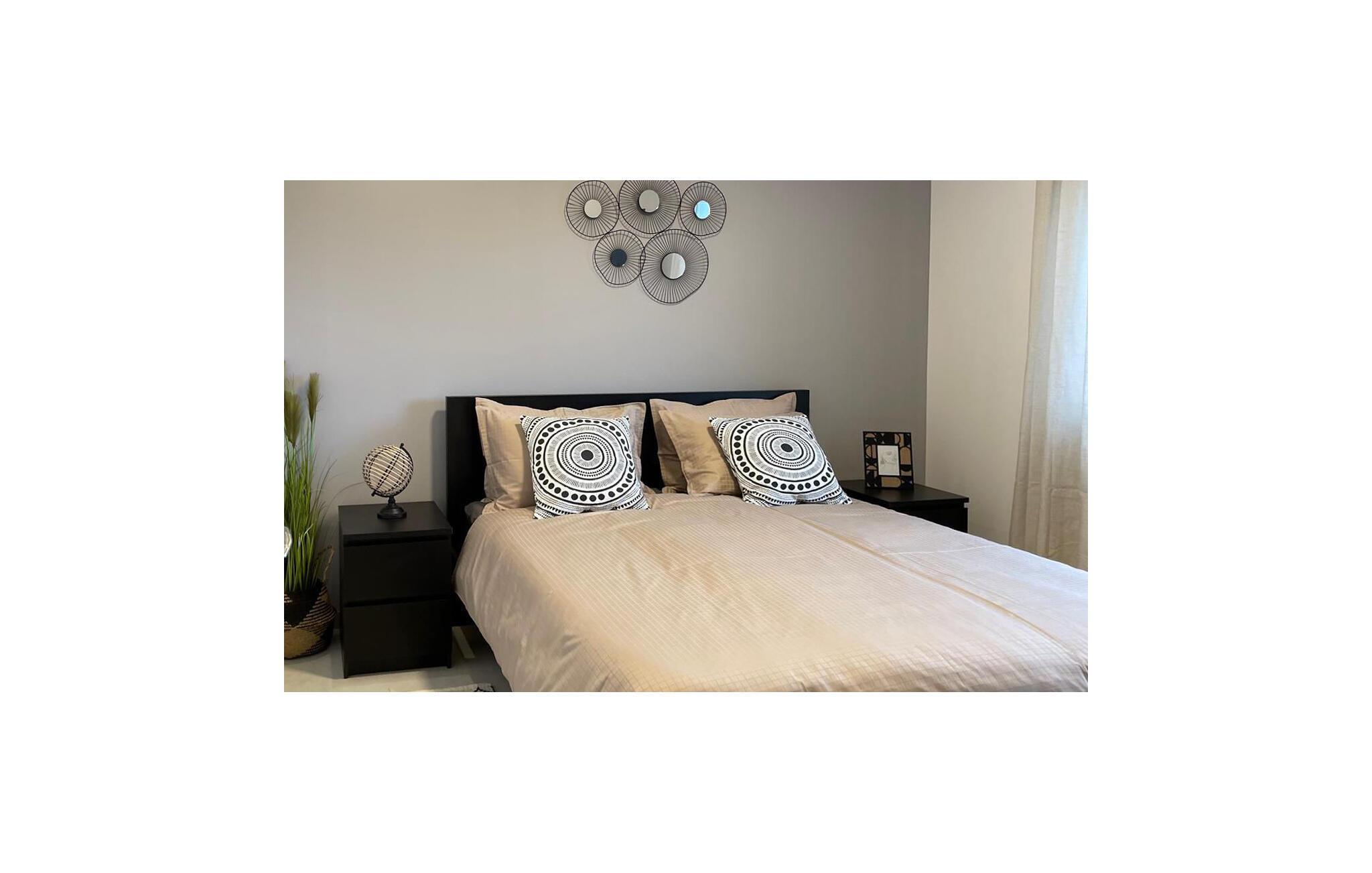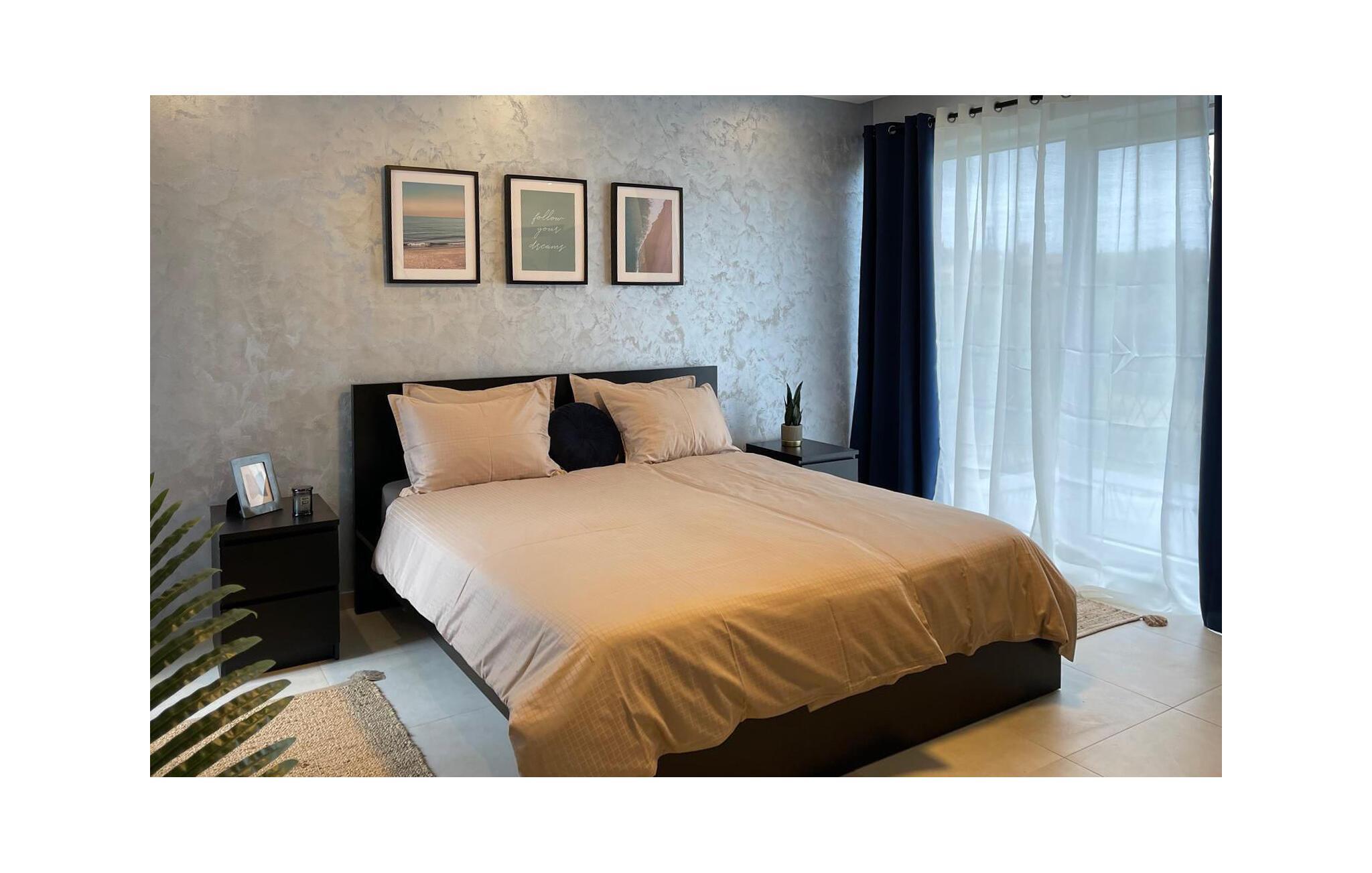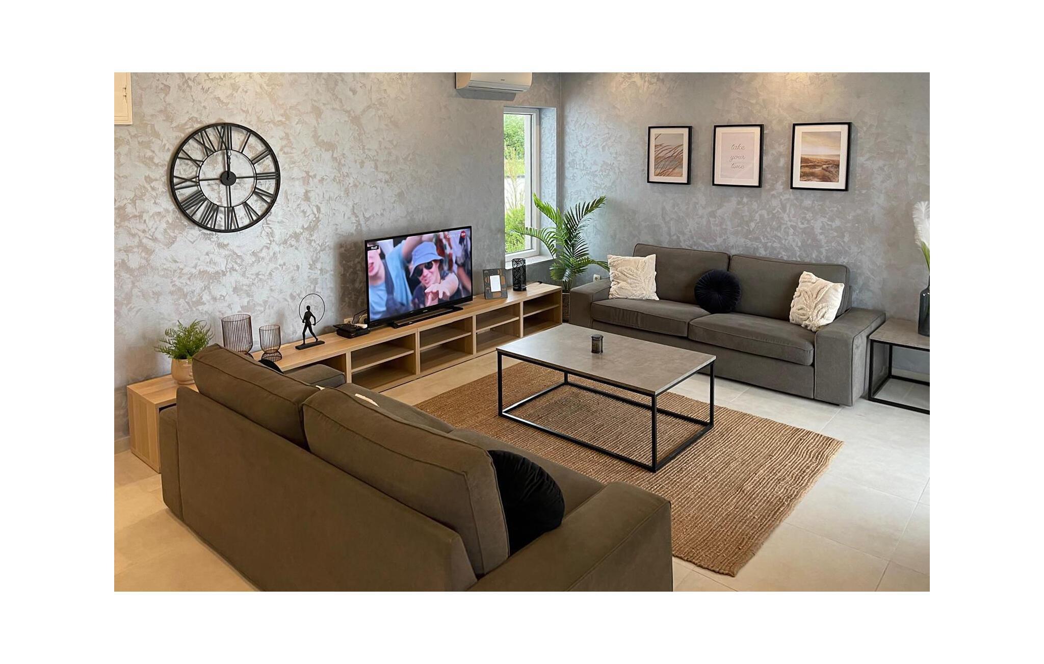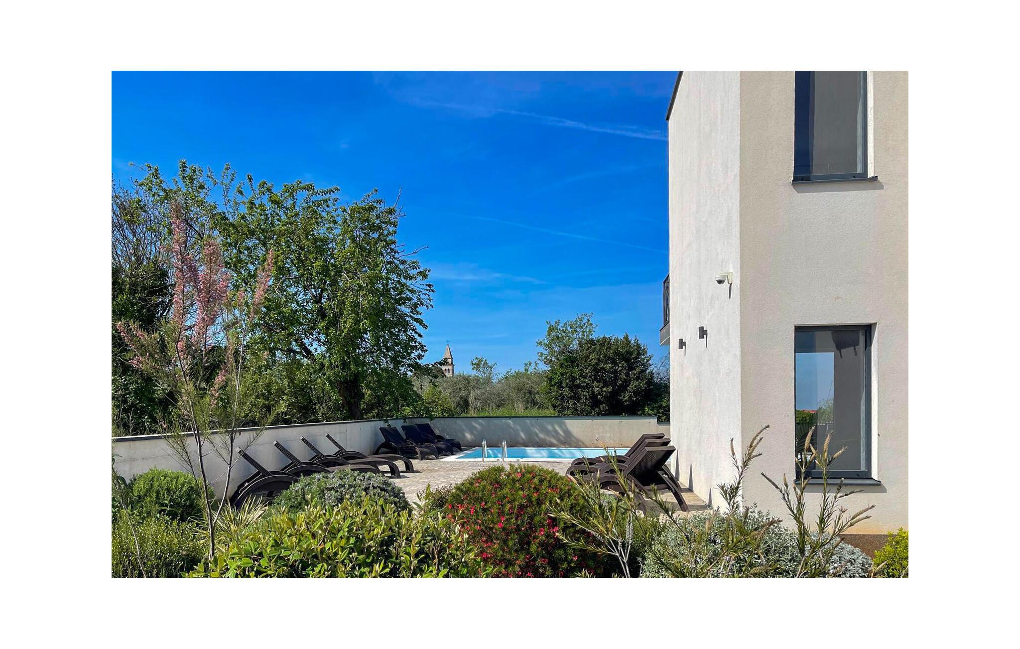 Udenfor venter en vidunderlig terrasse med solsenge omgivet af middelhavsplanter og en funklende pool, der indbyder til lange timer med solbadning. Nyd et hyggeligt grillmåltid under åben himmel eller en middag ved det store udendørs spisebord, mens solnedgangen maler omgivelserne i varme nuancer.