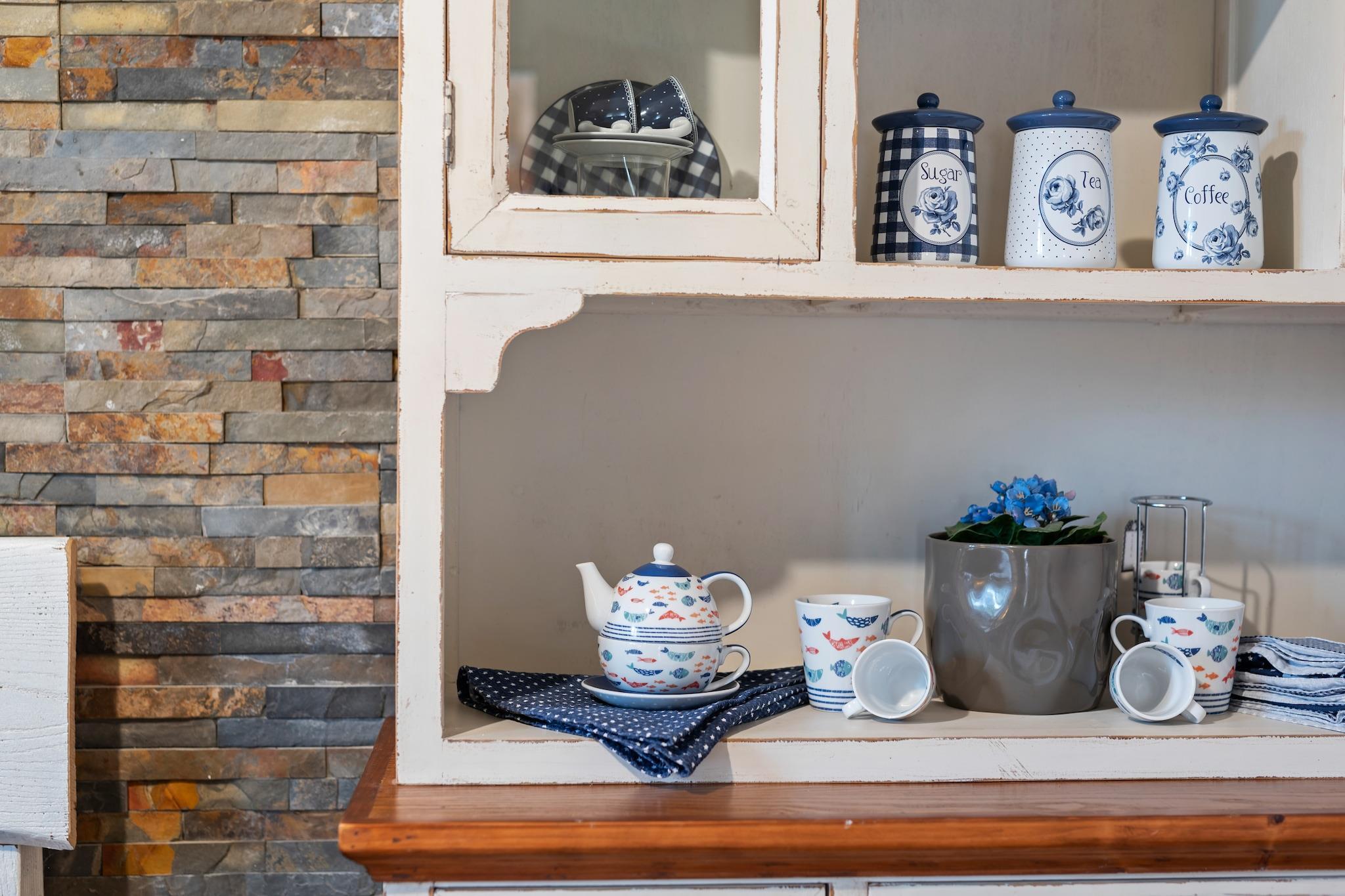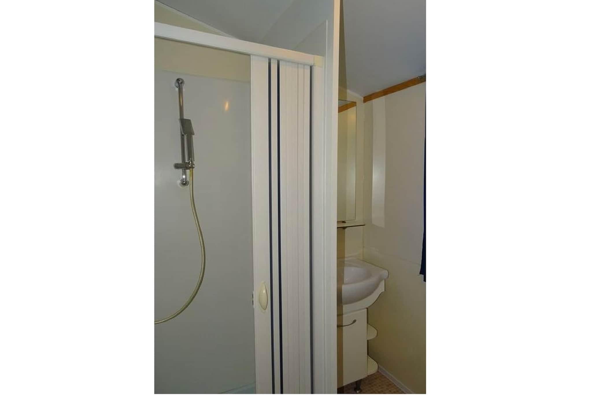 Stueetage: (tekøkken(elkedel, ovn, mikrobølgeovn, køle-fryseskab), stue / spisestue(dobbeltsovesofa, Fjernsyn, spisebord, sofahjørne, brændekomfur), soveværelse(dobbeltseng), badeværelse(bruser, håndvask, toilet), terrasse(privat)) grill