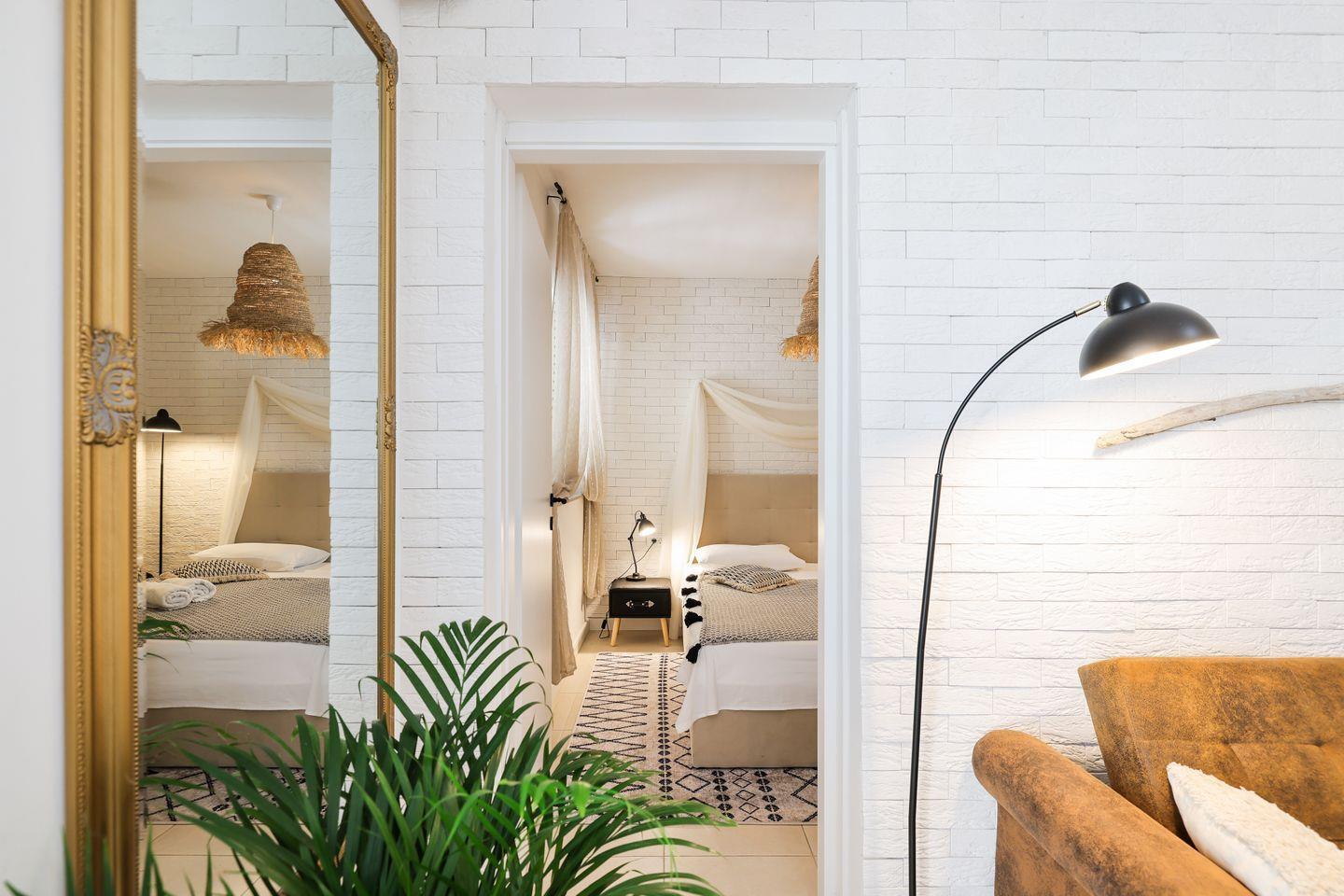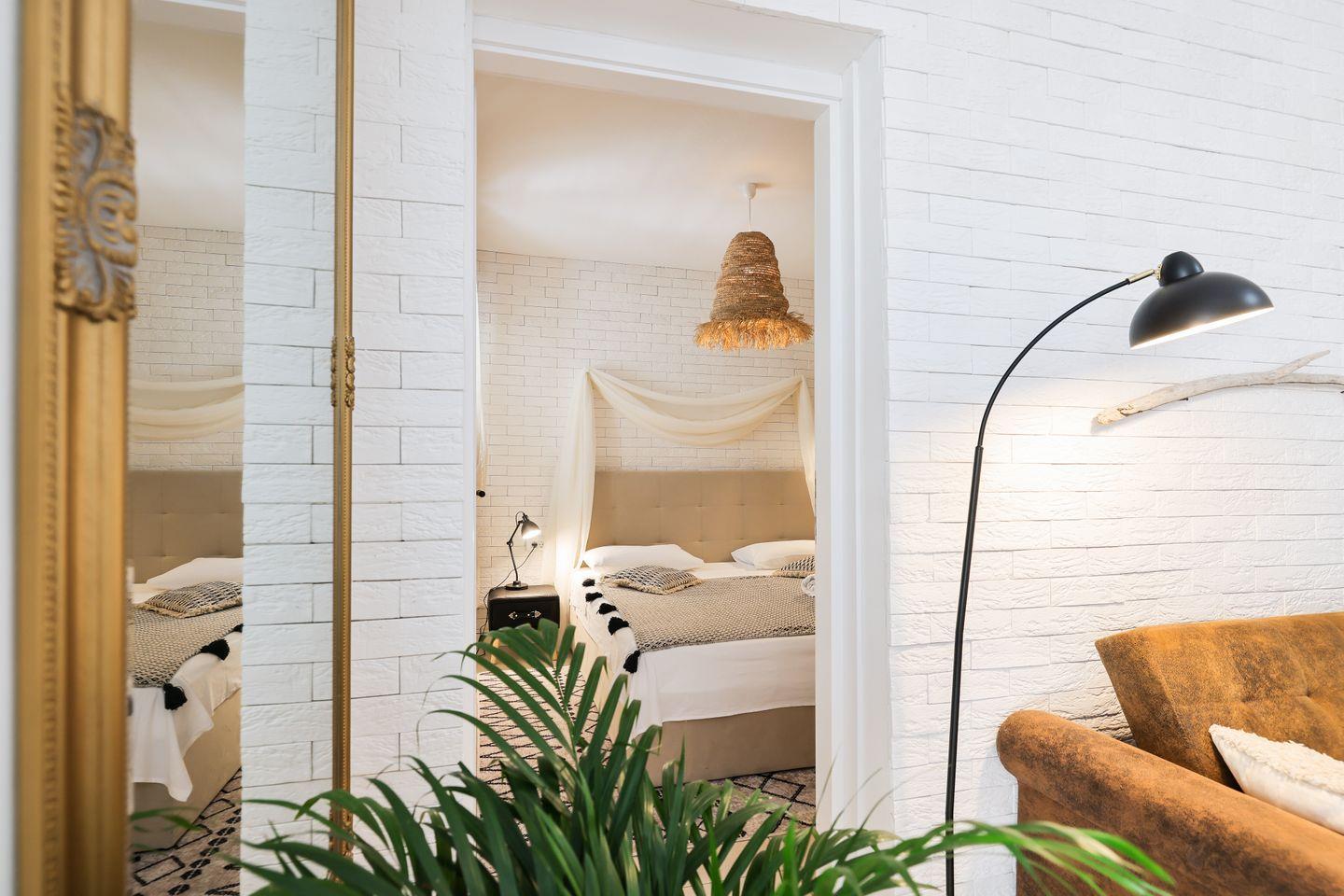 Die Unterkunft befindet sich im ersten Stock und eignet sich ideal für zwei Personen. Der großzügige Wohnbereich ist hell und freundlich gestaltet und kombiniert eine gemütliche Couch mit einem Essbereich, der zum gemeinsamen Verweilen einlädt. Die integrierte Küche ist komplett ausgestattet und ermöglicht es Ihnen, Ihre Mahlzeiten bequem selbst zuzubereiten. Das separate Schlafzimmer ist liebevoll und gemütlich eingerichtet und verfügt über ein komfortables Doppelbett, das für erholsame Nächte in angenehmer Atmosphäre sorgt. Vom Wohnbereich aus gelangen Sie auf den Balkon, der zusätzlichen Raum bietet, um den Tag entspannt mit einem Kaffee oder einem Glas Wein ausklingen zu lassen.