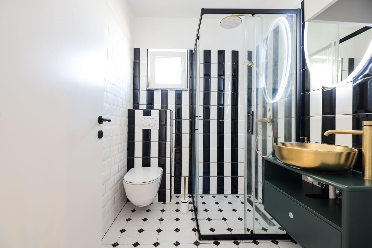 Das Badezimmer besticht durch moderne Ausstattung und großzügiges Design: Es verfügt über eine elegante Walk-in-Dusche, ein WC und stilvolle Details, die für zusätzlichen Komfort sorgen. Insgesamt verbindet diese Unterkunft modernes Wohnen mit einer behaglichen Atmosphäre – ideal für einen entspannten Urlaub.