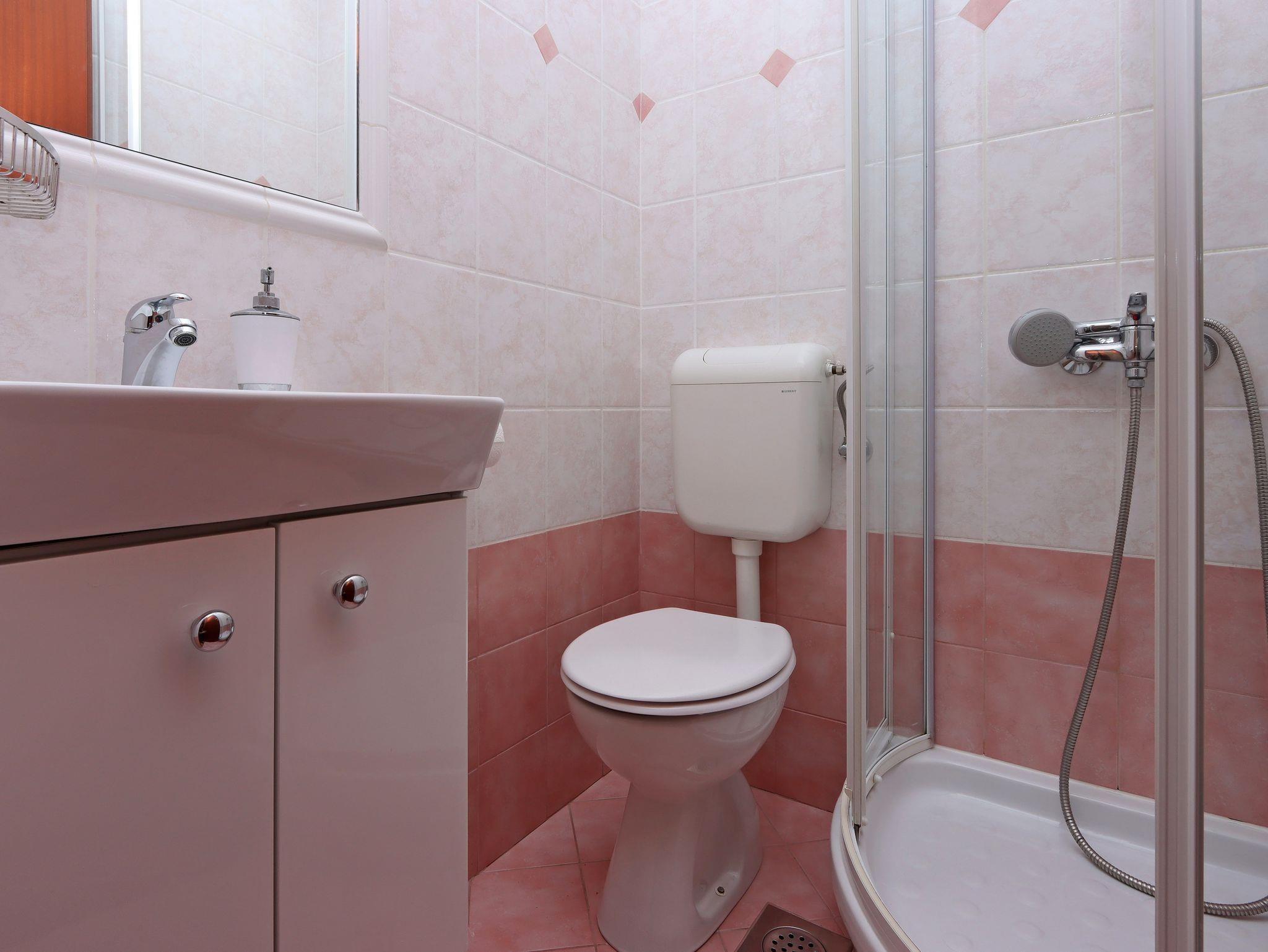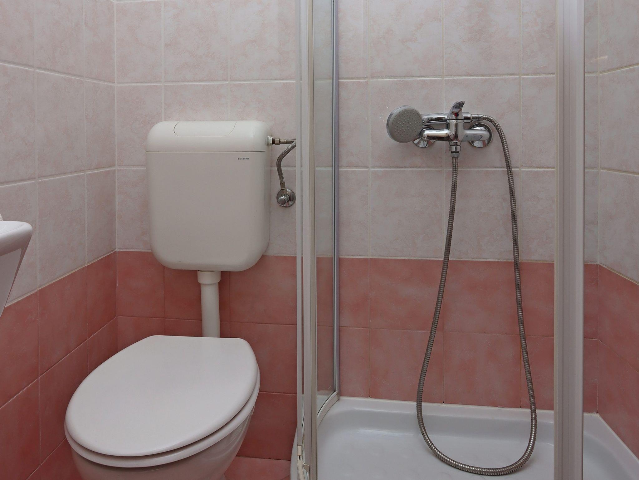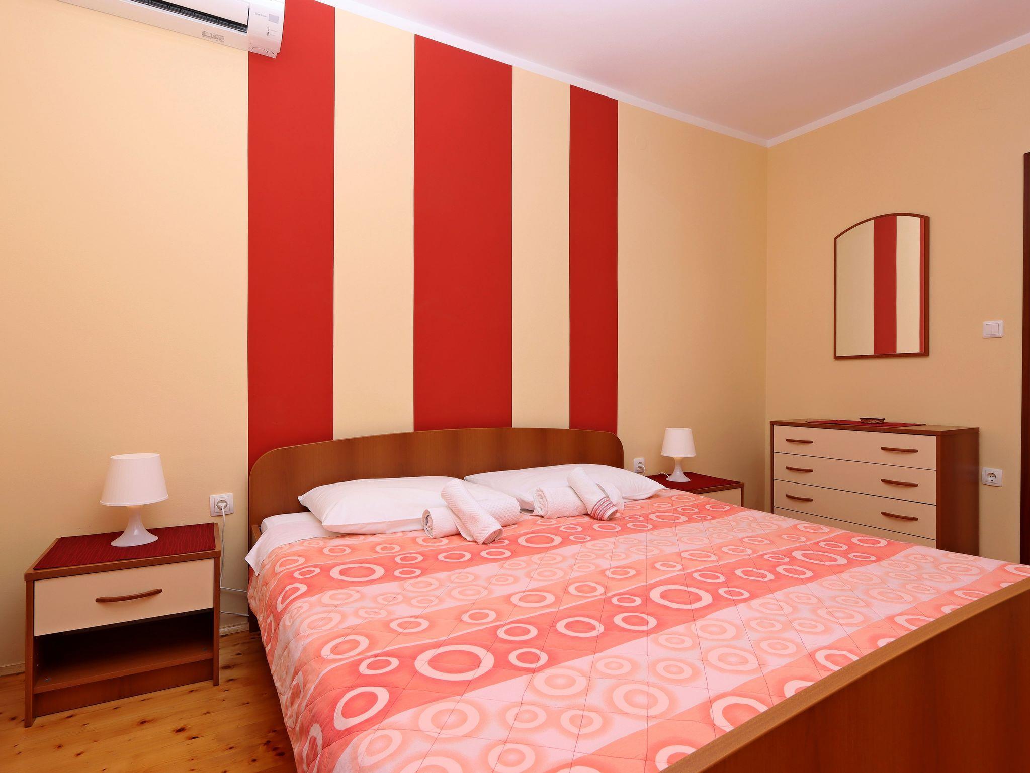 Zimmer bietet Platz für 2 Gäste. Die Betten sind in Schlafzimmern, die es 1 gibt, innerhalb einer Gesamtfläche von 12m2, angeordnet. Die Gäste haben eine eigene Terrasse zur Verfügung, auf der sie in warmen Sommernächten genießen können. Das Zimmer bietet Meerblick. Es ist erlaubt, Speisen auf dem Gemeinschafts-Grill vorzubereiten. Die reservierte Unterkunftseinheit ist ein Zimmer mit eigenem Badezimmer ohne die Möglichkeit der Nutzung einer Küche. IM PREIS INBEGRIFFEN: Kurtaxe, Endreinigung, Zentralheizung, Parkplatz, Internet, Bügeleisen, Bügelbrett, Föhn. VERBINDLICHE ZUSÄTZLICHE KOSTEN: Aufzahlung für Kurzaufenthalte (prozentualer Zuschlag pro Nächtigungsanzahl: 30% - 1, 20% - 2, 10% - 3). UNVERBINDLICHE ZUSÄTZLICHE KOSTEN: Klimatisierung (7,00 € pro Nacht), Wäschewaschen (10,00 € Waschen). Die Verfügbarkeit zusätzlicher Dienstleistungen in Ihrem reservierten Termin und die Preise derselben (falls nicht aufgeführt) müssen im Voraus überprüft werden. Zusätzliche Dienstleistungen die in der Zahlungsaufforderung nicht aufgeführt sind werden direkt beim Vermieter bezahlt, angenommen der Gast nutzt auch diese.